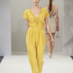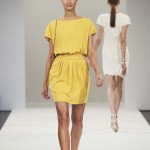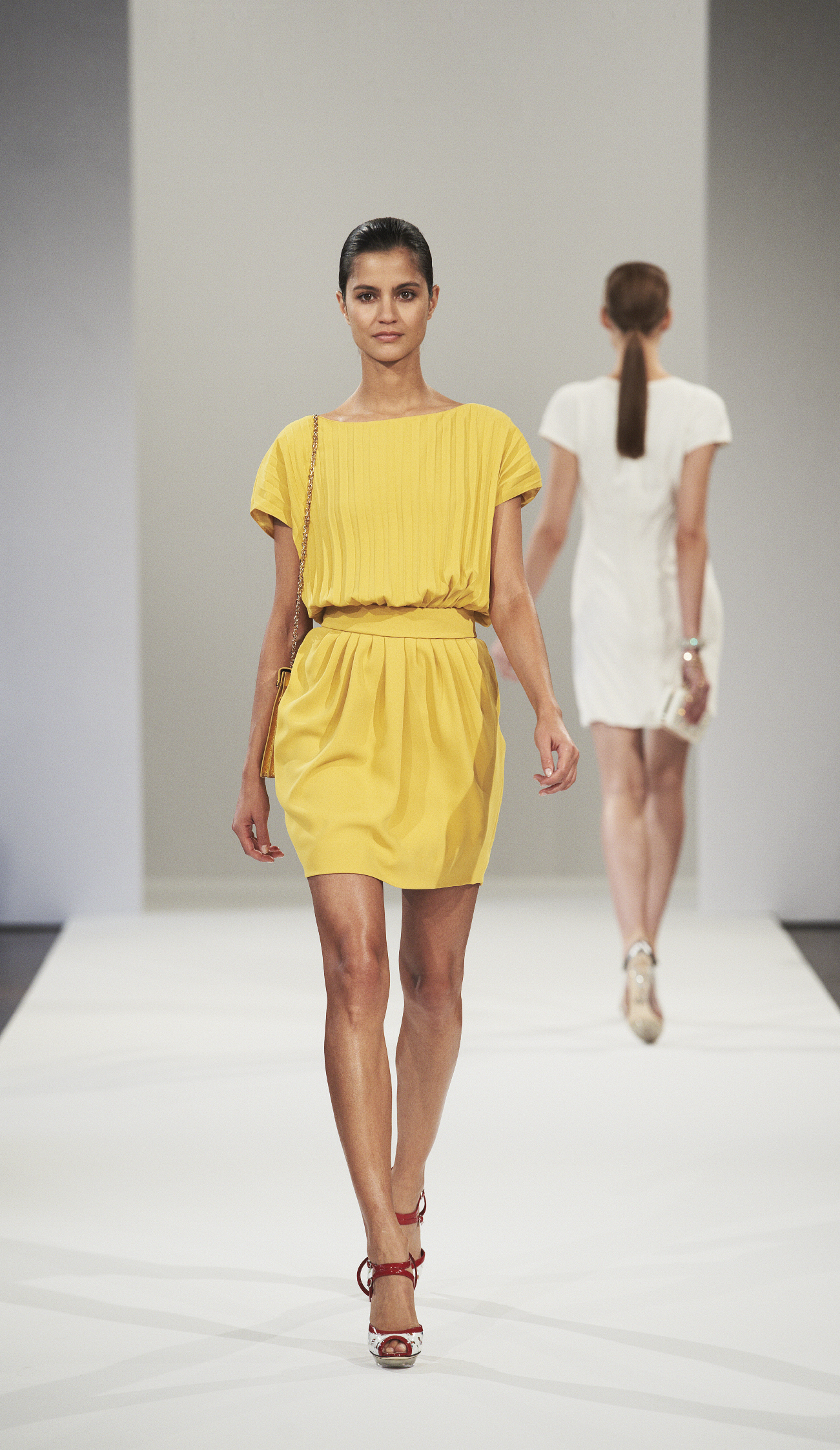A bolt of golden yellow explodes across a cocktai dress or a graphic