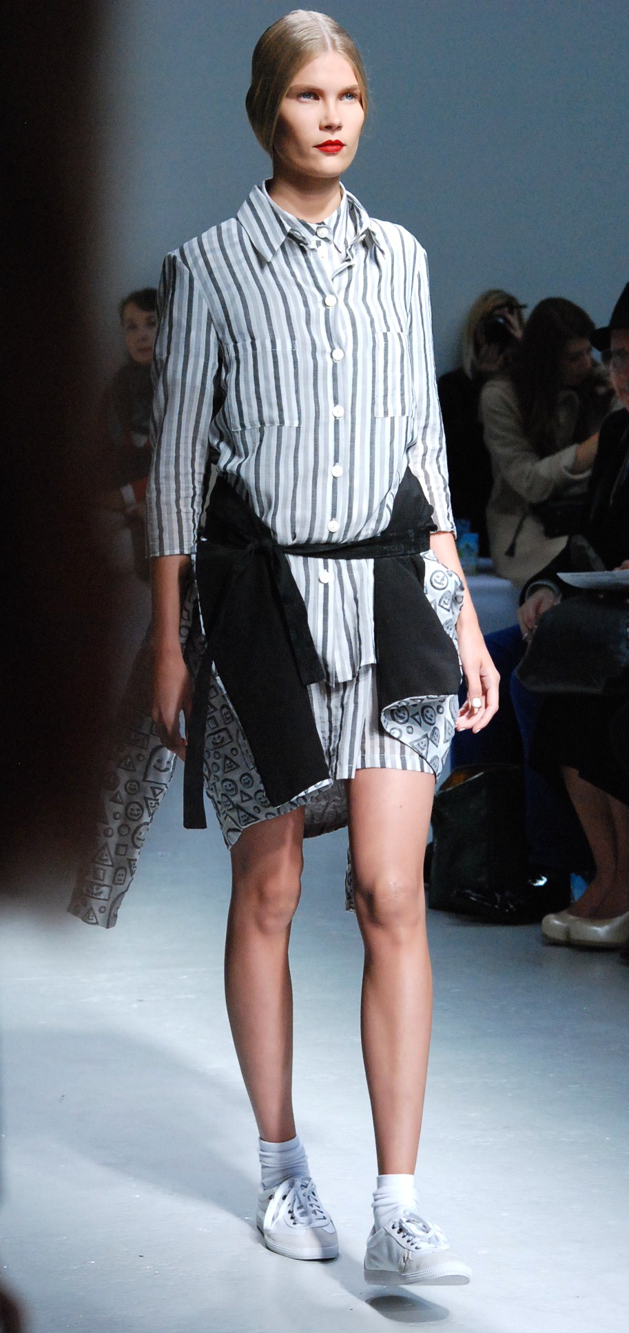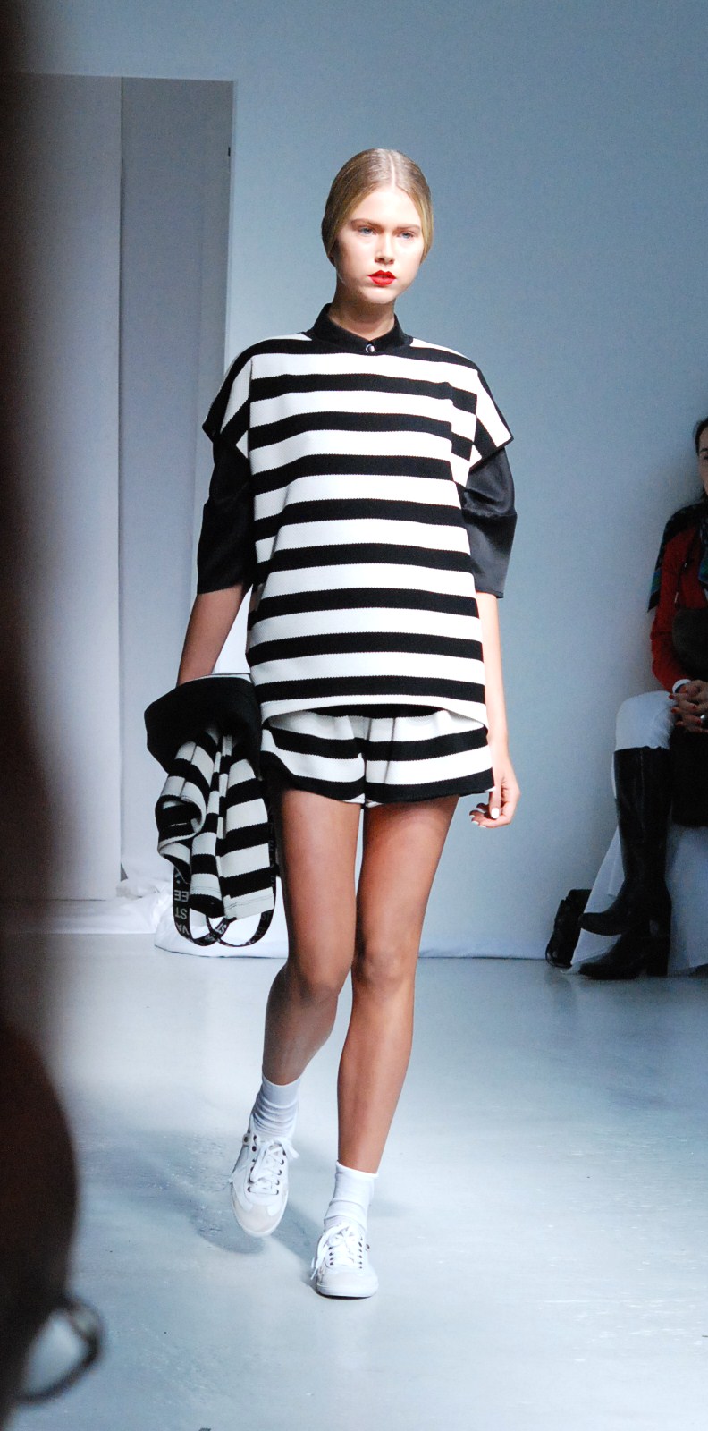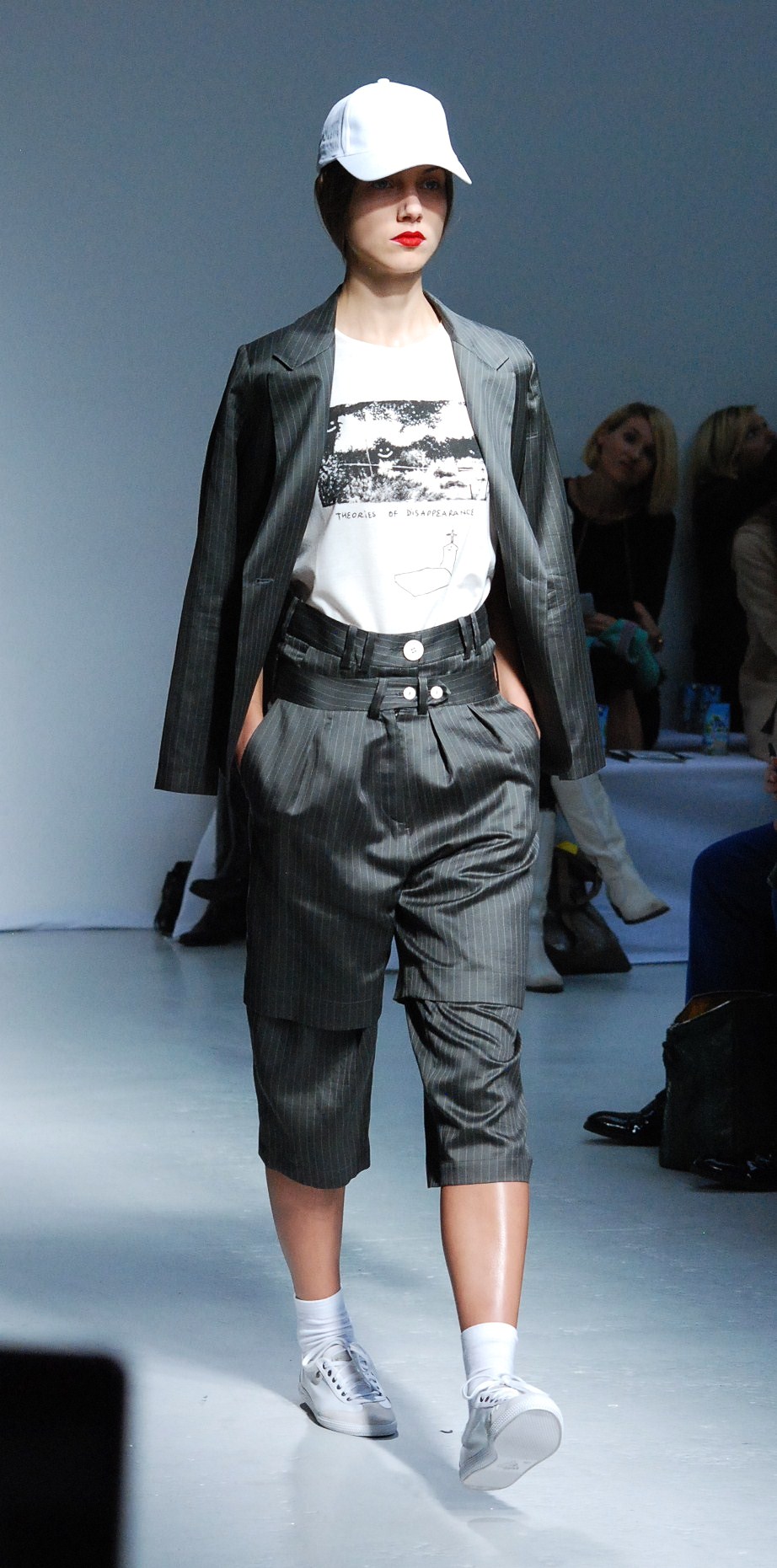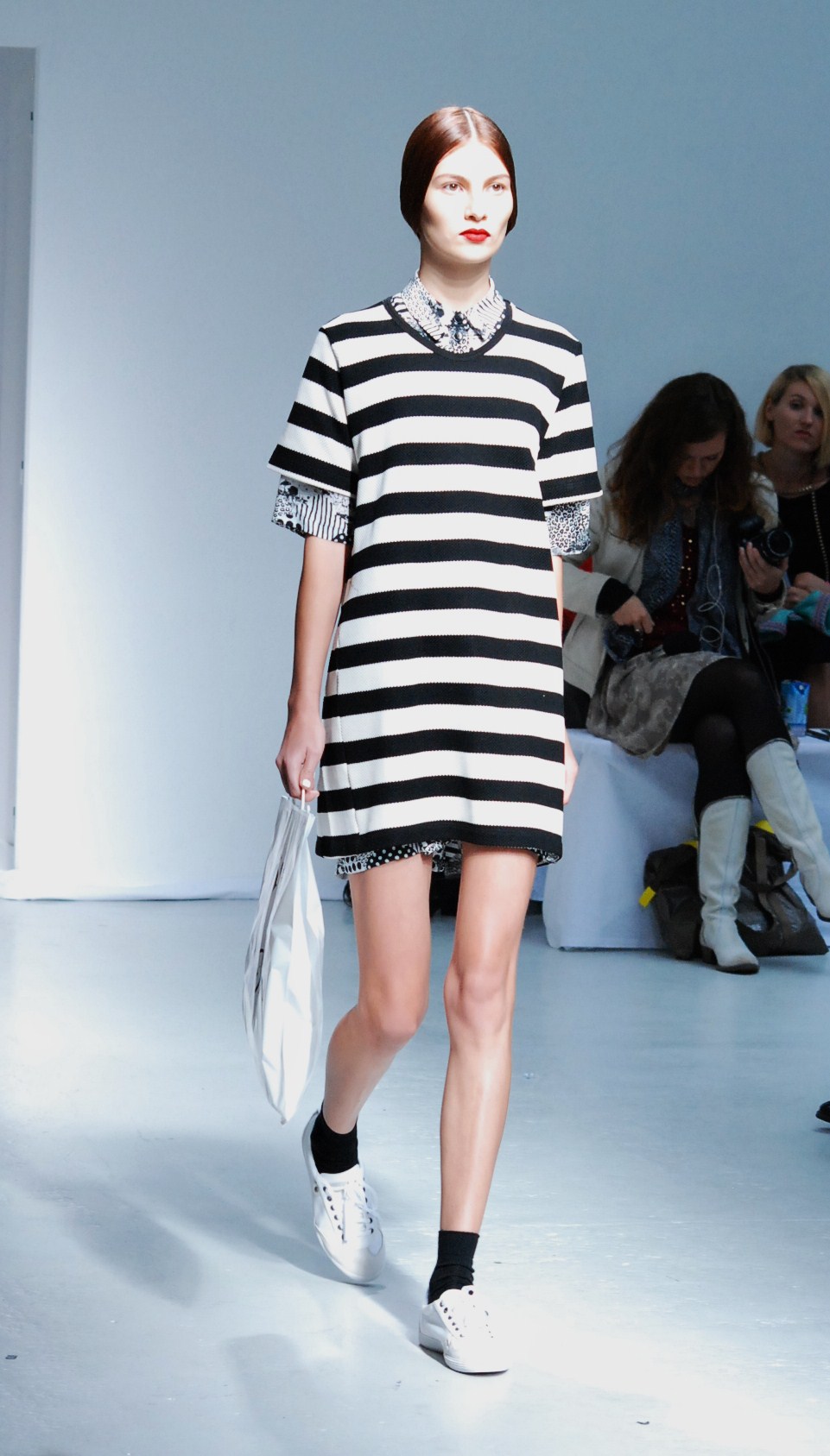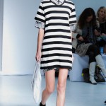 Looks androgynes mais néanmoins très propres, collages de photos vintage alliées à des jupes assez flirty, sneakers et casquettes sont au rendez vous. Les rayures horizontales sont aussi présentes, les plus belles tenues restant selon moi celles incluant des chemises à col pliés, l’ensemble restant dans la tendance garçonne.