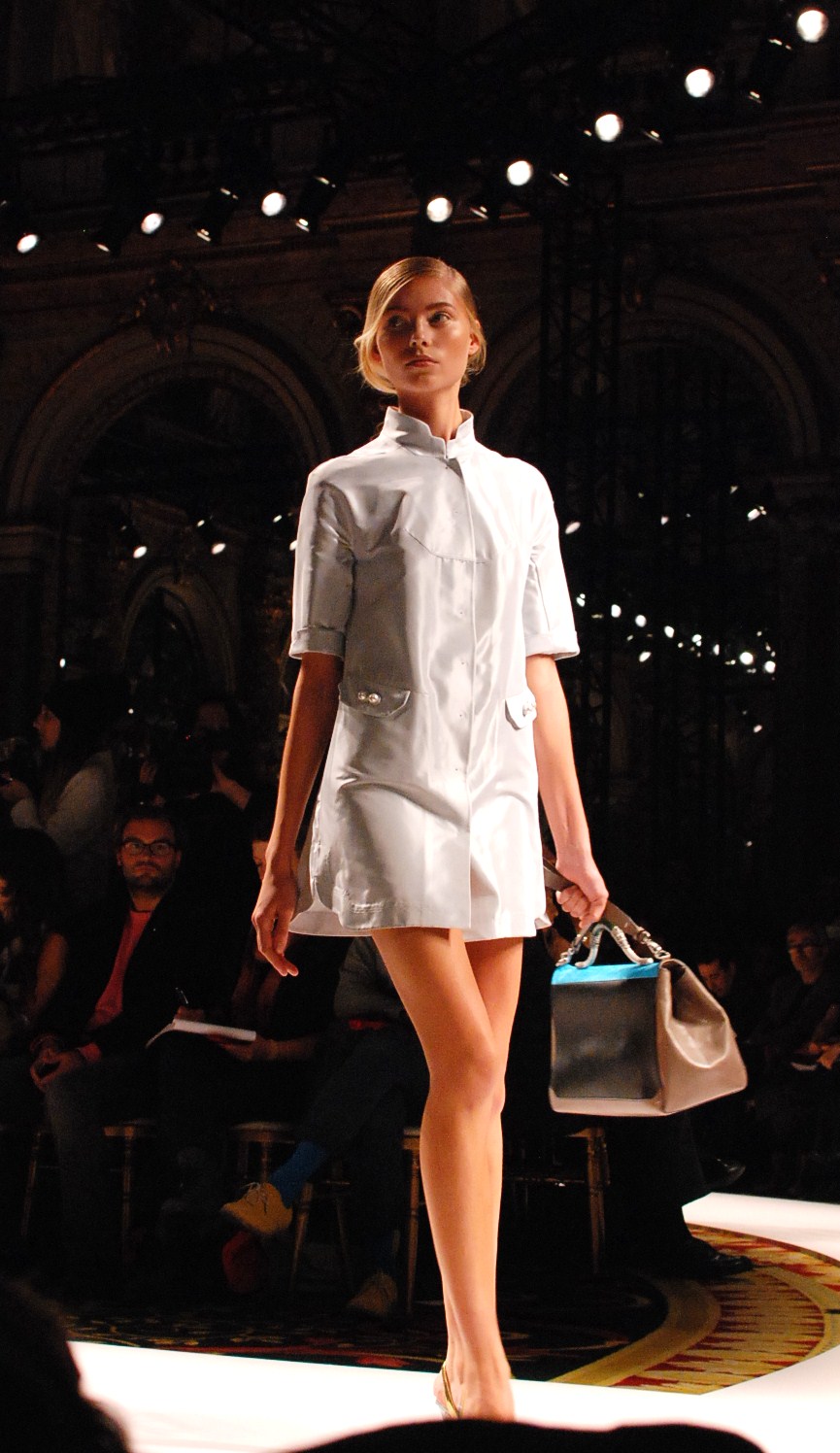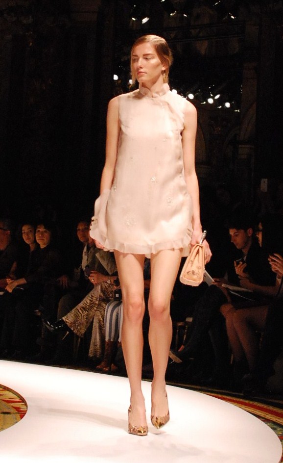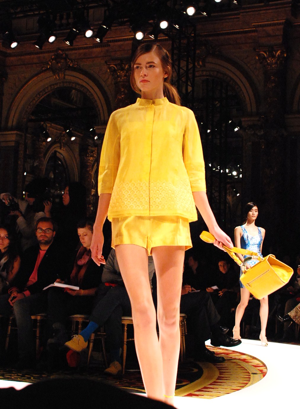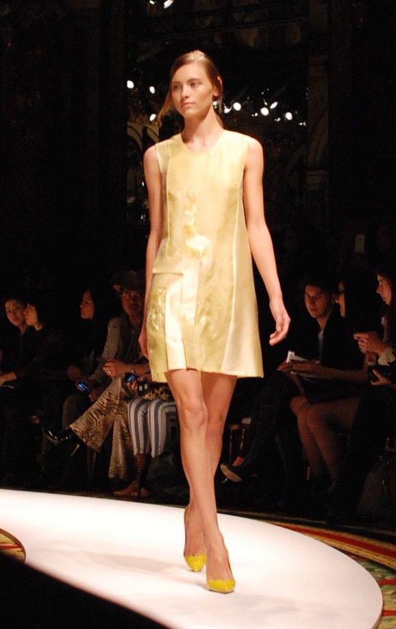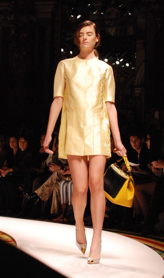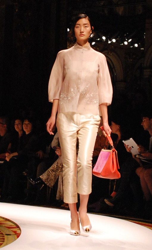 Du blanc, bien sur pour ouvrir le défilé mais qui est très vite suivi par des couleurs qui évoquent déjà plus le printemps et l’été telles que le turquoise, le jaune doré, le rose, le fuschia. Plaisir pour les yeux, les silhouettes sont extrêmement flatteuses et les teintes y sont pour beaucoup. Jeu de brillance et de transparence restant tout de même d’une grande sobriété, le vêtements sont beaux chez Shiatzy Chen et l’attention portée au détail est remarquable.