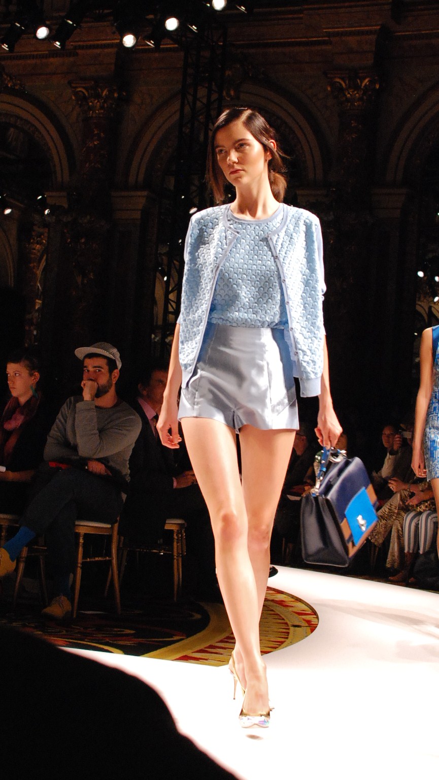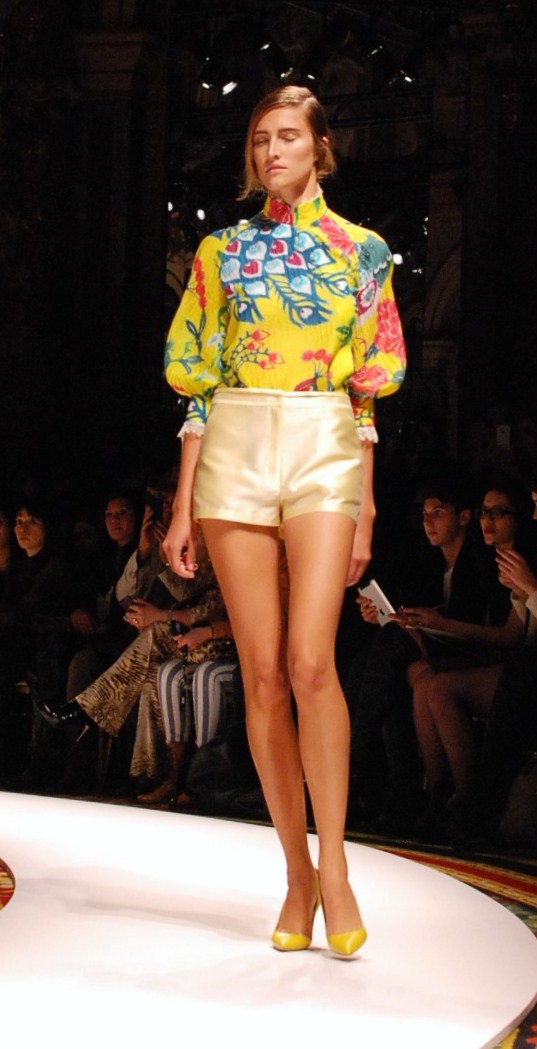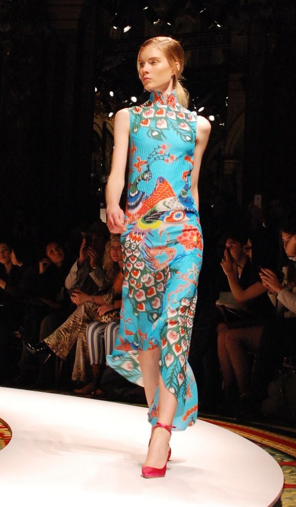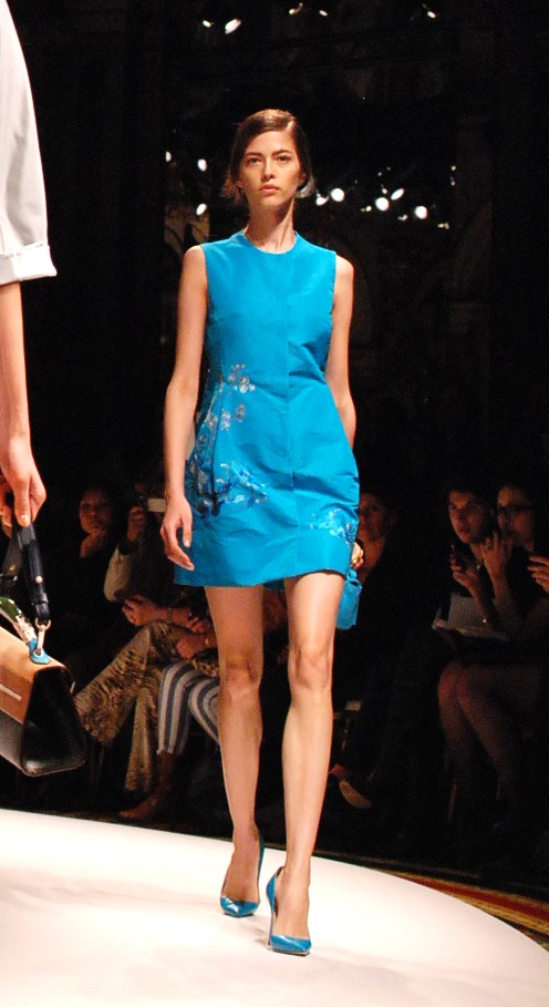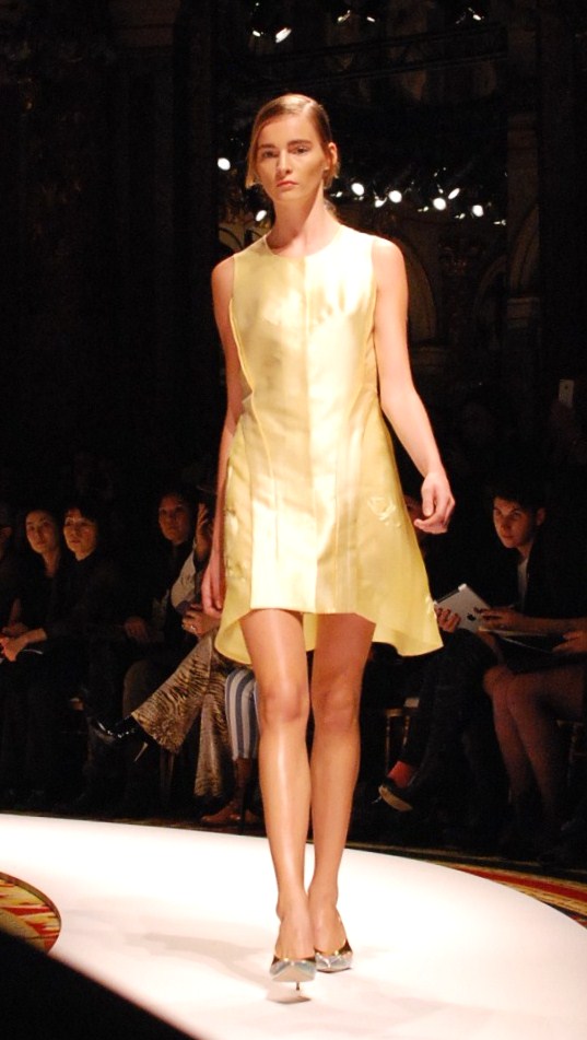 Du blanc, bien sur pour ouvrir le défilé mais qui est très vite suivi par des couleurs qui évoquent déjà plus le printemps et l’été telles que le turquoise, le jaune doré, le rose, le fuschia. Plaisir pour les yeux, les silhouettes sont extrêmement flatteuses et les teintes y sont pour beaucoup. Jeu de brillance et de transparence restant tout de même d’une grande sobriété, le vêtements sont beaux chez Shiatzy Chen et l’attention portée au détail est remarquable.