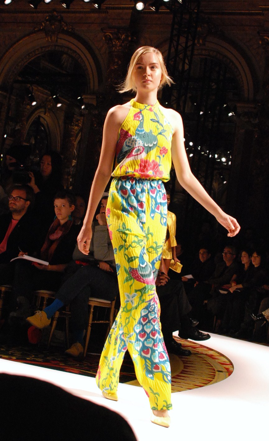 Des motifs rappelant les scènes de la natures sont tout aussi présents que les tissus jacquards qui donnent à cette collection une véritable note de poésie et de douceur. les formes rappellent étonnamment les années 20, mais avec la touche de modernité qu’il faut pour éviter le côté « passé ». Broderies et imprimés font aussi partie intégrante des tenues, rappelant les contrées orientales et les motifs sont tout simplement saisissant de beauté.