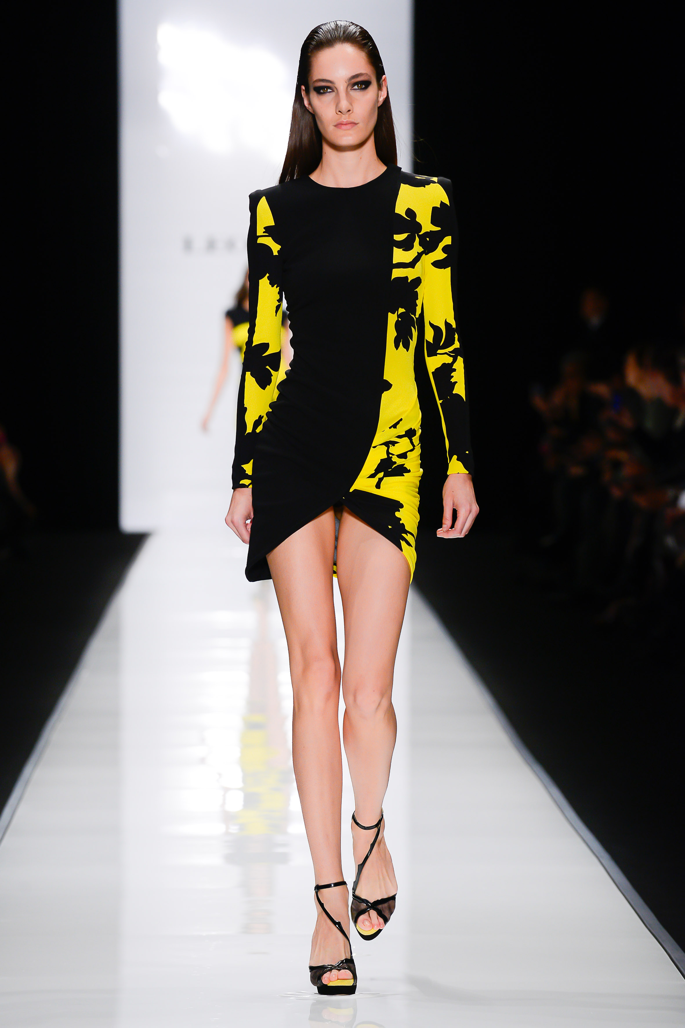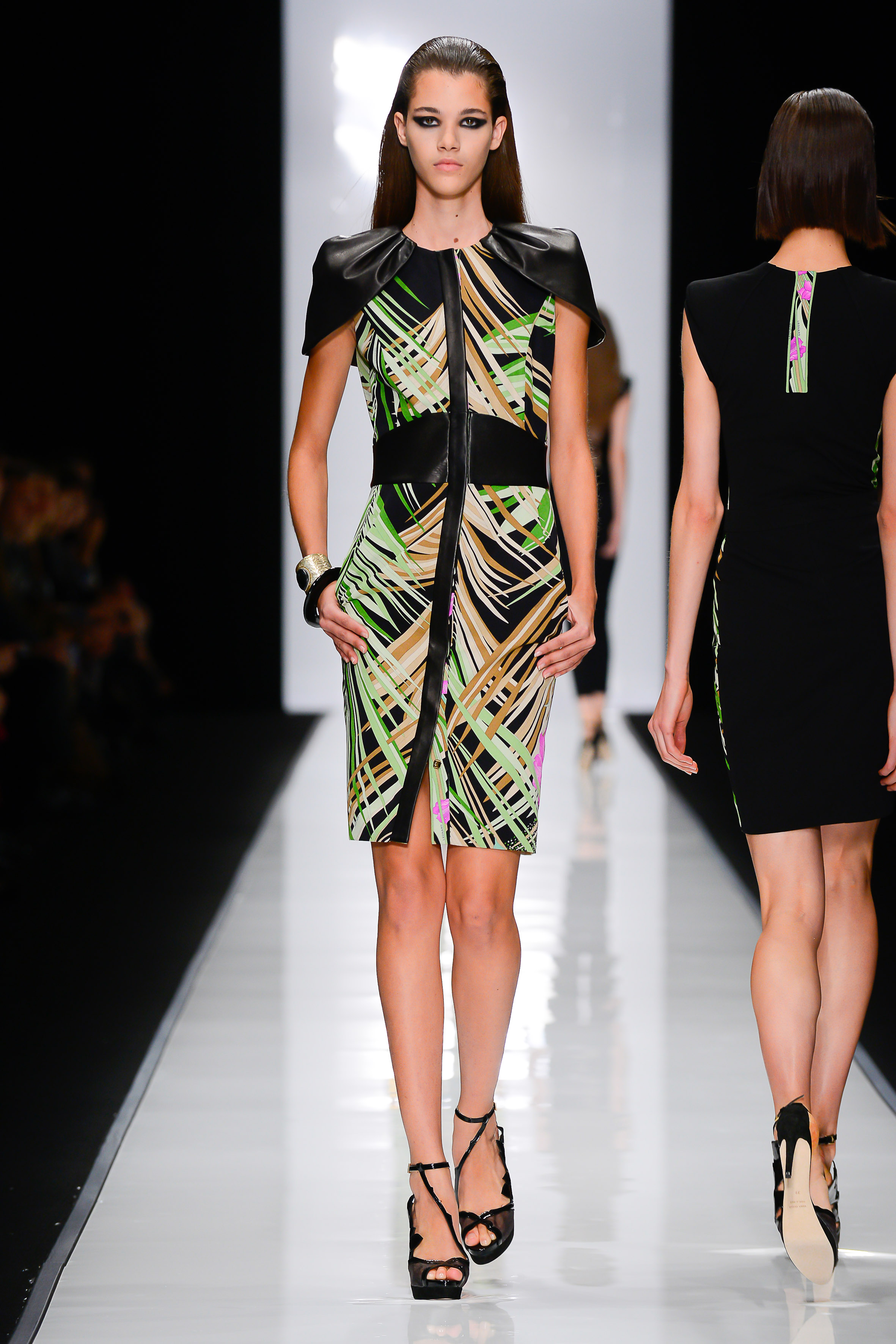 Tandis que la silhouette gagne en tension : moins de flou, plus de structure par la grâce d’épaulettes pagodes ou d’empiècements de cuir, les matières et traitements se diversifient (cuir découpé au laser sur fond d’organza, double georgette imprimée au ressort incroyable, soie laquée, jersey de soie contrecollé dense…). L’esthétique sharp de la jet-set des années 60’s-70’s, photographiée par Slim Aarons, a inspiré cette collection mais laisse parfois place à une poésie rafraichissante faite de petites robes drapées imprimées sur fond blanc, presque juvéniles, et de plissés « bijou » d’une délicatesse extrême. Le jour, les couleurs claquent, jaillissent, brûlent comme sous le soleil de midi. Le soir, elles fondent en corail fané, menthe douce, rose pâle doux comme un pétale, pour envahir de longues robes d’organza aux motifs floraux originaux.