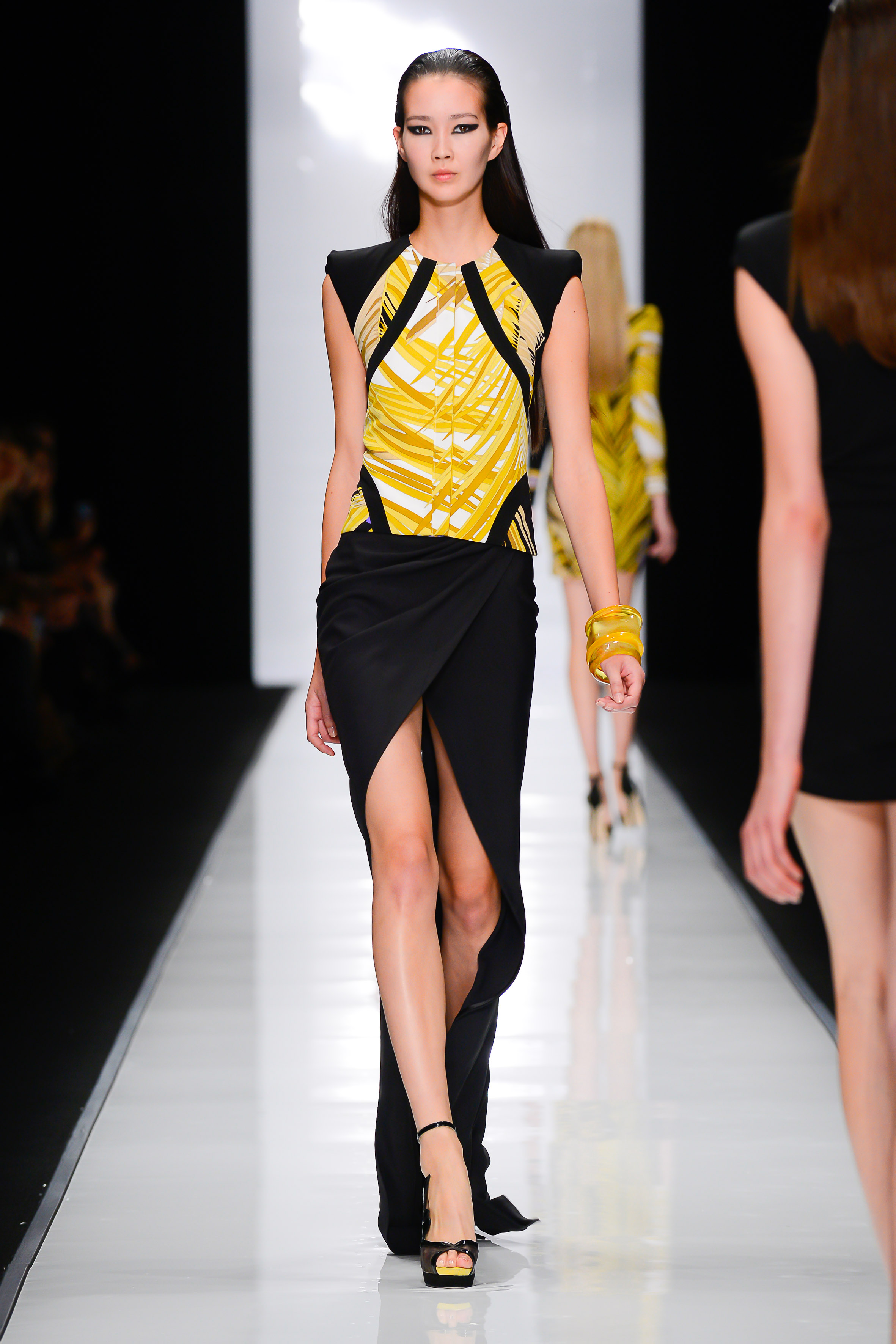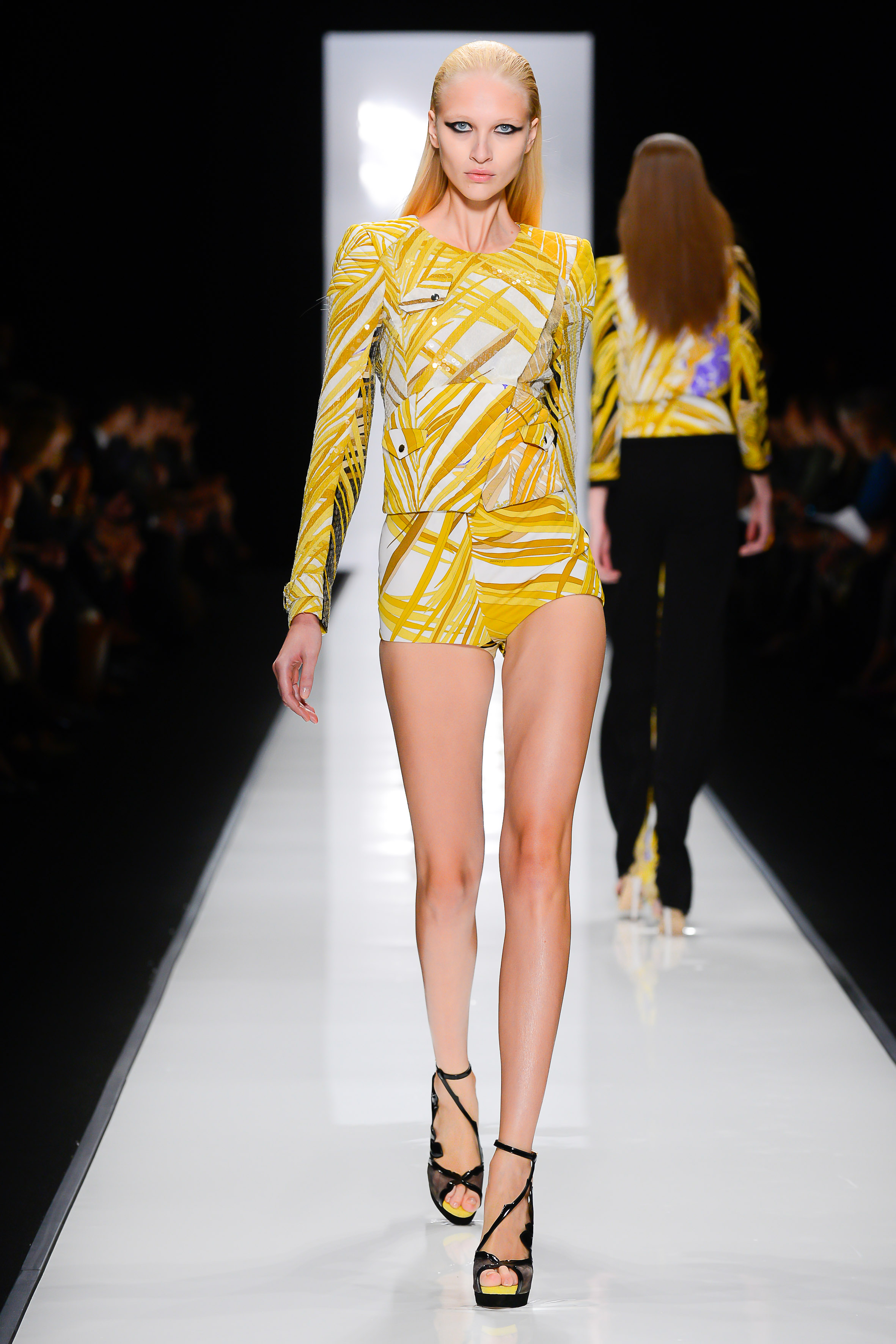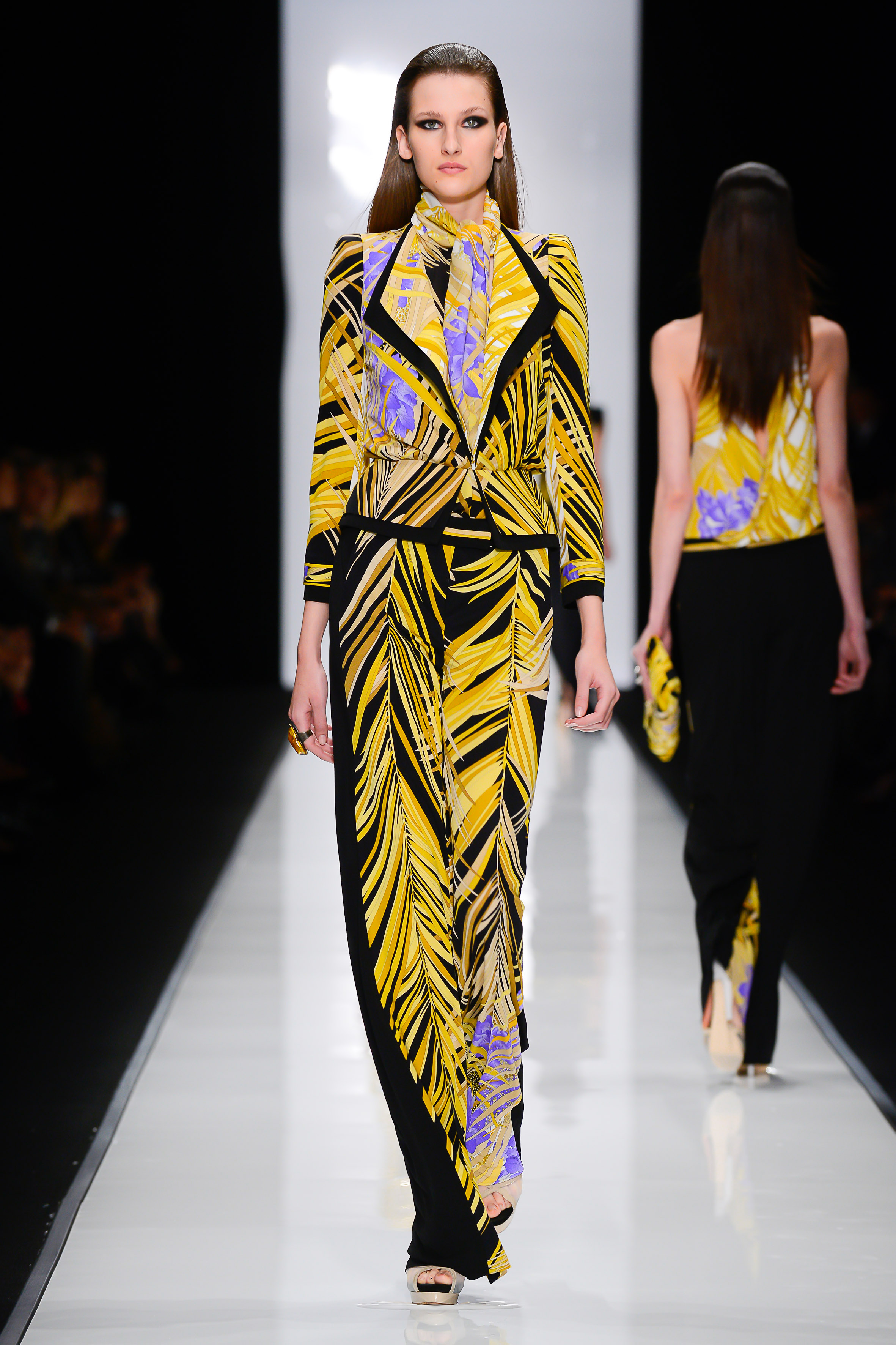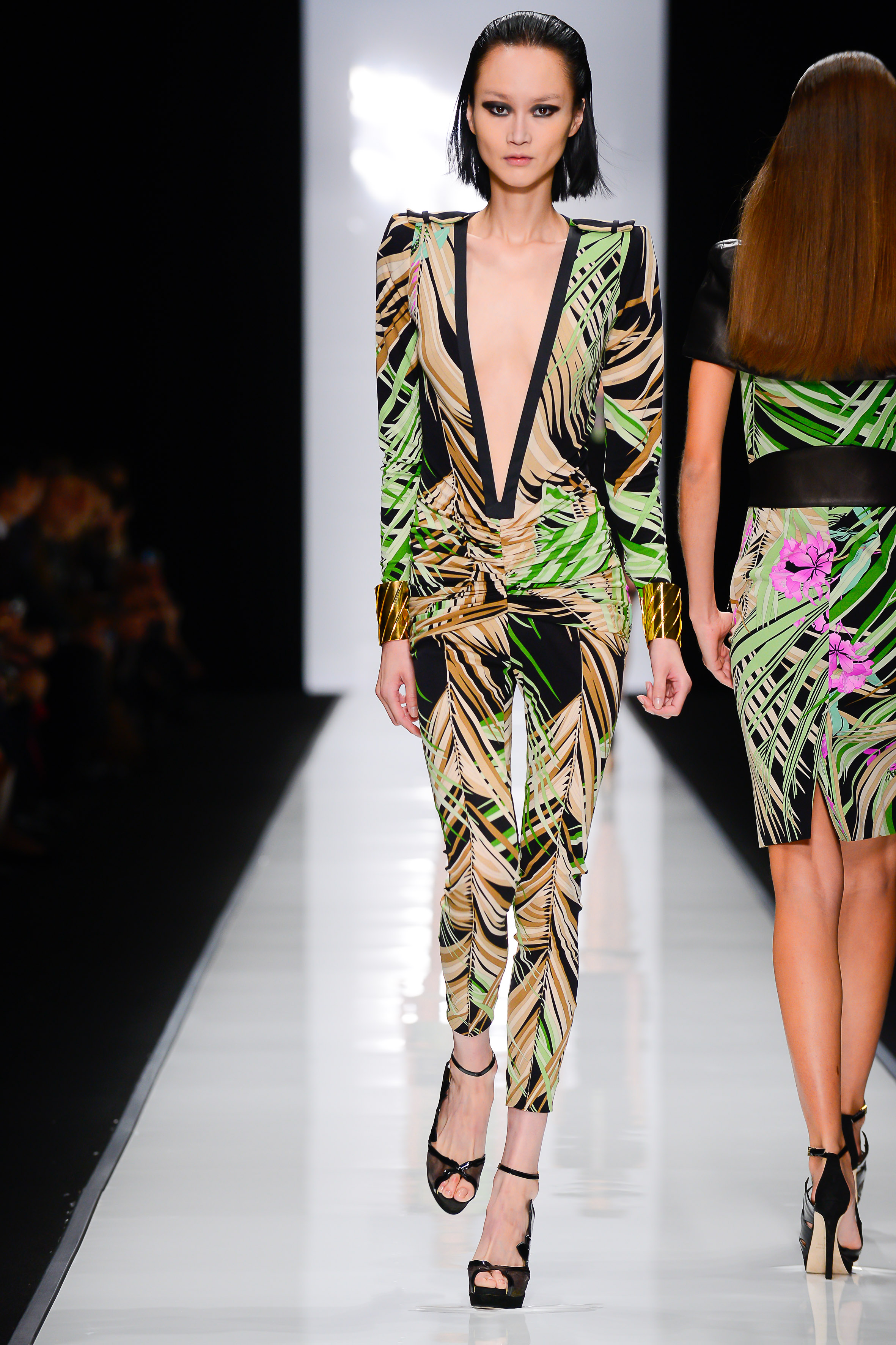 Les délicieux jerseys de soie maison sont travaillés en robe courte au décolleté plongeant, jumpsuit près du corps façon Catwoman ou veste de biker à regarder de près, véritable concentré de charme et de technicité (jersey de soie matelassé, en partie rebrodé de paillettes transparentes, imprimé Bambou recto sur fond blanc/verso sur fond noir).