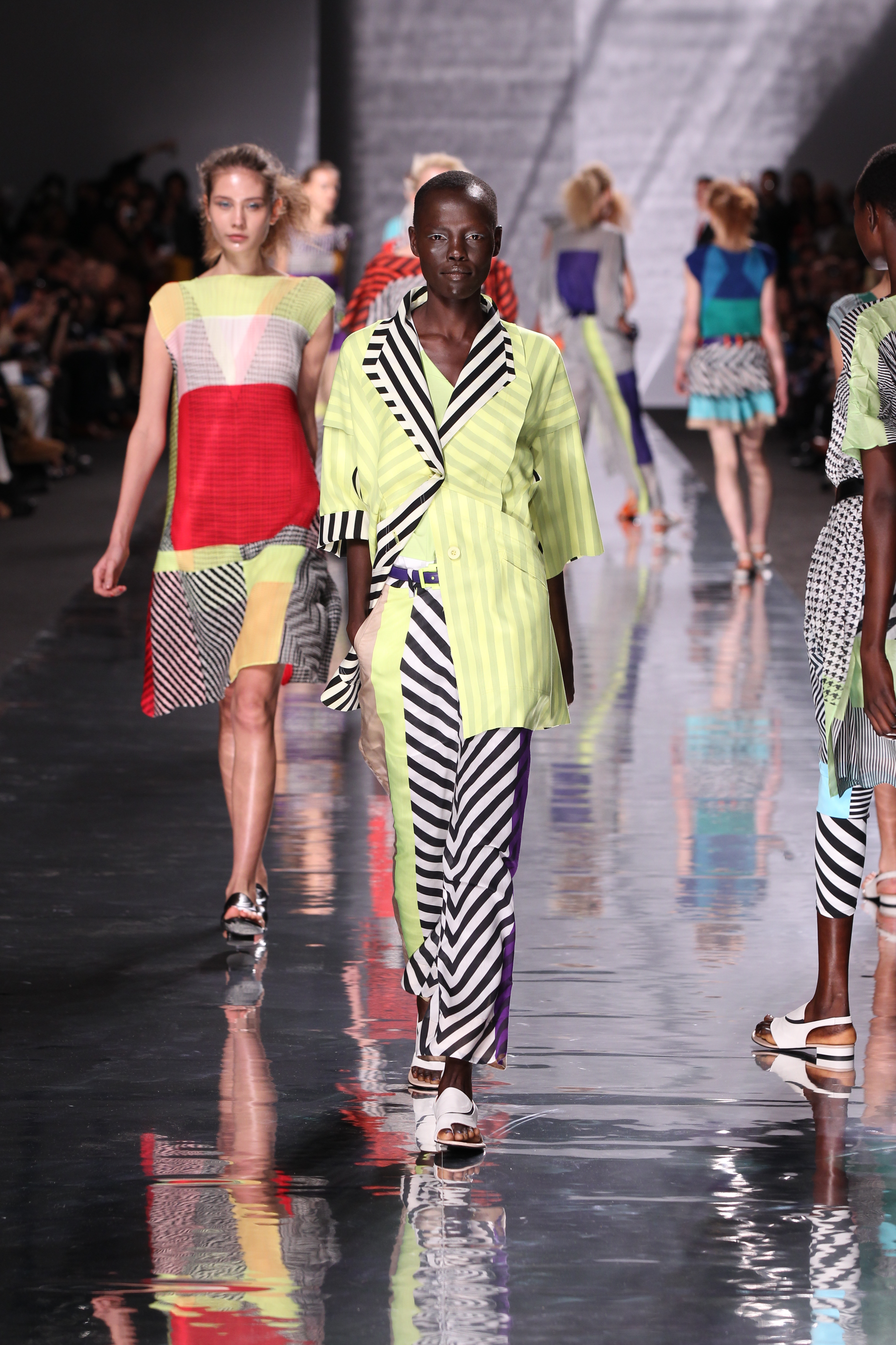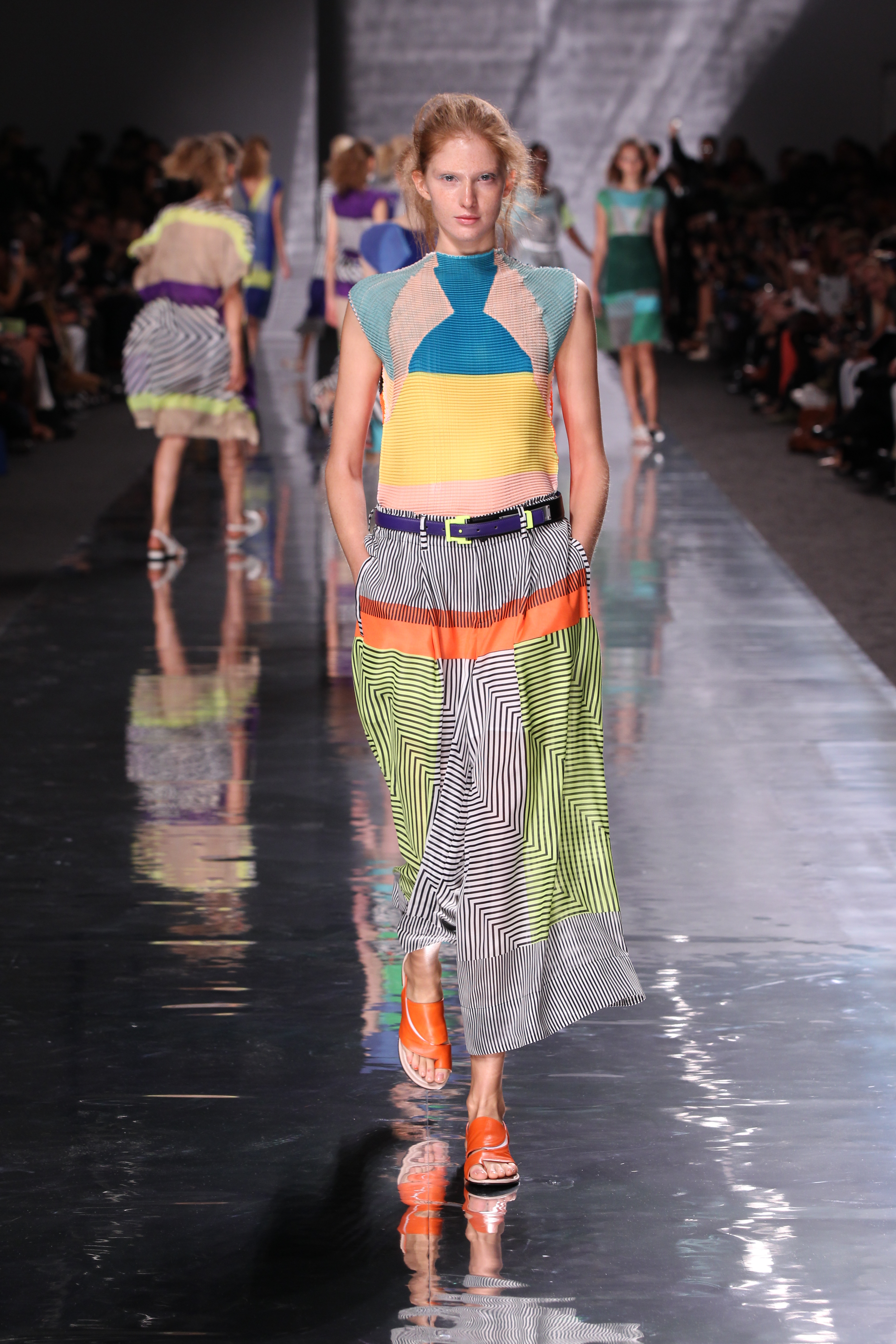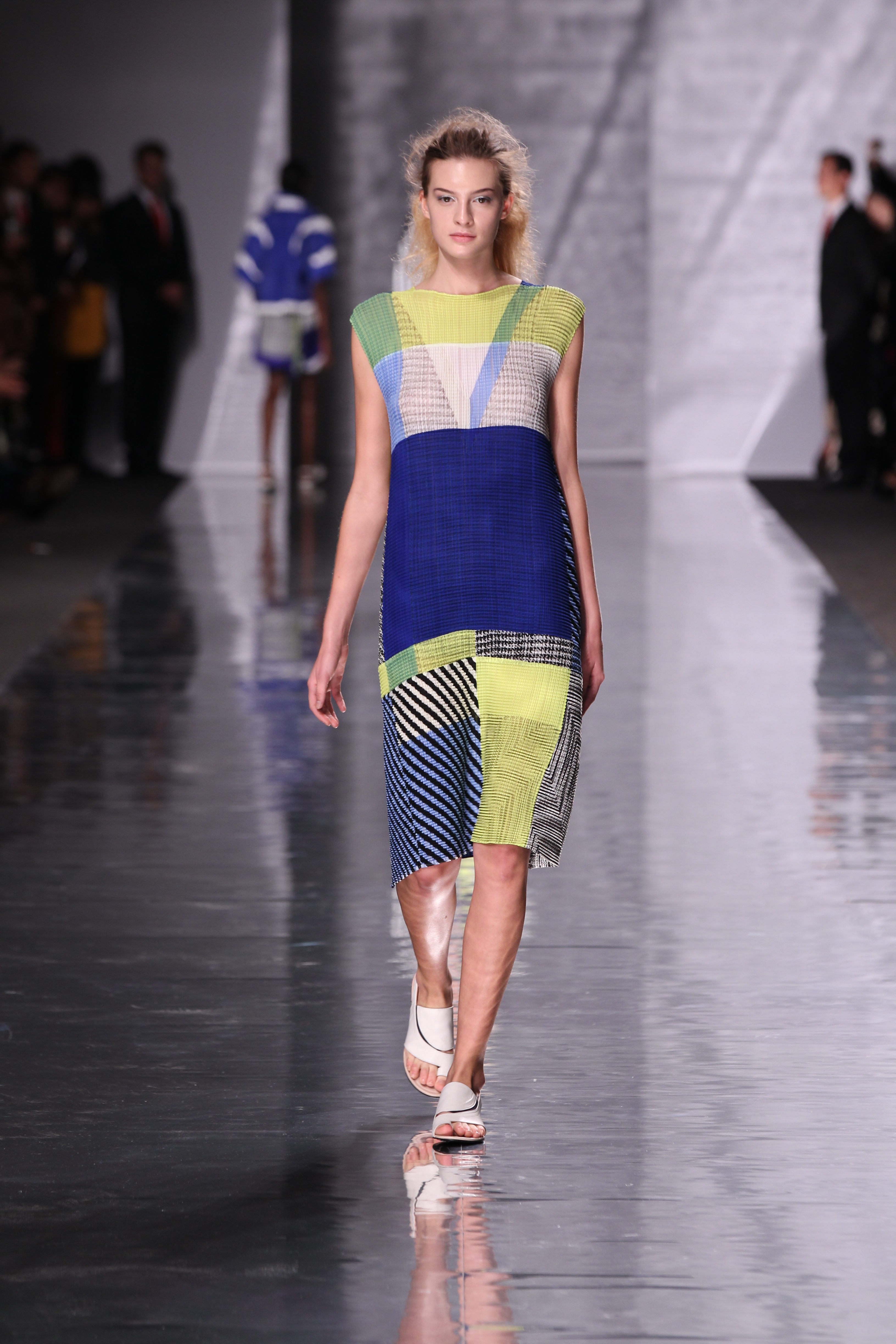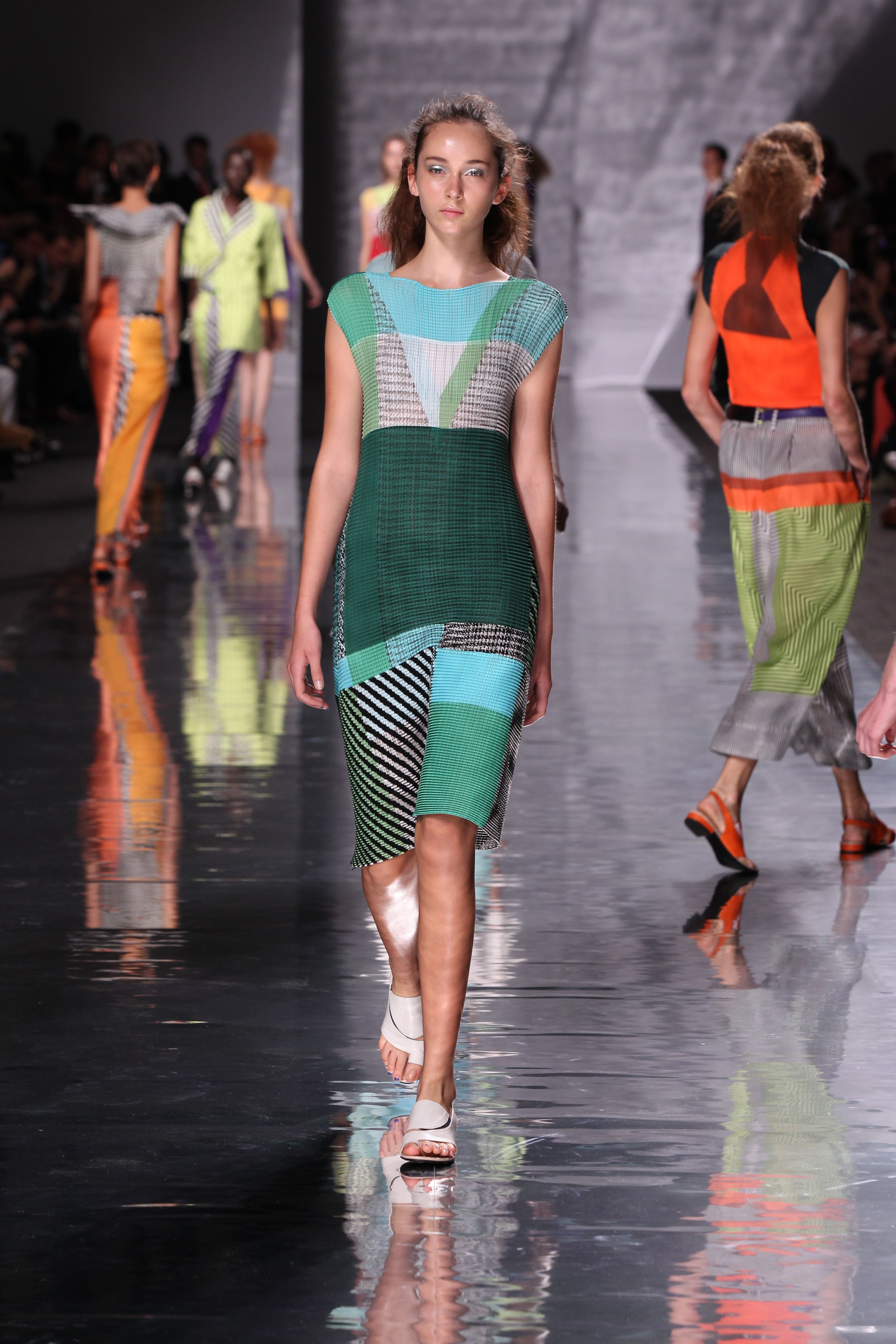 Et quelles couleurs ! Effectivement chez Issey Miyake, point de monotonie monochrome ou d’imprimés barbants. C’est à une véritable explosion chromatique que l’on assiste. Les vêtements intègrent bleu, vert, jaune, orange, rouge le tout formant une progression avec la musique du défilé. Lorsque nous arrivons à la couleur la plus vive et intense : le rouge, les mannequins ne défilent plus droit, le rythme de la musique est endiablé et la scène rappelle un foisonnement d’oiseaux des contrées tropicales.