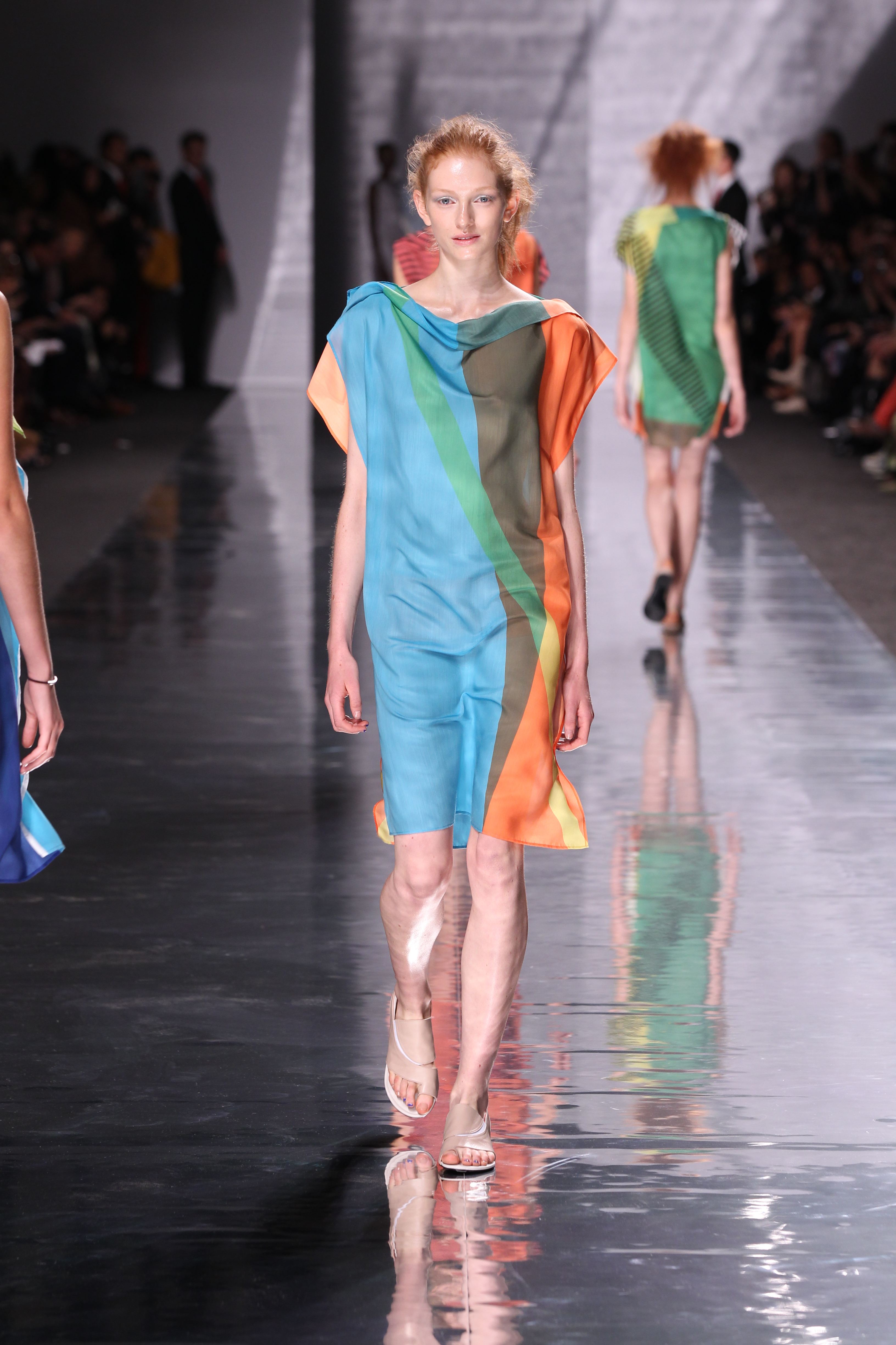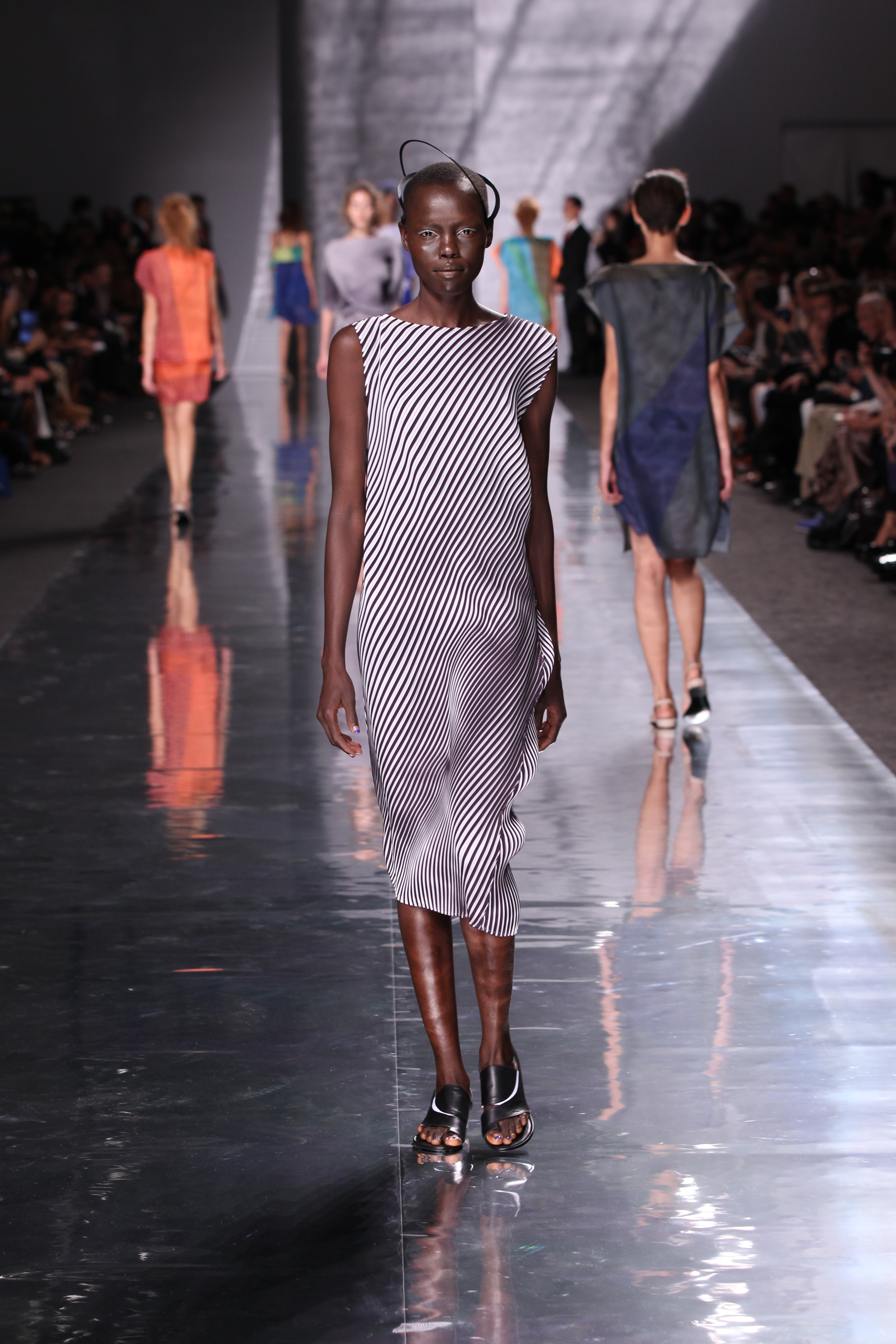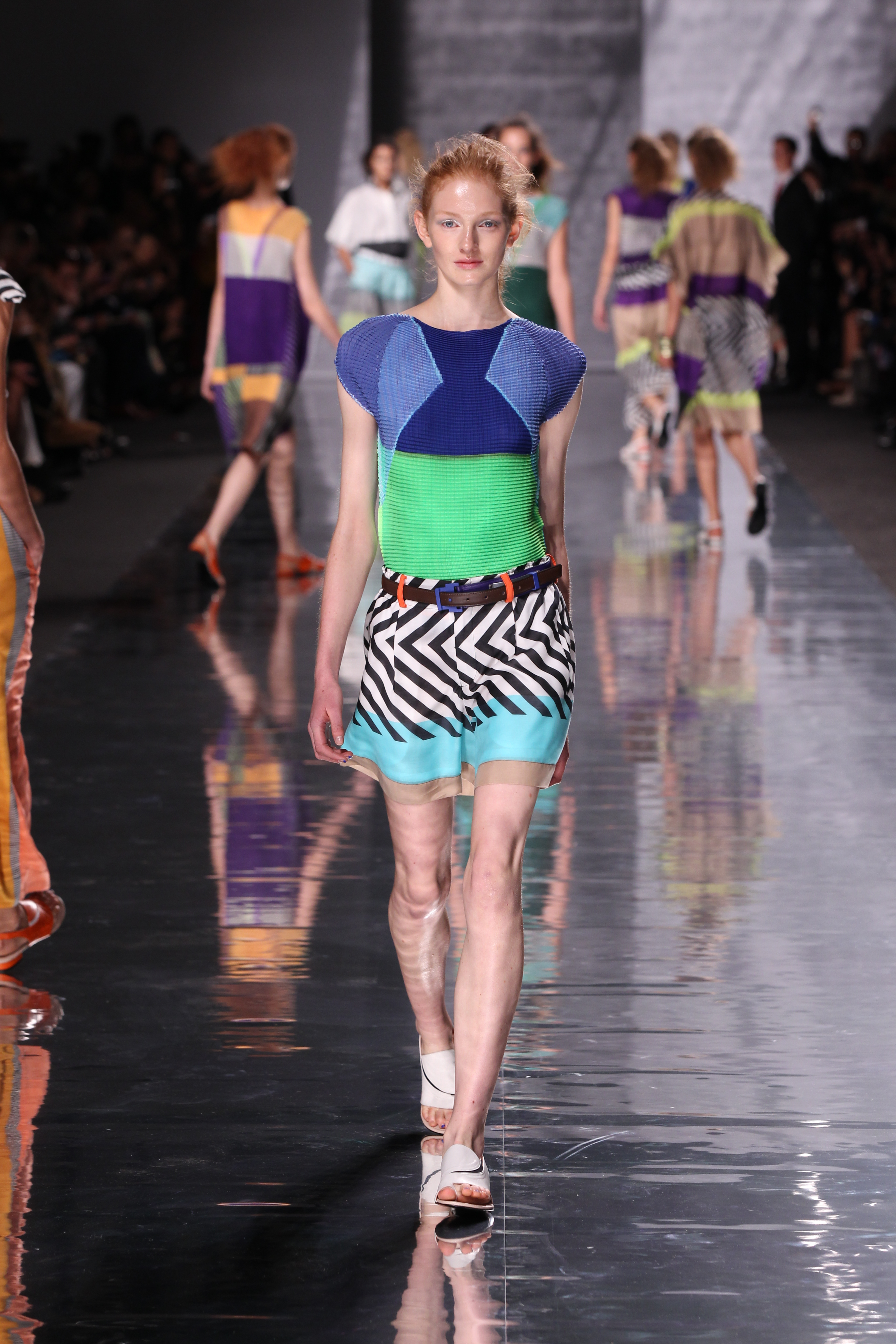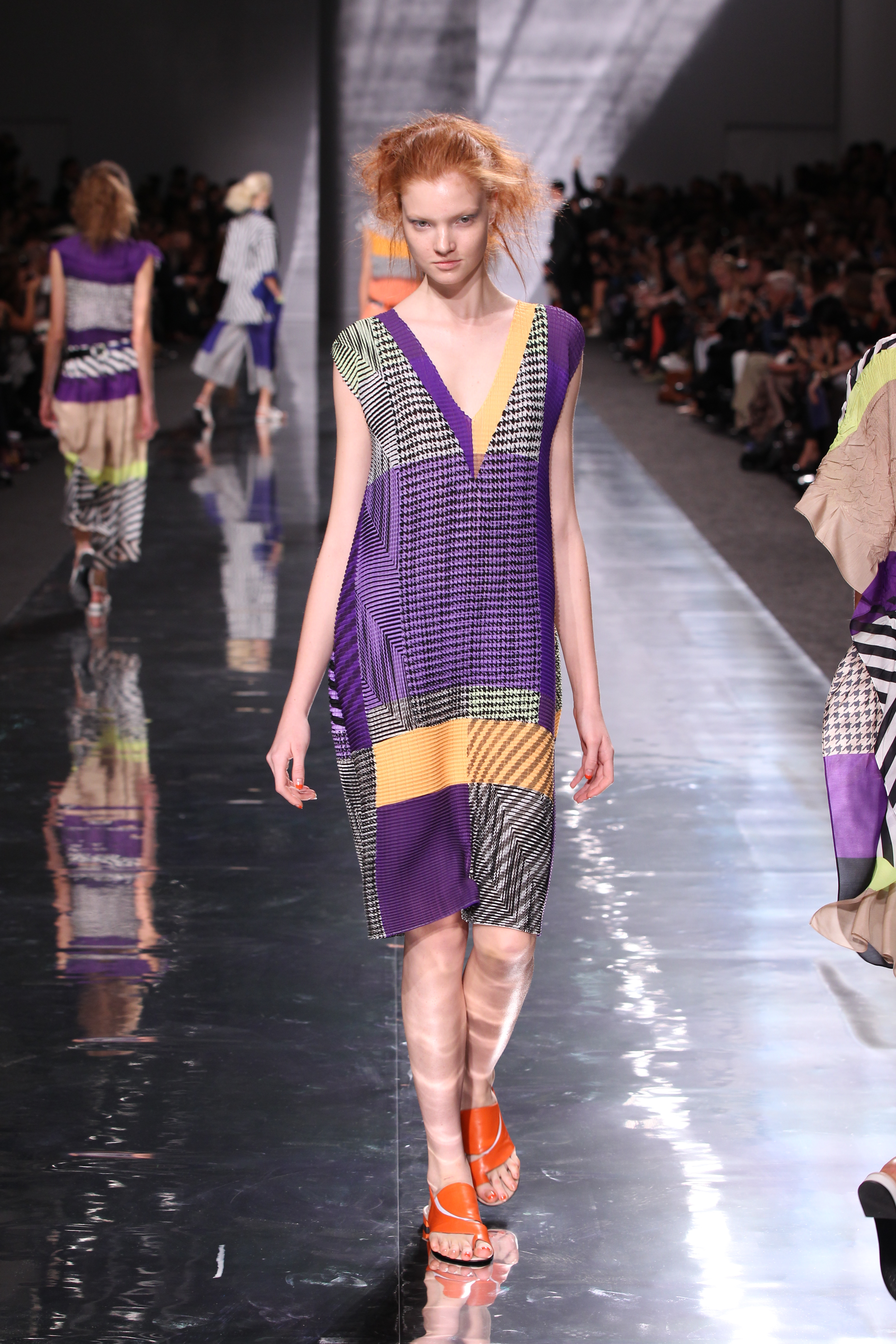 Et quelles couleurs ! Effectivement chez Issey Miyake, point de monotonie monochrome ou d’imprimés barbants. C’est à une véritable explosion chromatique que l’on assiste. Les vêtements intègrent bleu, vert, jaune, orange, rouge le tout formant une progression avec la musique du défilé. Lorsque nous arrivons à la couleur la plus vive et intense : le rouge, les mannequins ne défilent plus droit, le rythme de la musique est endiablé et la scène rappelle un foisonnement d’oiseaux des contrées tropicales.