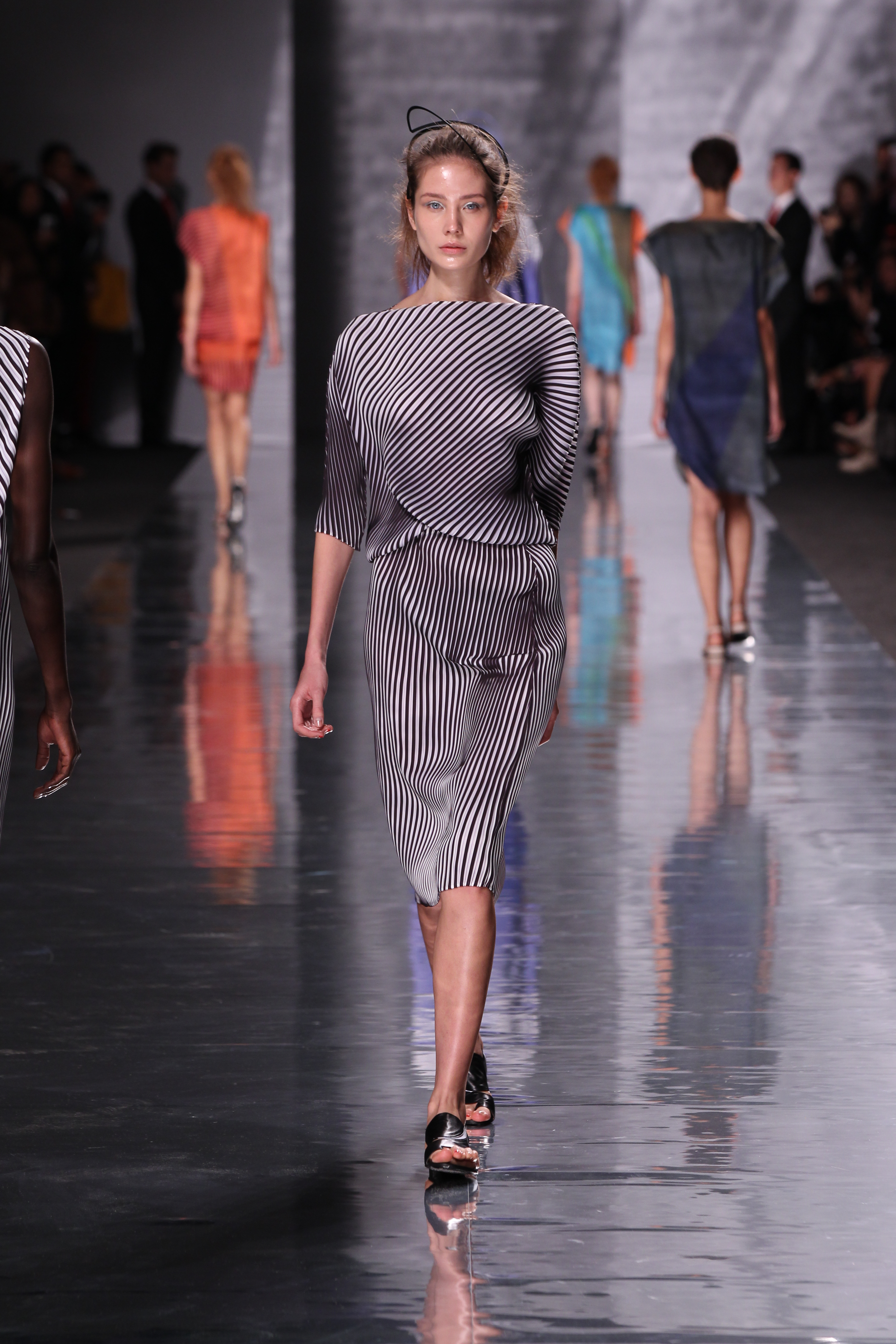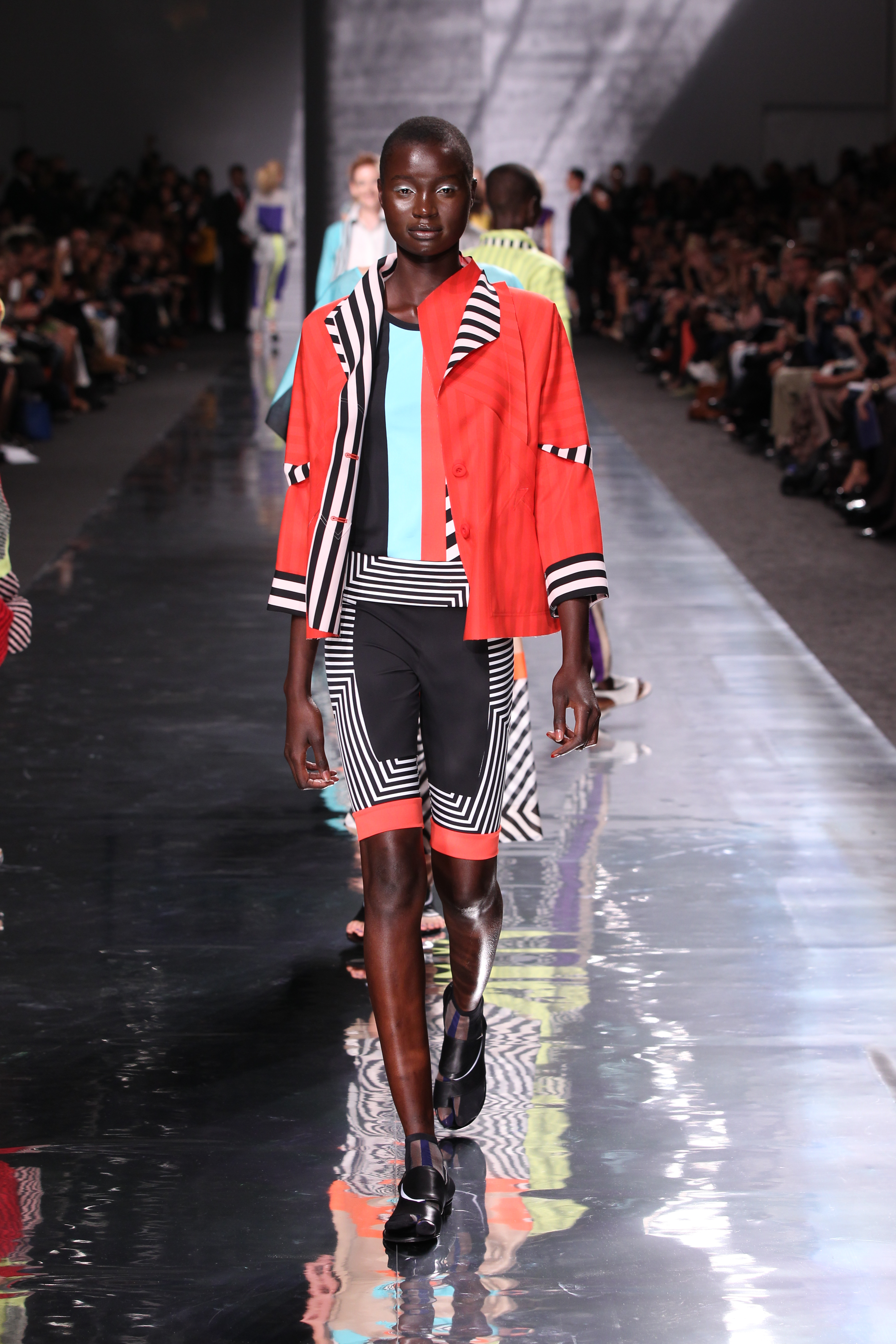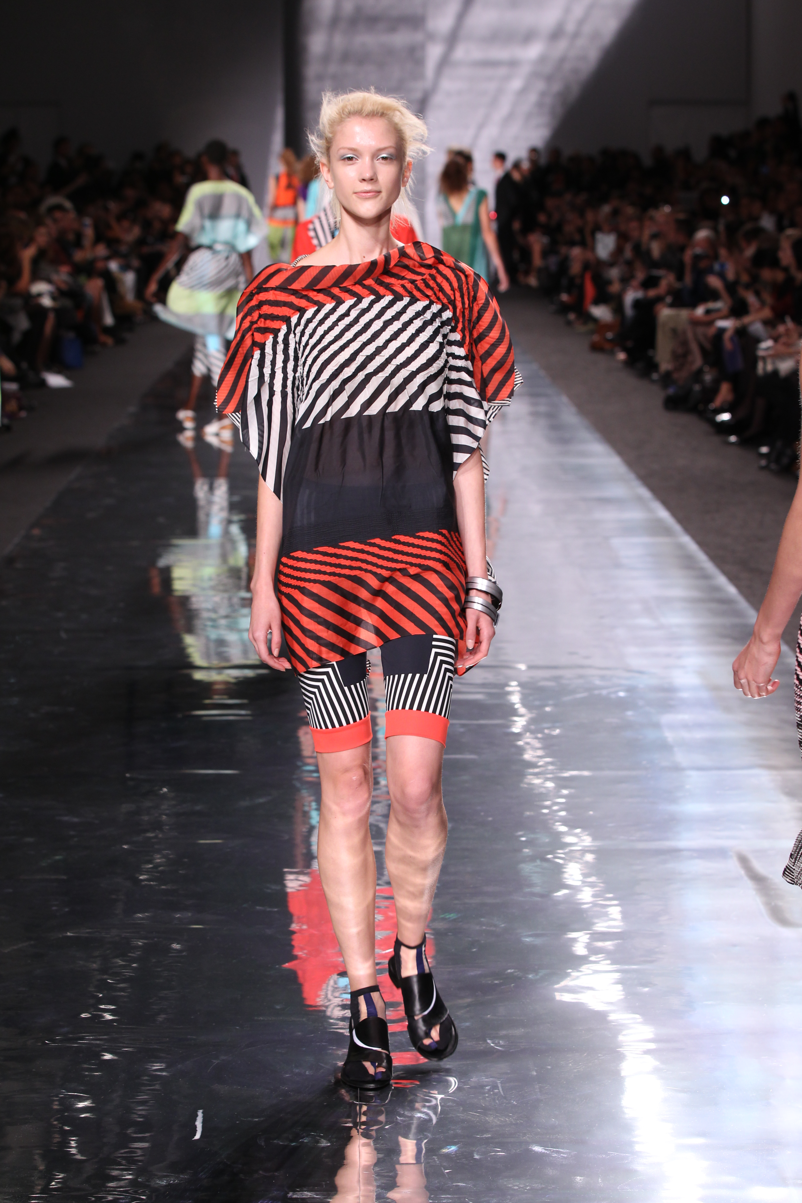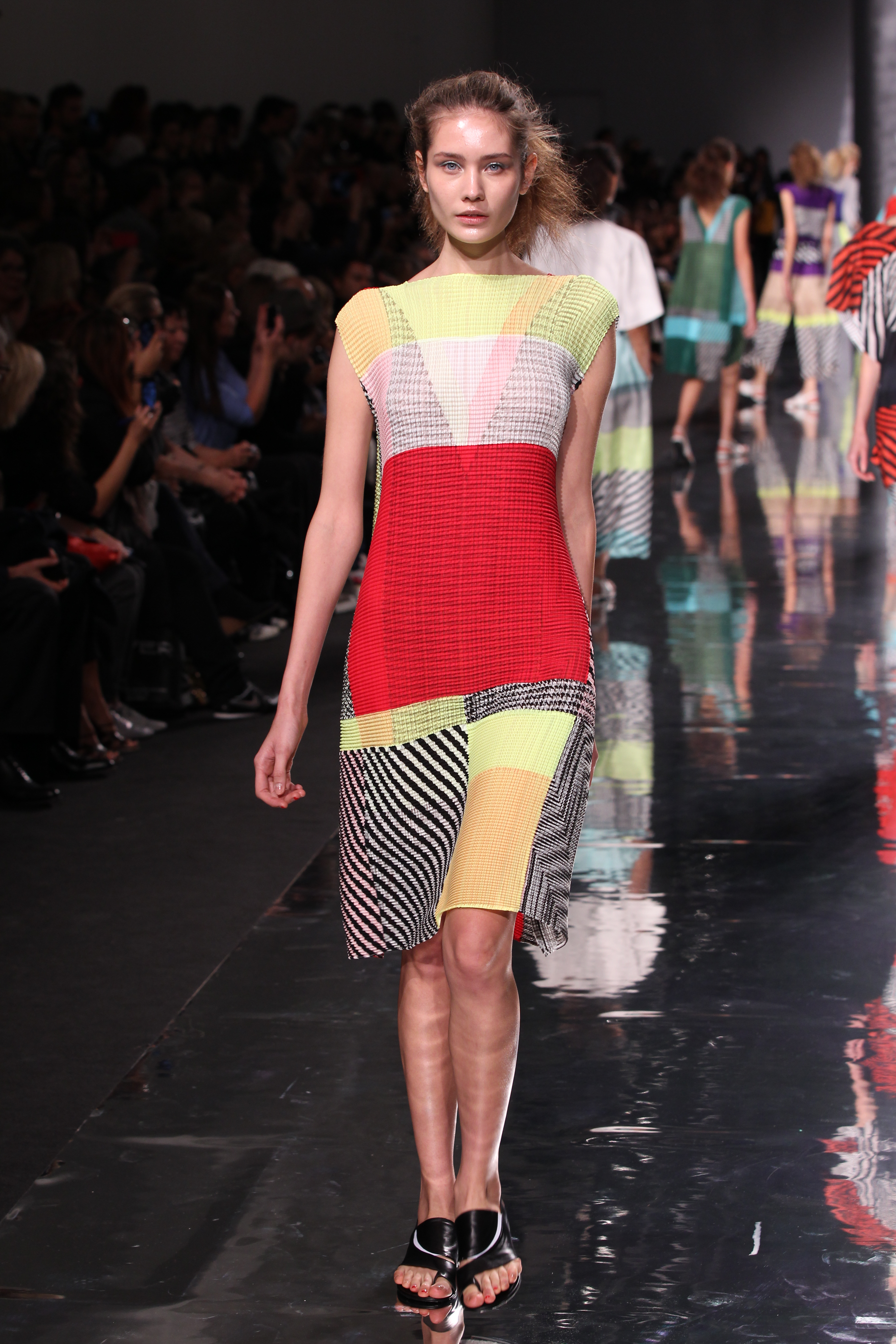 Et quelles couleurs ! Effectivement chez Issey Miyake, point de monotonie monochrome ou d’imprimés barbants. C’est à une véritable explosion chromatique que l’on assiste. Les vêtements intègrent bleu, vert, jaune, orange, rouge le tout formant une progression avec la musique du défilé. Lorsque nous arrivons à la couleur la plus vive et intense : le rouge, les mannequins ne défilent plus droit, le rythme de la musique est endiablé et la scène rappelle un foisonnement d’oiseaux des contrées tropicales.