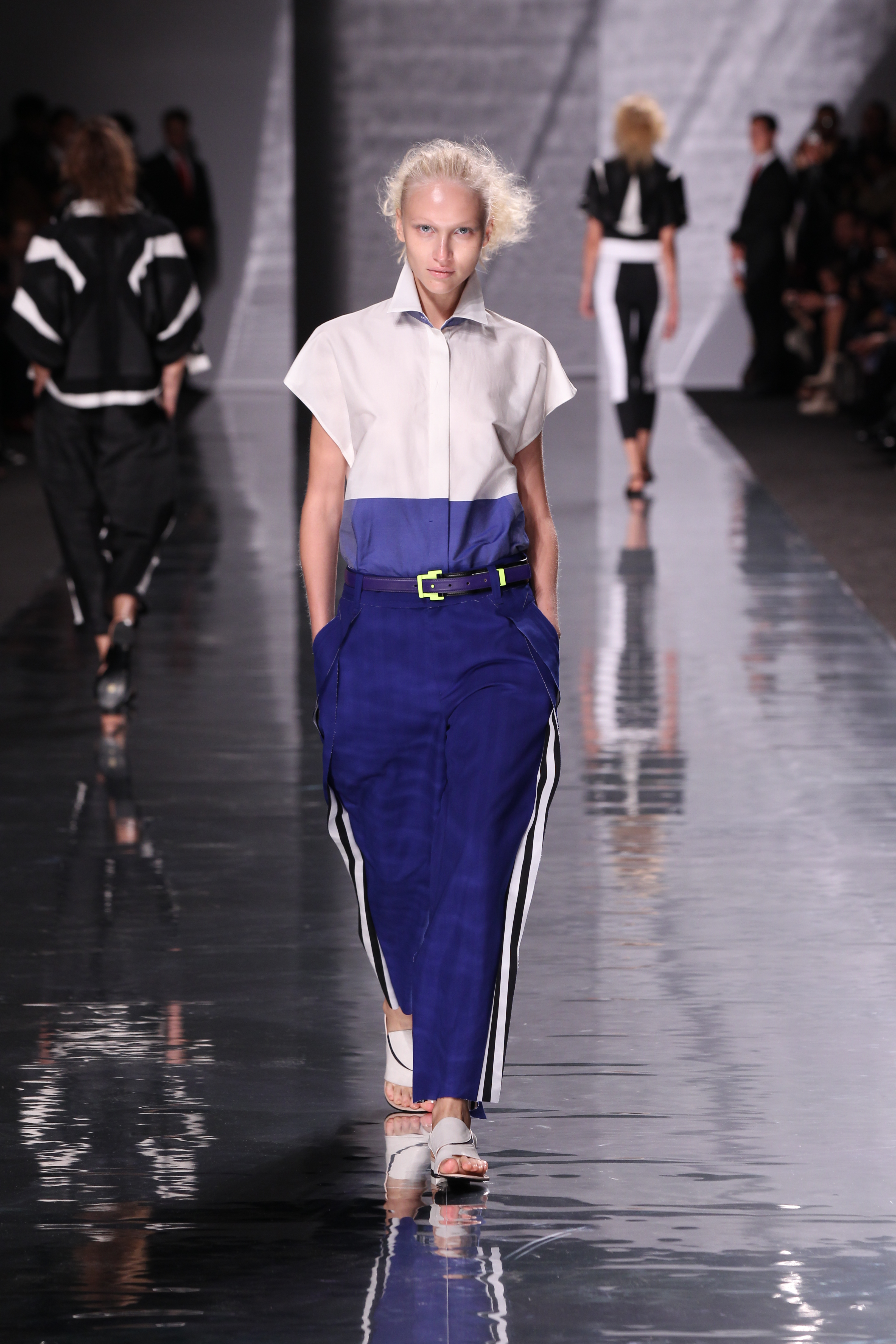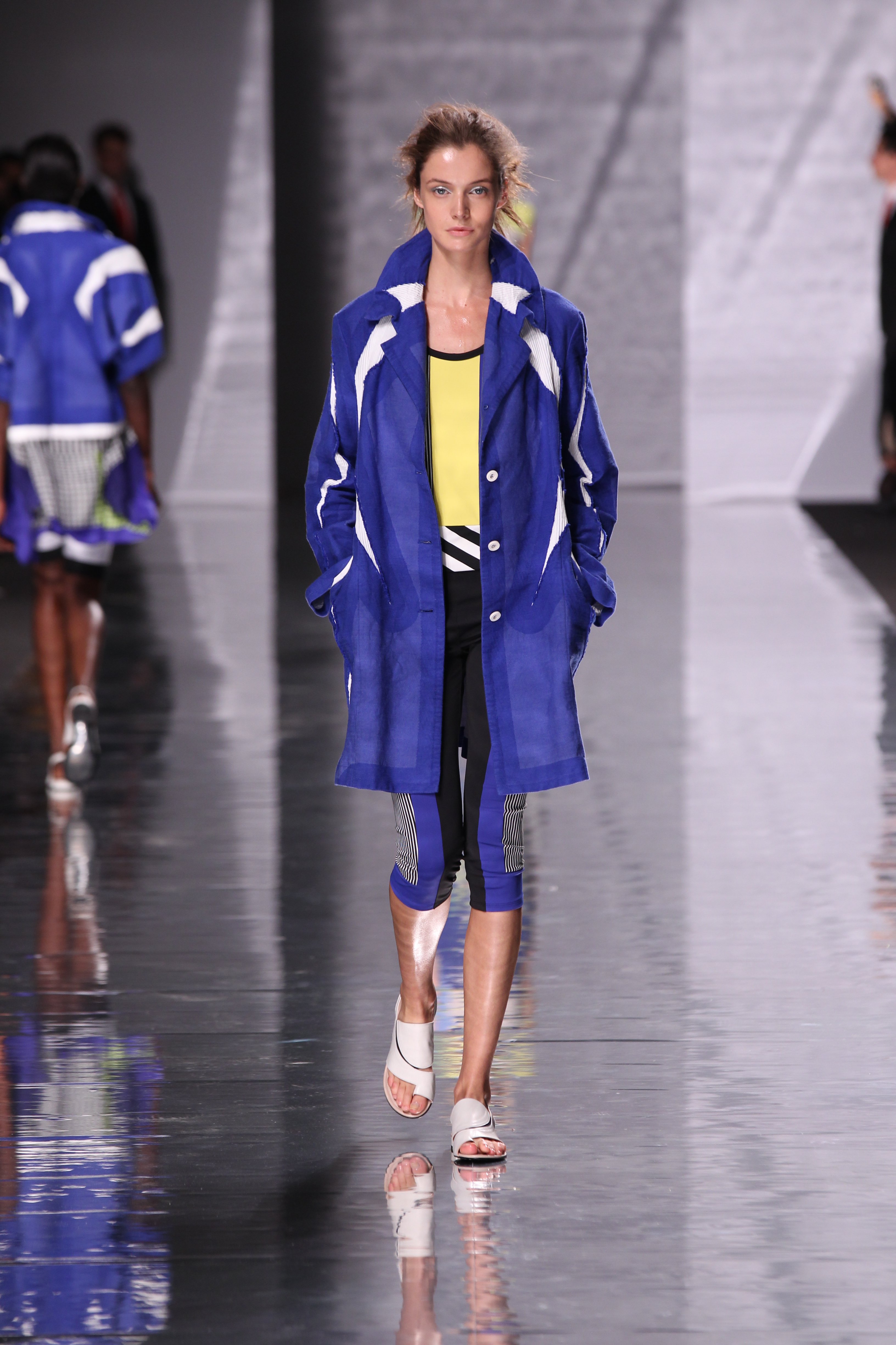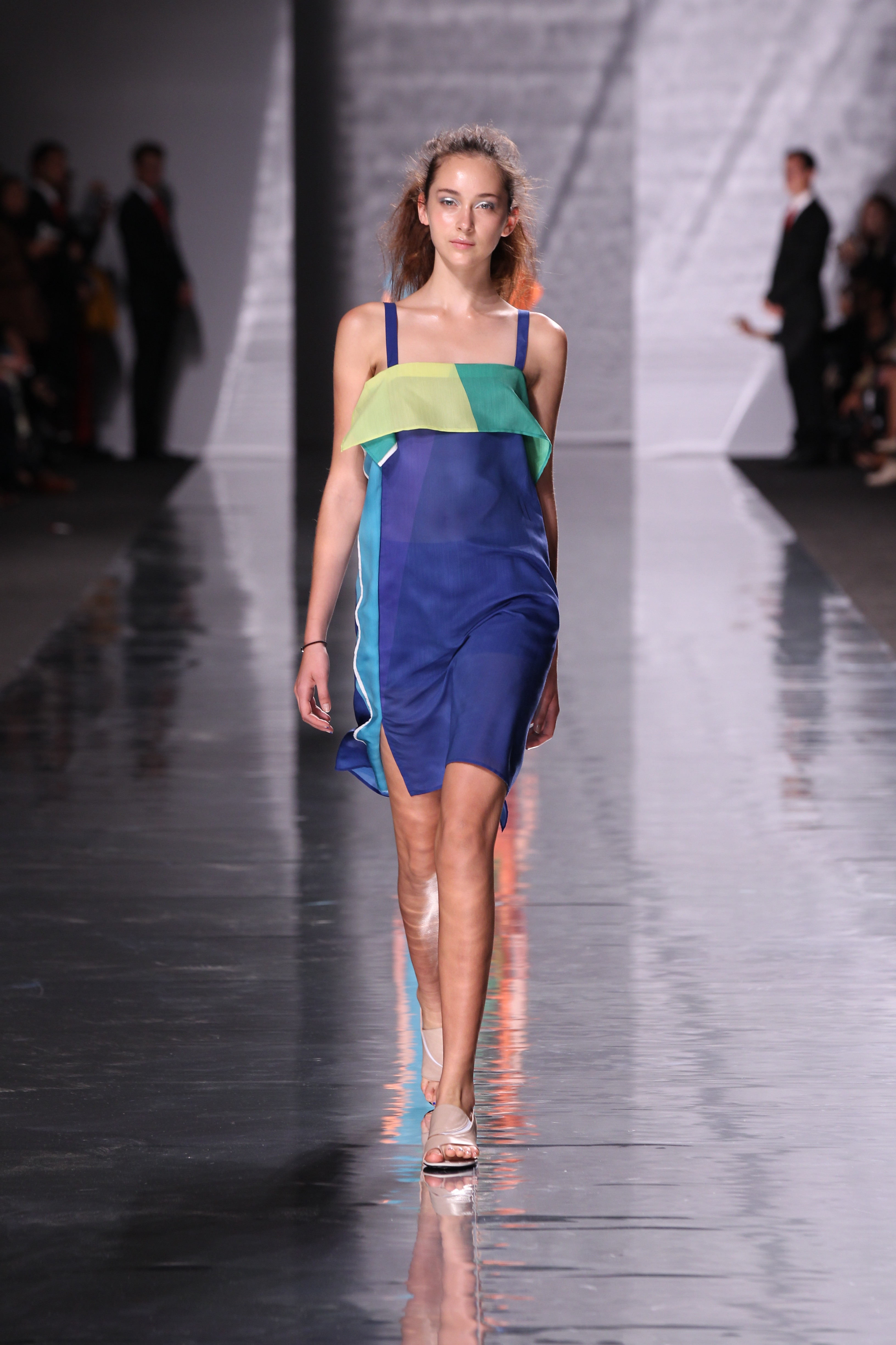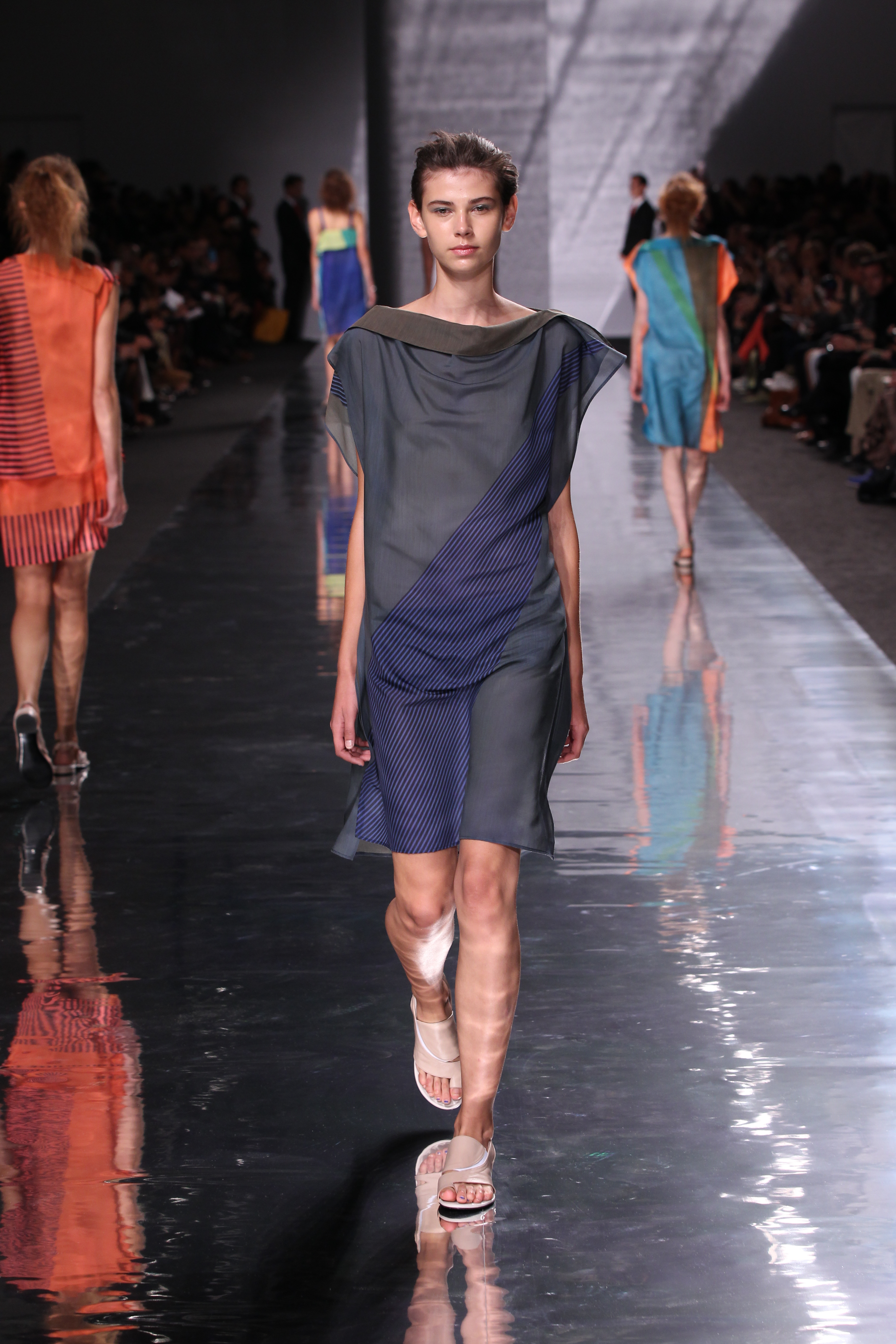 Et quelles couleurs ! Effectivement chez Issey Miyake, point de monotonie monochrome ou d’imprimés barbants. C’est à une véritable explosion chromatique que l’on assiste. Les vêtements intègrent bleu, vert, jaune, orange, rouge le tout formant une progression avec la musique du défilé. Lorsque nous arrivons à la couleur la plus vive et intense : le rouge, les mannequins ne défilent plus droit, le rythme de la musique est endiablé et la scène rappelle un foisonnement d’oiseaux des contrées tropicales.