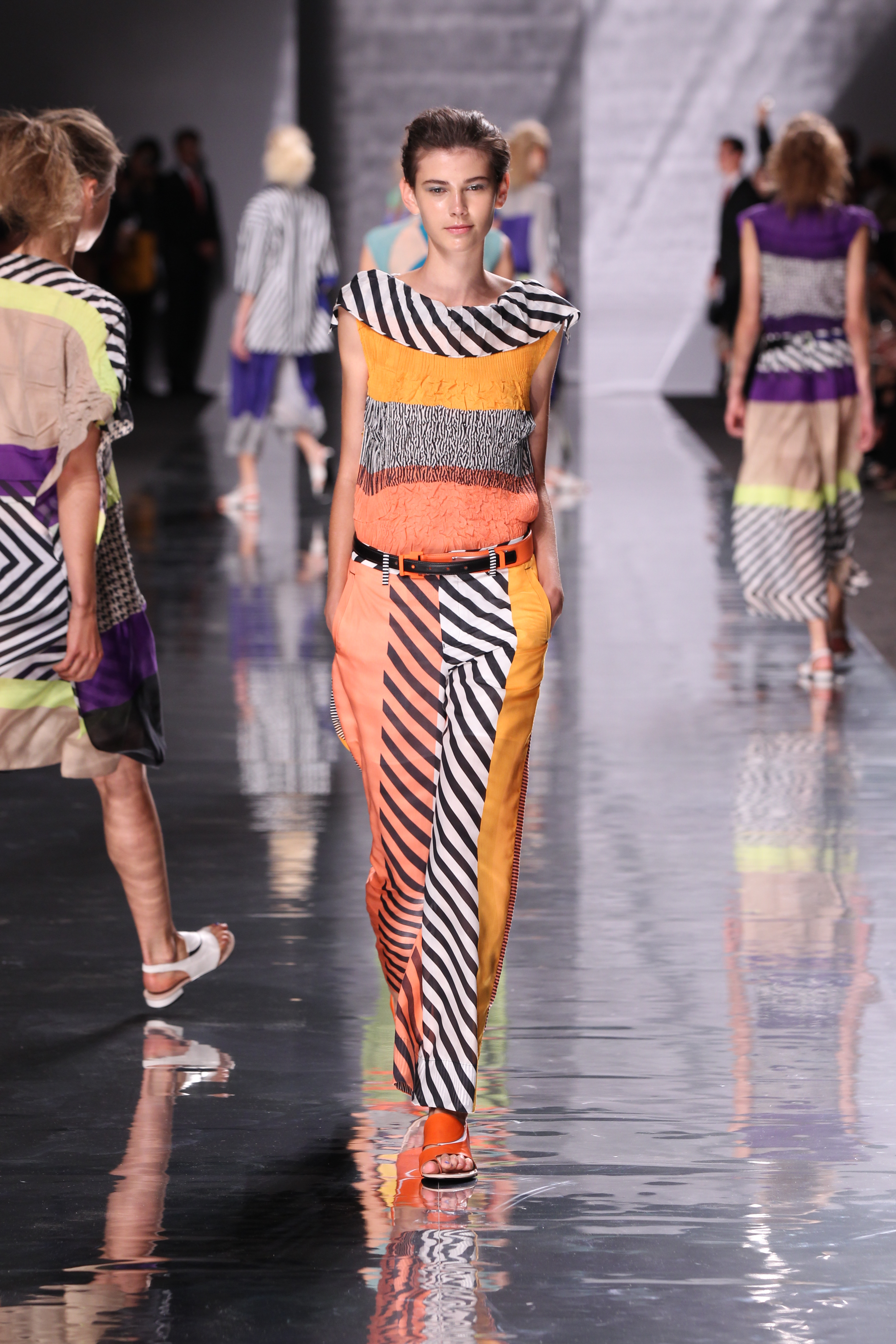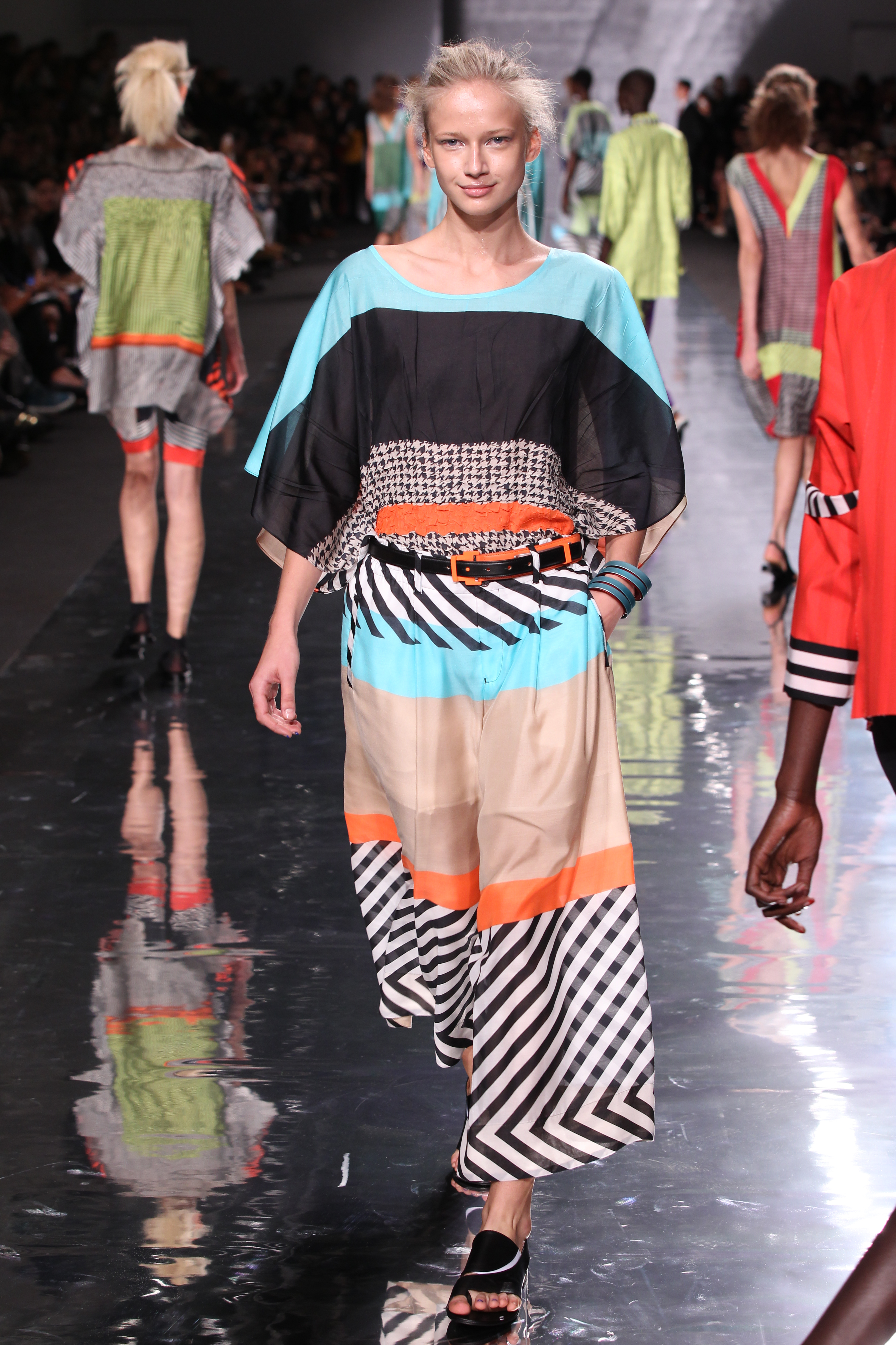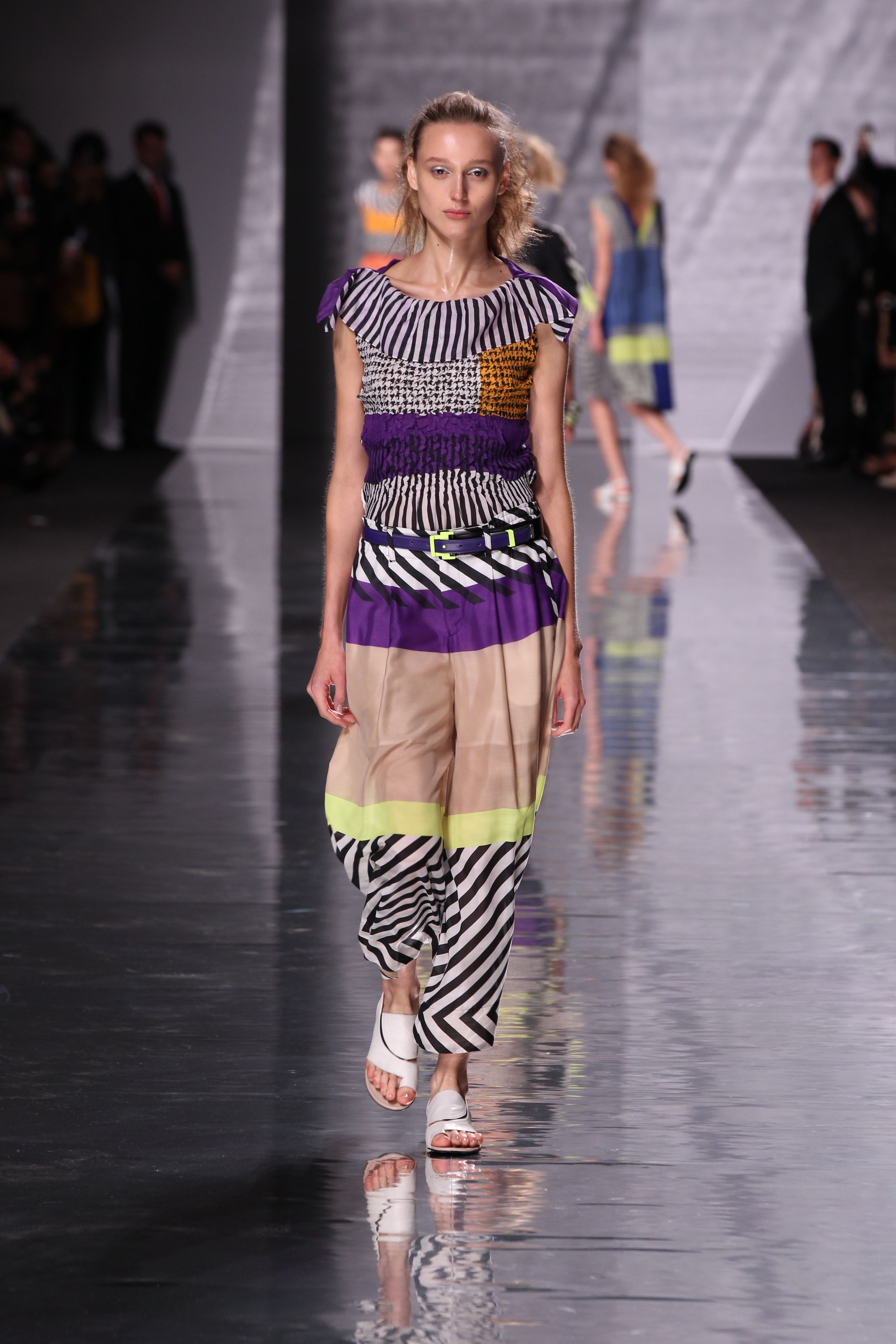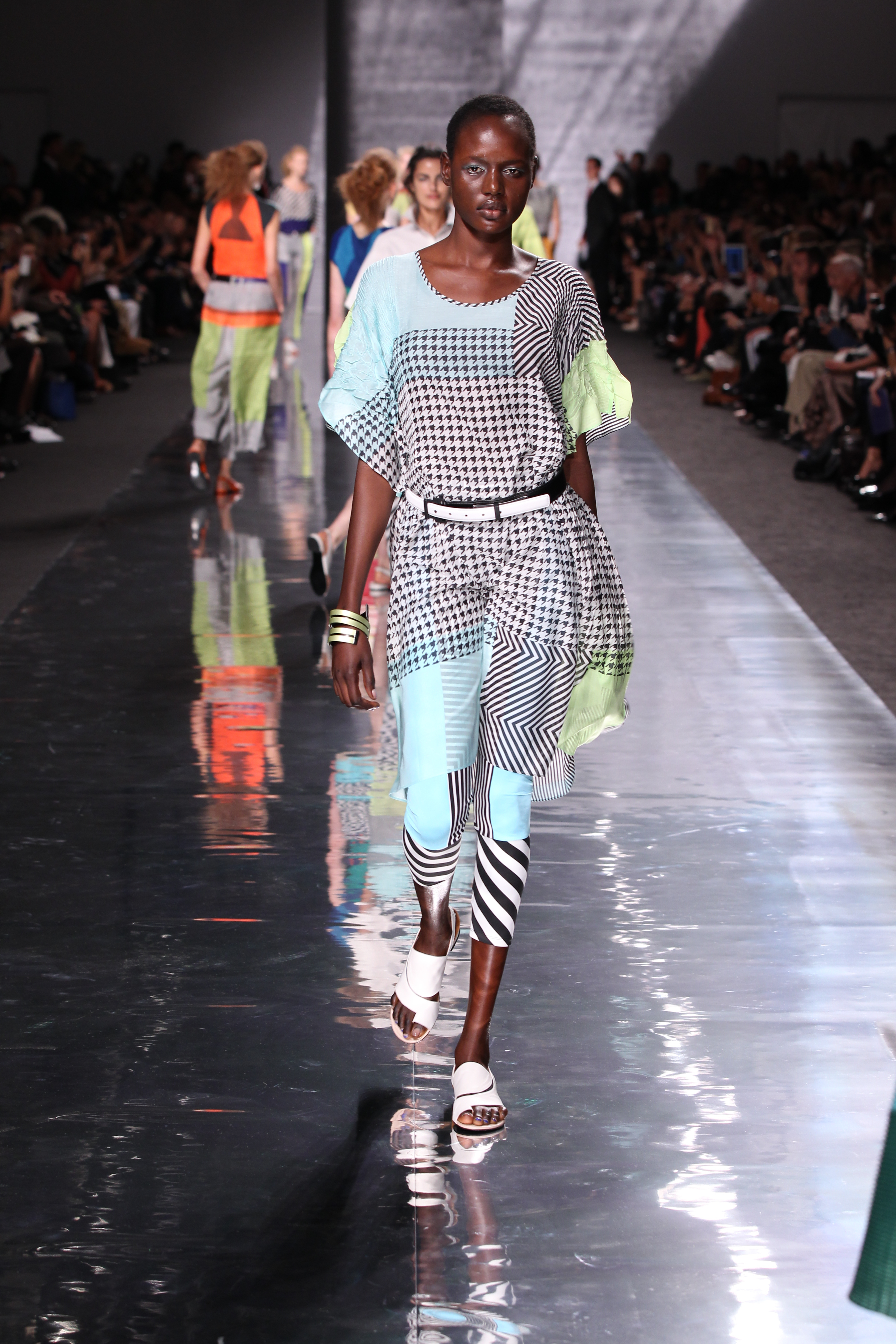 La structure est aussi cohérente avec l’ensemble, plissés, drapes et toutes sortes de longueurs et de superpositions ainsi que de volumes. Les imprimes sont présents à foison avec des rayures et une nouvelle interprétation du motif pied de poule pour le moins remarquable, a l’image de l’ensemble de cette collection « Éclats de couleurs »