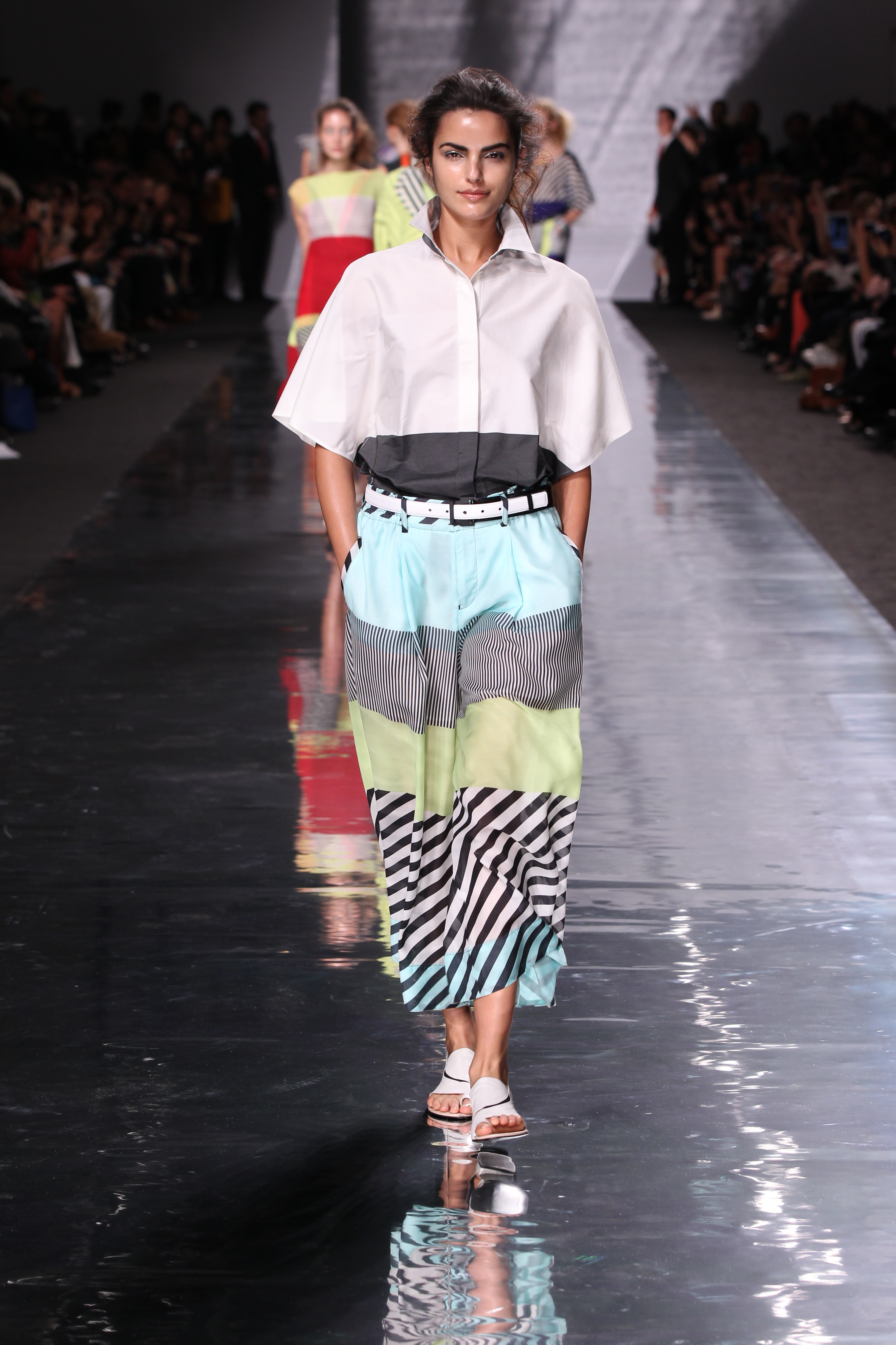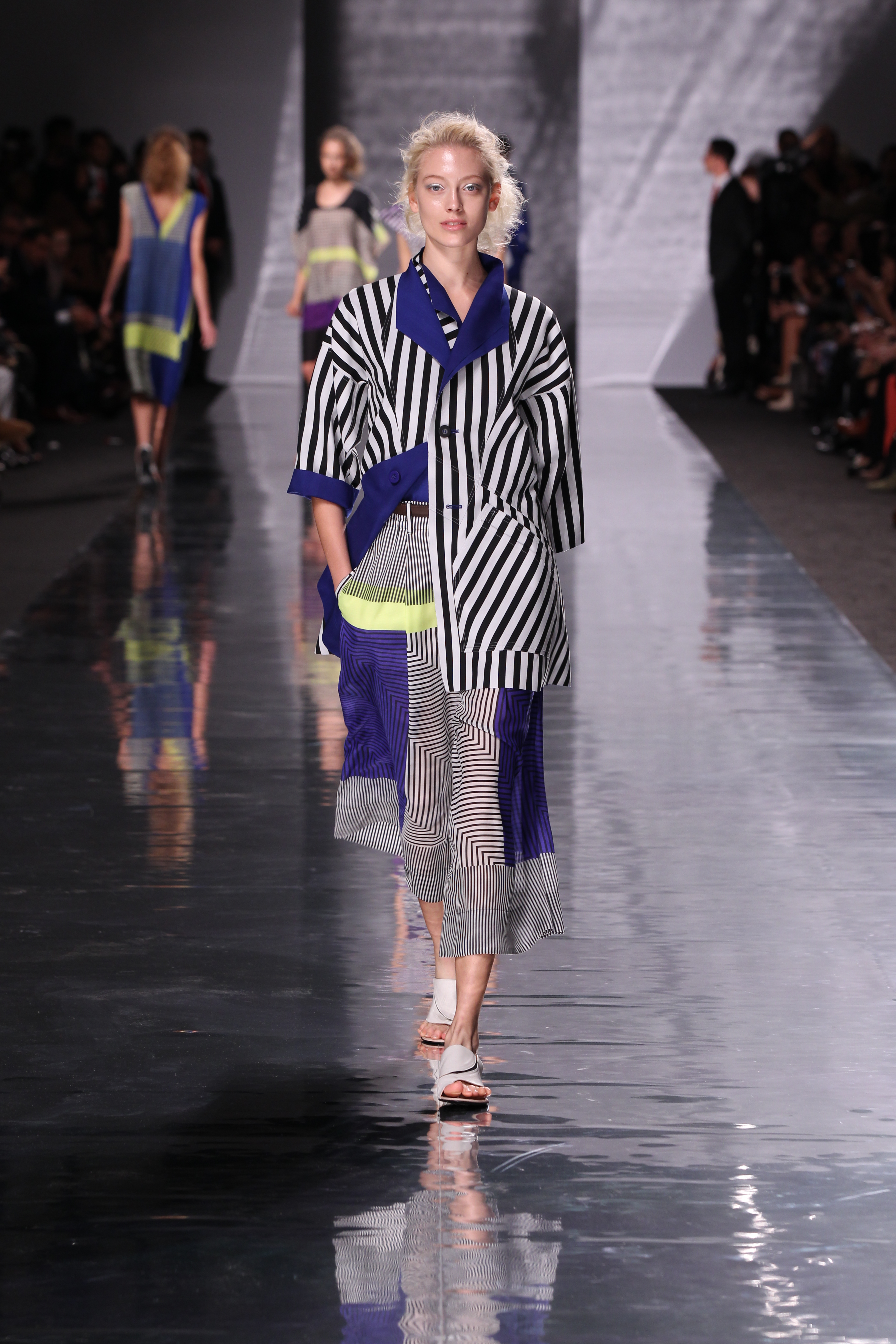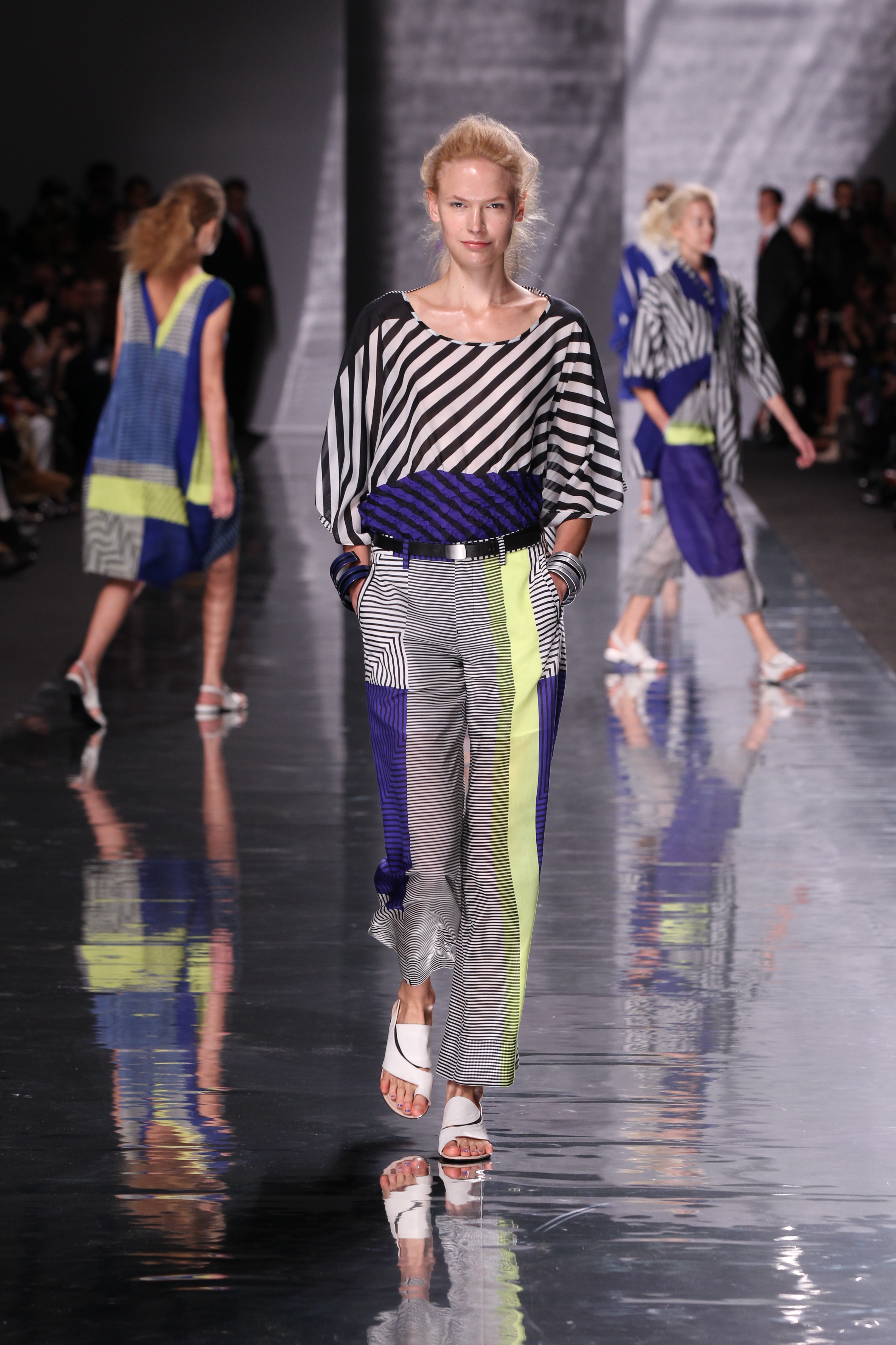 La structure est aussi cohérente avec l’ensemble, plissés, drapes et toutes sortes de longueurs et de superpositions ainsi que de volumes. Les imprimes sont présents à foison avec des rayures et une nouvelle interprétation du motif pied de poule pour le moins remarquable, a l’image de l’ensemble de cette collection « Éclats de couleurs »