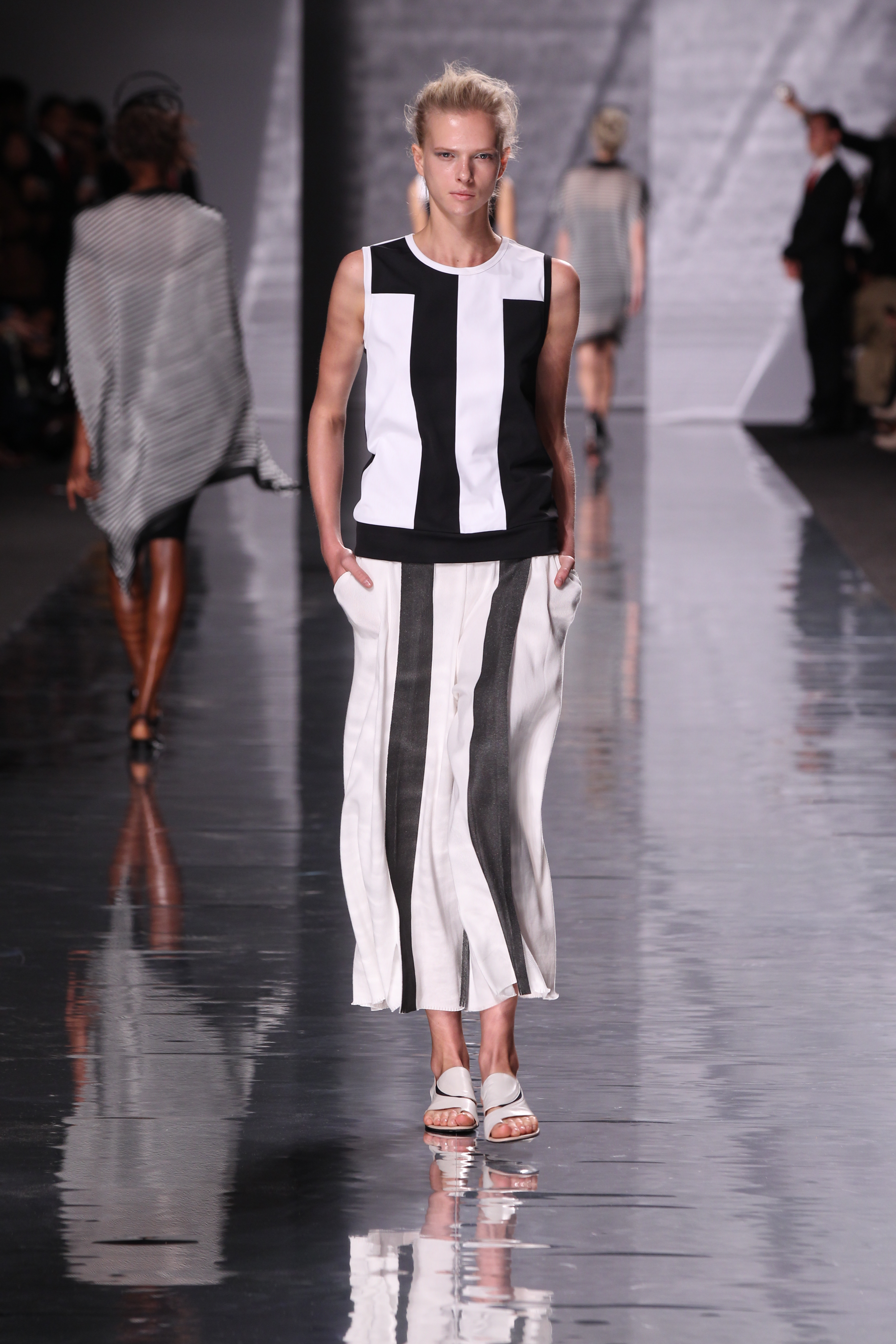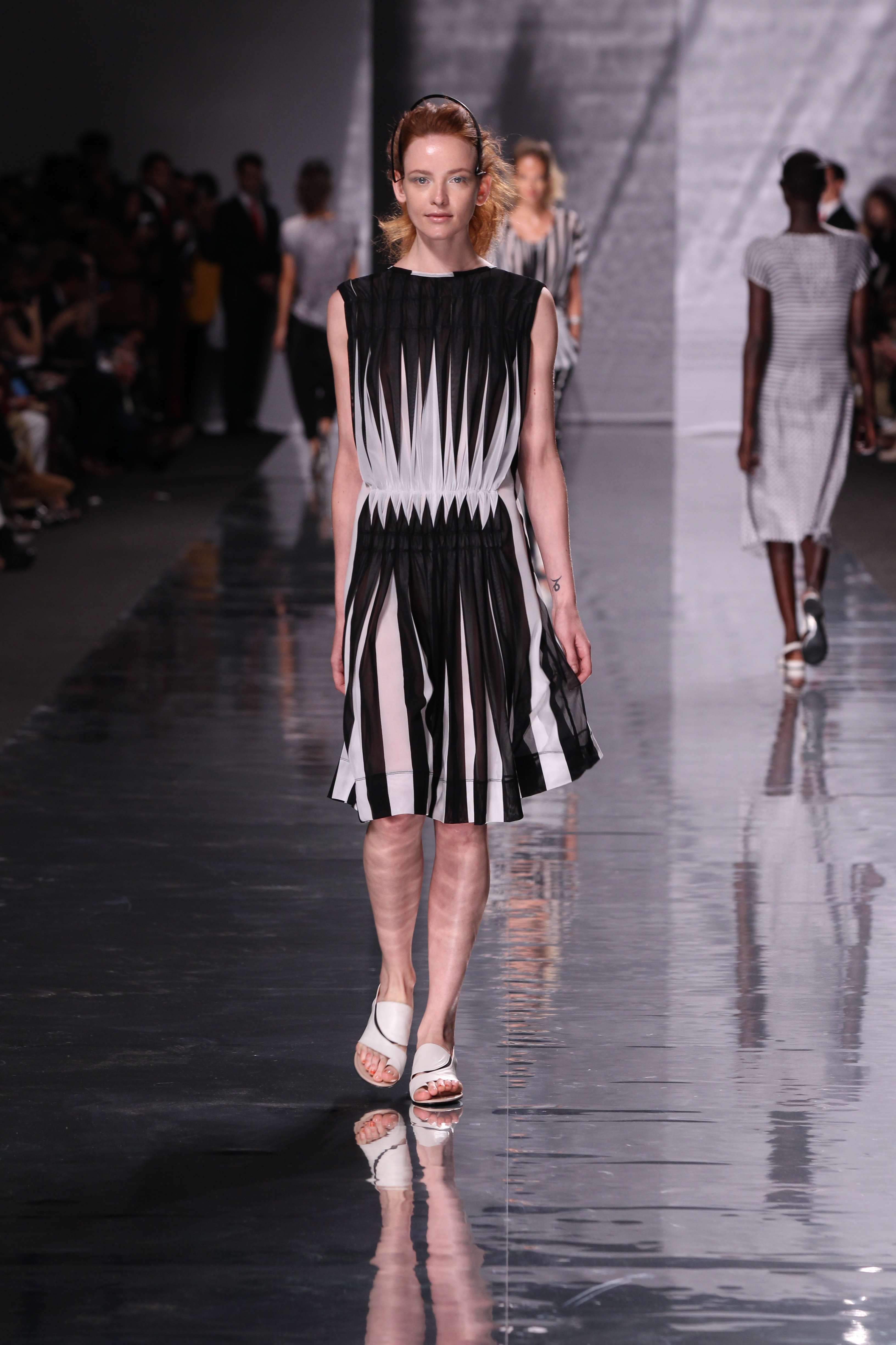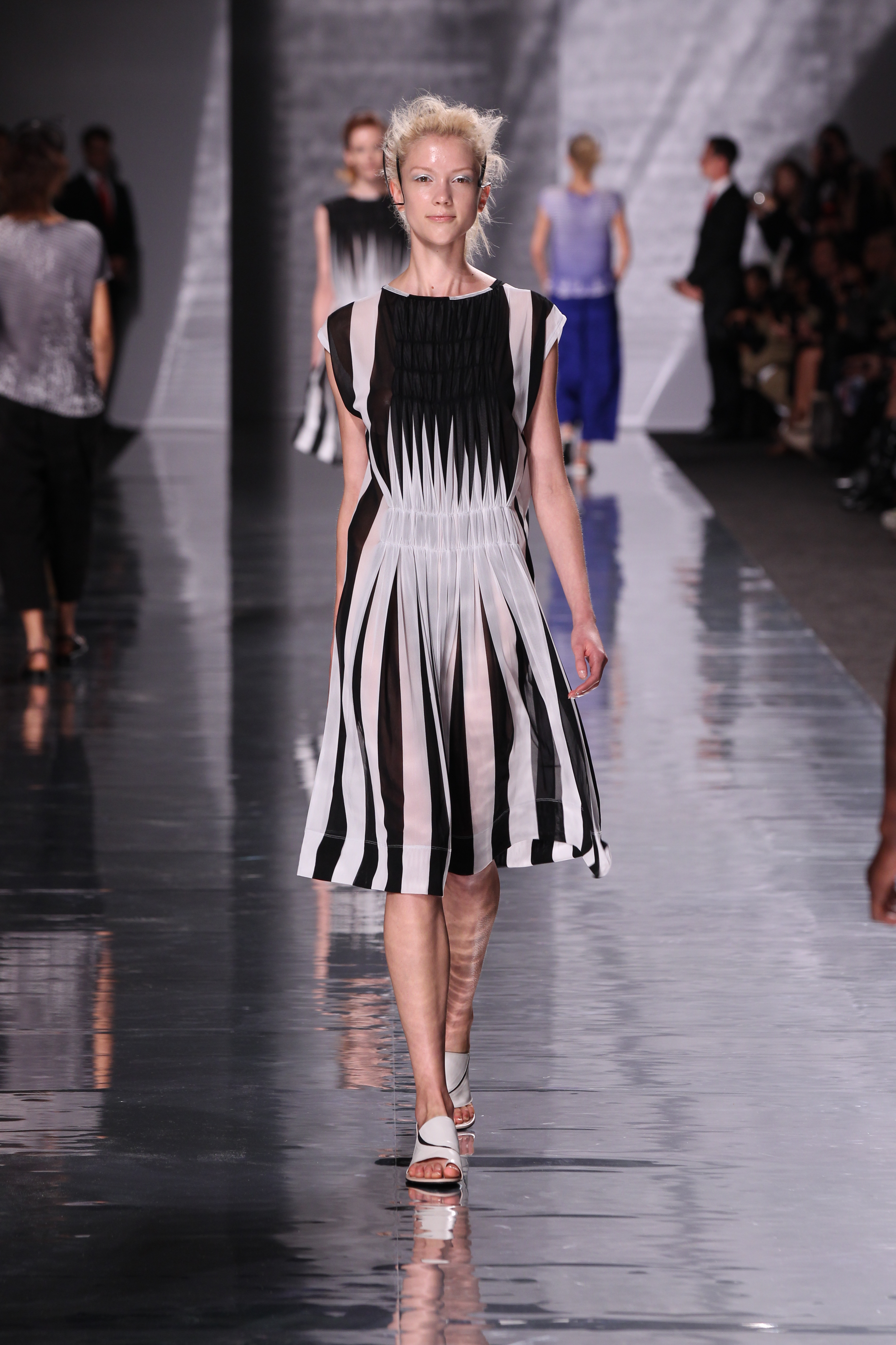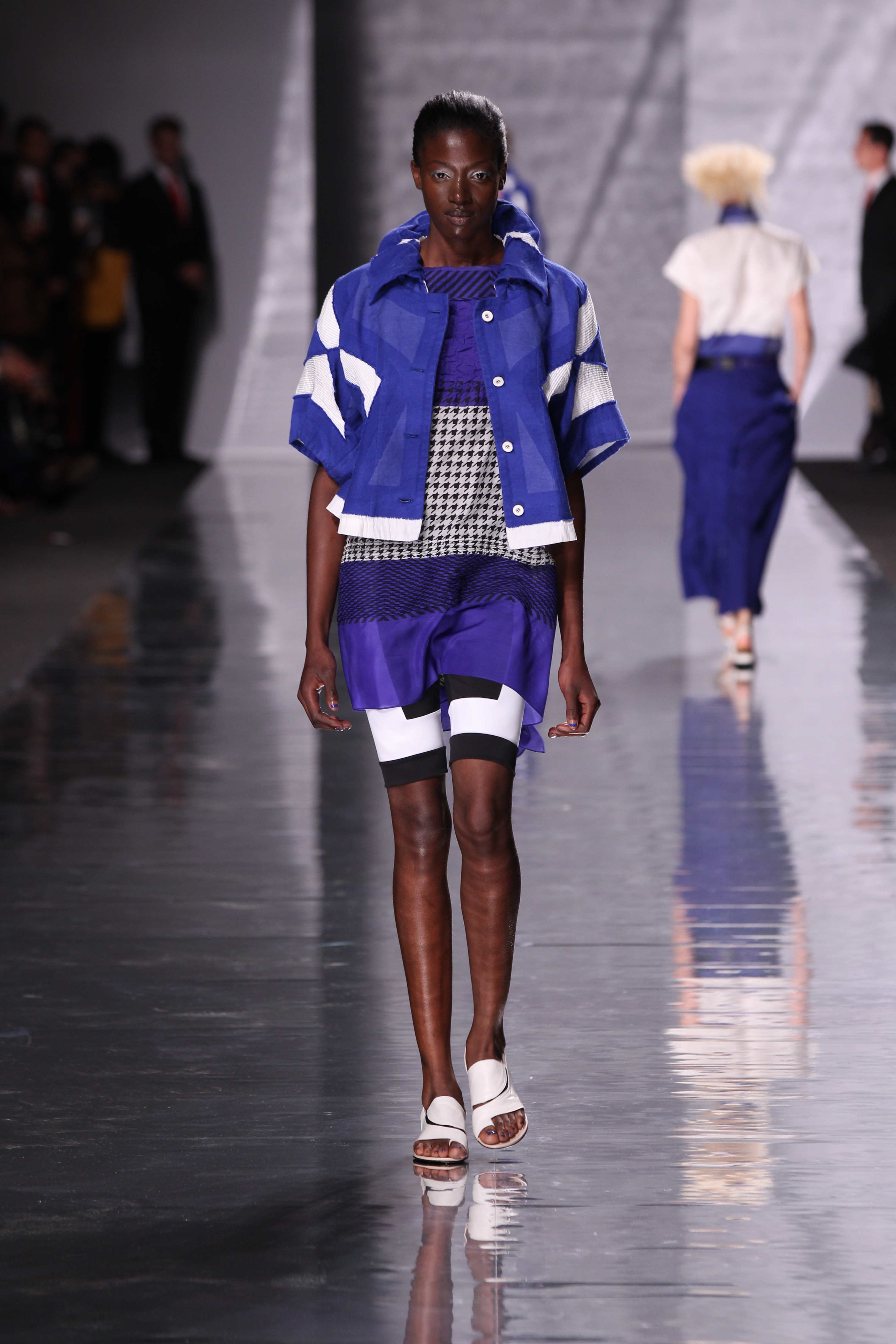 La structure est aussi cohérente avec l’ensemble, plissés, drapes et toutes sortes de longueurs et de superpositions ainsi que de volumes. Les imprimes sont présents à foison avec des rayures et une nouvelle interprétation du motif pied de poule pour le moins remarquable, a l’image de l’ensemble de cette collection « Éclats de couleurs »