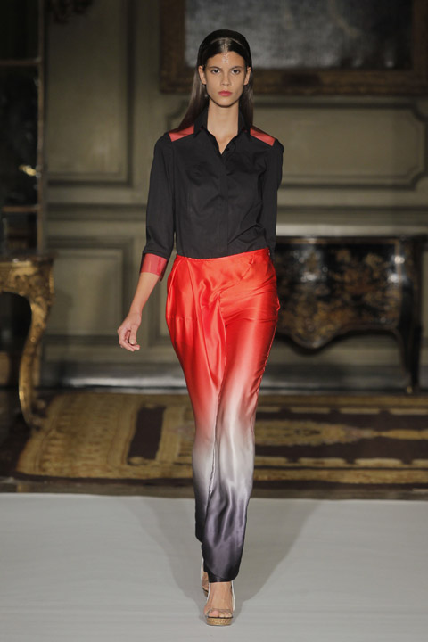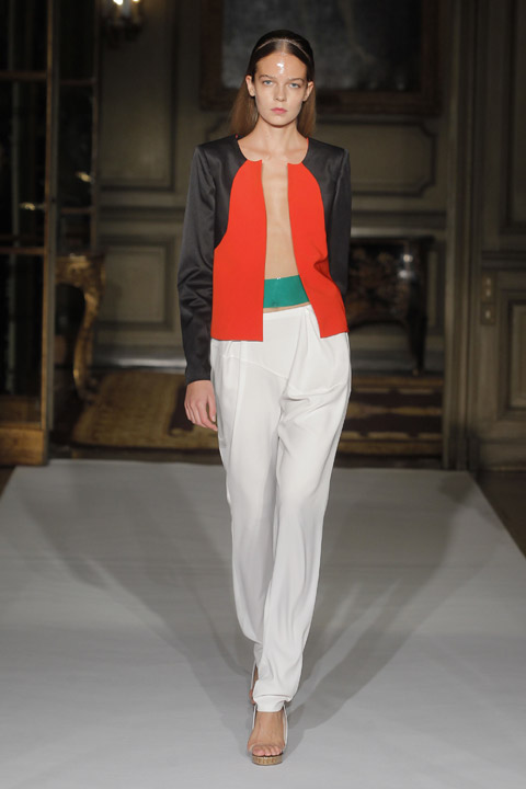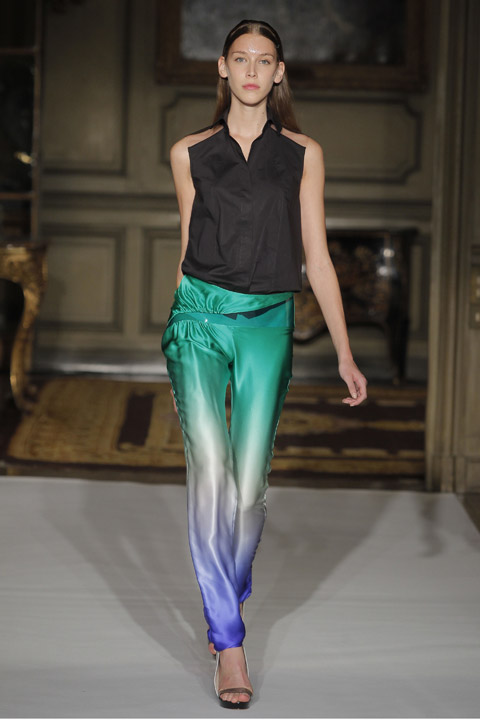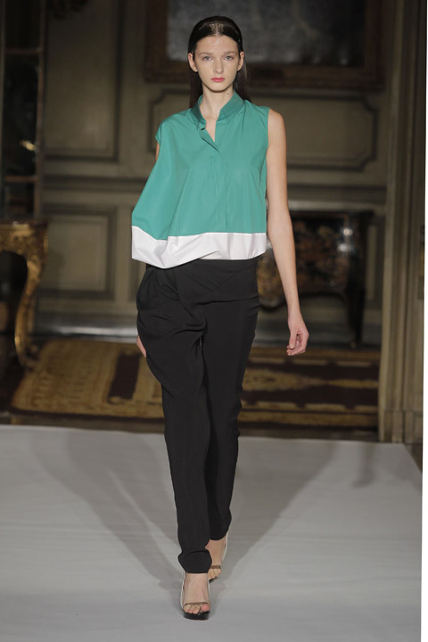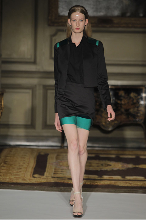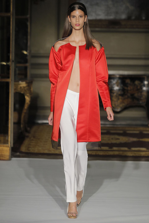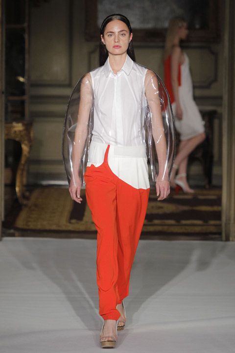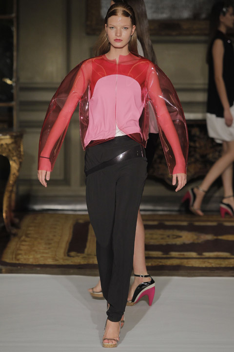 Défilés de couleurs basique mais néanmoins vives et affirmées telles que le vert, le rouge ou le bleu mêlées au blanc et au noir, couleurs phares de la saison. L’originalité se trouve au niveau du mélange de matière et de l’utilisation du plastique sur les cols voire même comme base du vêtement dans son intégralité. Les cheveux des modèles sont d’ailleurs coiffés et plaqués en arrière de manière à nous rappeler la texture de cette matière.