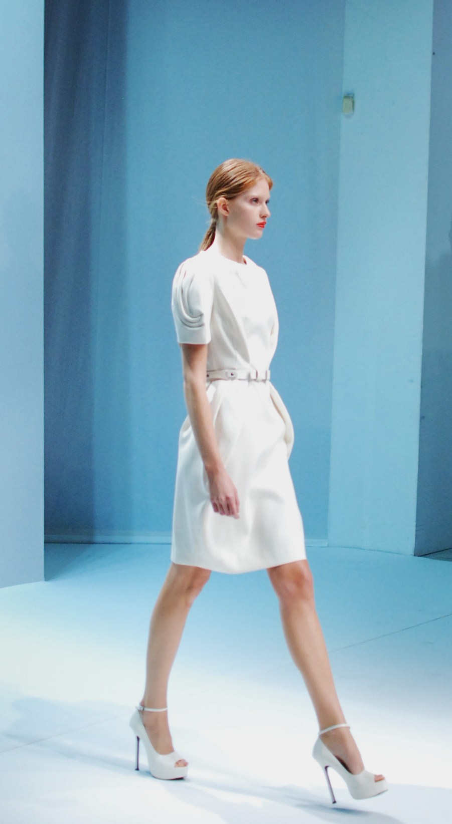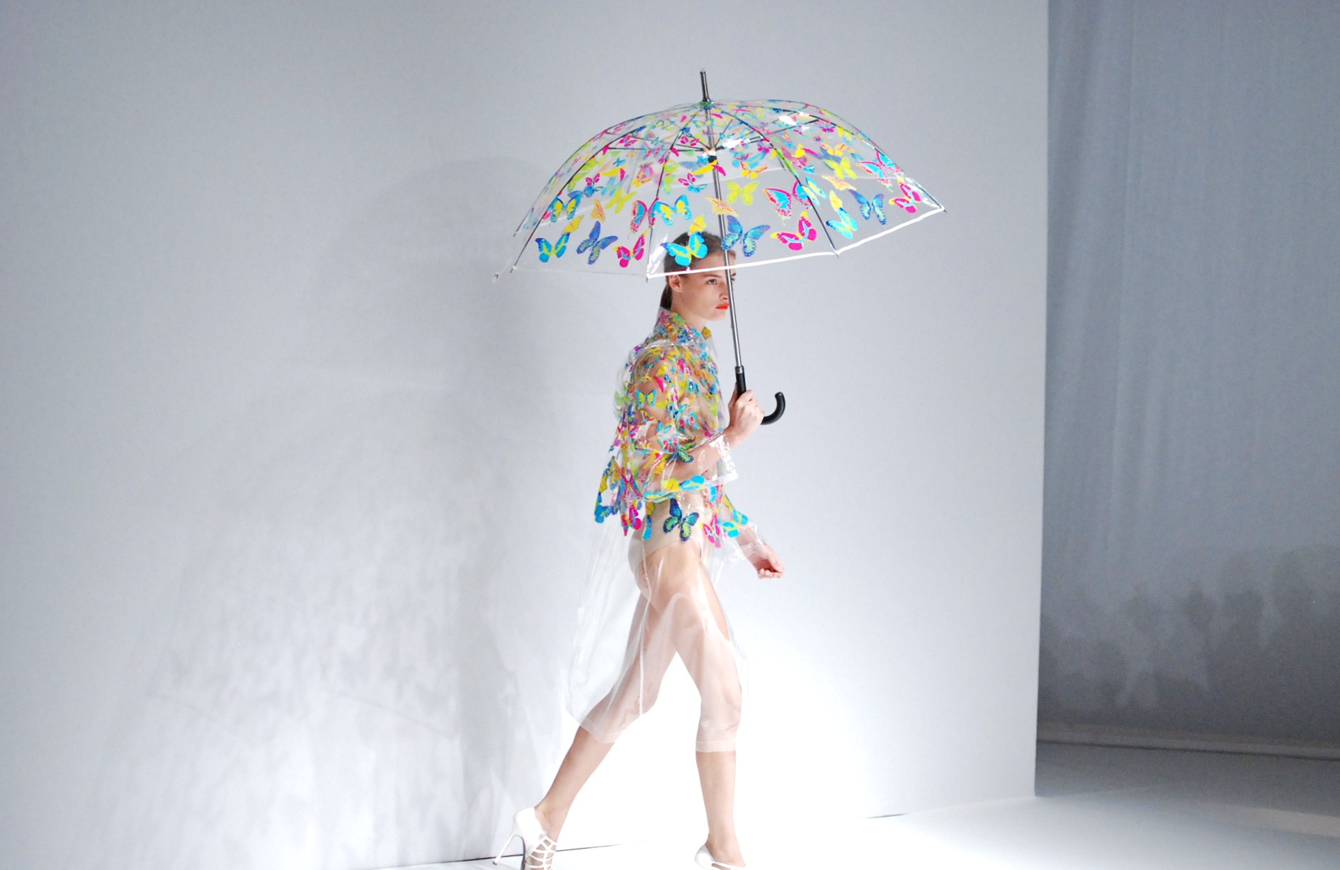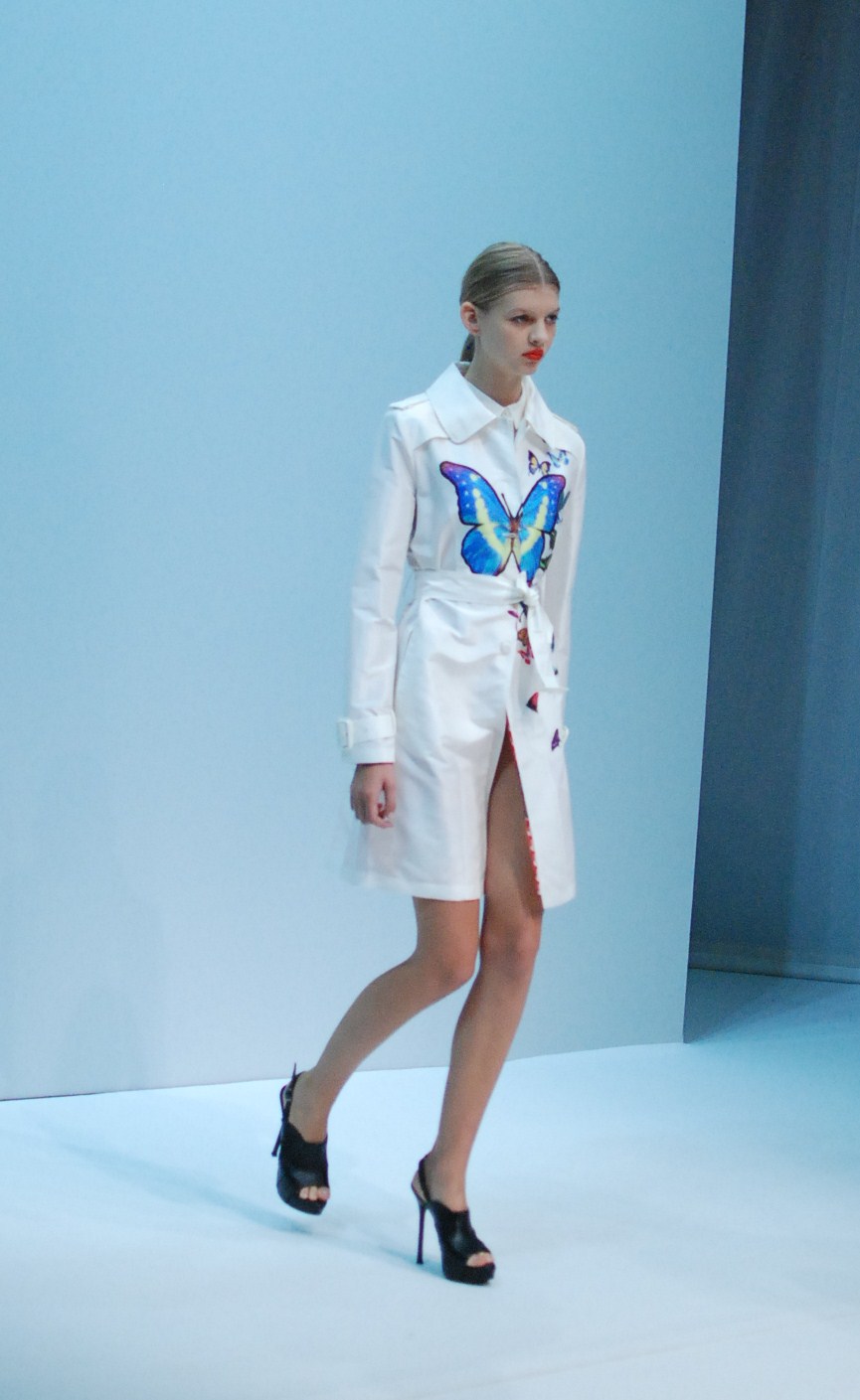 Et il nous le fait comprendre au travers de son final sublime ou le modèle qui ouvre la marche apparaît comme magique sous un parapluie de néon bleu au son de la pluie, suivie par le reste habillées de trenches transparents ornés de papillons. Et c’est effectivement avec beaucoup de nostalgie que nous applaudissons ce défilé qui clôture ainsi cette surprenante saison printemps été 2013. À janvier !