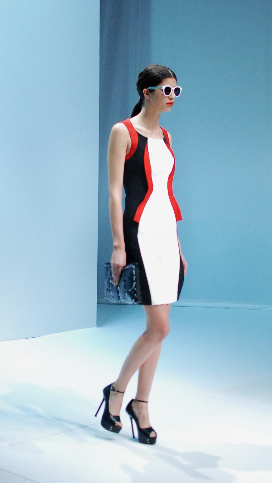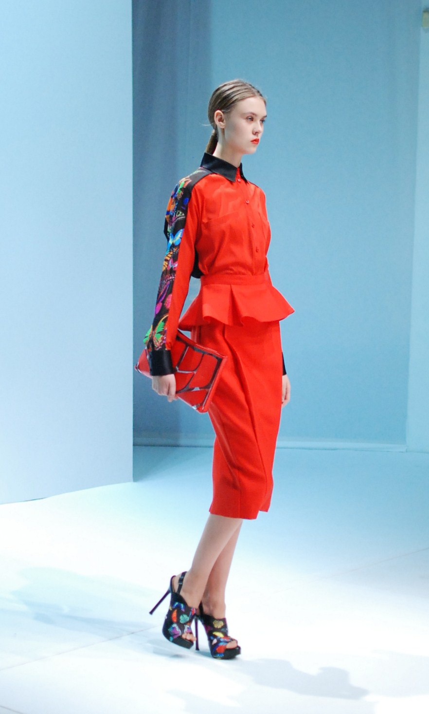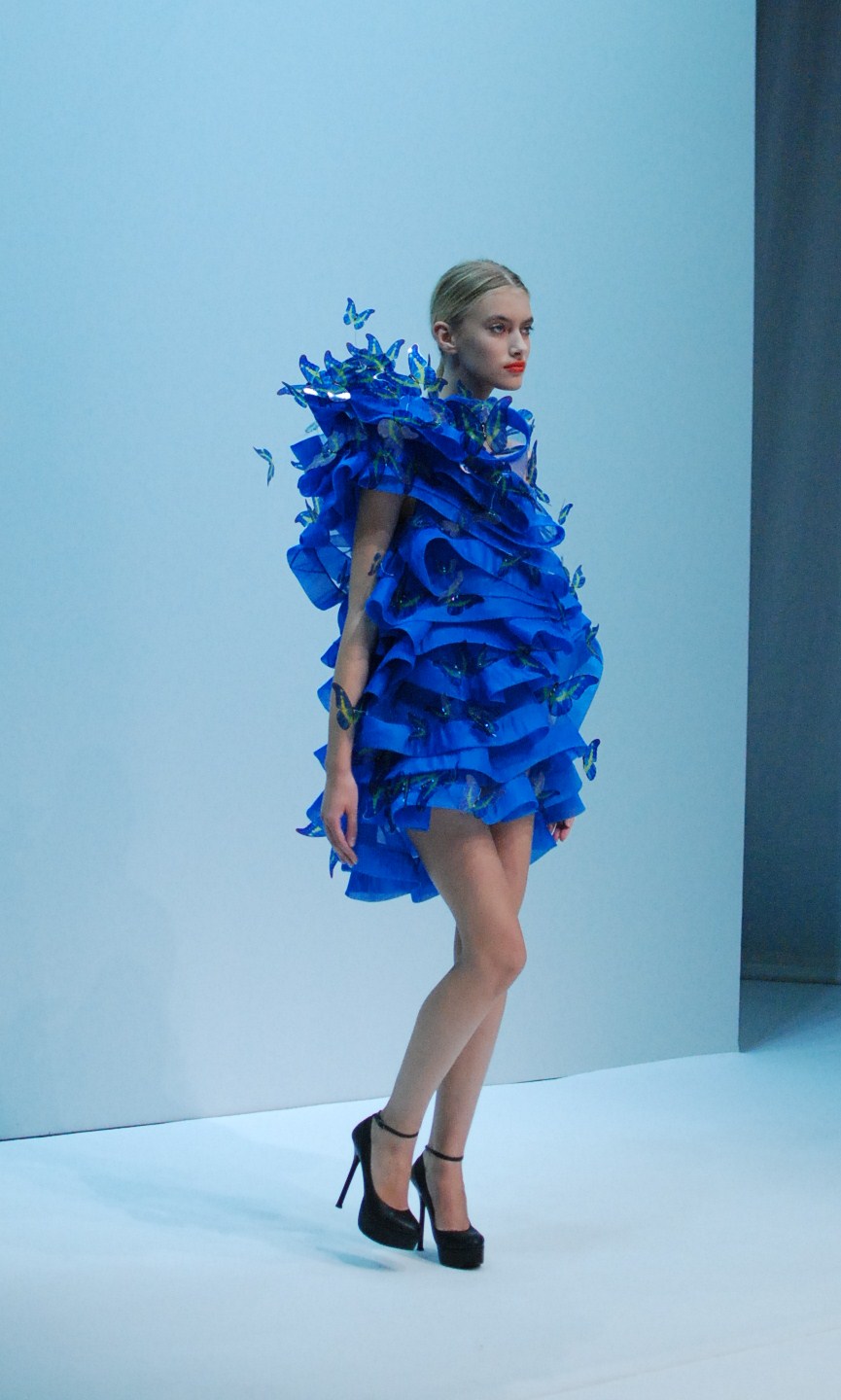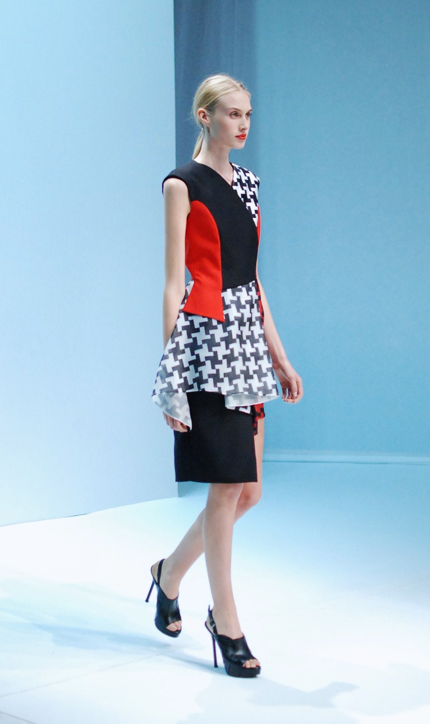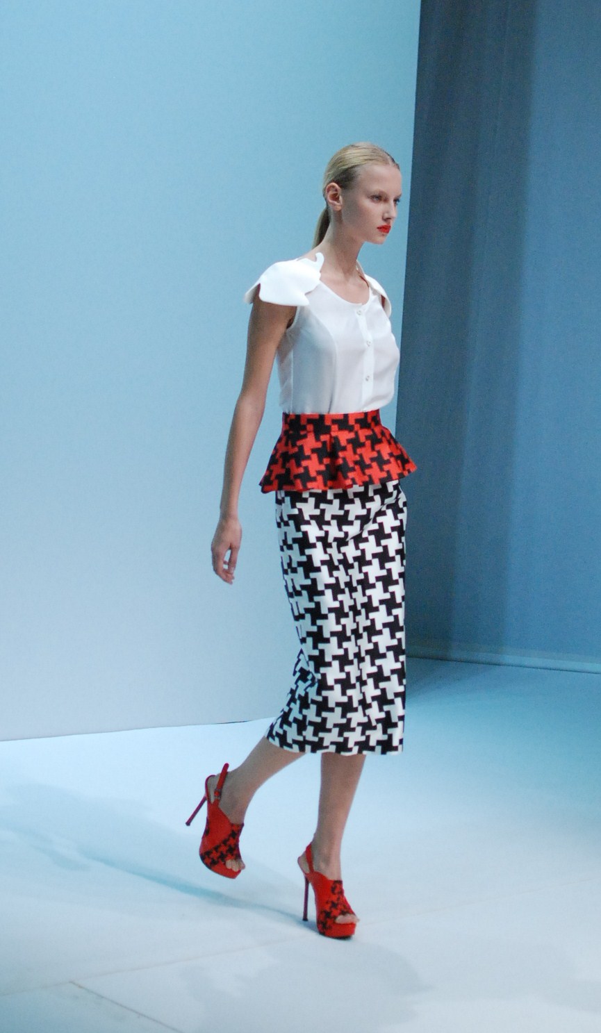 Beaucoup de couleurs donc chez Lie Sang Bong et le color-blocking est donc au rendez-vous. Rouges vifs, verts acidulés , bleu céruléen parfait, il n’y cependant pas que dans la palette que le coréen impressionne. Imprimes ? Le pied de poule est revisité, déstructuré et remis en forme dans des tenues d’une grande élégance (jupes à volant ou « jupes péplum » omniprésentes) un peu a la manière d’Issy Miyake. Volumes : ils sont partout, tantôt près du corps, tantôt fantaisistes et incroyables (voir les robes ornée de véritables papillons en 3D) on voit bien que le créateur s’amuse.