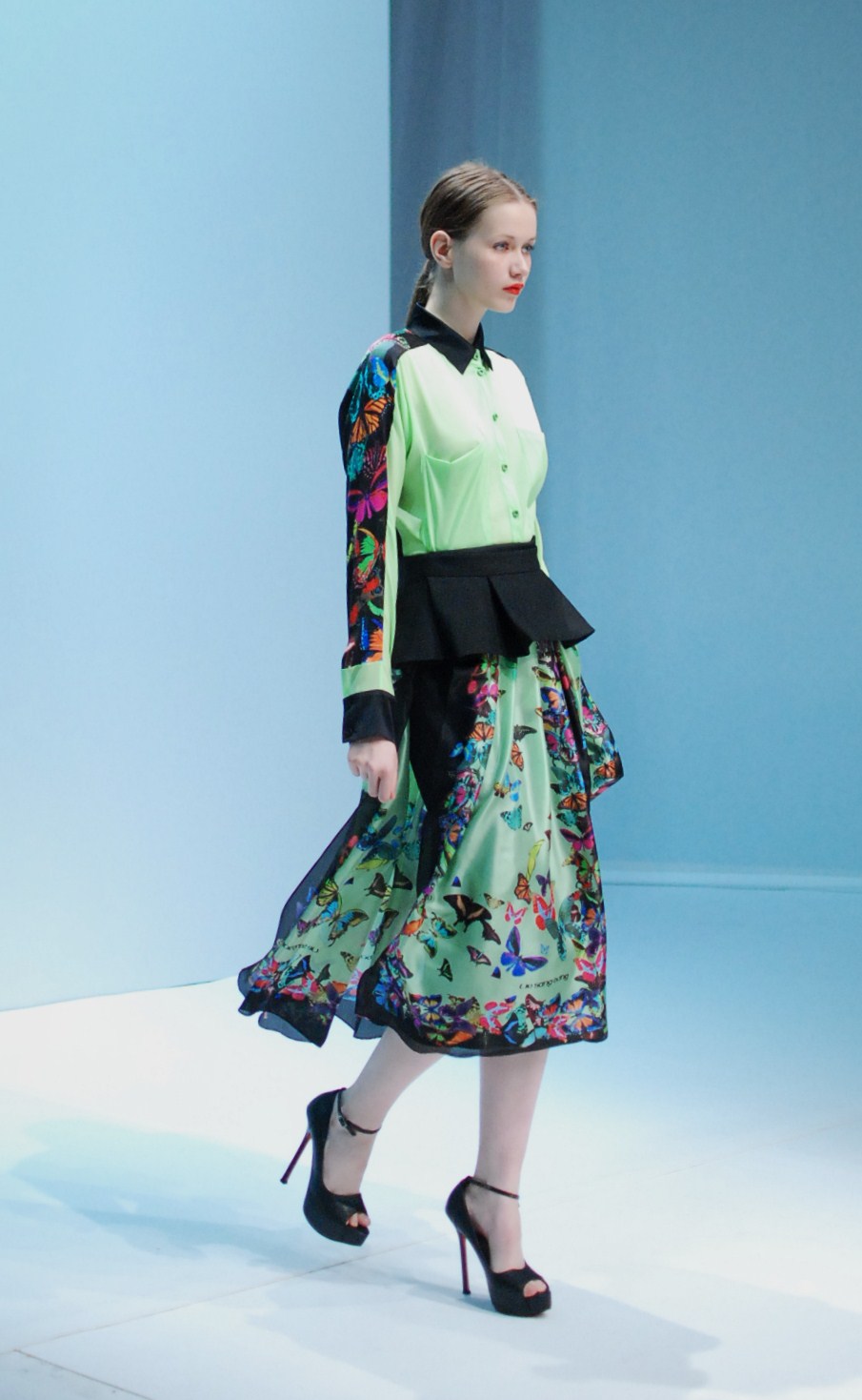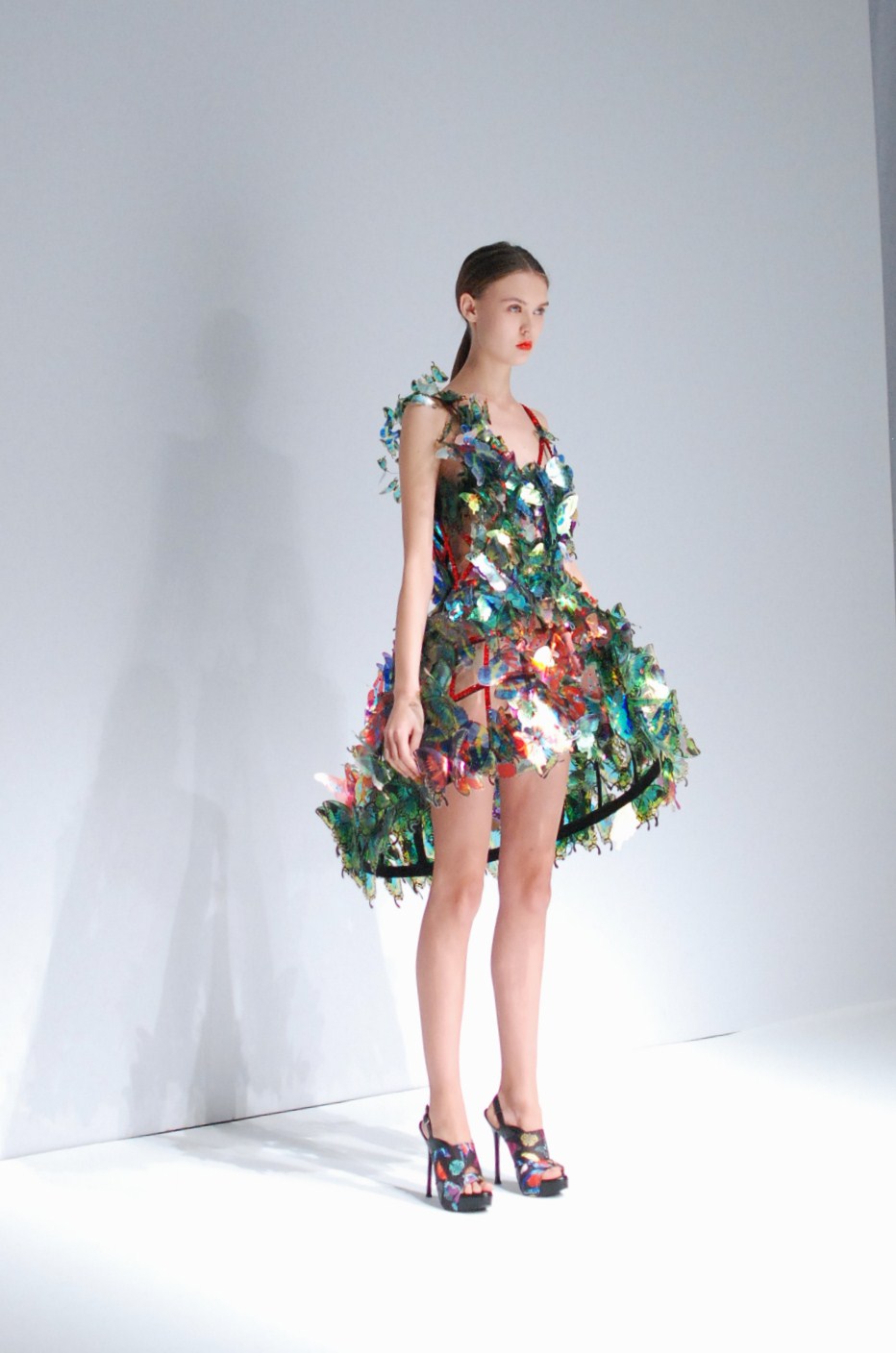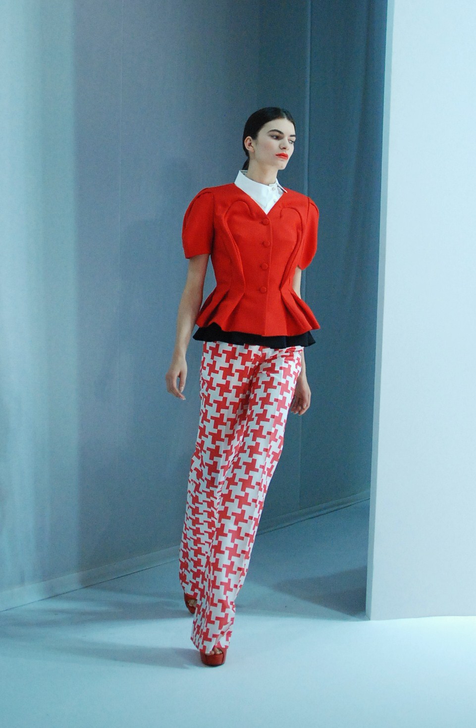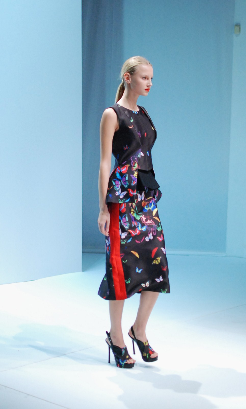 Beaucoup de couleurs donc chez Lie Sang Bong et le color-blocking est donc au rendez-vous. Rouges vifs, verts acidulés , bleu céruléen parfait, il n’y cependant pas que dans la palette que le coréen impressionne. Imprimes ? Le pied de poule est revisité, déstructuré et remis en forme dans des tenues d’une grande élégance (jupes à volant ou « jupes péplum » omniprésentes) un peu a la manière d’Issy Miyake. Volumes : ils sont partout, tantôt près du corps, tantôt fantaisistes et incroyables (voir les robes ornée de véritables papillons en 3D) on voit bien que le créateur s’amuse.