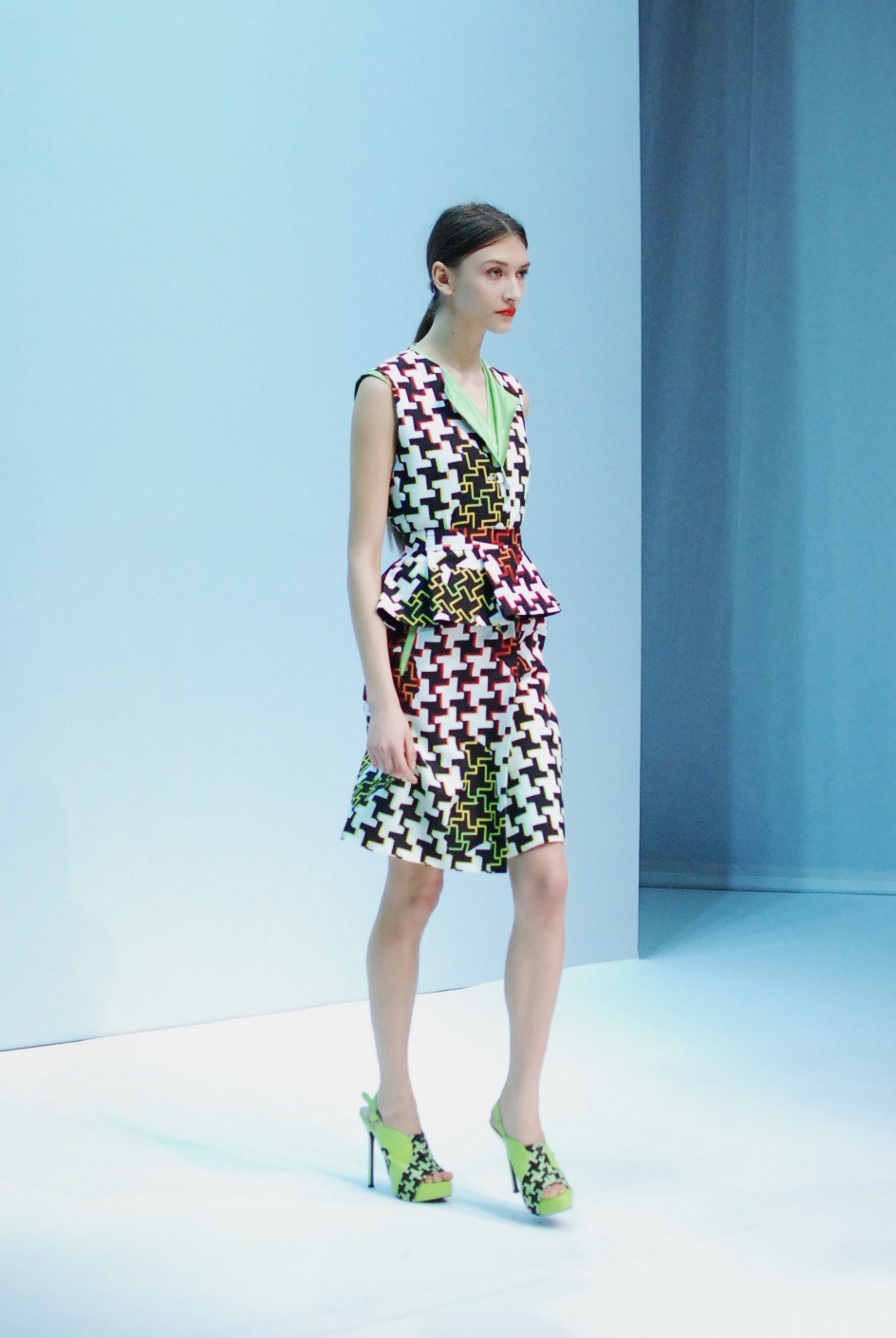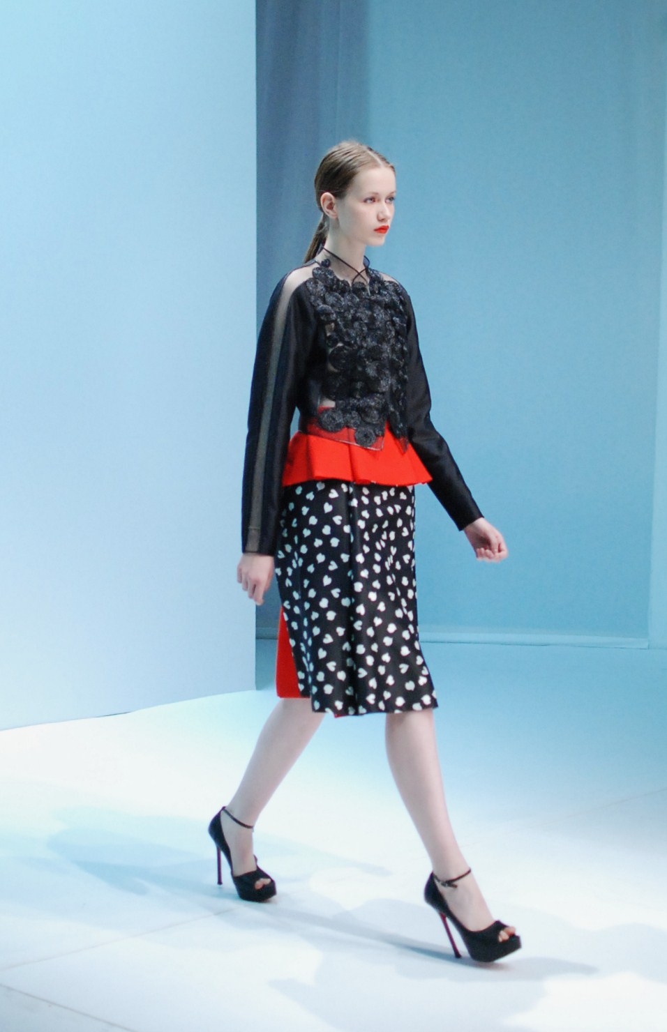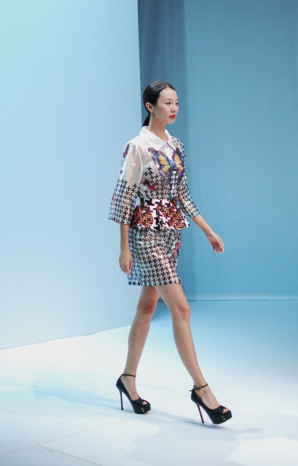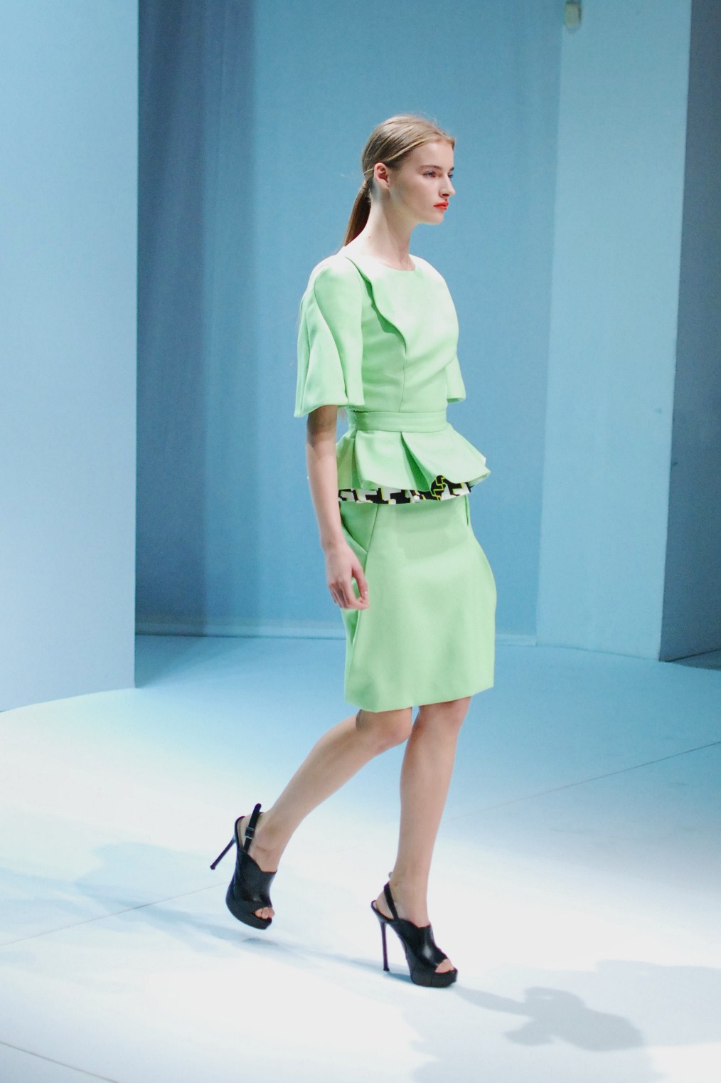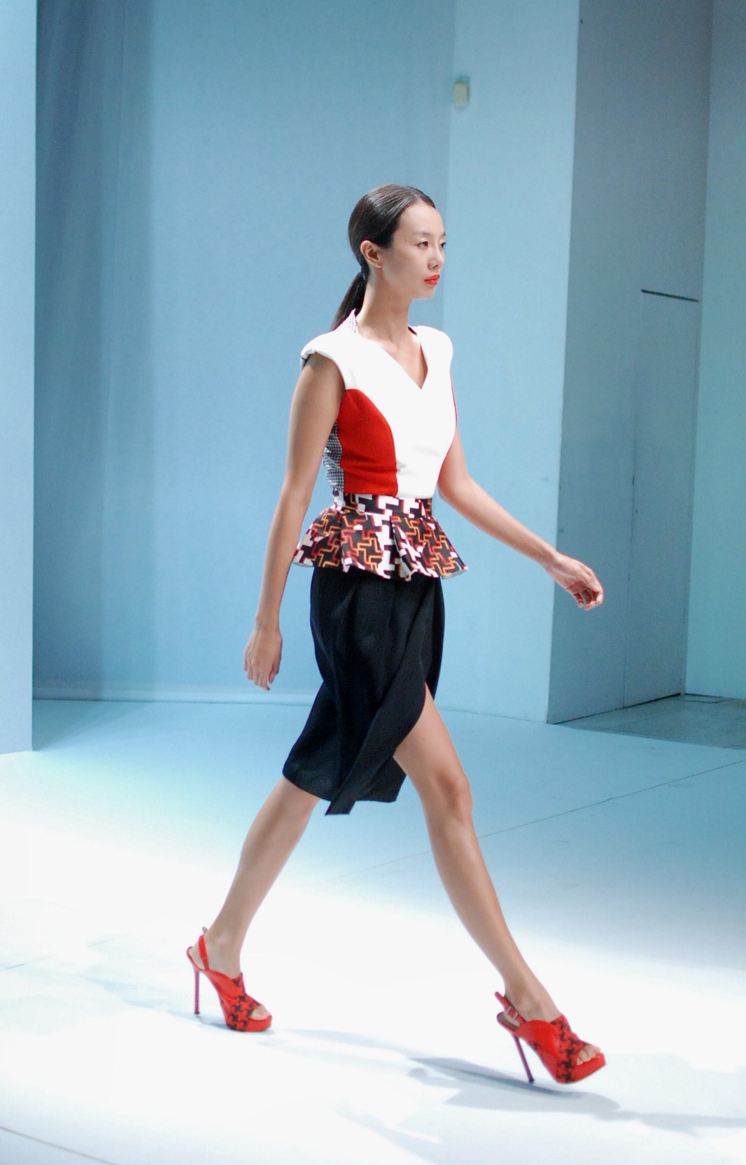 Beaucoup de couleurs donc chez Lie Sang Bong et le color-blocking est donc au rendez-vous. Rouges vifs, verts acidulés , bleu céruléen parfait, il n’y cependant pas que dans la palette que le coréen impressionne. Imprimes ? Le pied de poule est revisité, déstructuré et remis en forme dans des tenues d’une grande élégance (jupes à volant ou « jupes péplum » omniprésentes) un peu a la manière d’Issy Miyake. Volumes : ils sont partout, tantôt près du corps, tantôt fantaisistes et incroyables (voir les robes ornée de véritables papillons en 3D) on voit bien que le créateur s’amuse.