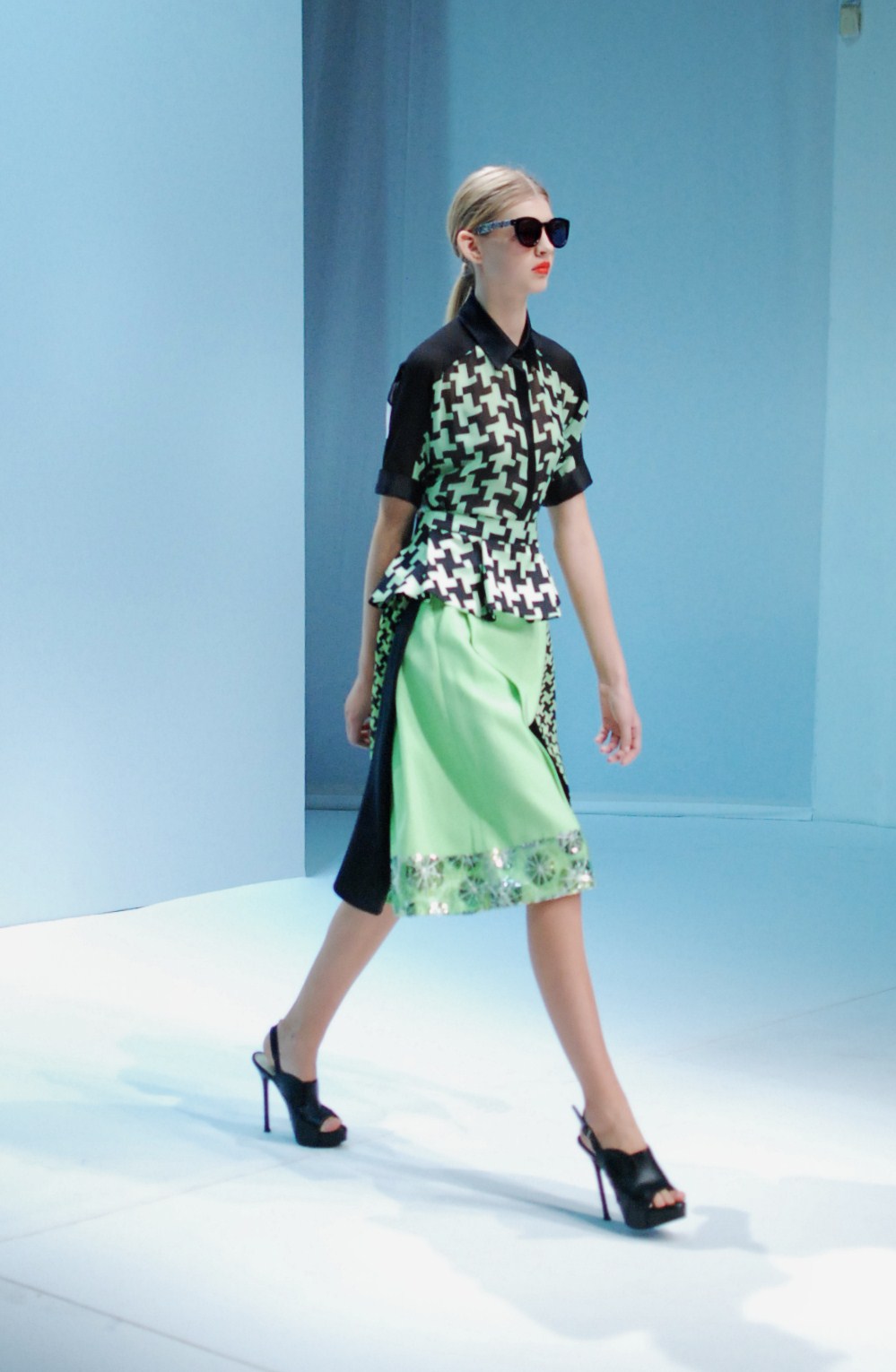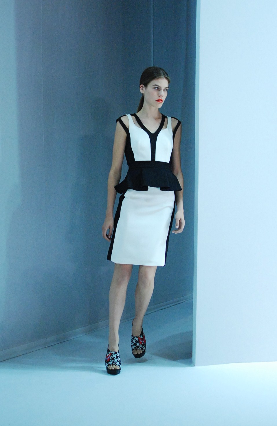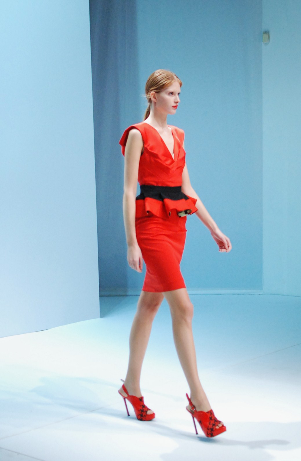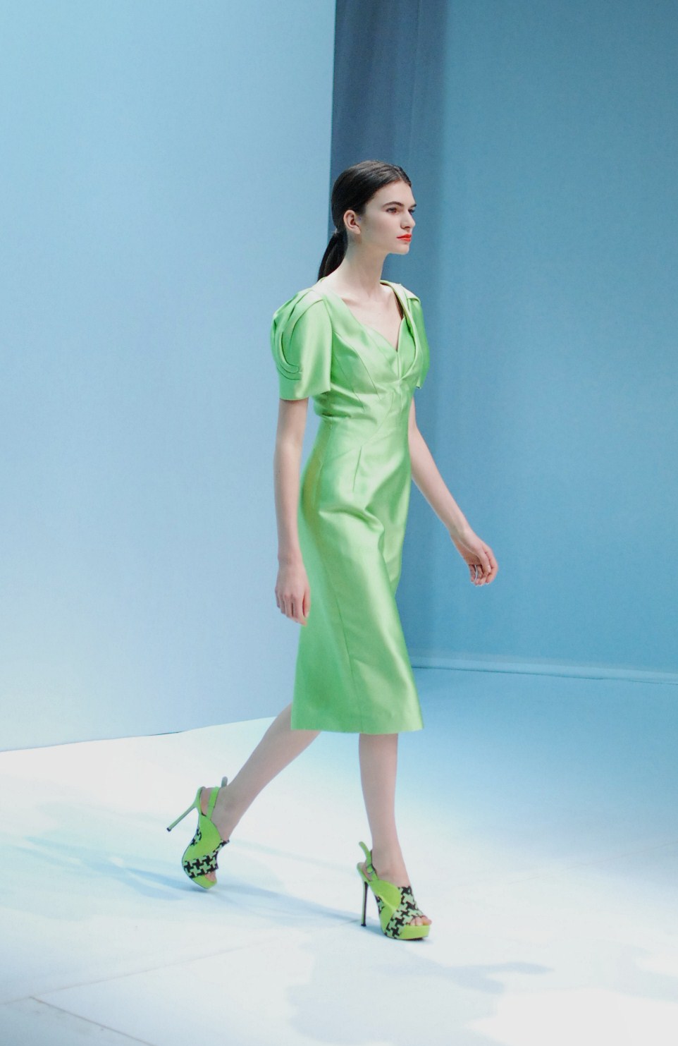 Beaucoup de couleurs donc chez Lie Sang Bong et le color-blocking est donc au rendez-vous. Rouges vifs, verts acidulés , bleu céruléen parfait, il n’y cependant pas que dans la palette que le coréen impressionne. Imprimes ? Le pied de poule est revisité, déstructuré et remis en forme dans des tenues d’une grande élégance (jupes à volant ou « jupes péplum » omniprésentes) un peu a la manière d’Issy Miyake. Volumes : ils sont partout, tantôt près du corps, tantôt fantaisistes et incroyables (voir les robes ornée de véritables papillons en 3D) on voit bien que le créateur s’amuse.