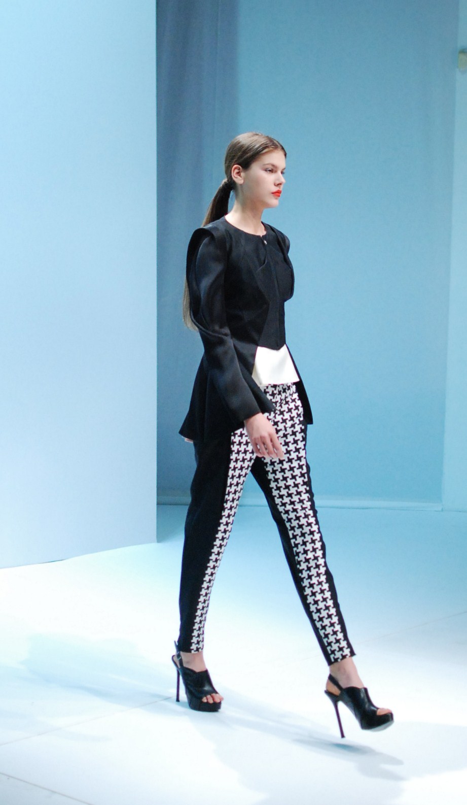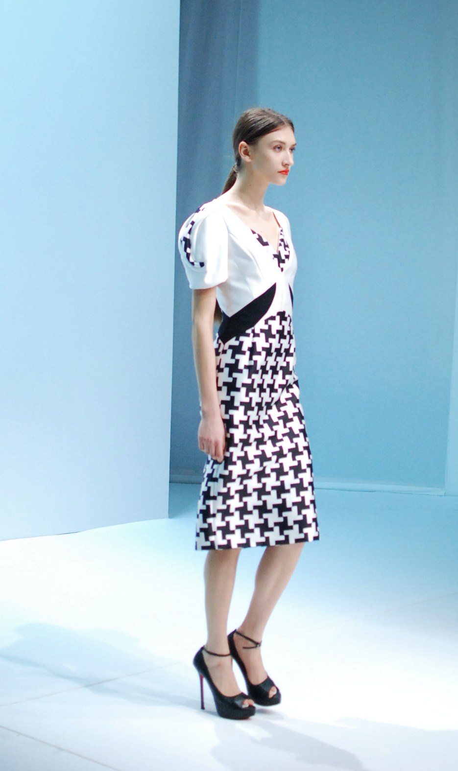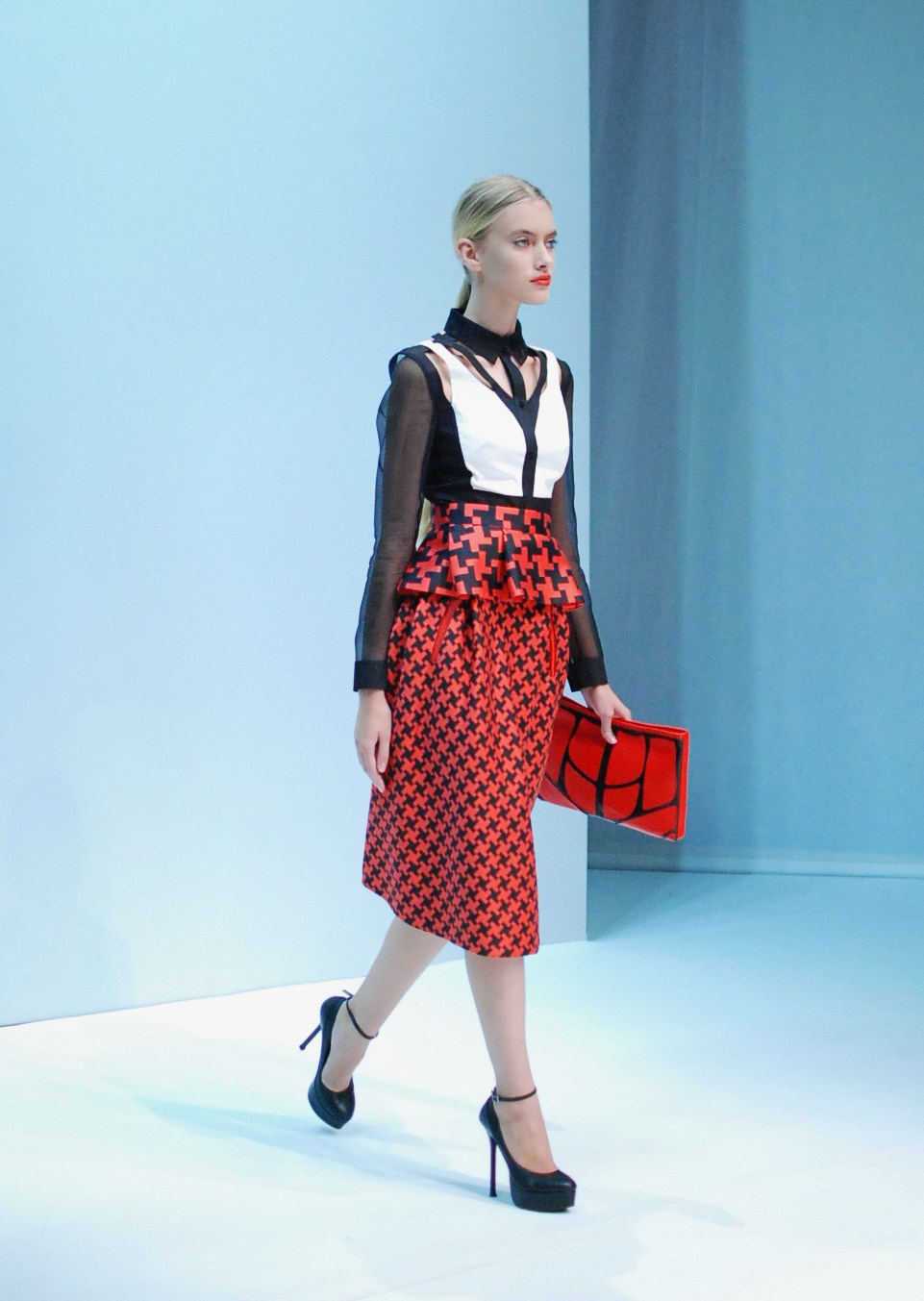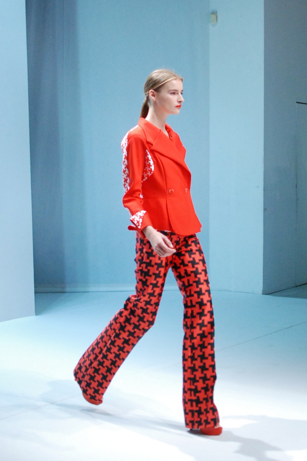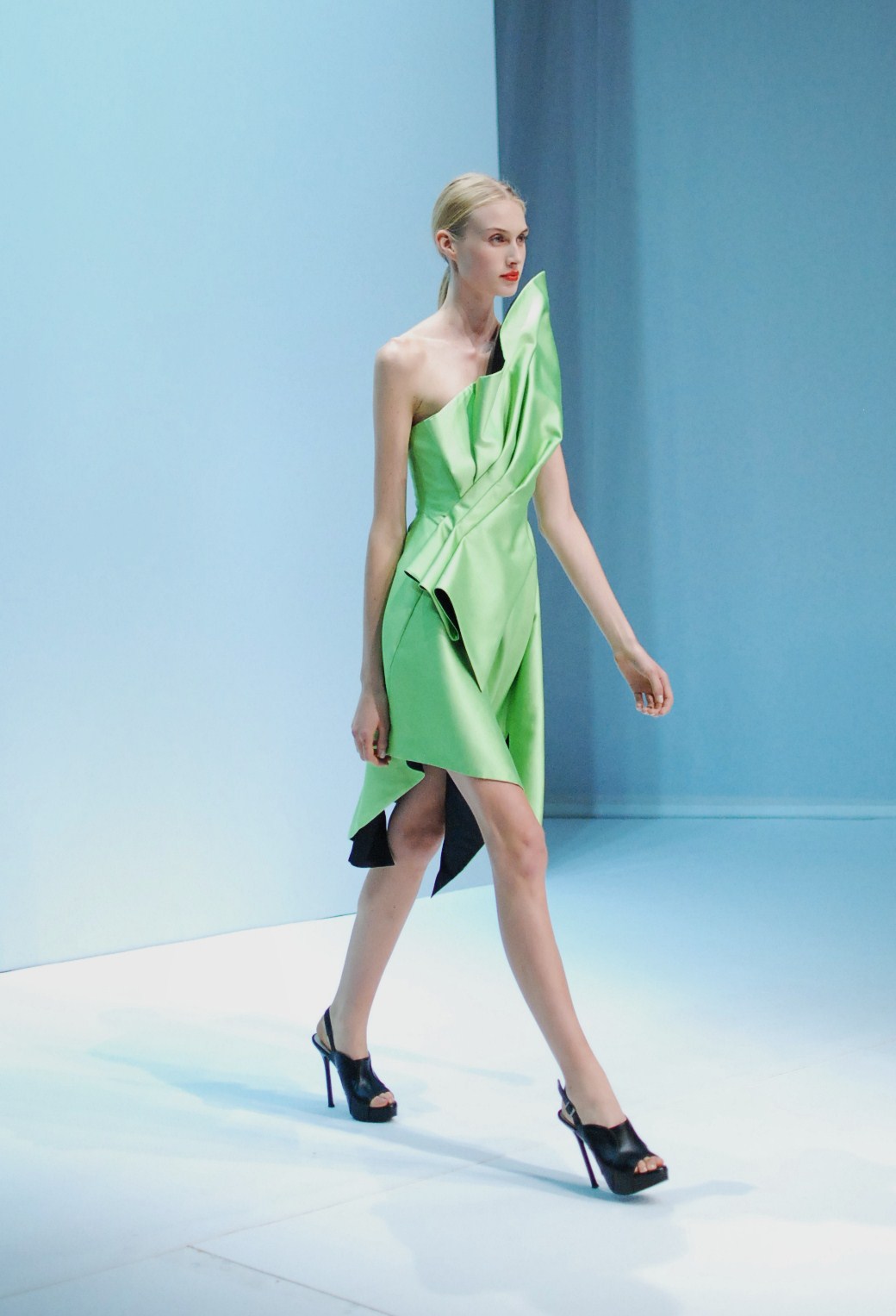 Beaucoup de couleurs donc chez Lie Sang Bong et le color-blocking est donc au rendez-vous. Rouges vifs, verts acidulés , bleu céruléen parfait, il n’y cependant pas que dans la palette que le coréen impressionne. Imprimes ? Le pied de poule est revisité, déstructuré et remis en forme dans des tenues d’une grande élégance (jupes à volant ou « jupes péplum » omniprésentes) un peu a la manière d’Issy Miyake. Volumes : ils sont partout, tantôt près du corps, tantôt fantaisistes et incroyables (voir les robes ornée de véritables papillons en 3D) on voit bien que le créateur s’amuse.