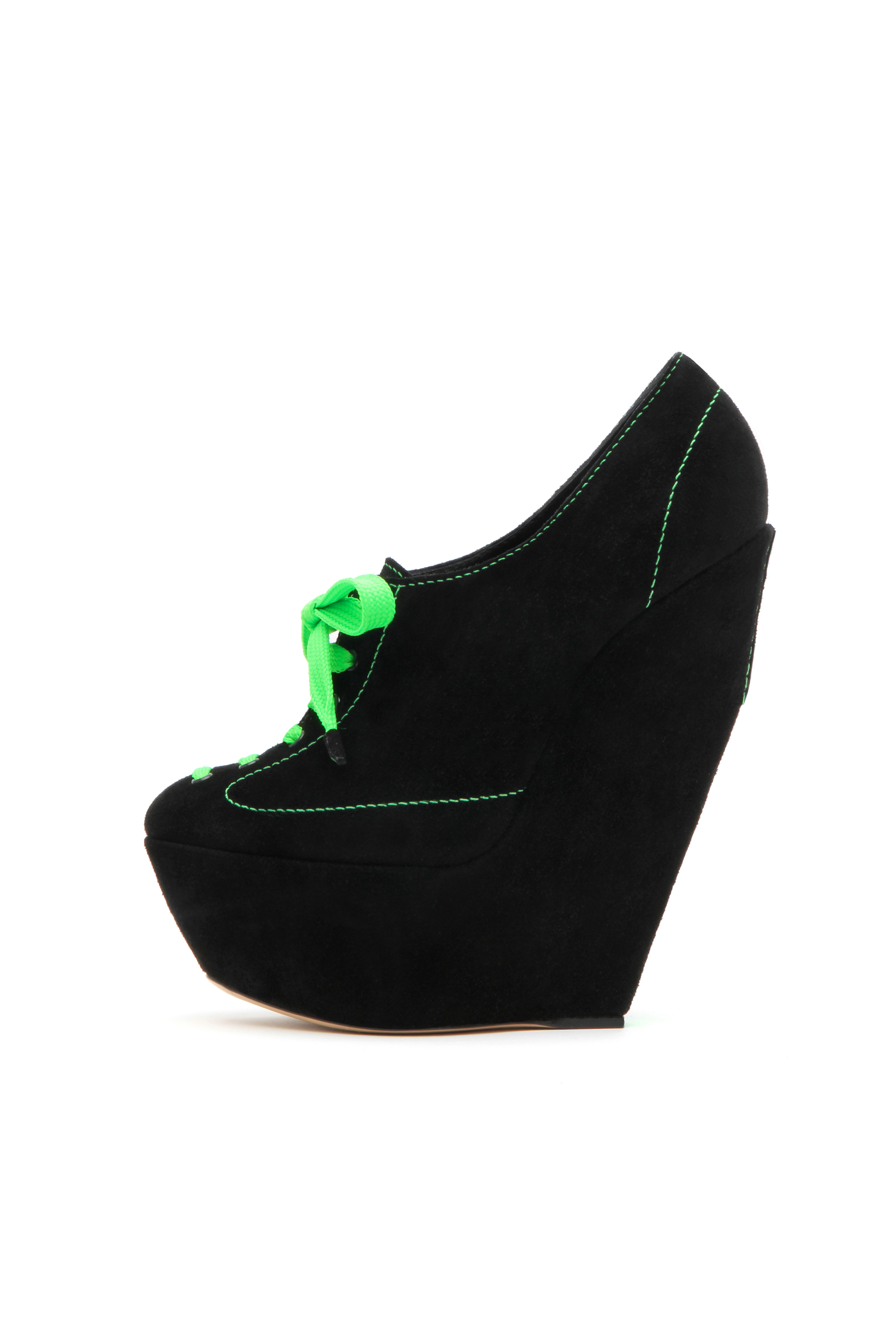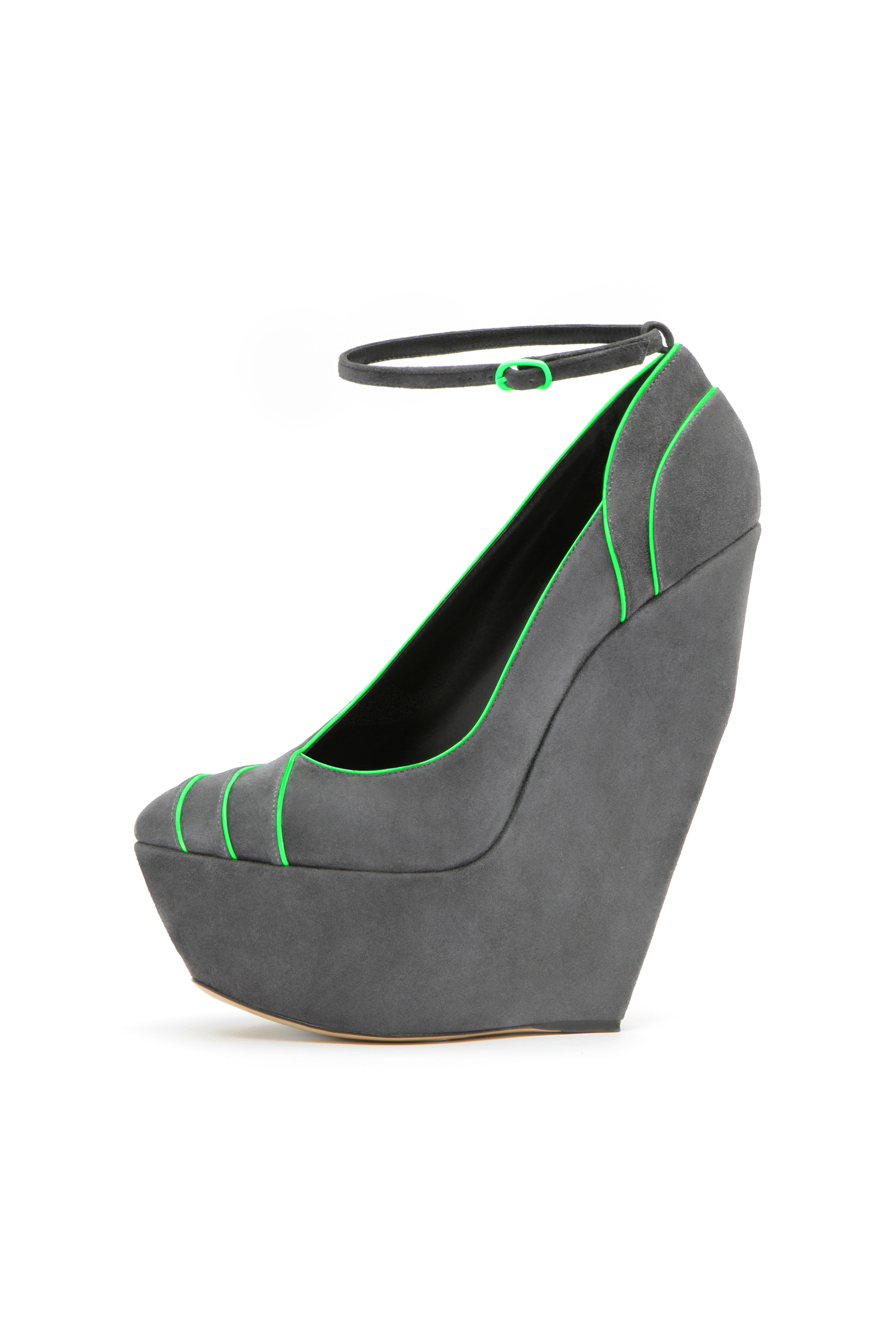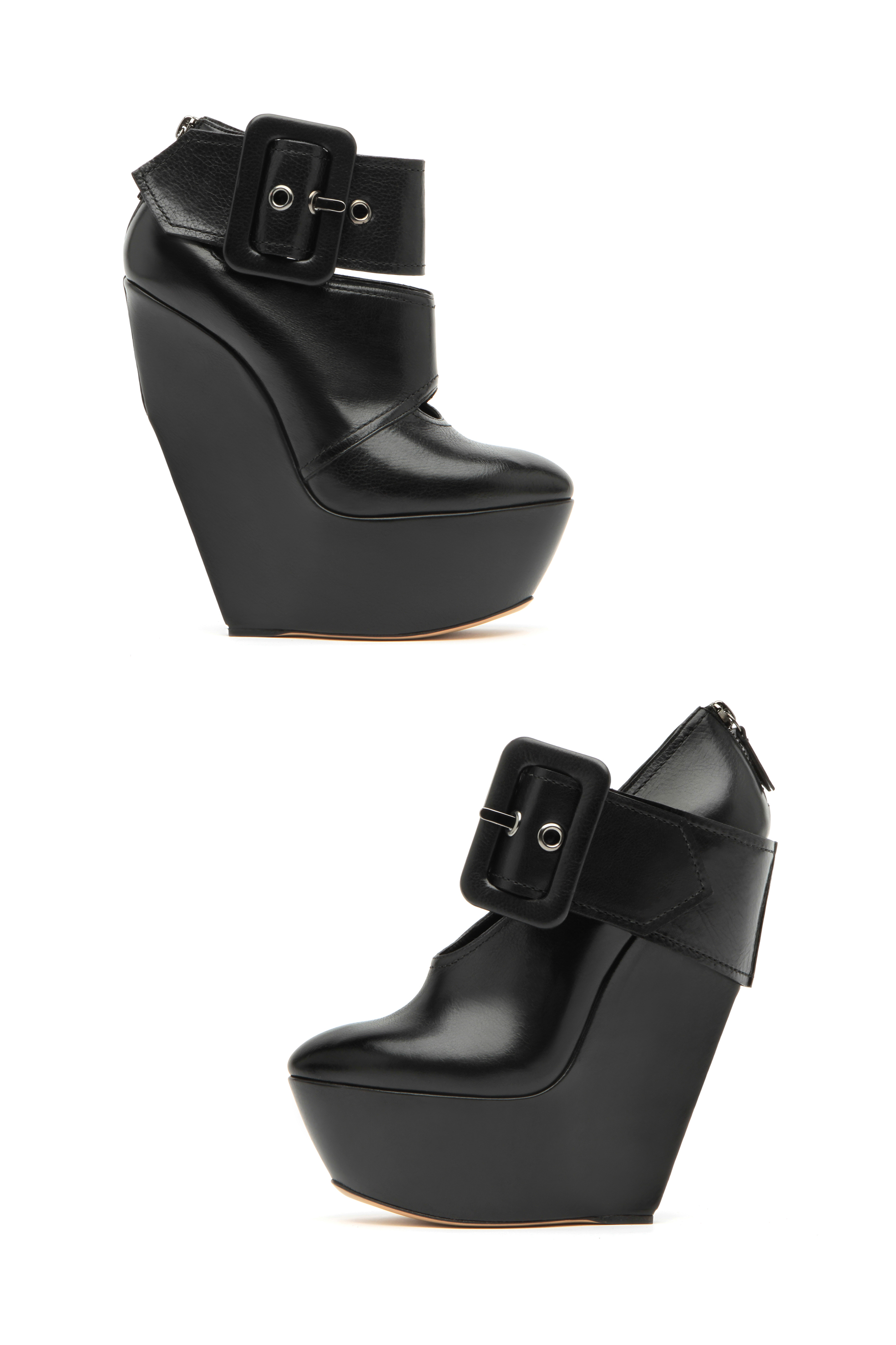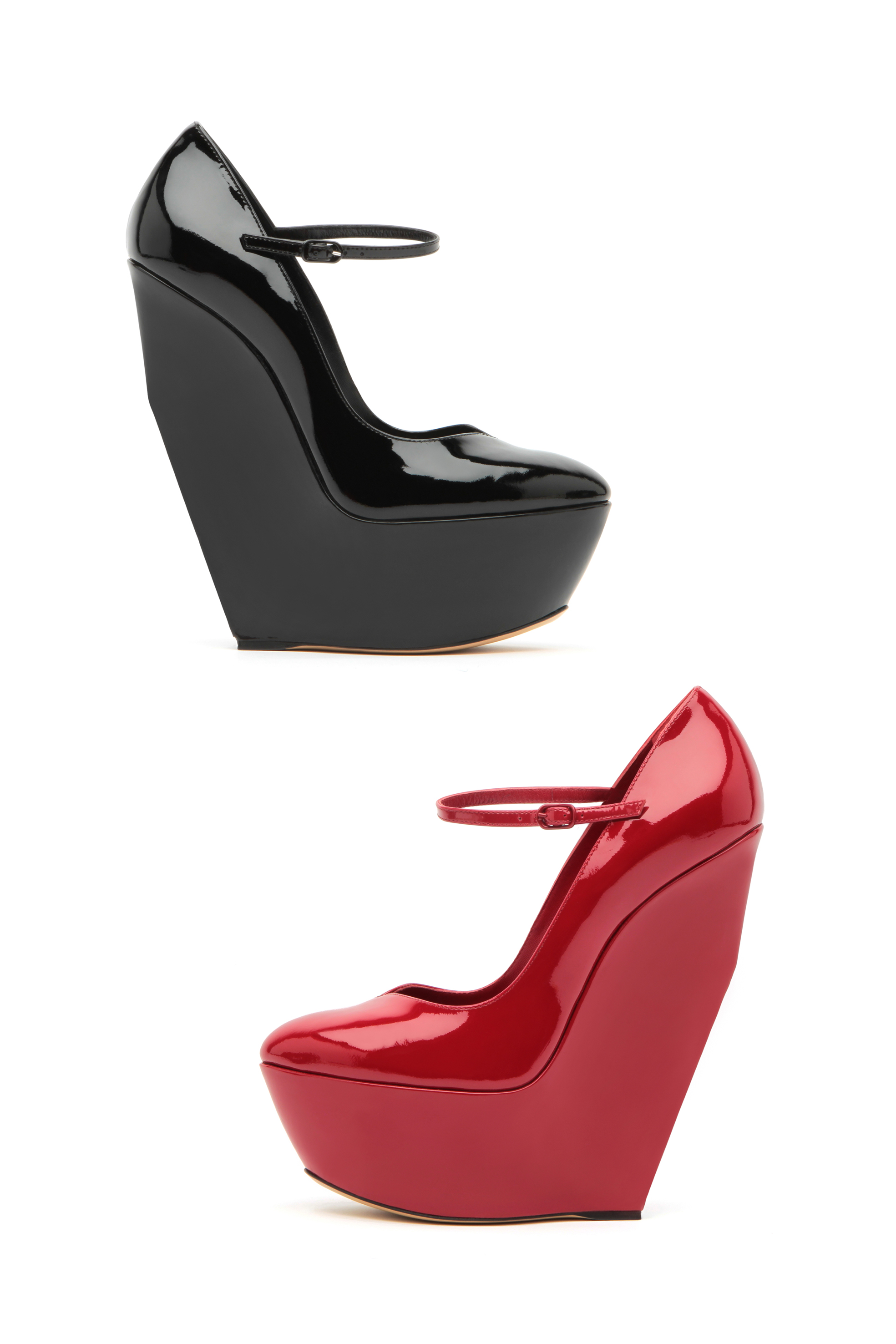 The ‘Gaga’ wedge is presented in a multitude of versions: mary janes in patent leather or in suede with contrasting piping, ankle boots with laces or oversize buckles and stretch nappa thigh-high boots. The Casadei “Gaga” is a true statement shoe.