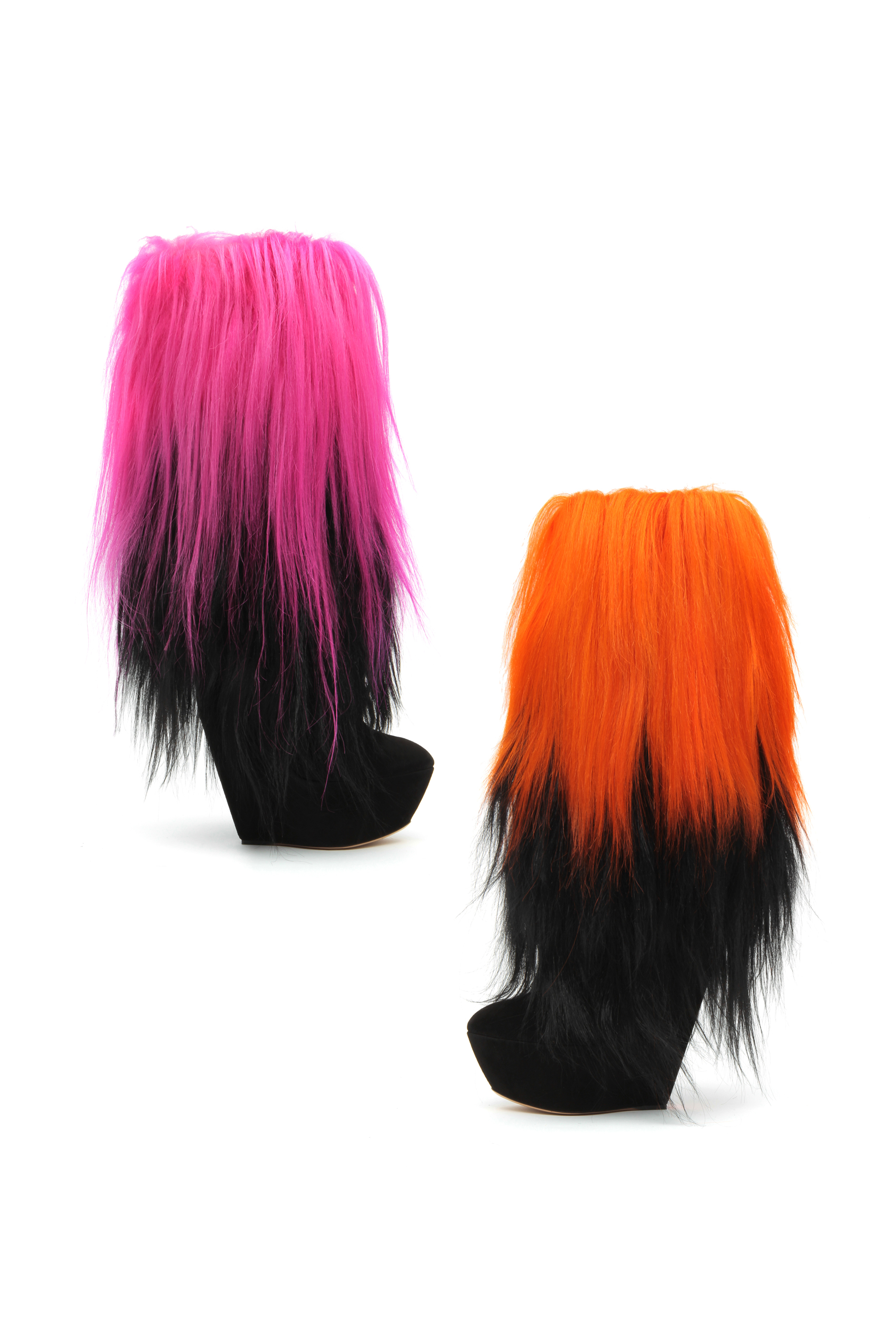 For the Fall/Winter 2012-13 collection Cesare Casadei envisages a new era of Pin-ups. The “Gaga” shoe is the result of this inspiration, where the aesthetic and structure of the wedge heel is completely remodeled and designed to bring out the diva in every woman. The Kidassia fur boots presented in white, shocking pink or fluorescent orange with black create a bold and modern combination. These boots reflect strong personality and experimentation, beauty and wild passion; distinctive elements in Cesare Casadei’s designs.