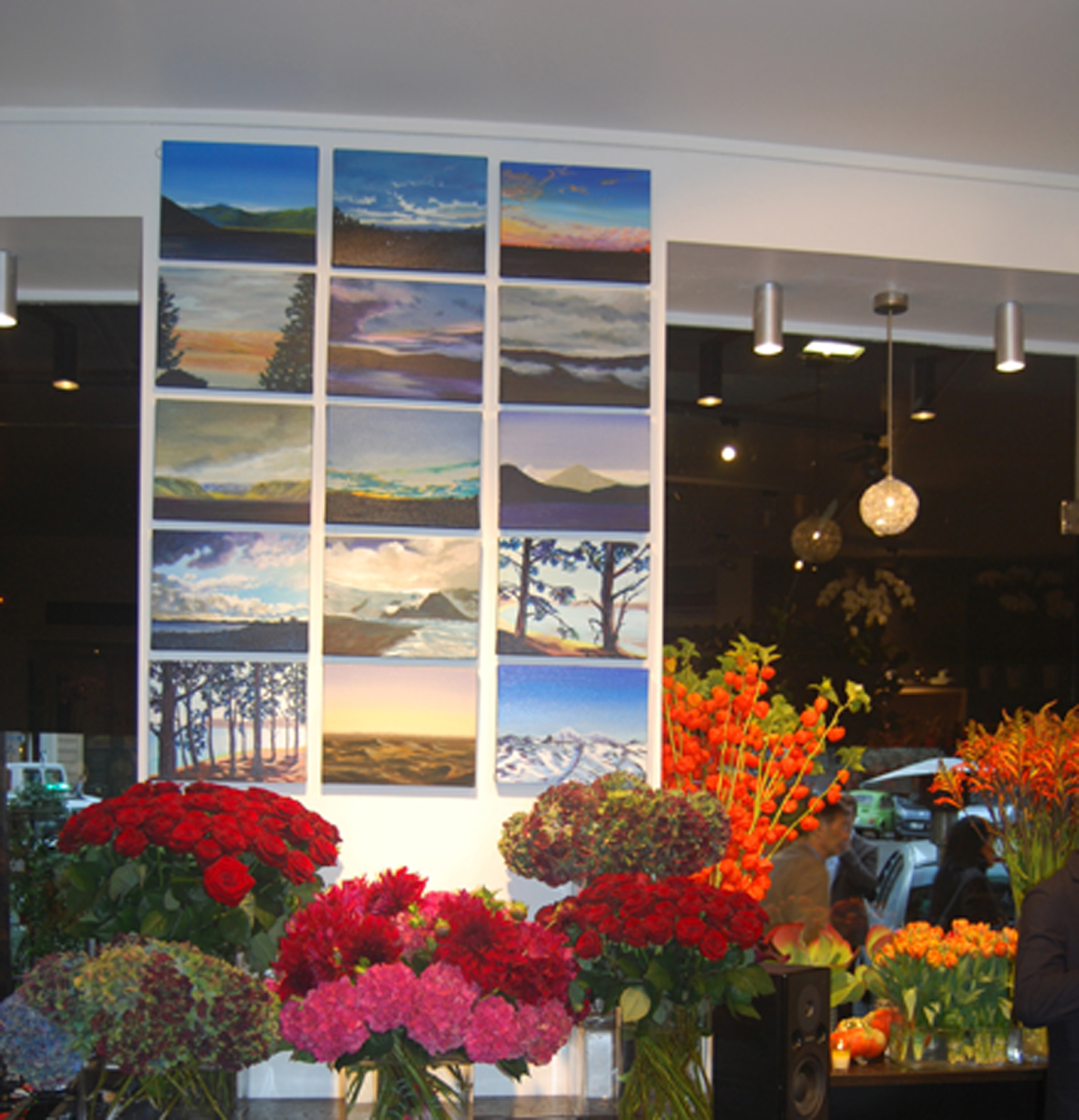 partie de sa collection intitulée « Quelle que soit la minute du jour », des toiles tournées vers la nature, débordantes de mille et une couleurs. Des compositions florales de toutes tailles venaient habiller les œuvres de Olivier Masmonteil tout en s’accordant délicatement avec les paysages grandeurs nature dissimulés dans la boutique.