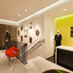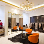 Passé la façade victorienne classée, on renoue aussitôt avec les codes décoratifs qui font l’élégance du style PAULE KA depuis près de 25 ans. Inspiré par le sublime Pavillon barcelonais de Mies van der Rohe, le directeur artistique de la marque a opté pour un étonnant contraste de marbre blanc (carrare) et noir (marquina) rehaussé par le leitmotiv doré du laiton qui encadre les volumes et souligne les perspectives. Paravents, miroirs, cloisons de velours grège, éclairages : l’espace se dessine au fil des symétries, entraînant le visiteur dans un jeu de trompe-l’œil et de combinaisons savamment orchestré. Une déambulation qui s’initie dès l’espace d’accueil où les accessoires PAULE KA – sacs, lunettes, bijoux, souliers – semblent flotter, comme suspendus par magie. On s’avance dans cet univers graphique où dialoguent pièces de mobilier vintage – lustres italiens 60’s, guéridons signés – et éléments de présentation sur-mesure avant de découvrir, en perspective, l’alcôve des collections de prêt-à-porter jour qui se dévoile derrière les plis d’un rideau de velours beige.