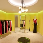 Surprenant par sa diversité de formes, une collection de miroirs 60’s encadrés de laiton invite alors le visiteur à prendre l’escalier de marbre pour découvrir les salons de présentation – rose et vert – qui se font face. Encore peu visibles dans la capitale anglaise, les créations de la collection Black Carpet – habillé pour le soir – sont ici magnifiées par la fulgurance moderniste d’un écrin couleur pistache. Fauteuils scandinaves, suspension Stil Novo… la décoration joue des contrastes, comme un clin d’œil aux années chic et folles du Swinging London. Un sens de la surprise qu’on retrouve dans l’atmosphère intimiste du boudoir aux murs rose poudré où se tiennent les modèles du prêt-à-porter habillé qui font chaque année le succès de la maison.
