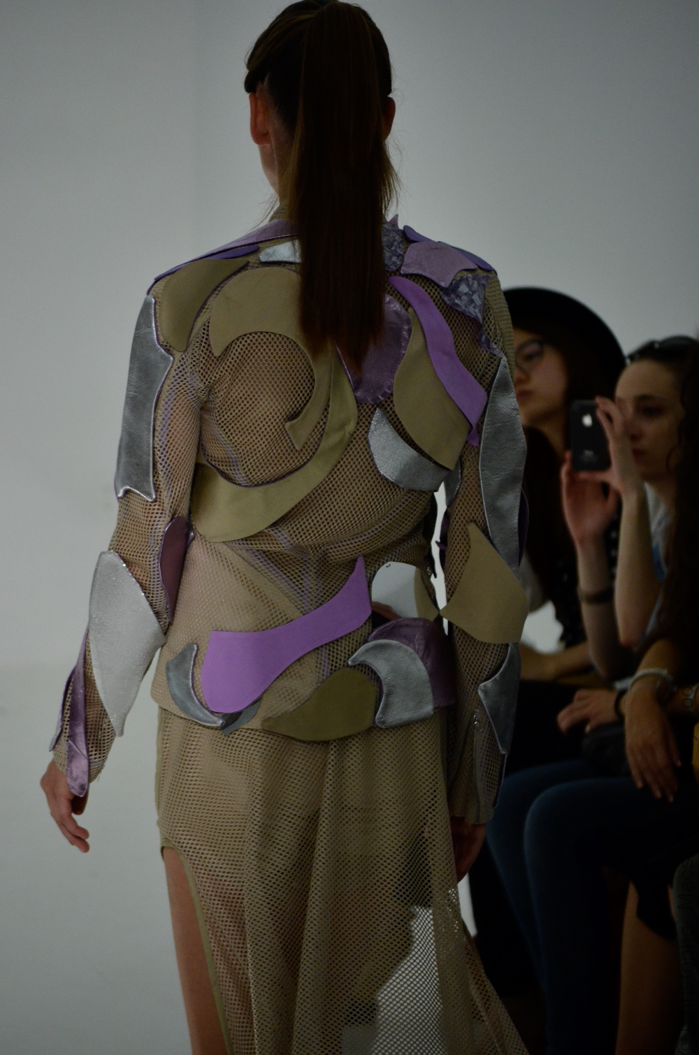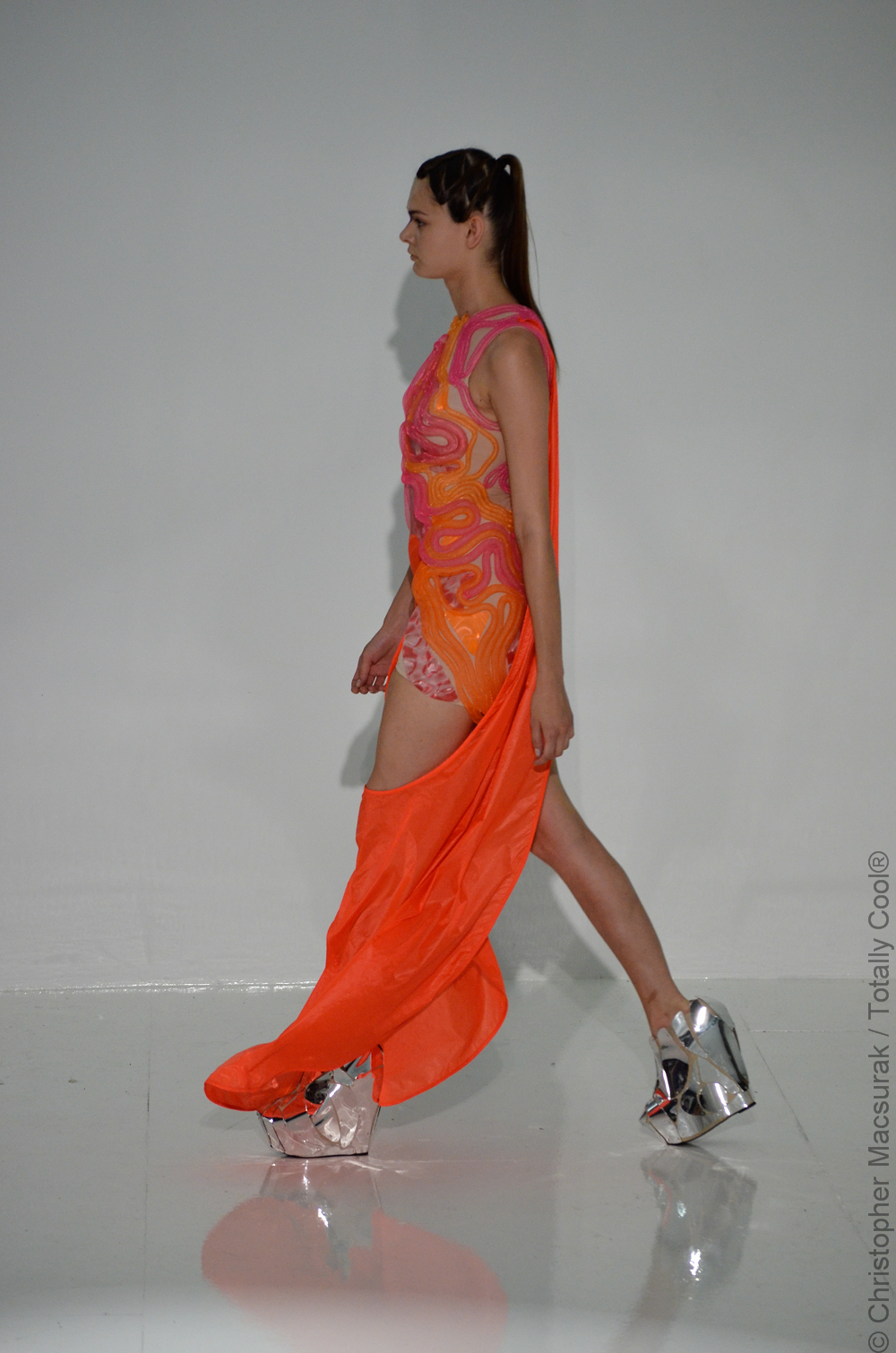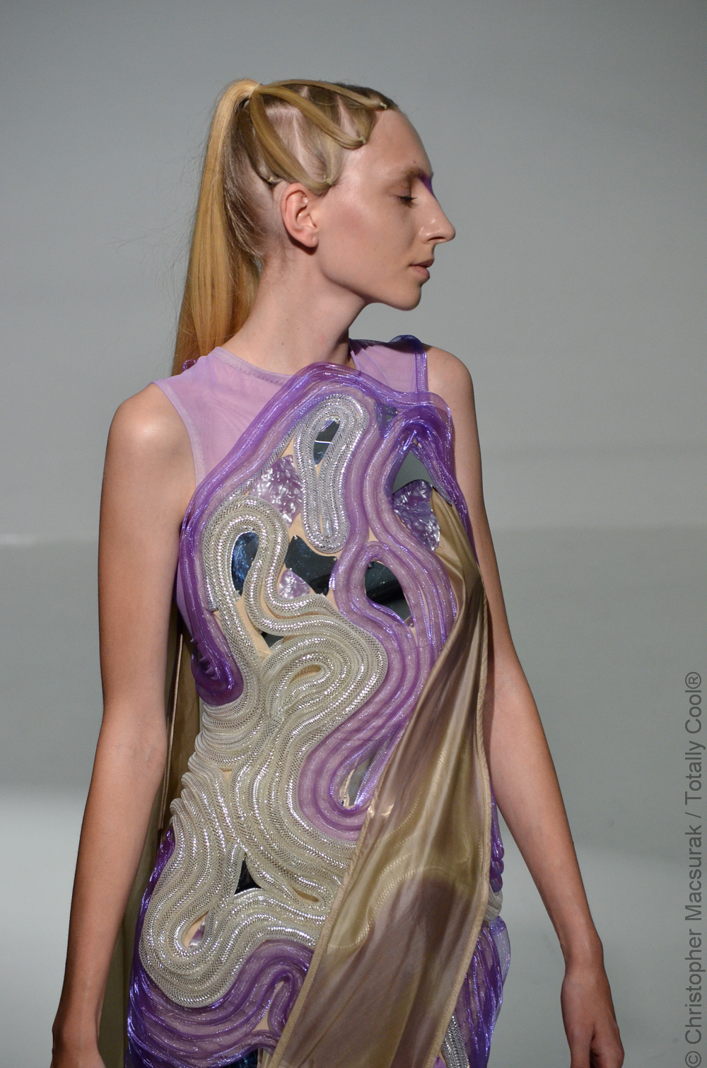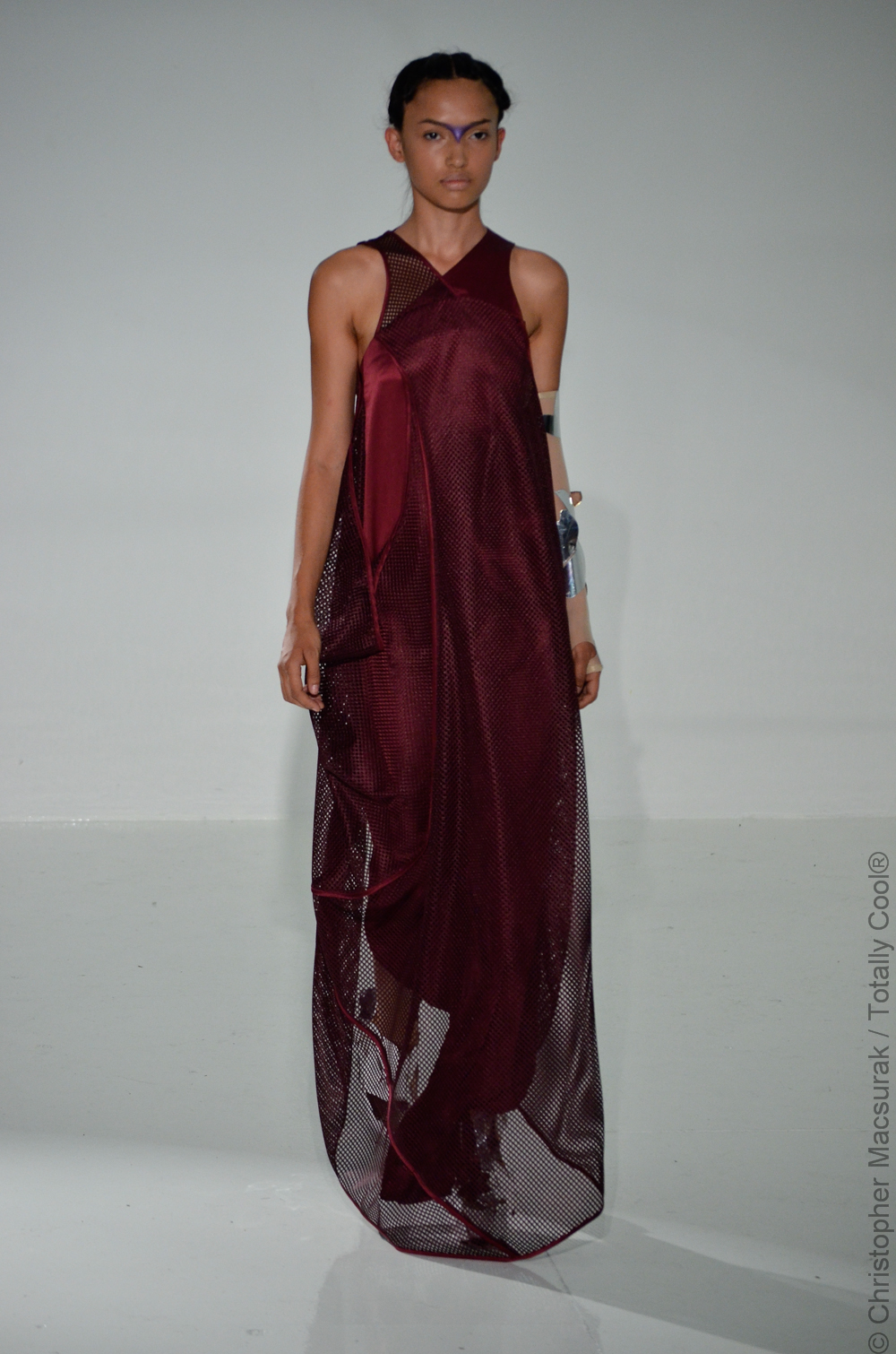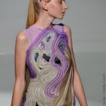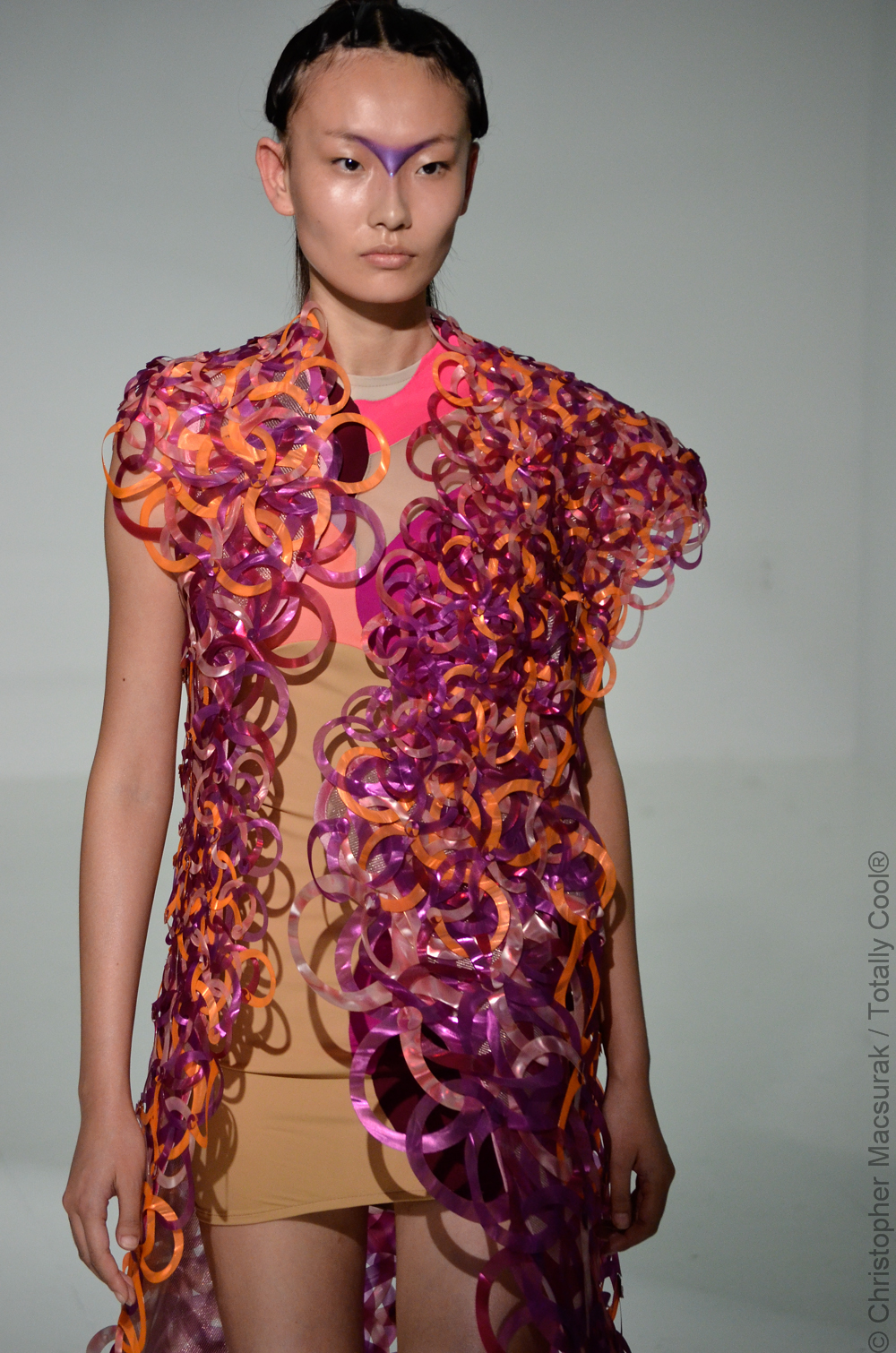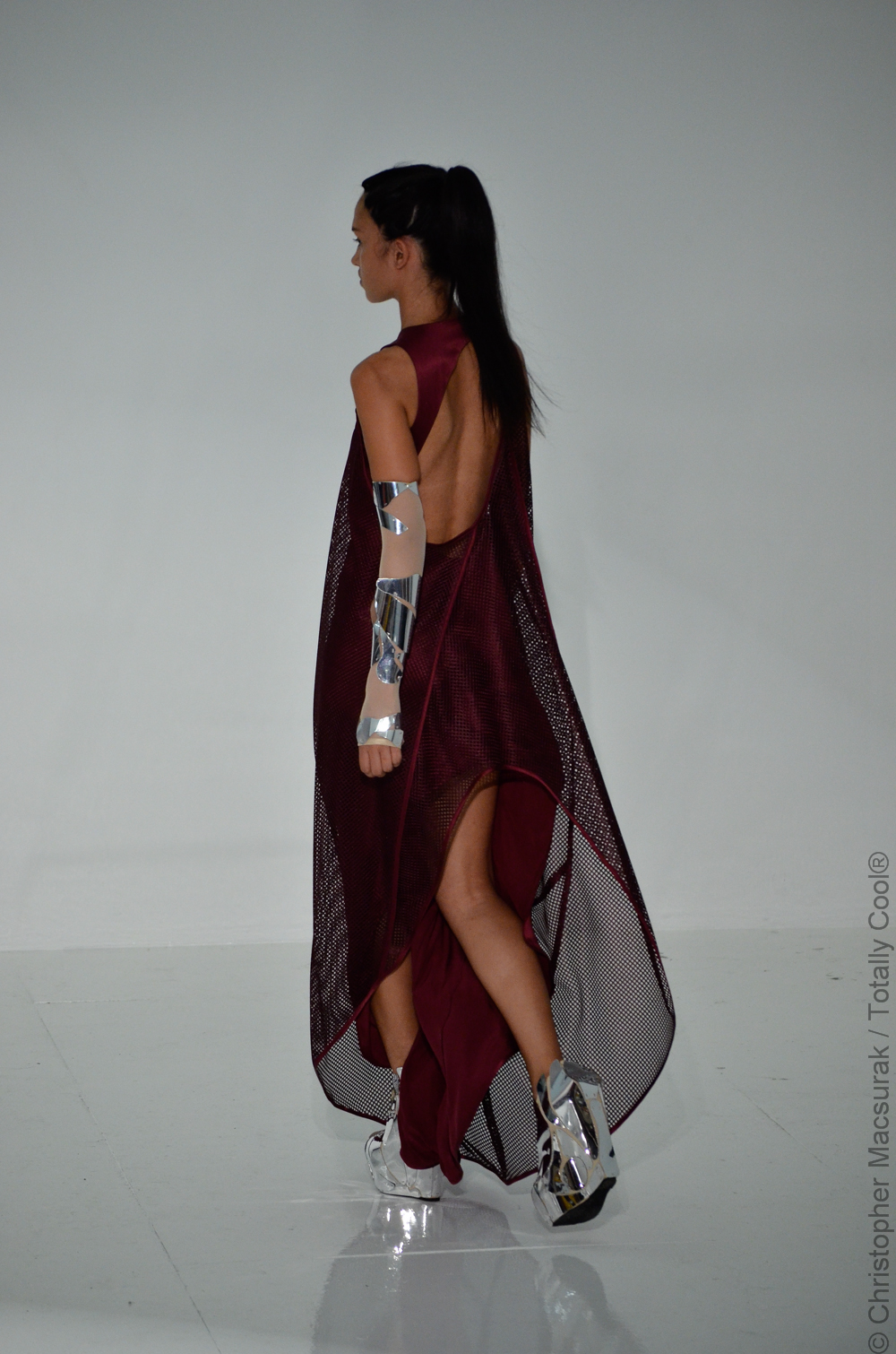 Une collection futuriste et graphique, inspirée par « les champs magnetiques humains ». Les tons sont ocres, bordeaux, sables, beiges et roses.