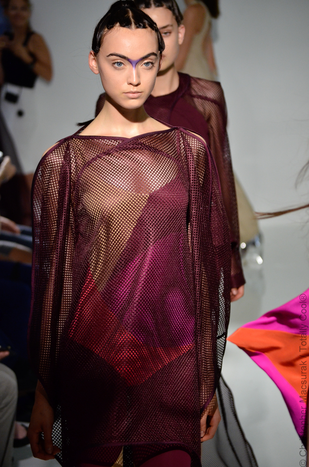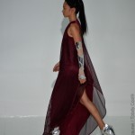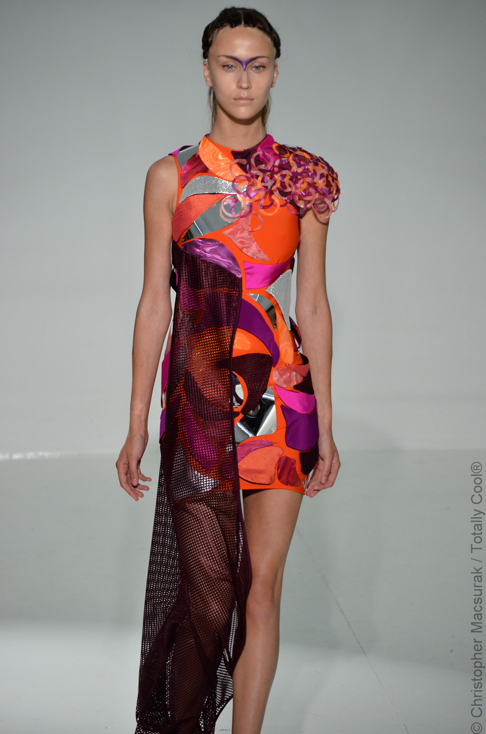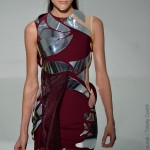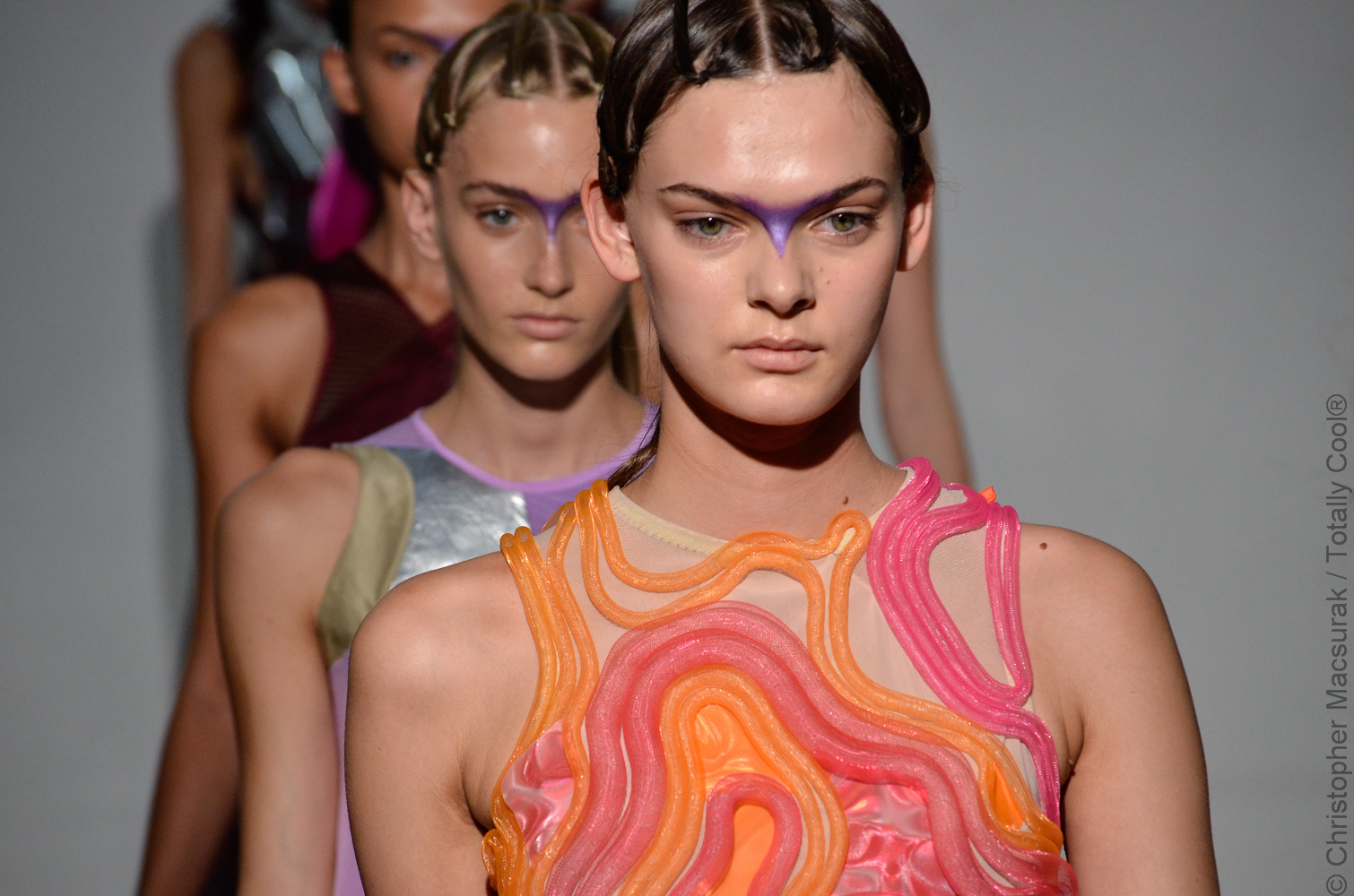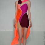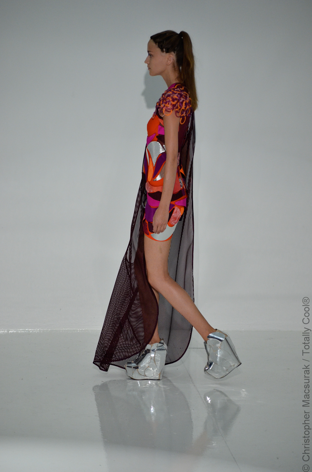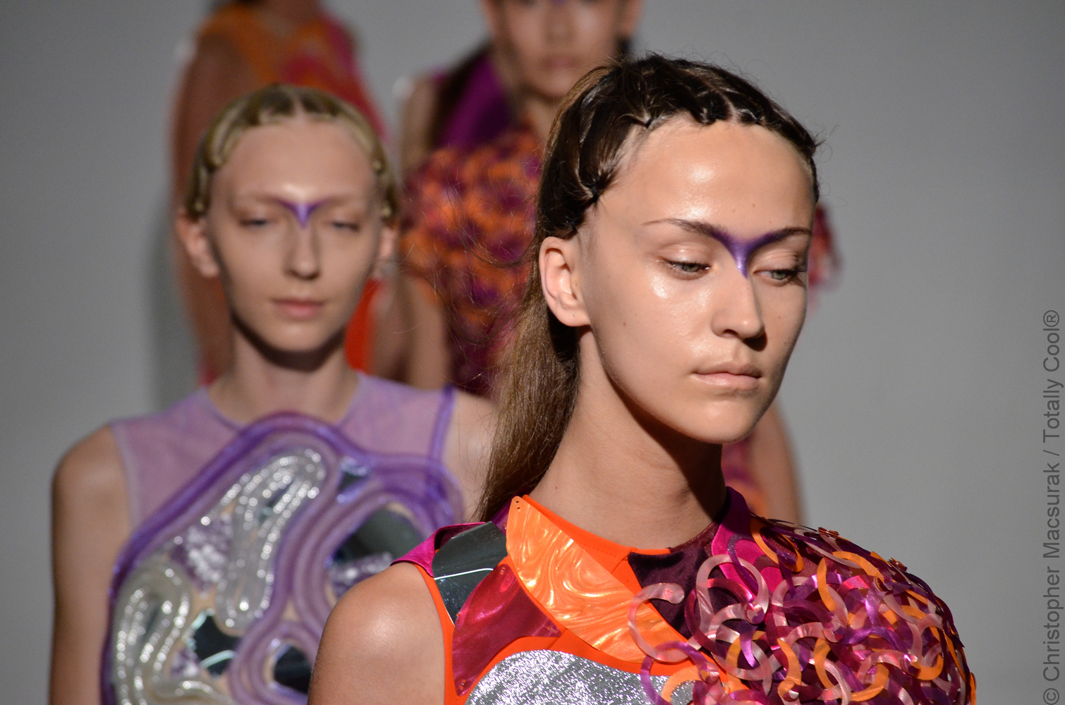 Une collection futuriste et graphique, inspirée par « les champs magnetiques humains ». Les tons sont ocres, bordeaux, sables, beiges et roses.
