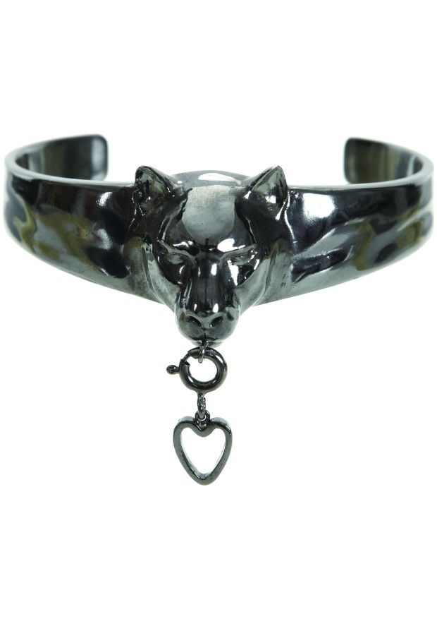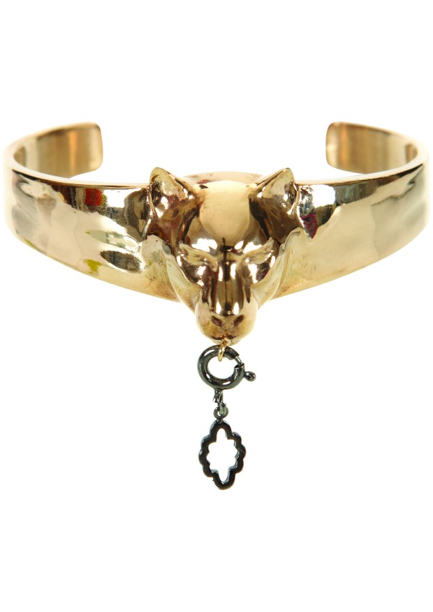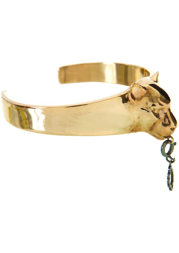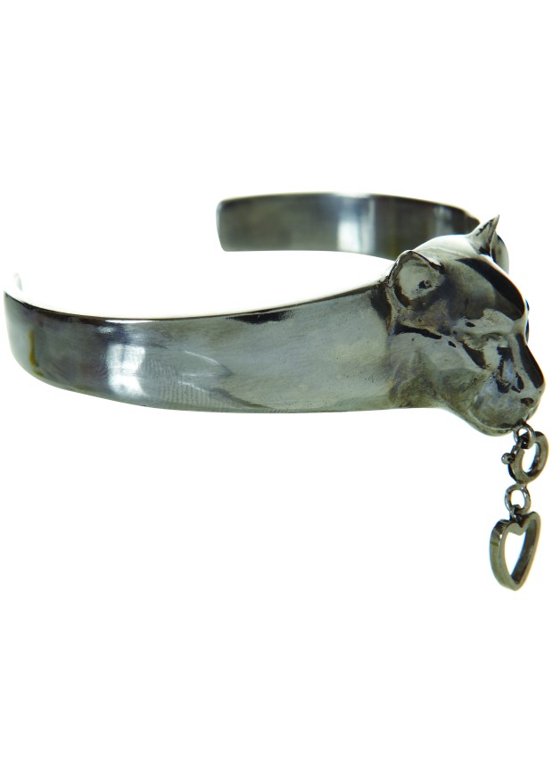 Les manchettes et les bagues de la collection ont également une tête de panthère sculptée avec une breloque amovible au niveau de la bouche. Les chaînes plaquées en or fin peuvent être à la fois des bracelets comme