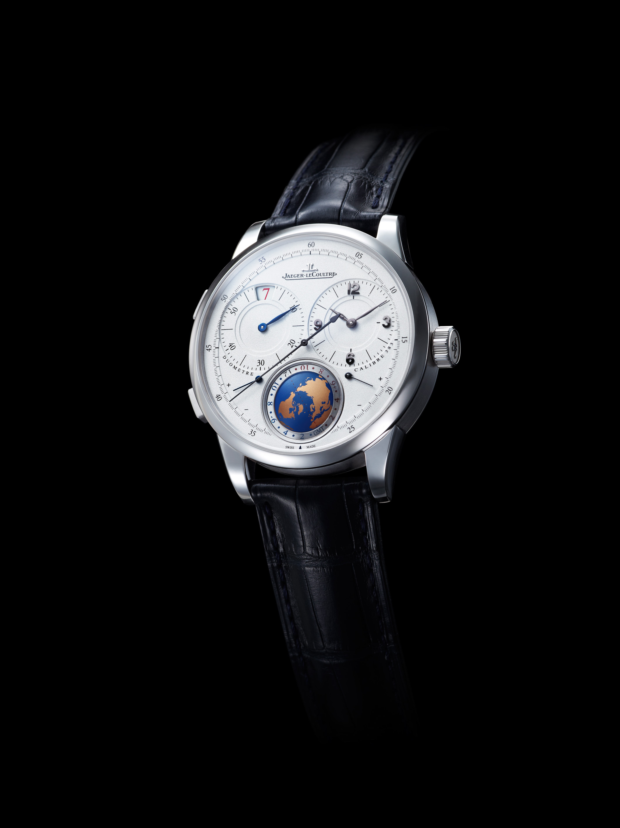Deuxième acte : au vu de la complexité des fonctions, le cadran finement grainé se relève d’une parfaite clarté. Deux magnifiques compteurs disposés symétriquement donnent un équilibre parfait au visage de cette création horlogère – le premier cadran à 2h met en scène les heures et les minutes, et le second à 10h accueille les heures et les minutes du worldtime. Deux chiffres spécialement appliqués en rouge rendent hommage à l’adresse de la Boutique Jaeger-LeCoultre – les numéros 7 et 9.
