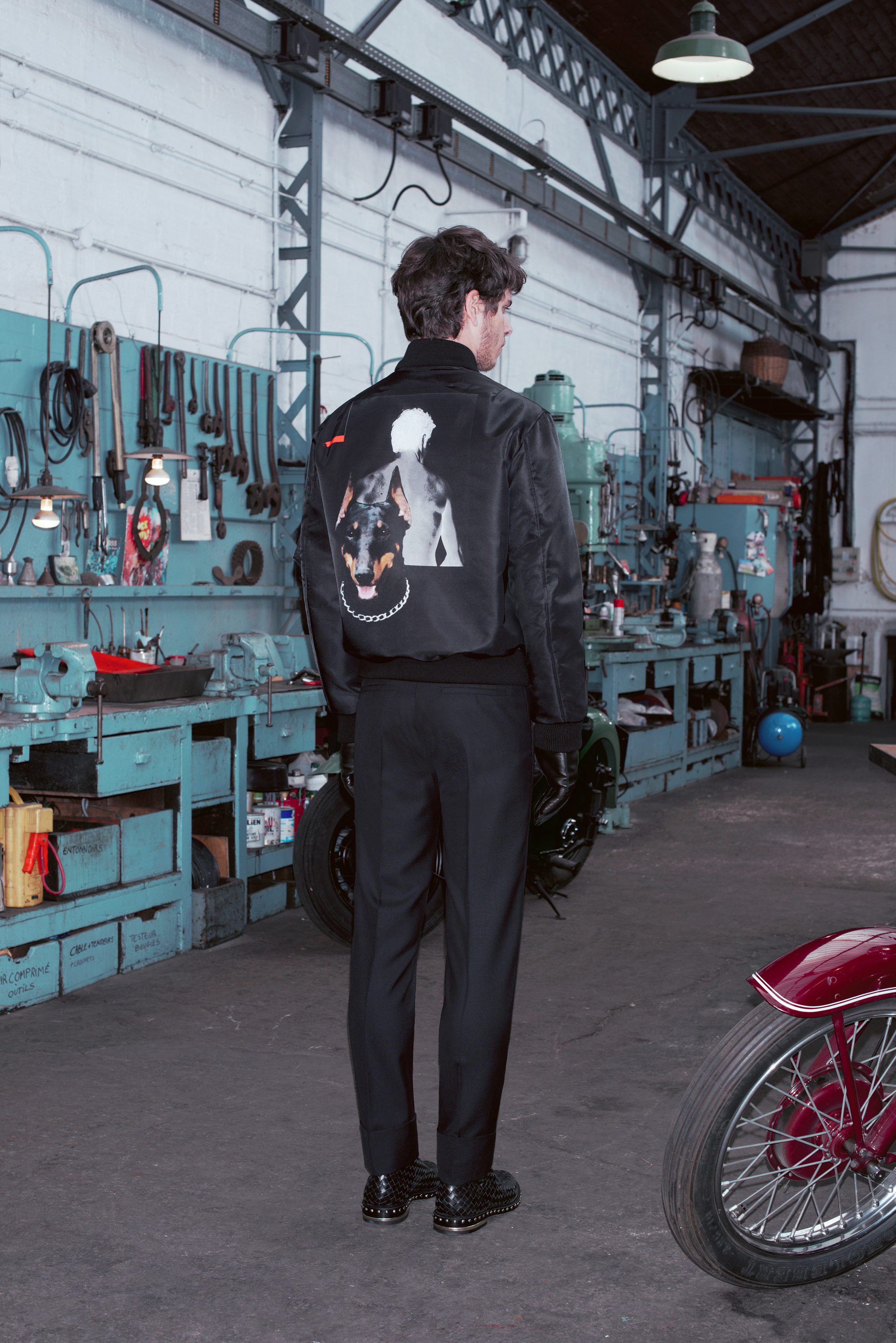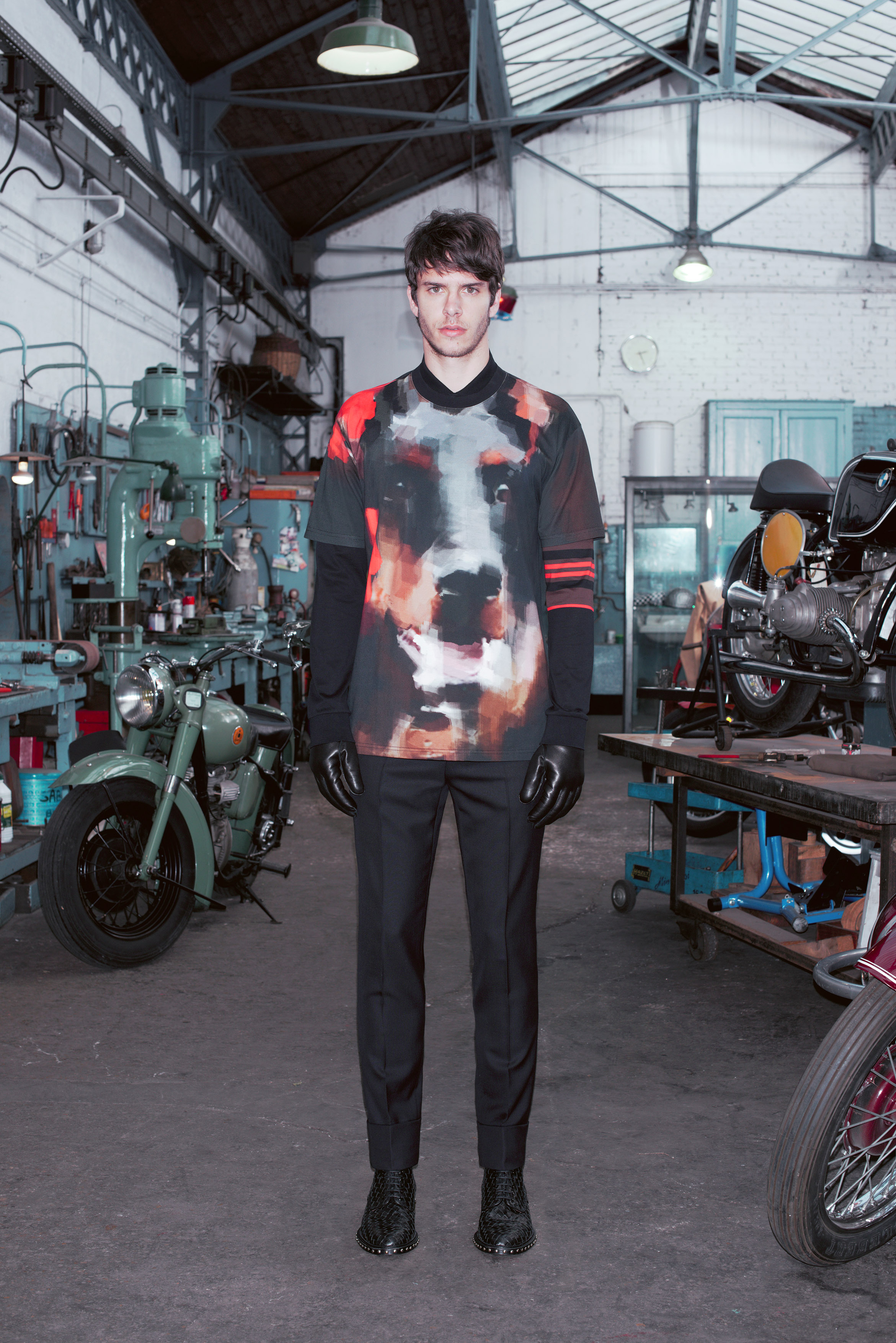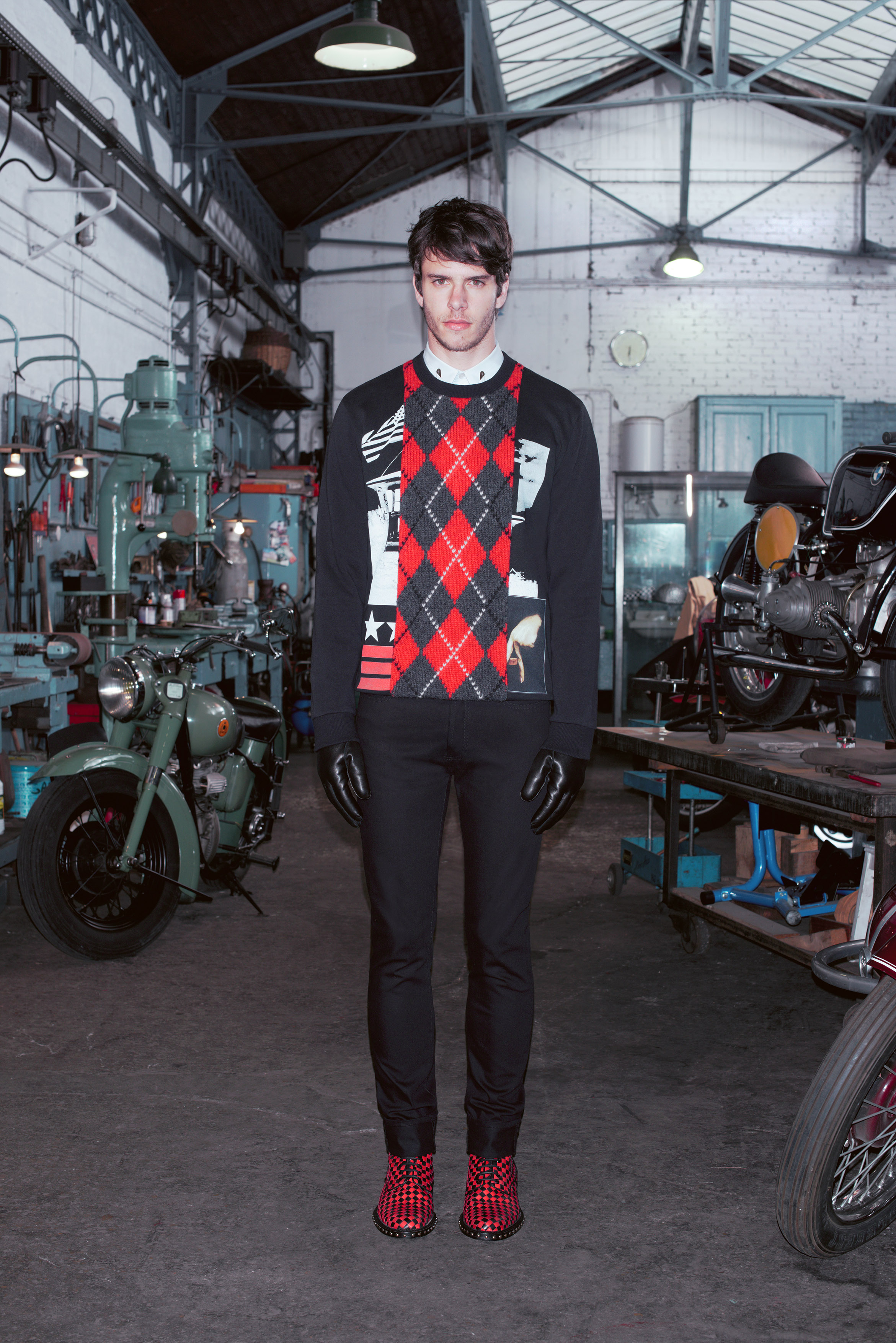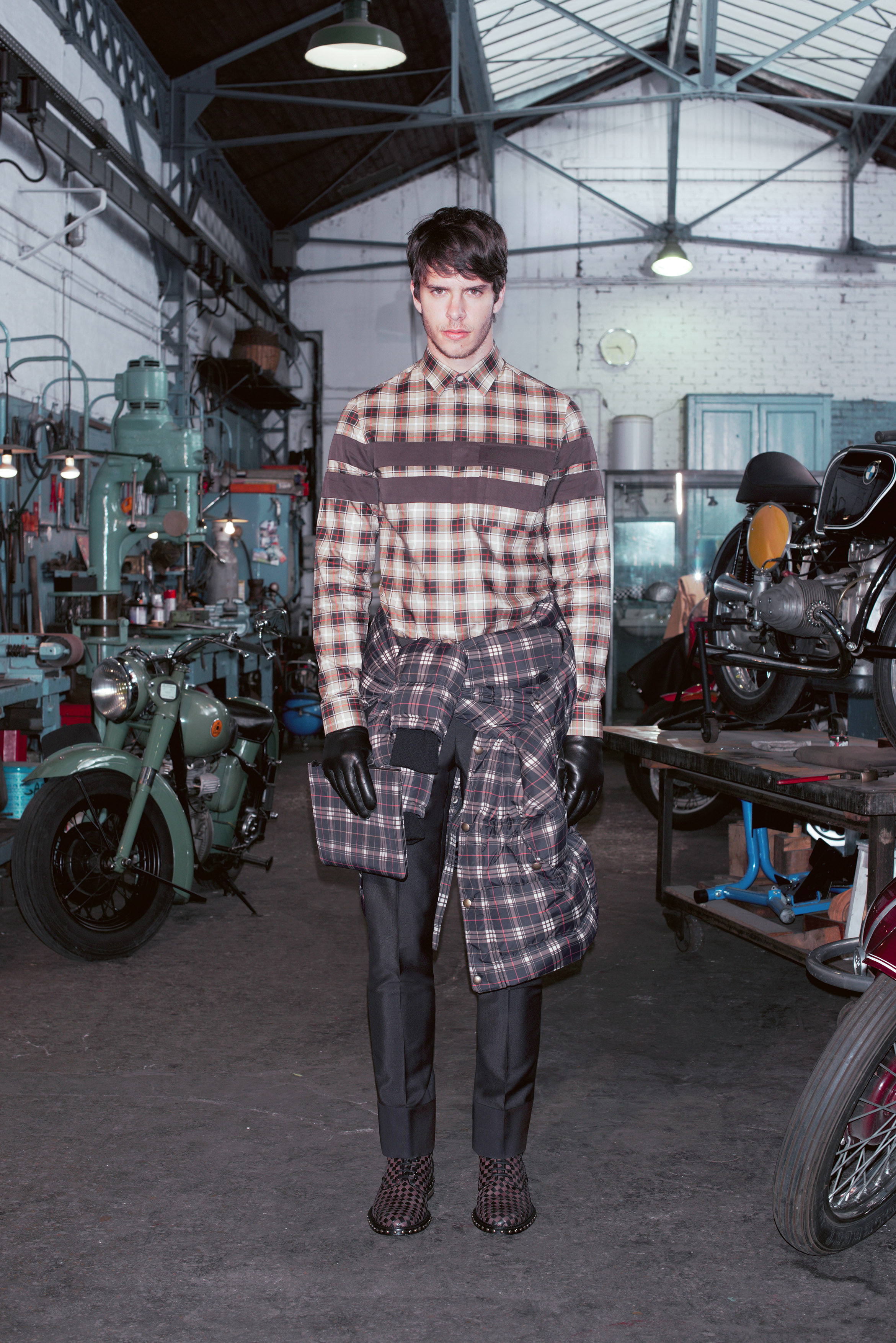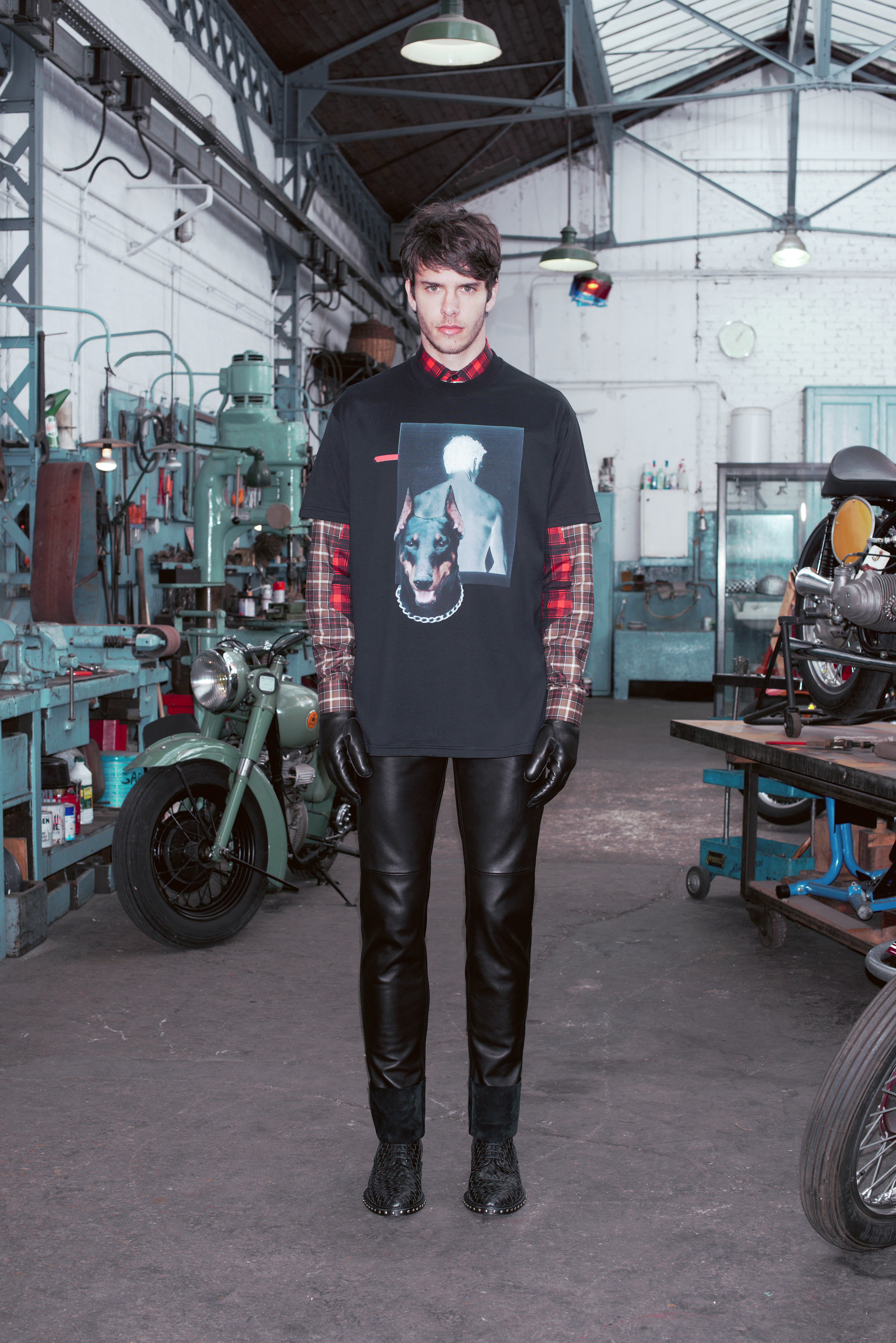 La pré-collection Automne se concentre sur les essentiels du vestiaire masculin. Riccardo Tisci les réinterprètent en leur insufflant ses obsessions : imprimés élaborés, carreaux exclusifs, contraste de matières et découpes recherchées. La collection renforce et développe les éléments caractéristiques de l’homme chez Givenchy, le tout empreint d’une influence de looks iconiques des univers de la moto et des meatpackers new-yorkais.