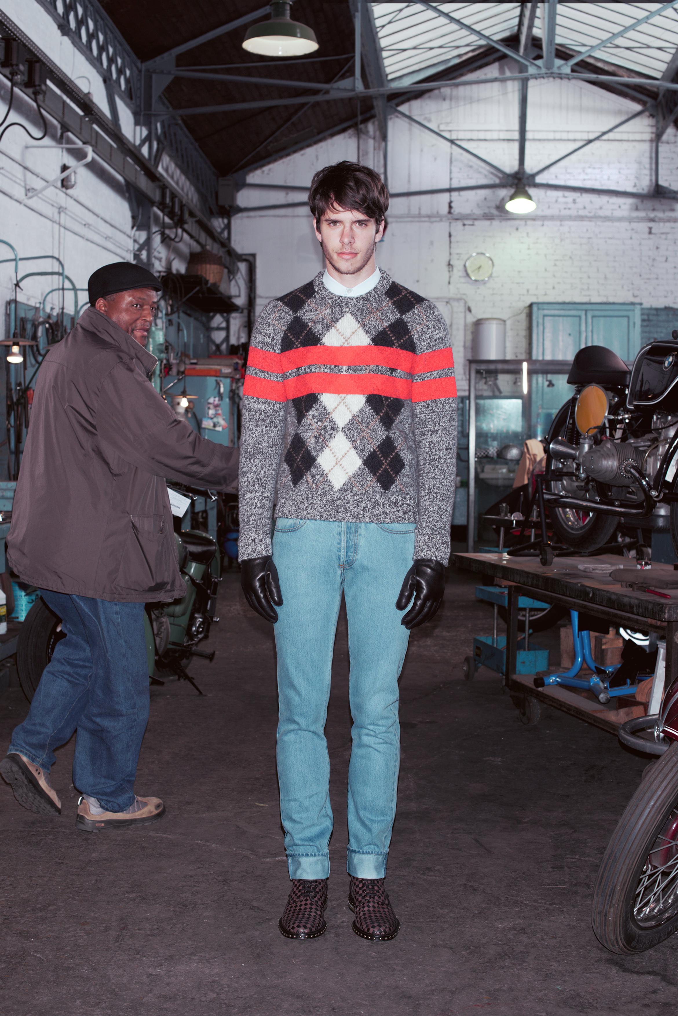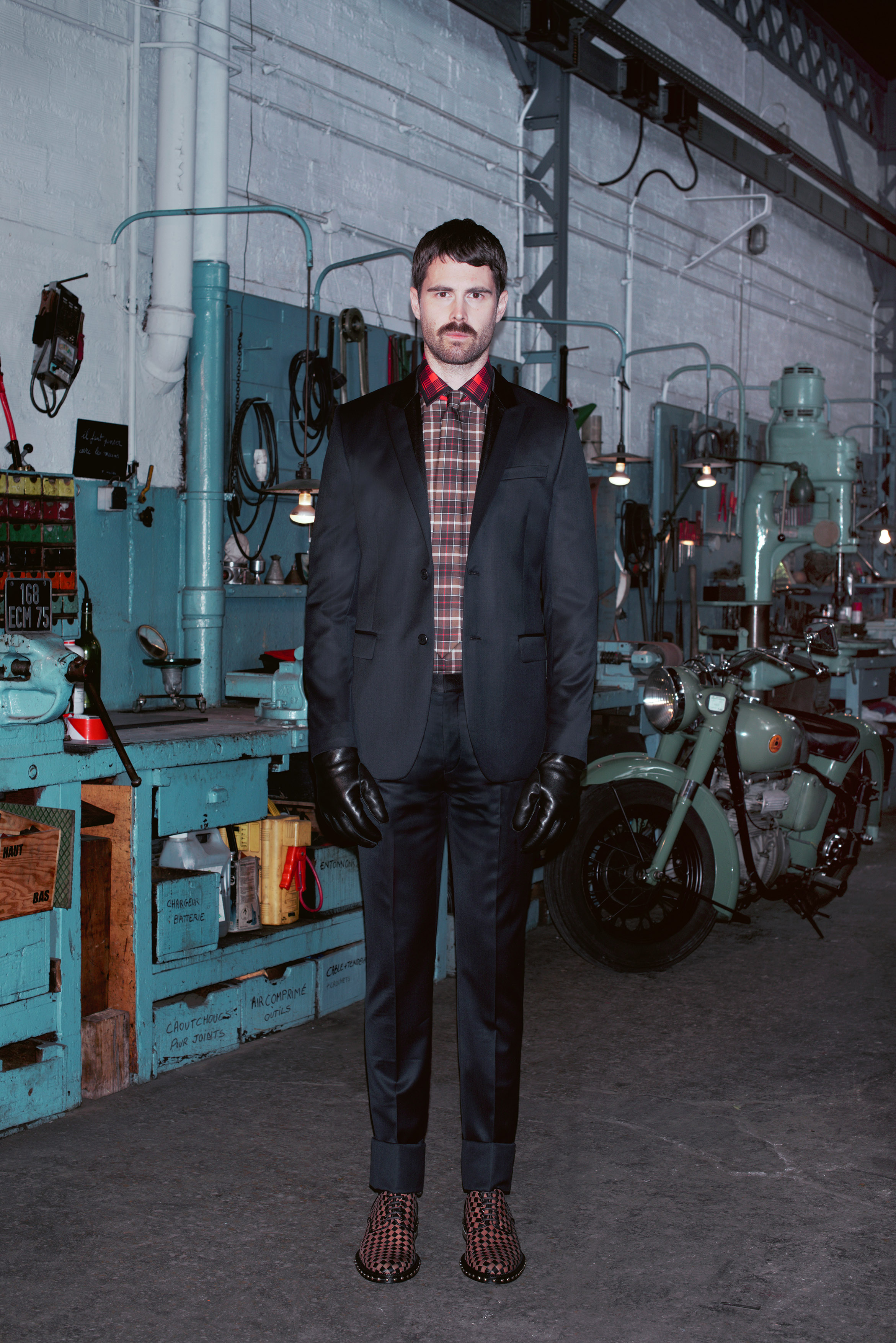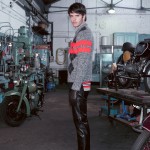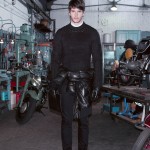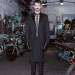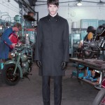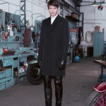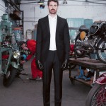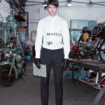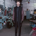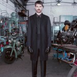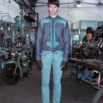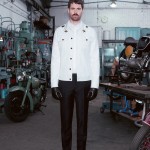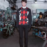 L’attitude est résolument déterminée et la silhouette près du corps. Les costumes aux coupes affutées se déclinent en moleskine avec insertions de gabardine de coton. En version smoking, ils sont taillés dans du velours de coton ou du drap de laine et satin. Les baleines de col de chemise en métal or gravé d’une étoile et d’une ligne sont insérées à l’extérieur du col. La maille alterne relief irlandais sophistiqué et motif à losanges gris rayé de larges bandes rouges.