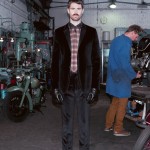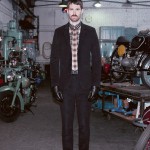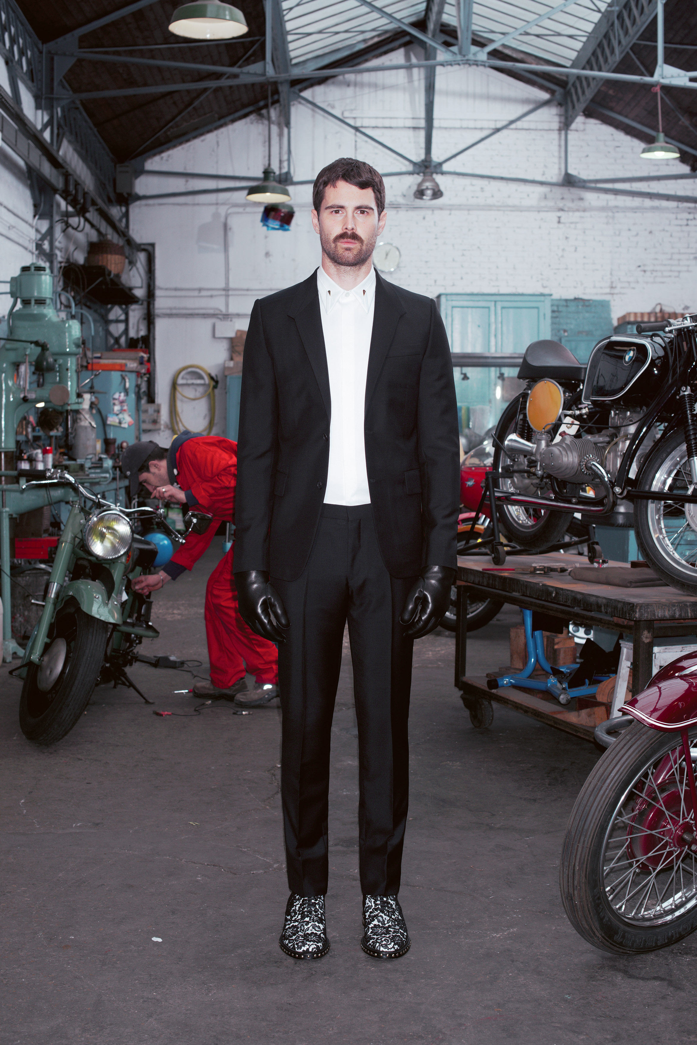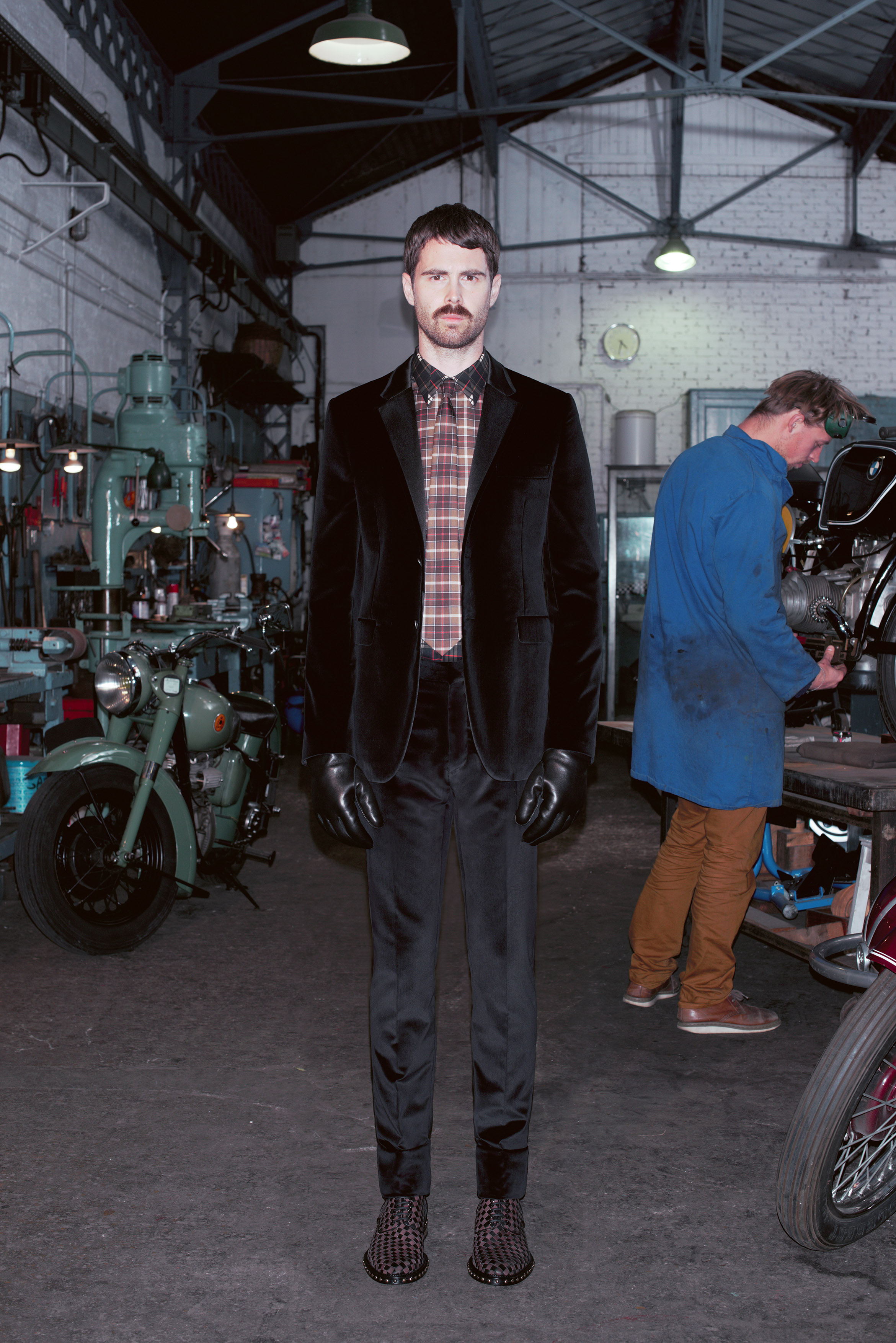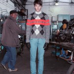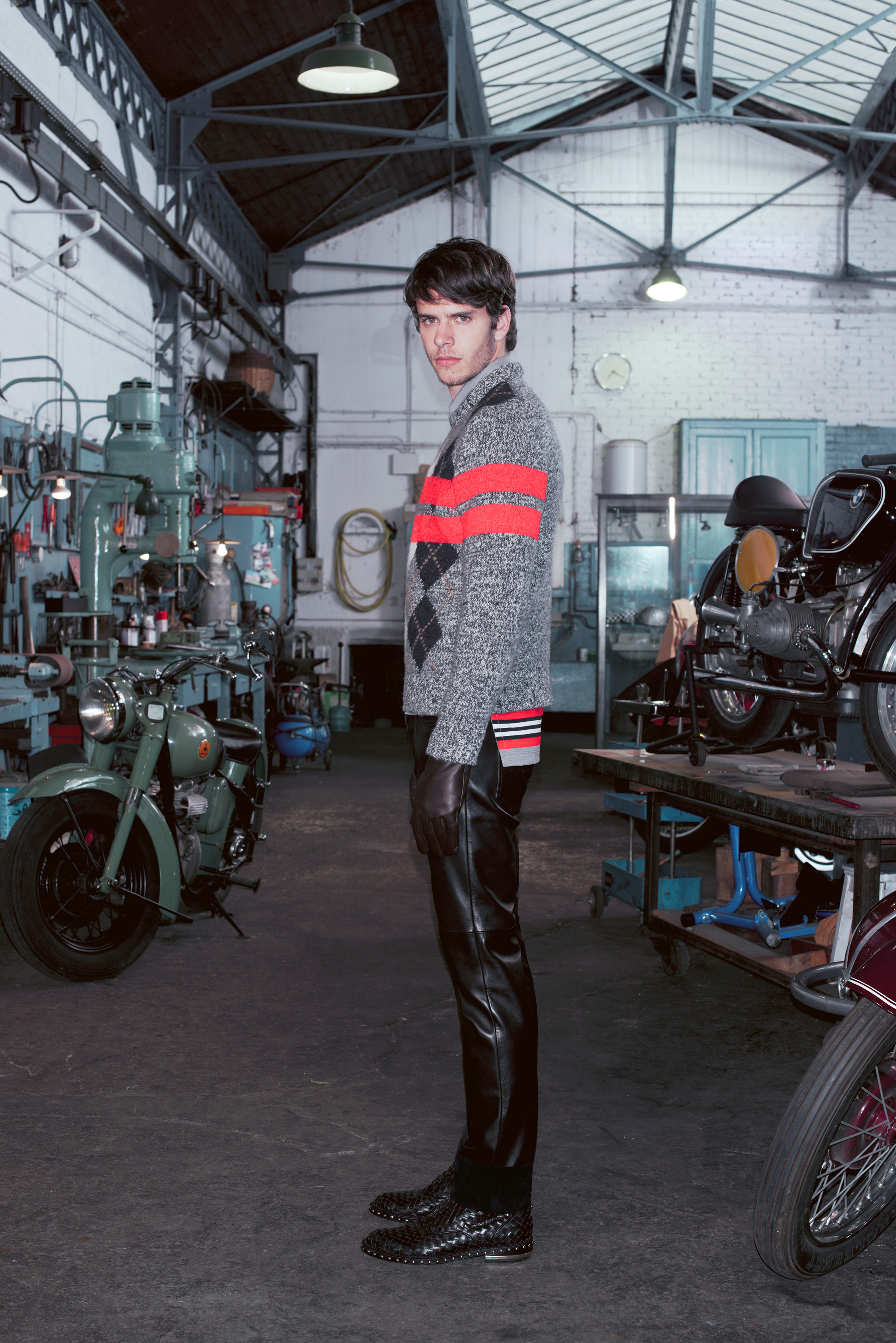 L’attitude est résolument déterminée et la silhouette près du corps. Les costumes aux coupes affutées se déclinent en moleskine avec insertions de gabardine de coton. En version smoking, ils sont taillés dans du velours de coton ou du drap de laine et satin. Les baleines de col de chemise en métal or gravé d’une étoile et d’une ligne sont insérées à l’extérieur du col. La maille alterne relief irlandais sophistiqué et motif à losanges gris rayé de larges bandes rouges.