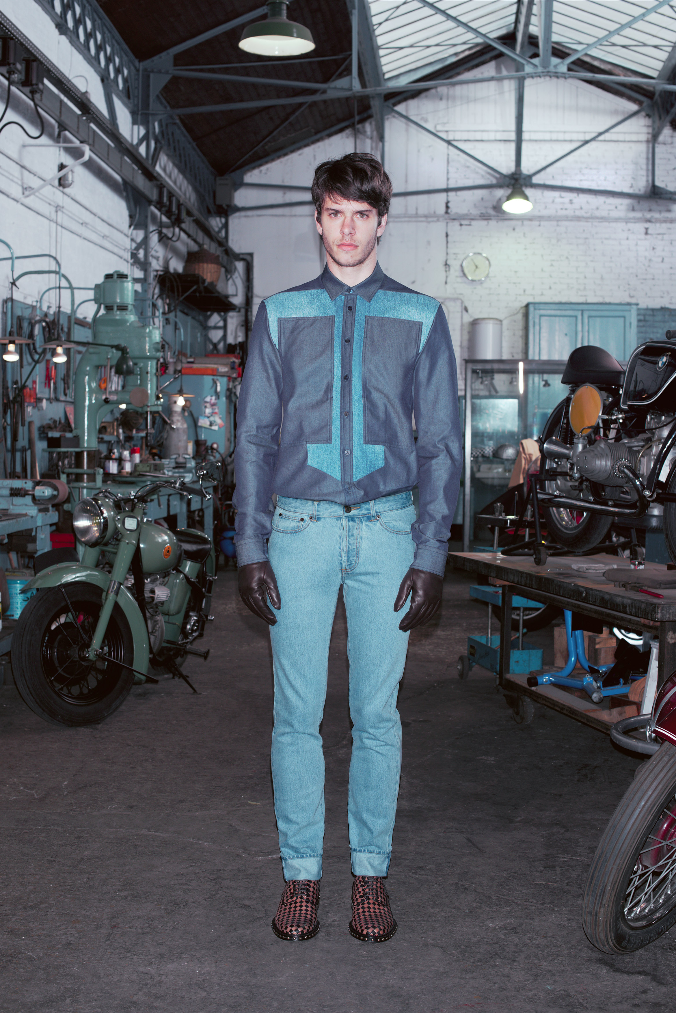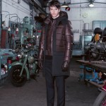 Juxtaposant plusieurs imprimés ou assemblant plusieurs matières, les patchworks confèrent une dimension graphique à la collection. Des chemises en denim délavé et chambray indigo oscillent entre vêtement de travail et chemise à plastron géométrique. D’autres chemises jouent sur les empiècements de différents écossais et cravate coordonnée. Une parka en néoprène noir fusionne avec une doudoune courte en nylon marron dans un effet trompe l’œil. Un panneau de maille à motif losanges discontinue verticalement un sweatshirt en coton imprimé.
