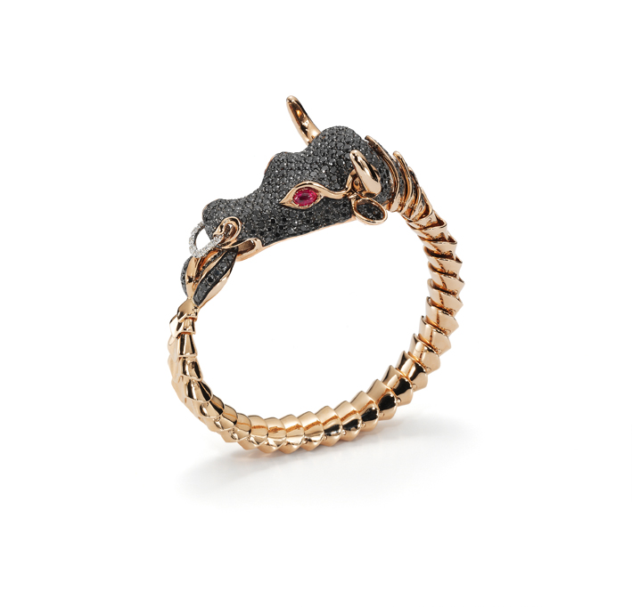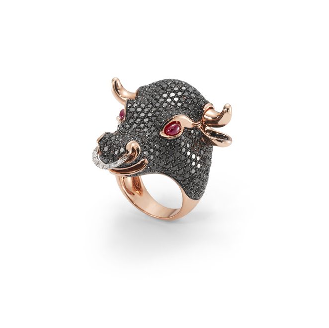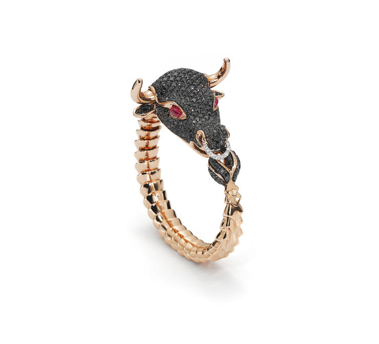 Cette ligne se compose d’un bracelet et d’une bague, réalisés en 10 exemplaires chaque seulement (entre 17 700€ et 22 700€), en or élastique avec des diamants noirs. Les yeux du taureau sont représentées par des rubis, pierre signature du joaillier.