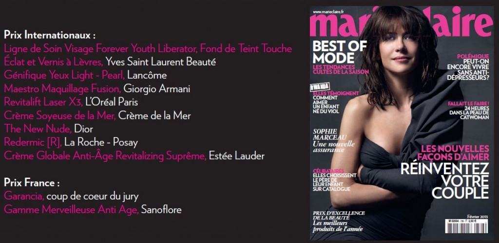 Retrouvez l’intégralité du palmarès ci-dessous, sur un slideshow très esthétique, et qui donne envie de tester tous ces fabuleux produits : http://www.marieclaire.fr/palmares-PEB-2013 et évidemment dans le n° de février, en kiosque depuis ce matin, où sont révélés « ces meilleurs cosmétiques de l’année ».