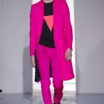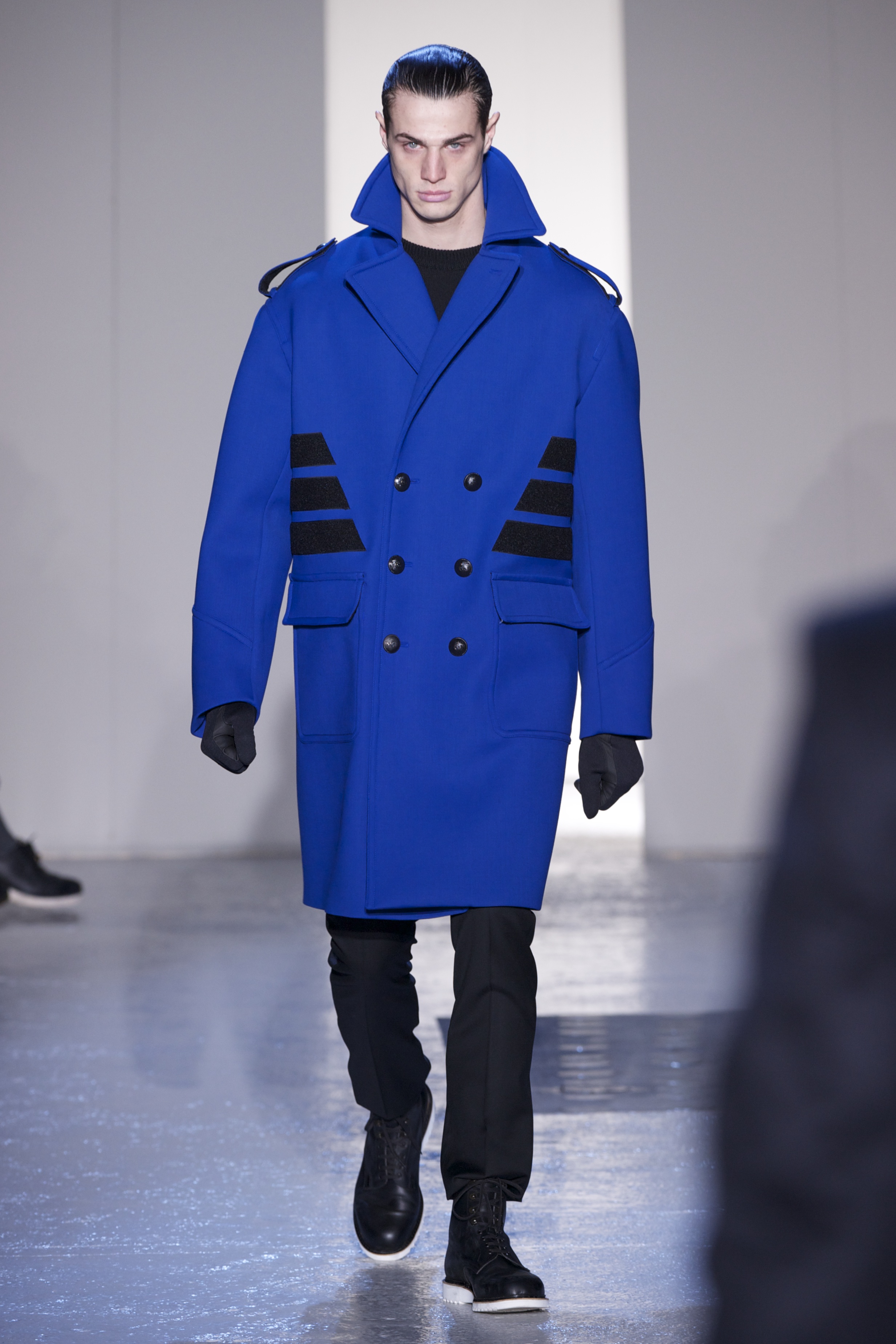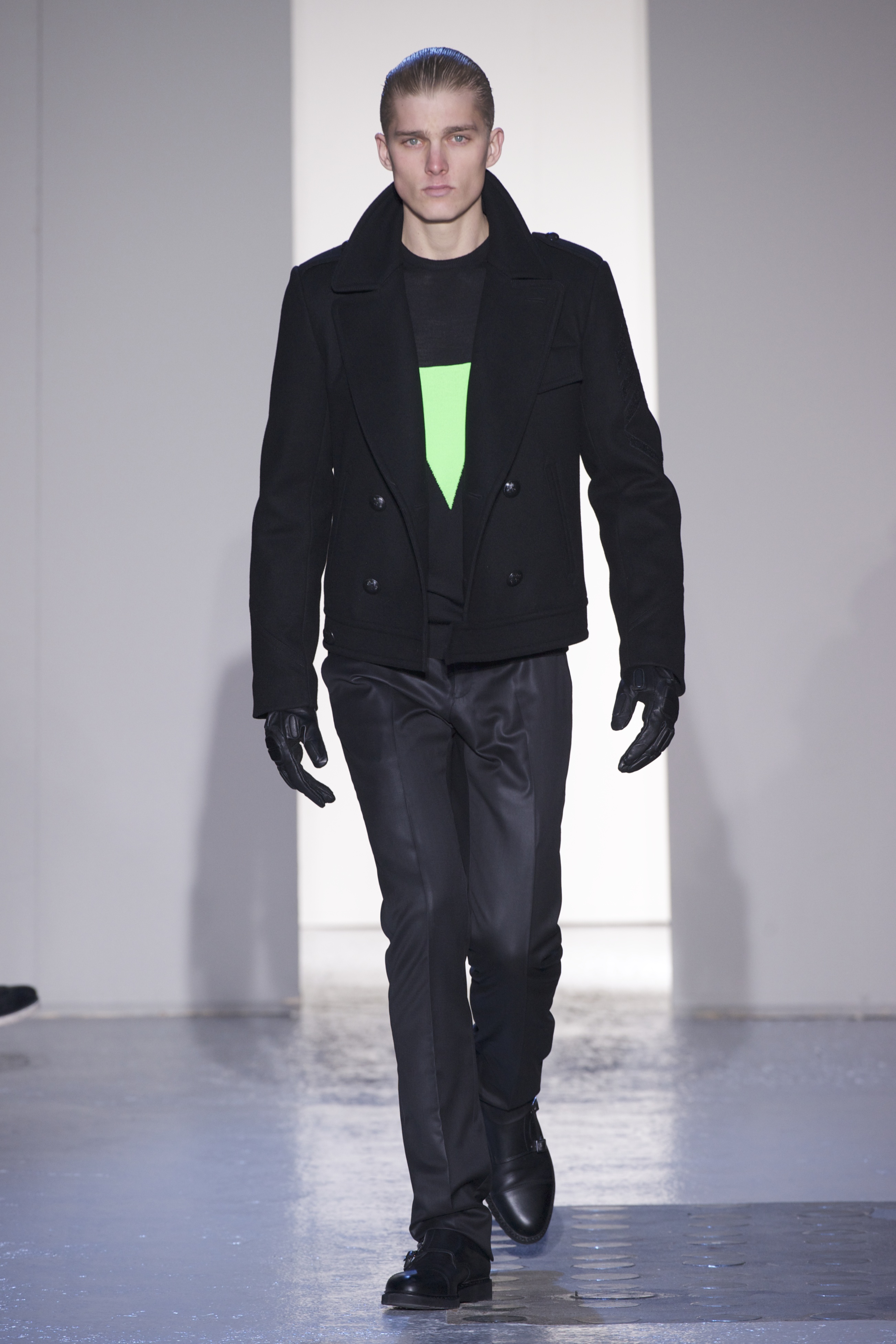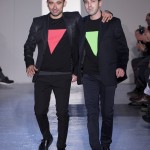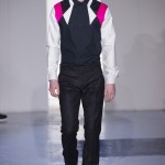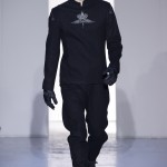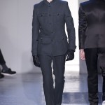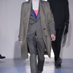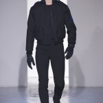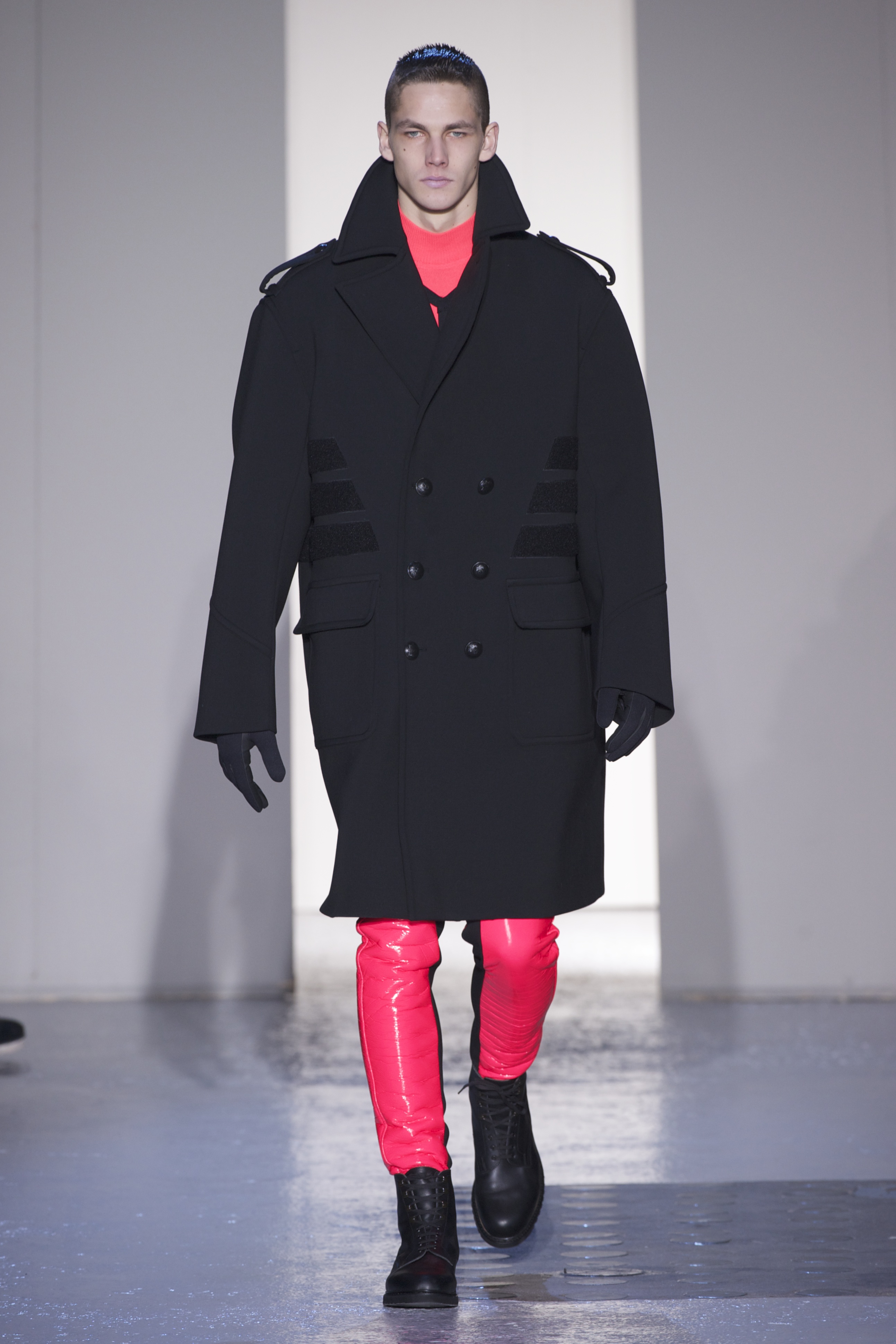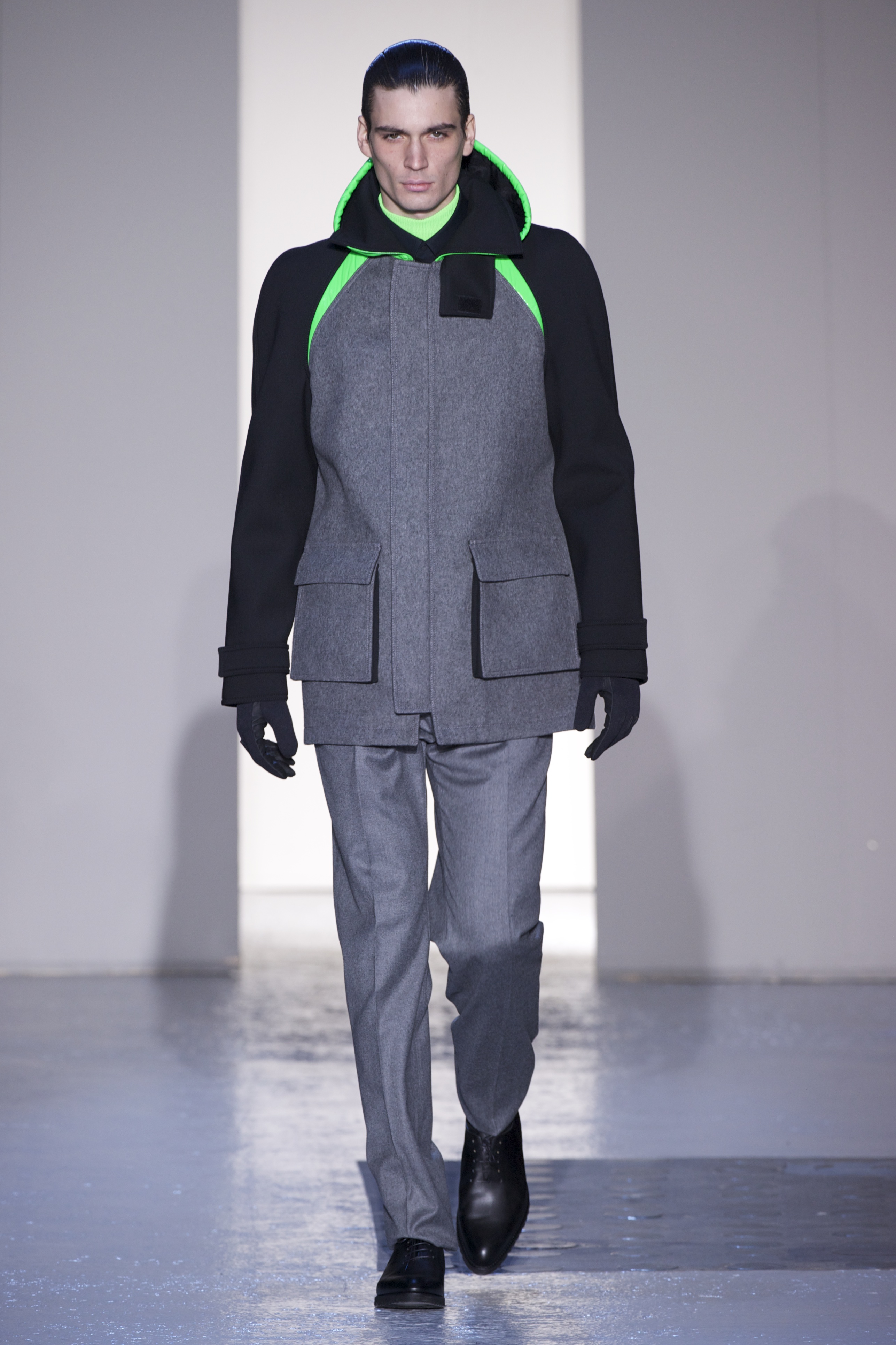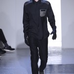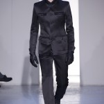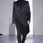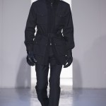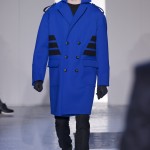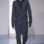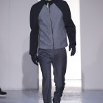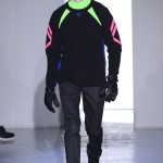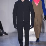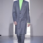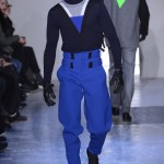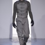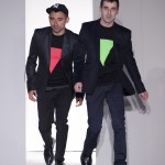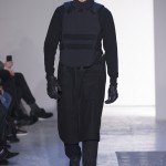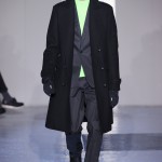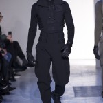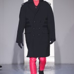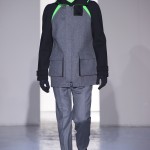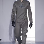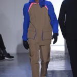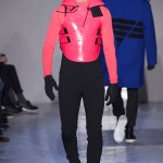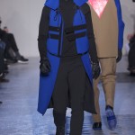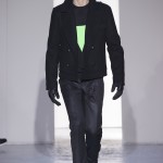 Gris et noir sont bien sur présents mais le créateur n’hésite pas a se diriger vers des teintes flashys, réminiscences de la période des fluo kids. Géométrie impeccable et looks pointus, ce sont des vêtements futuristes ou rétro-futuristes évoquant les tenues des militaires ou des astronautes. Les matières sont néanmoins douces et on n’assiste pas à une trop grande excentricité quand à leur choix. Les volumes, conséquents, mais toujours maîtrisés, confèrent un effet dramatique aux tenues.
