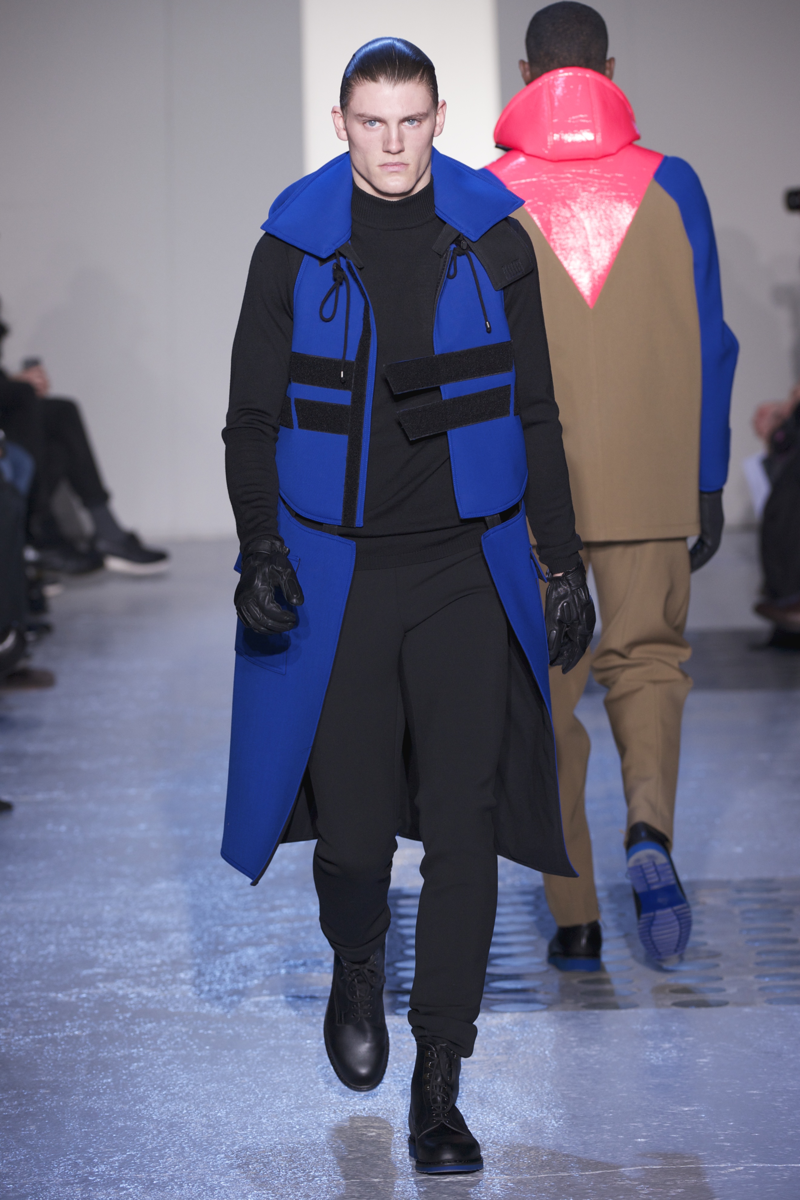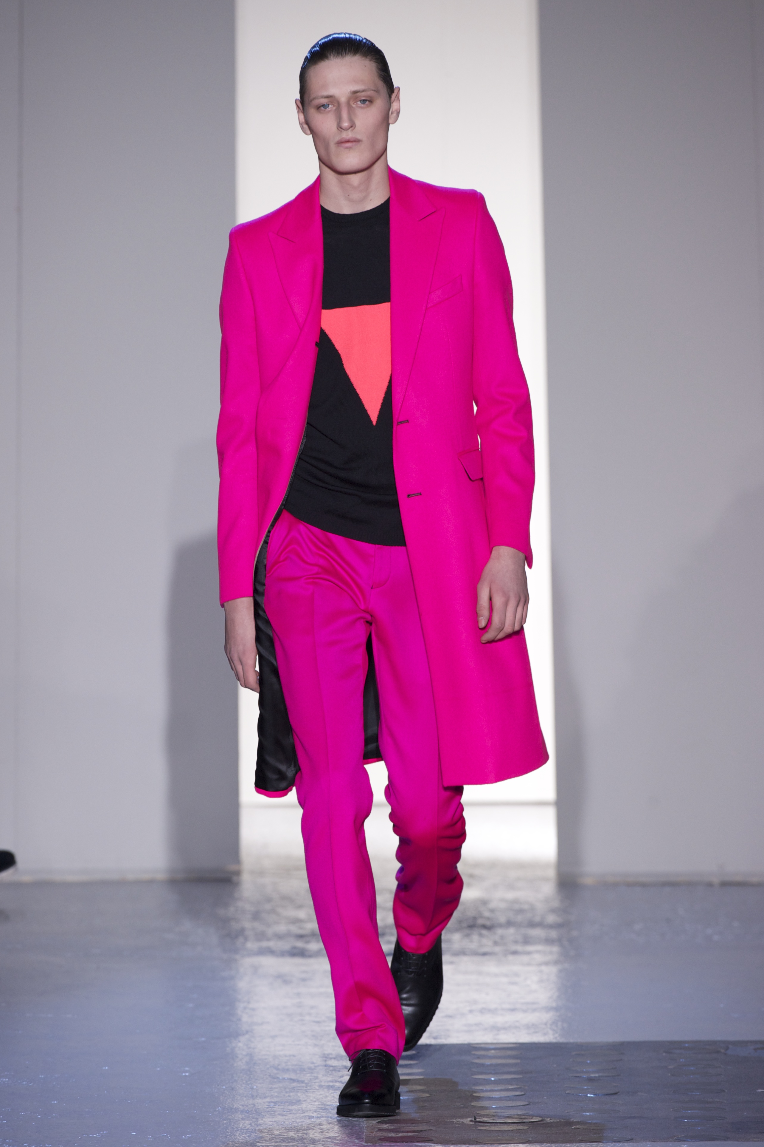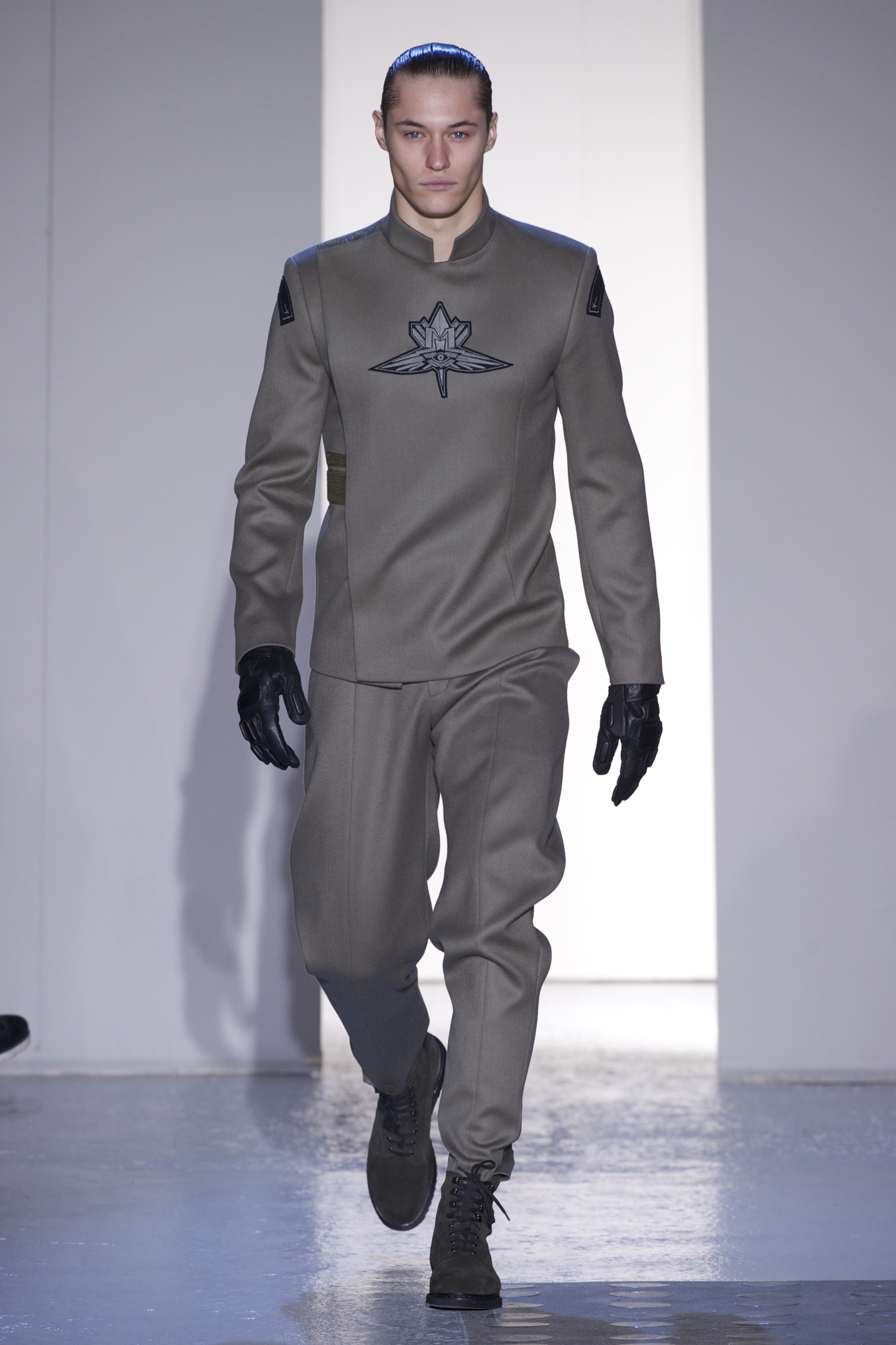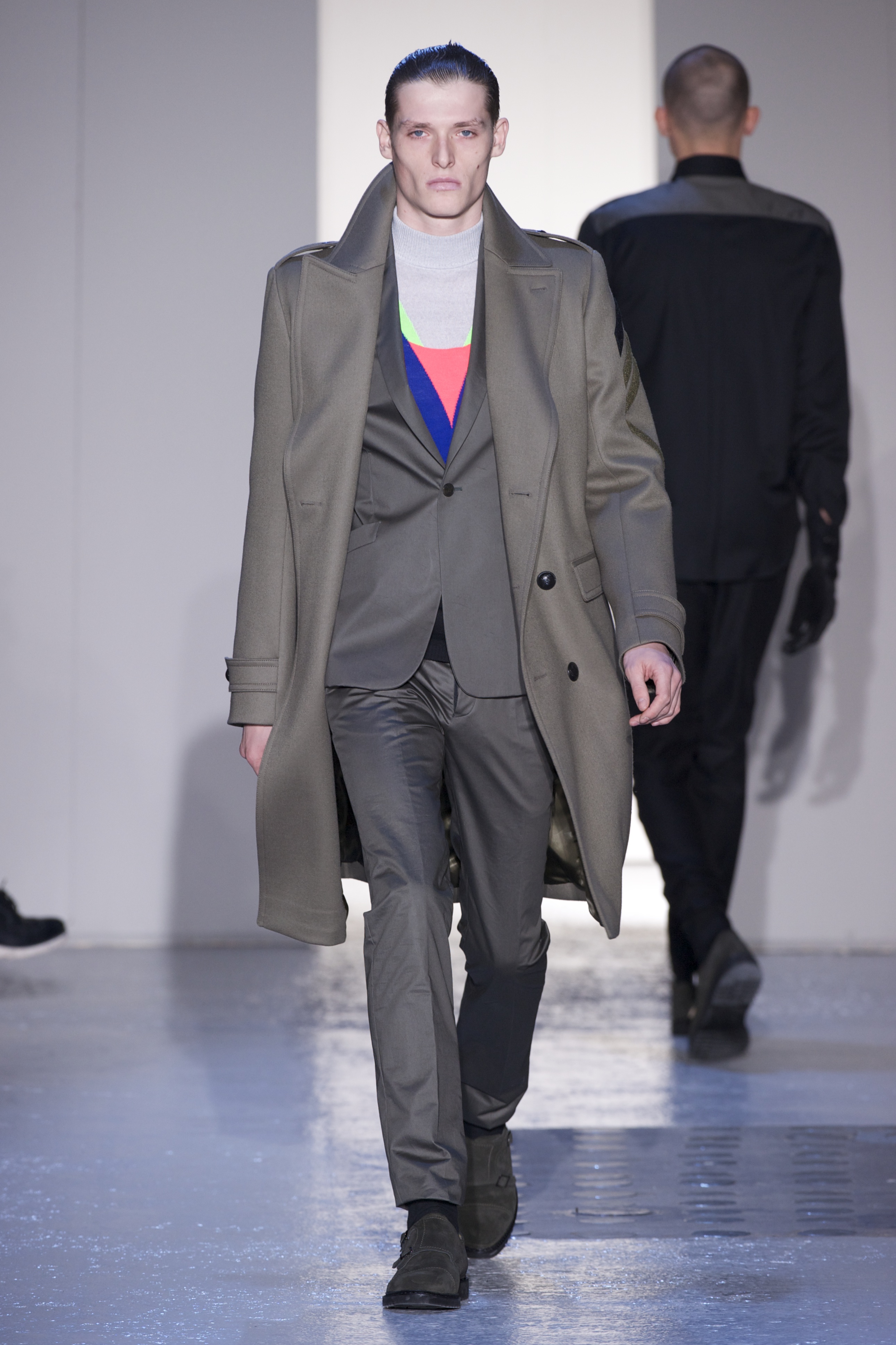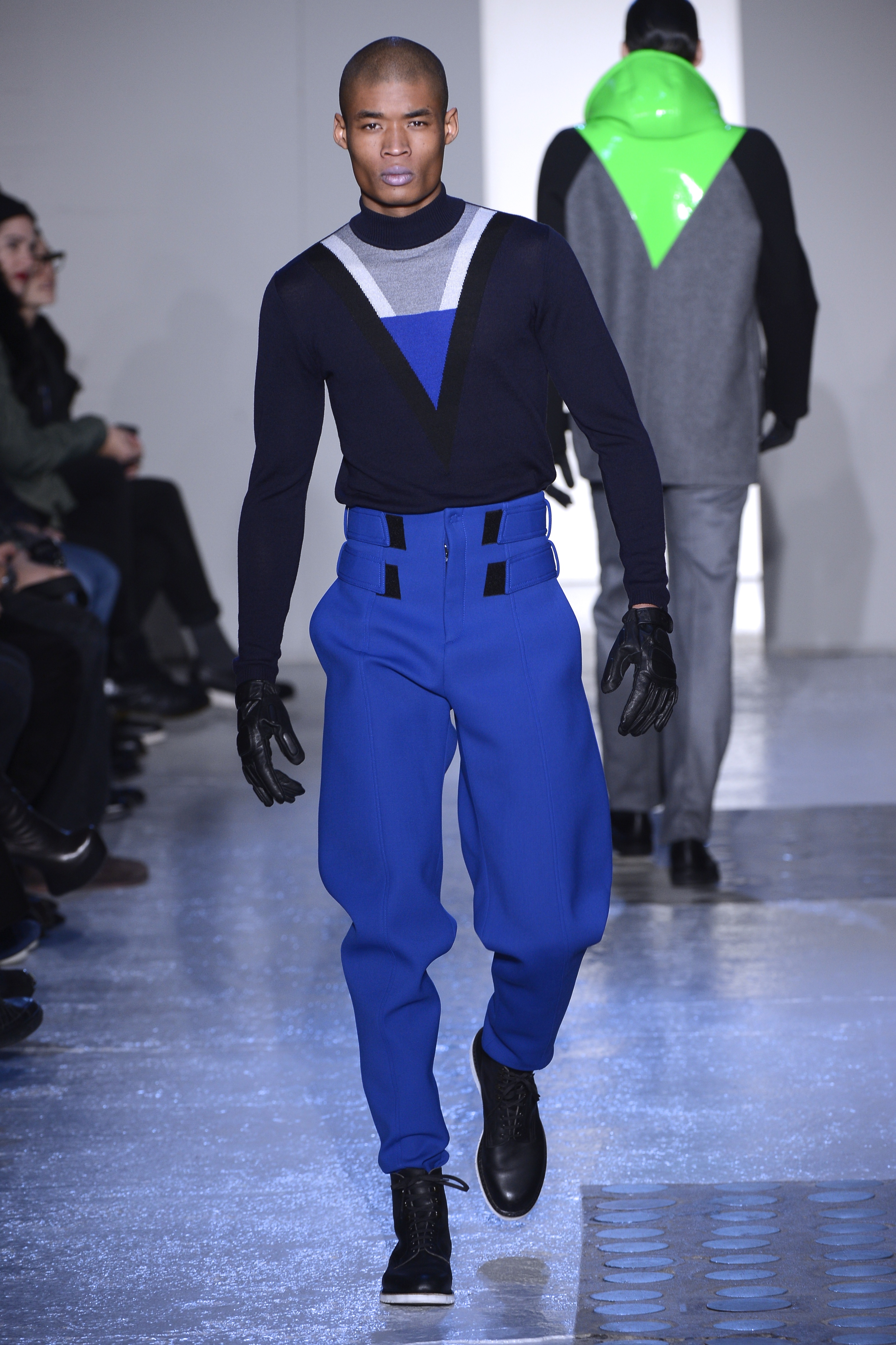 Gris et noir sont bien sur présents mais le créateur n’hésite pas a se diriger vers des teintes flashys, réminiscences de la période des fluo kids. Géométrie impeccable et looks pointus, ce sont des vêtements futuristes ou rétro-futuristes évoquant les tenues des militaires ou des astronautes. Les matières sont néanmoins douces et on n’assiste pas à une trop grande excentricité quand à leur choix. Les volumes, conséquents, mais toujours maîtrisés, confèrent un effet dramatique aux tenues.