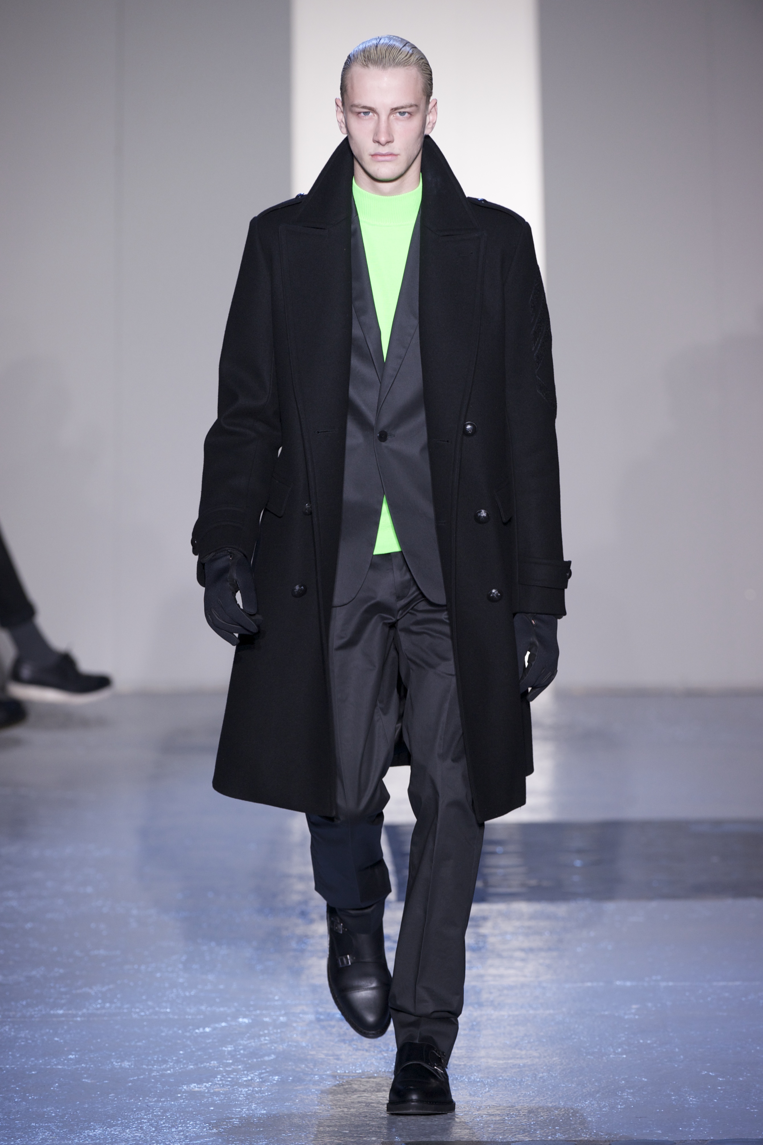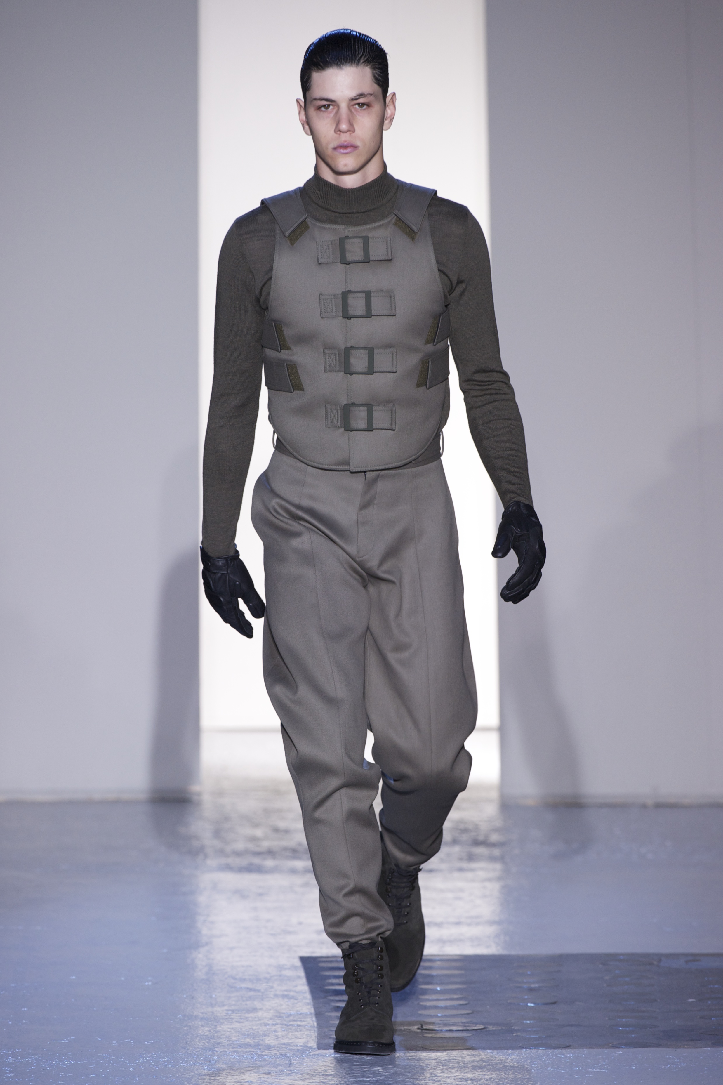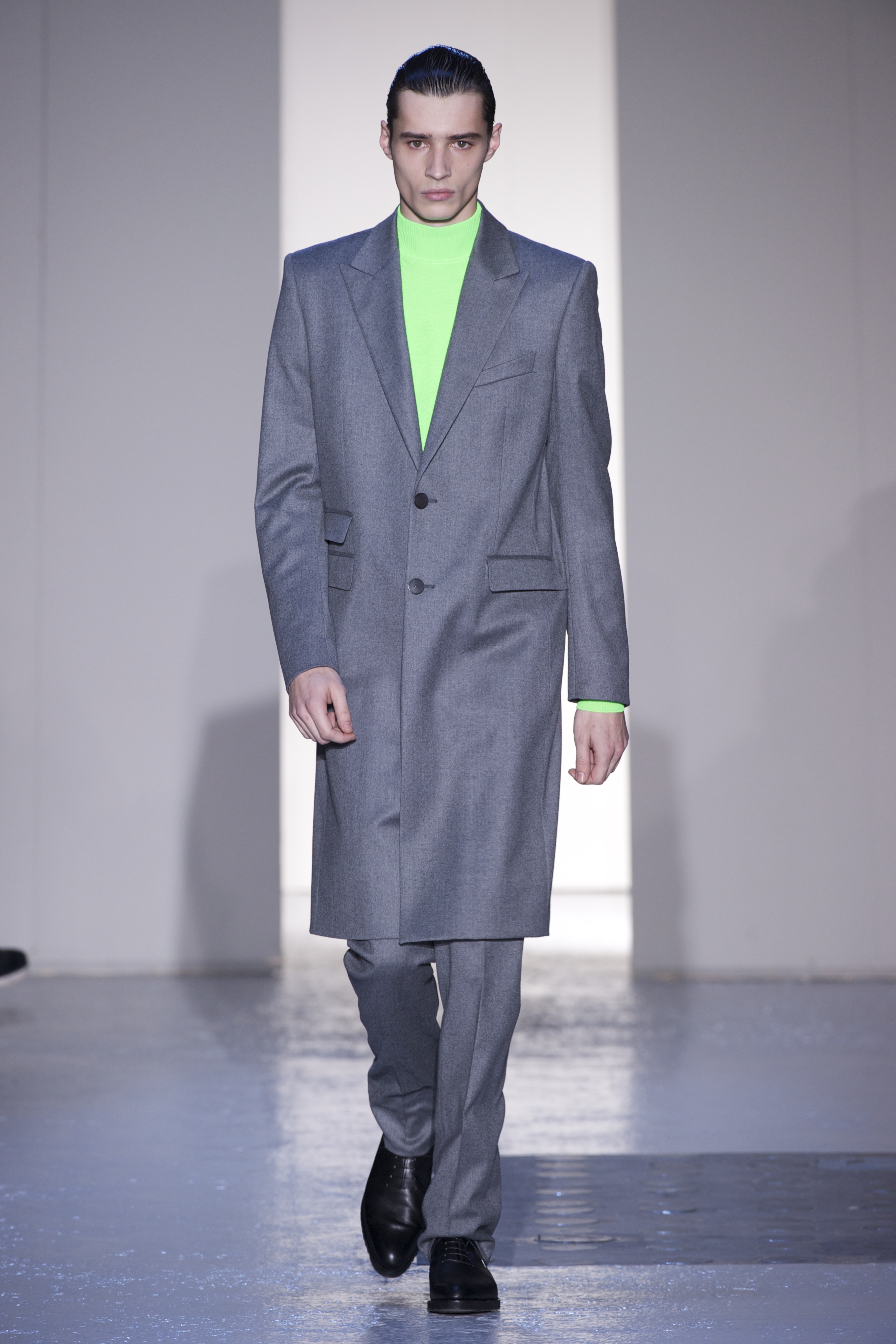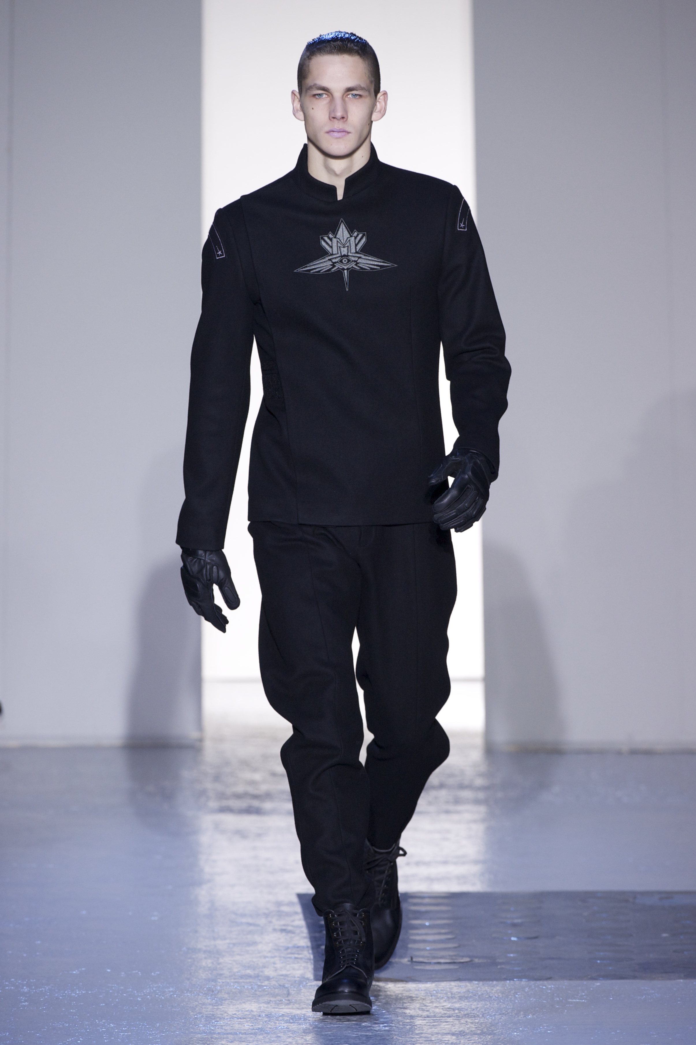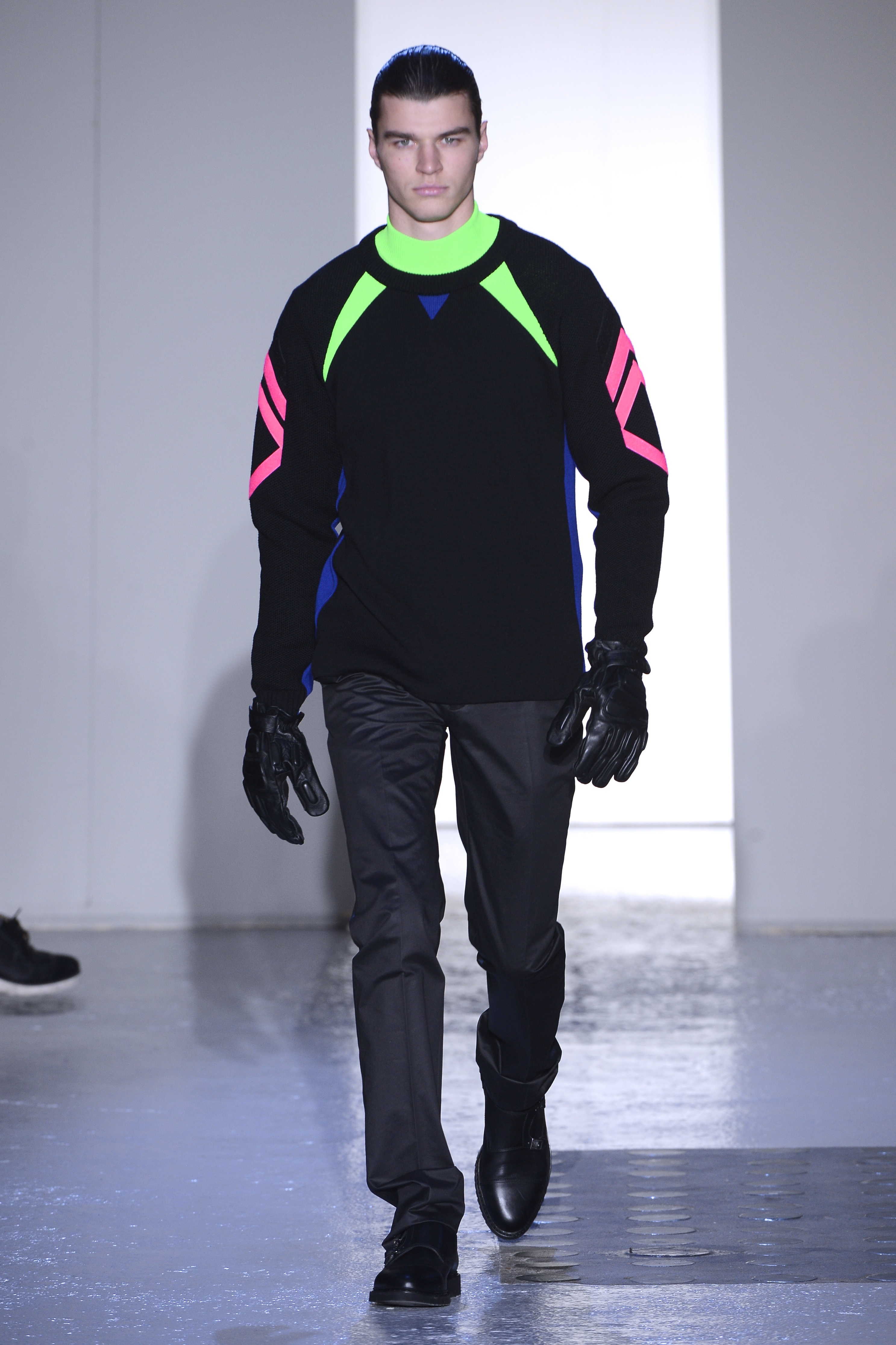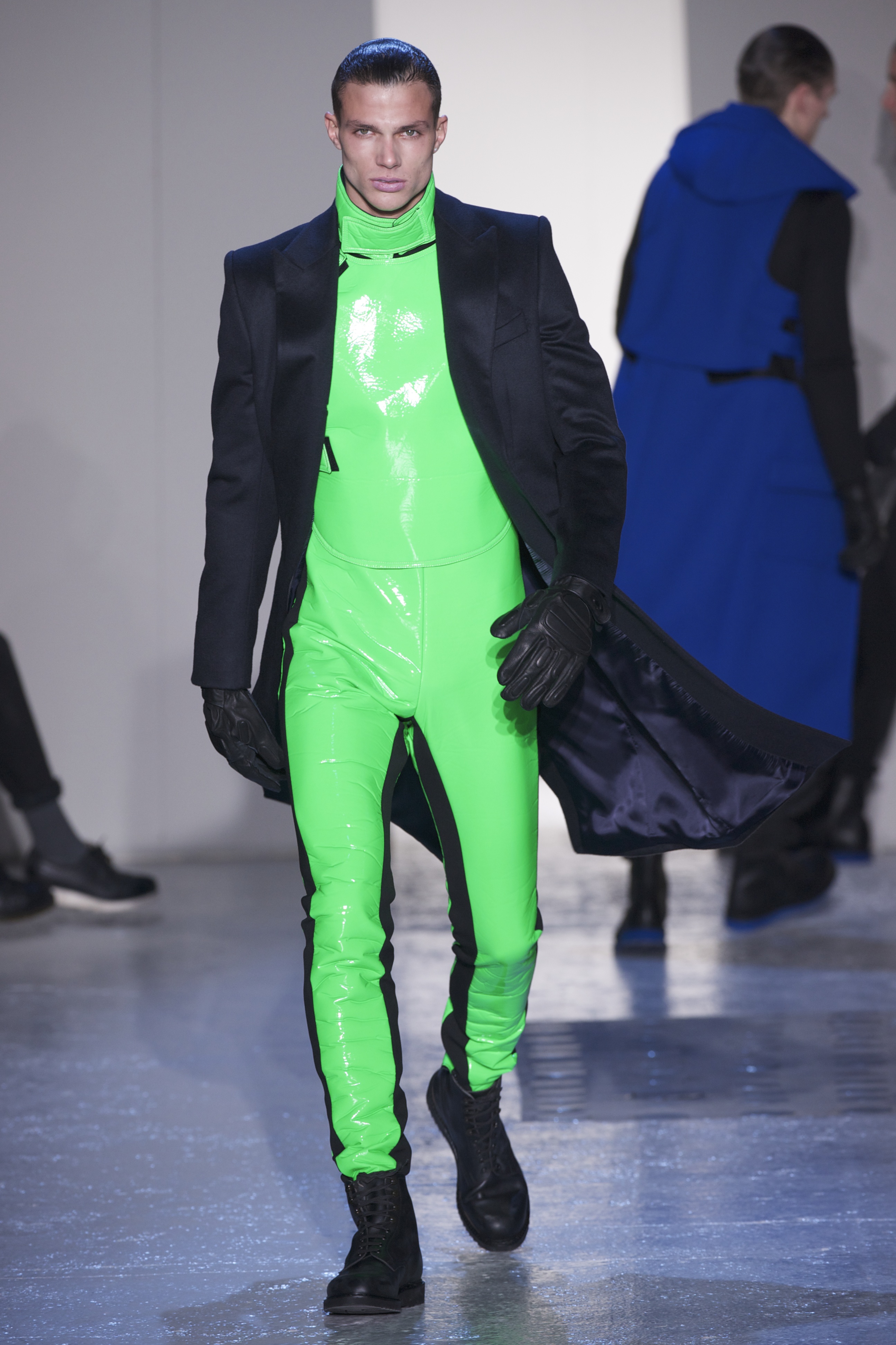 Gris et noir sont bien sur présents mais le créateur n’hésite pas a se diriger vers des teintes flashys, réminiscences de la période des fluo kids. Géométrie impeccable et looks pointus, ce sont des vêtements futuristes ou rétro-futuristes évoquant les tenues des militaires ou des astronautes. Les matières sont néanmoins douces et on n’assiste pas à une trop grande excentricité quand à leur choix. Les volumes, conséquents, mais toujours maîtrisés, confèrent un effet dramatique aux tenues.