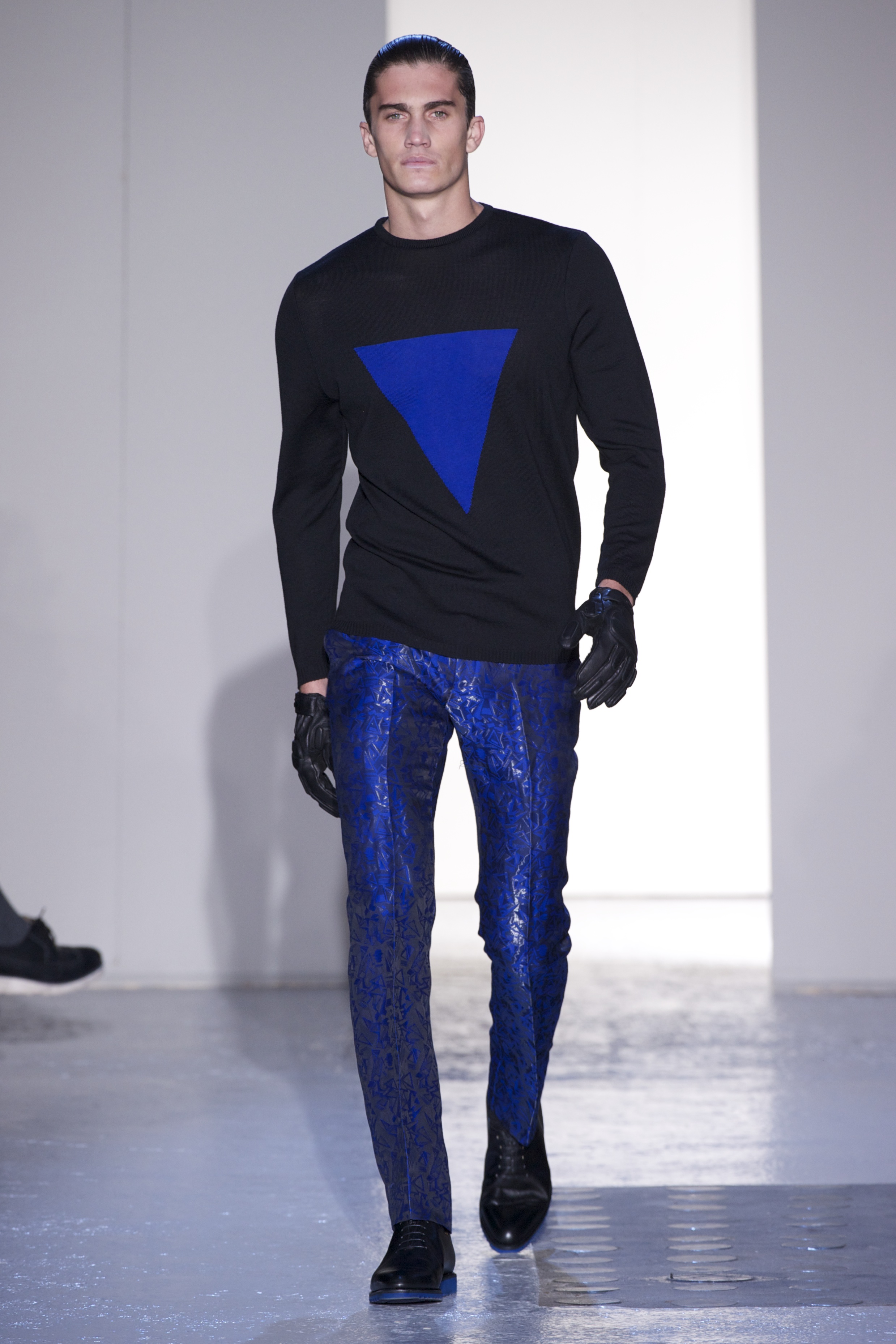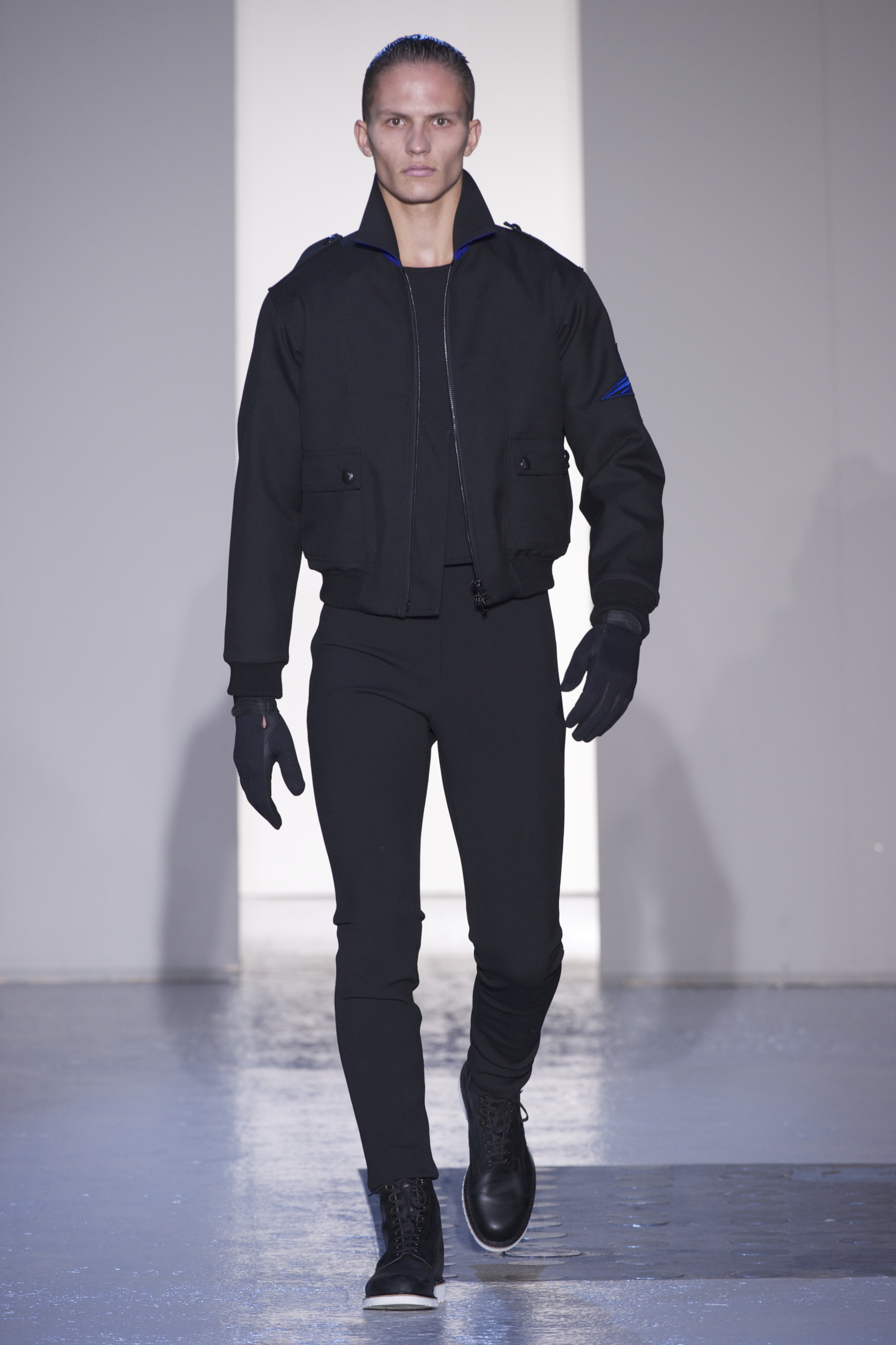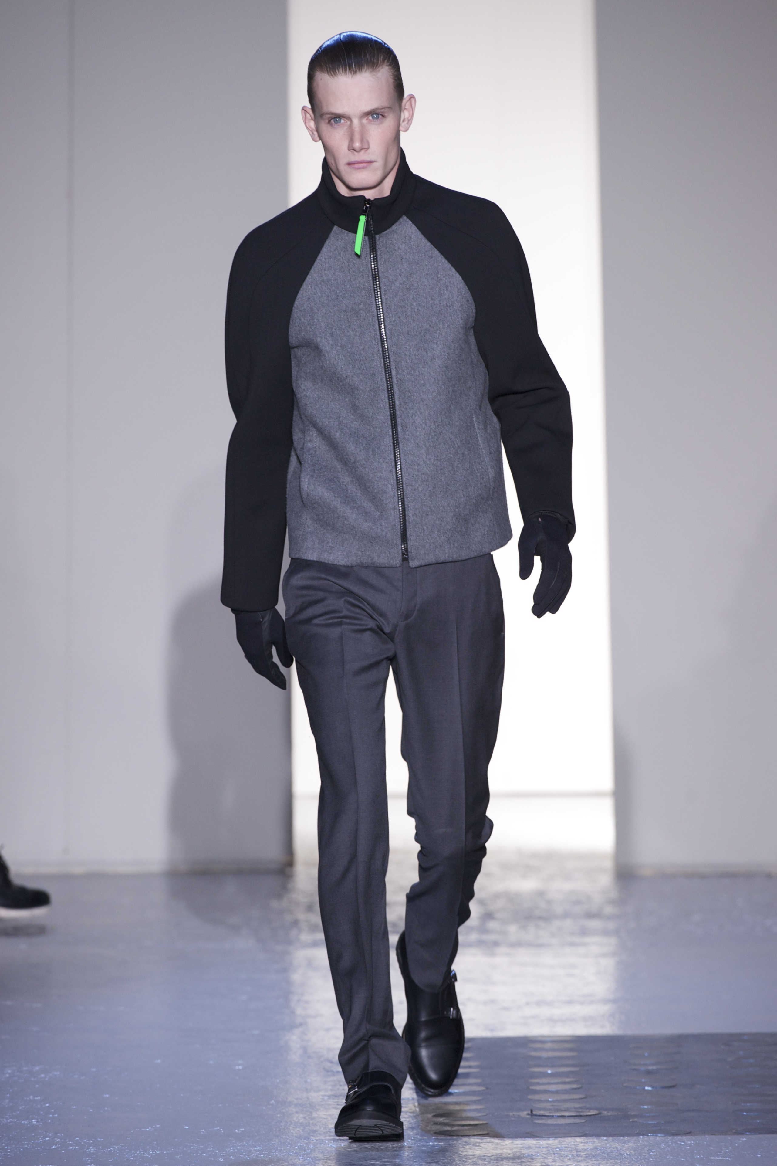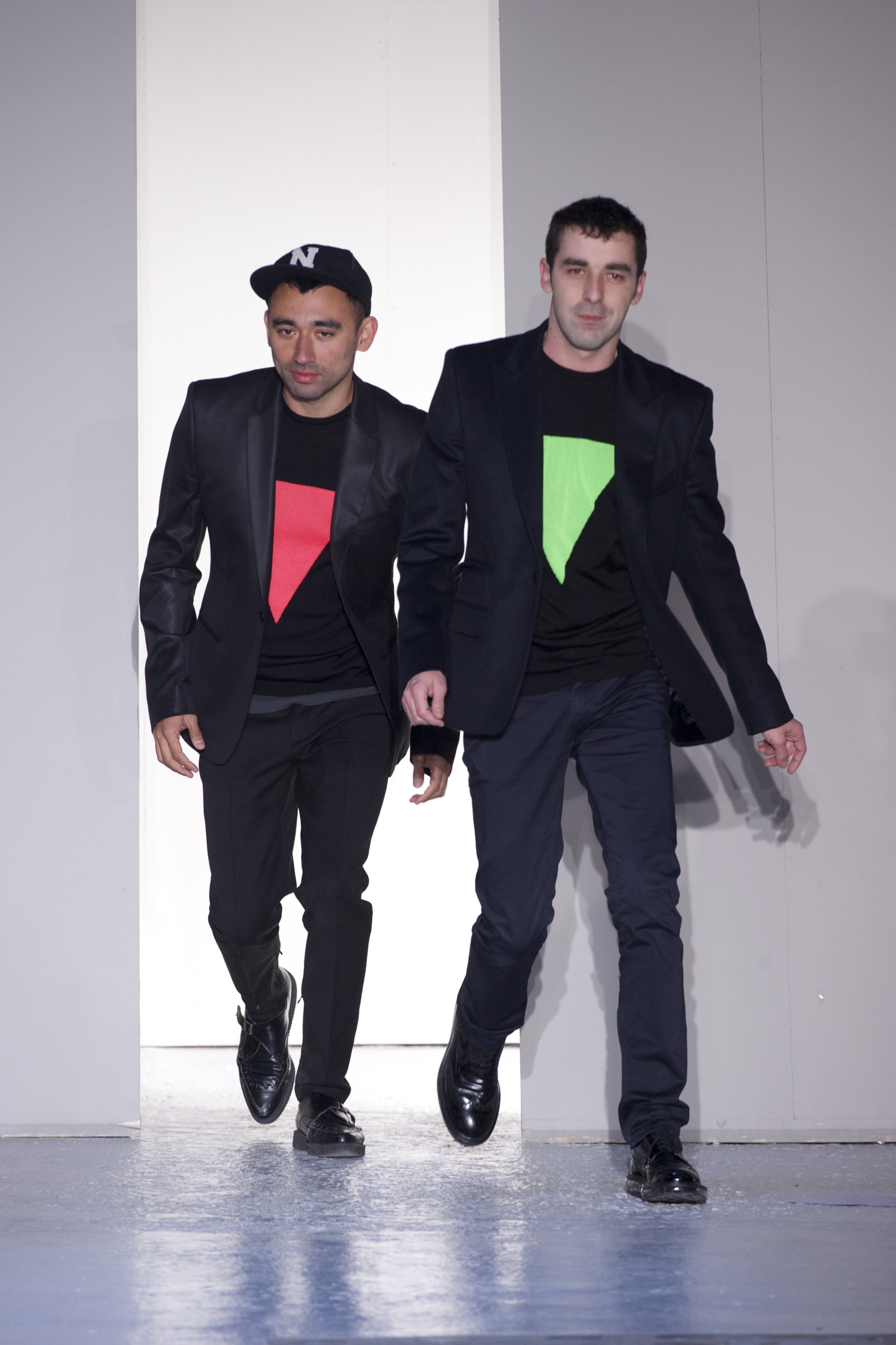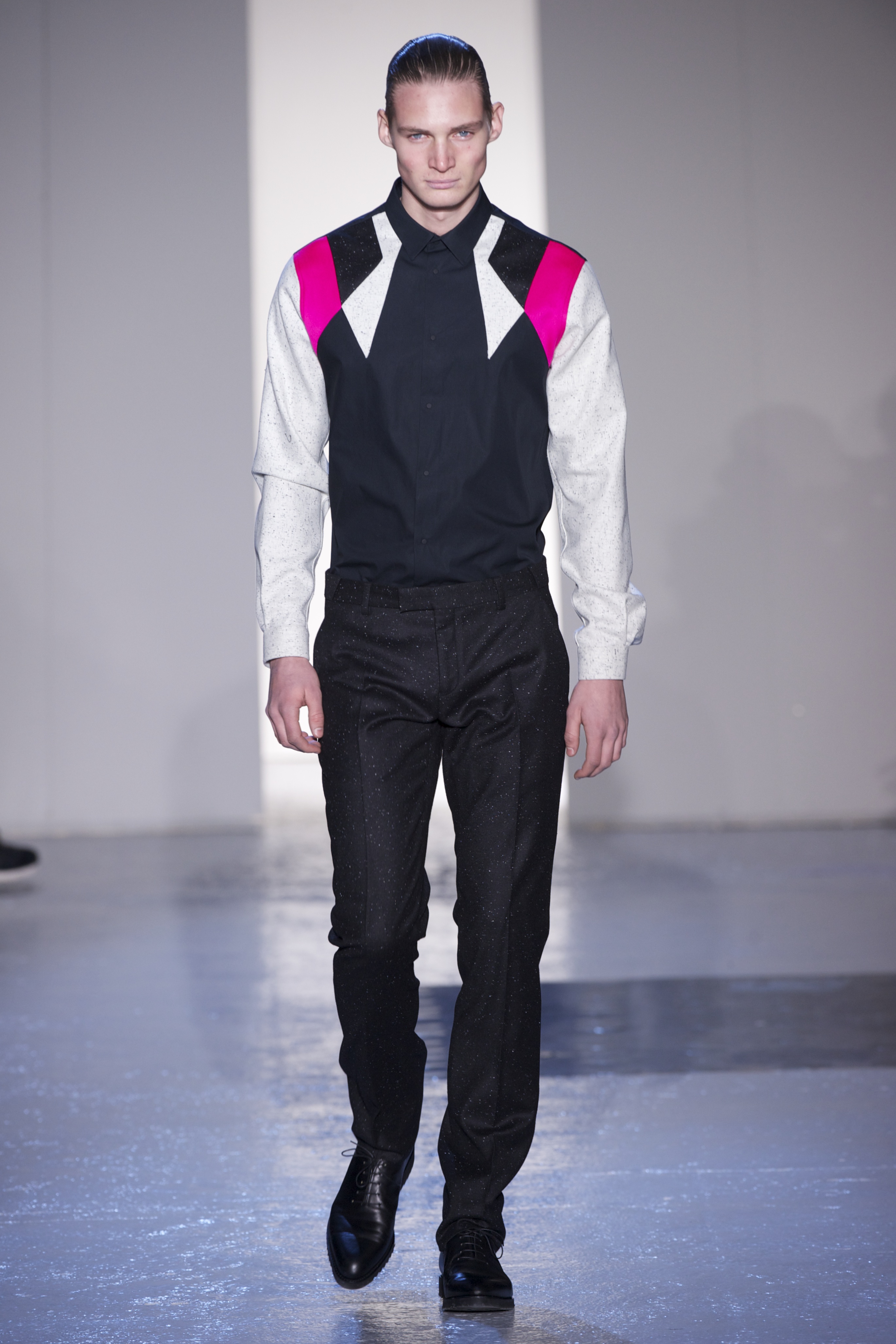 Gris et noir sont bien sur présents mais le créateur n’hésite pas a se diriger vers des teintes flashys, réminiscences de la période des fluo kids. Géométrie impeccable et looks pointus, ce sont des vêtements futuristes ou rétro-futuristes évoquant les tenues des militaires ou des astronautes. Les matières sont néanmoins douces et on n’assiste pas à une trop grande excentricité quand à leur choix. Les volumes, conséquents, mais toujours maîtrisés, confèrent un effet dramatique aux tenues.