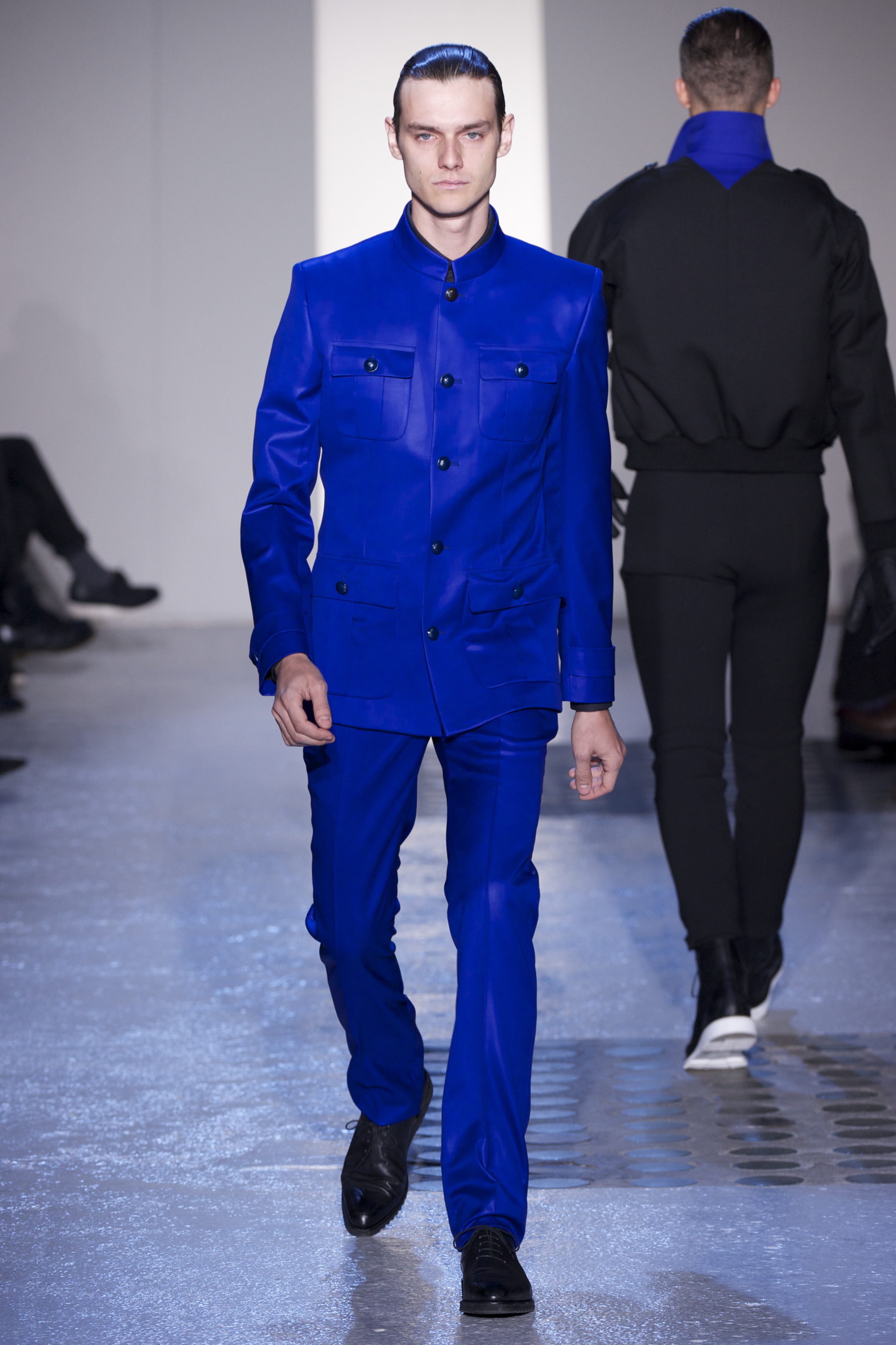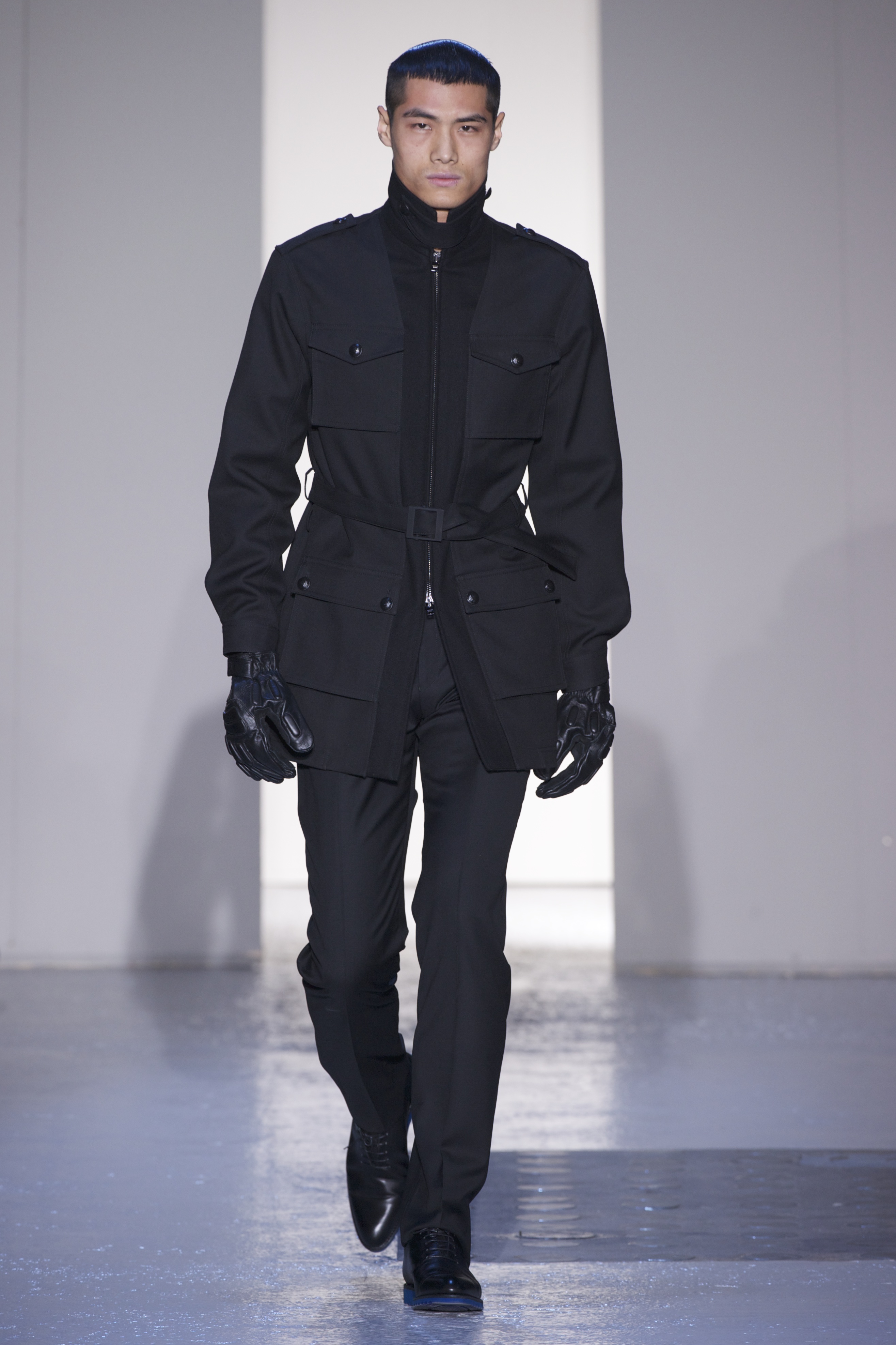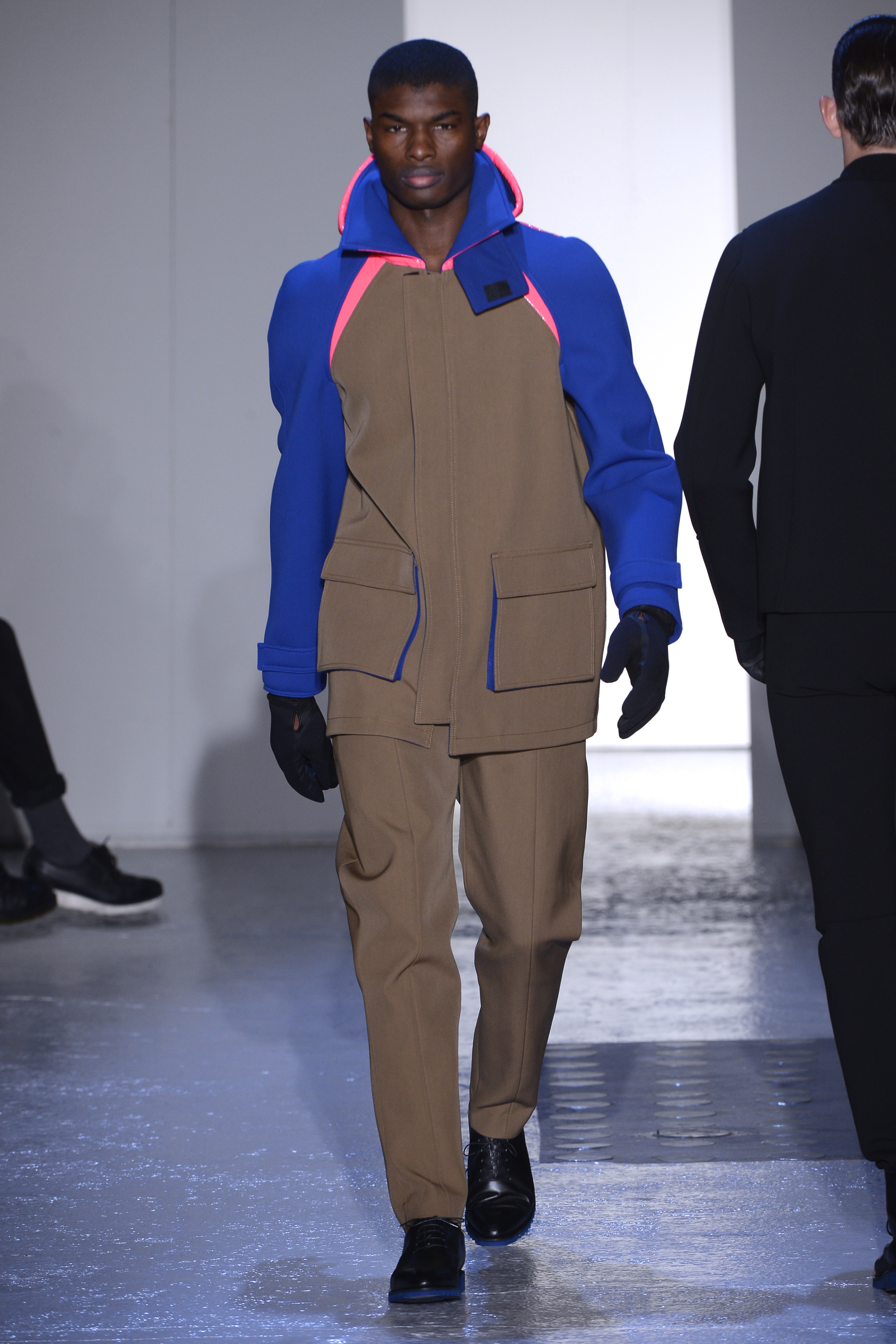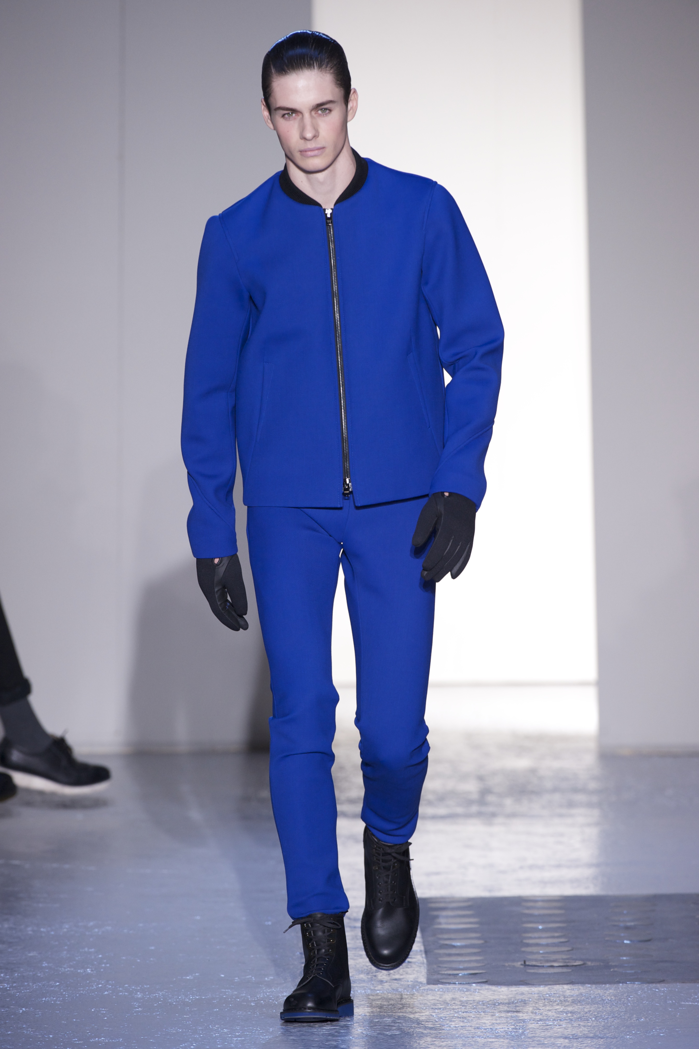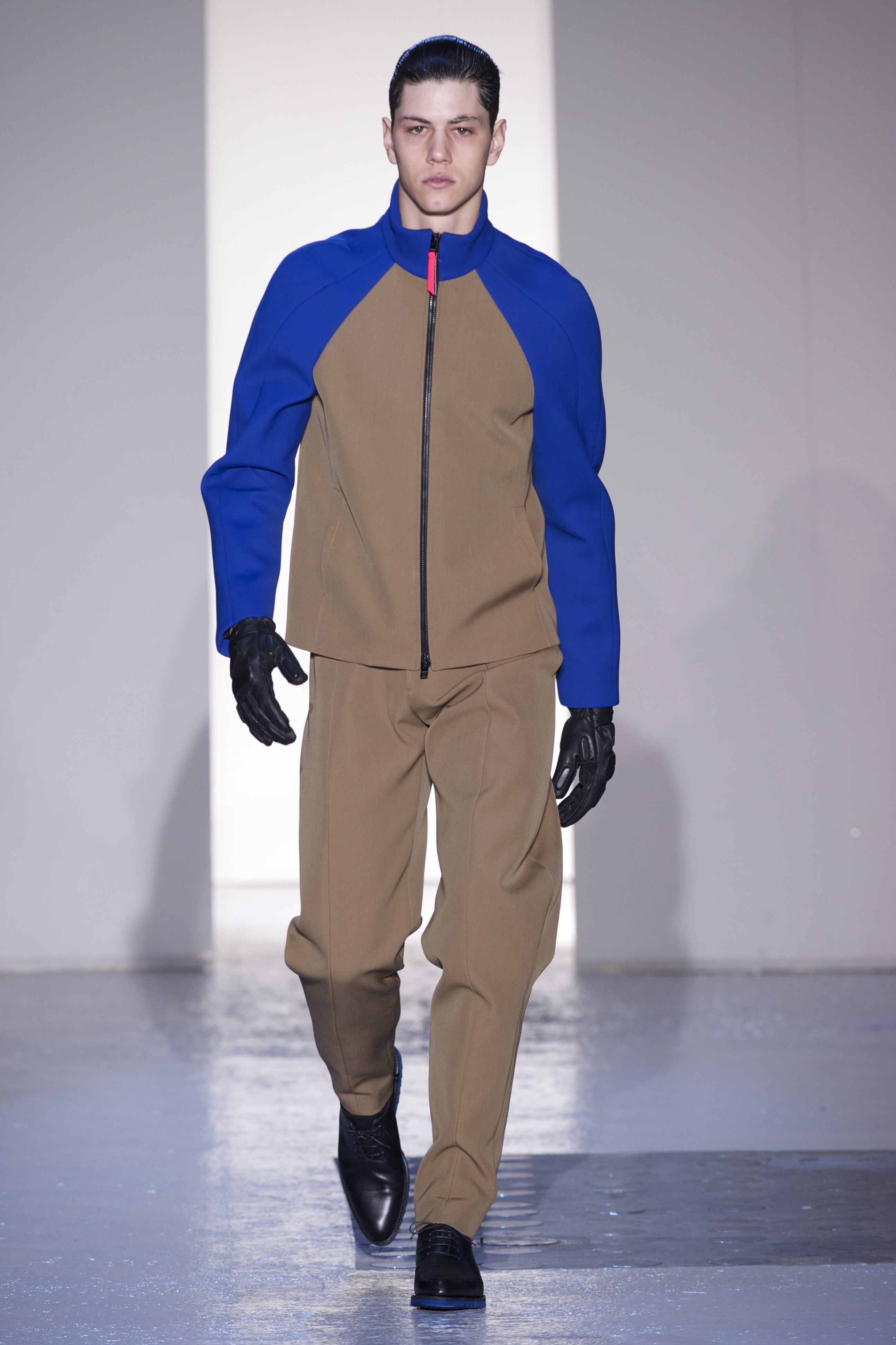 Gris et noir sont bien sur présents mais le créateur n’hésite pas a se diriger vers des teintes flashys, réminiscences de la période des fluo kids. Géométrie impeccable et looks pointus, ce sont des vêtements futuristes ou rétro-futuristes évoquant les tenues des militaires ou des astronautes. Les matières sont néanmoins douces et on n’assiste pas à une trop grande excentricité quand à leur choix. Les volumes, conséquents, mais toujours maîtrisés, confèrent un effet dramatique aux tenues.