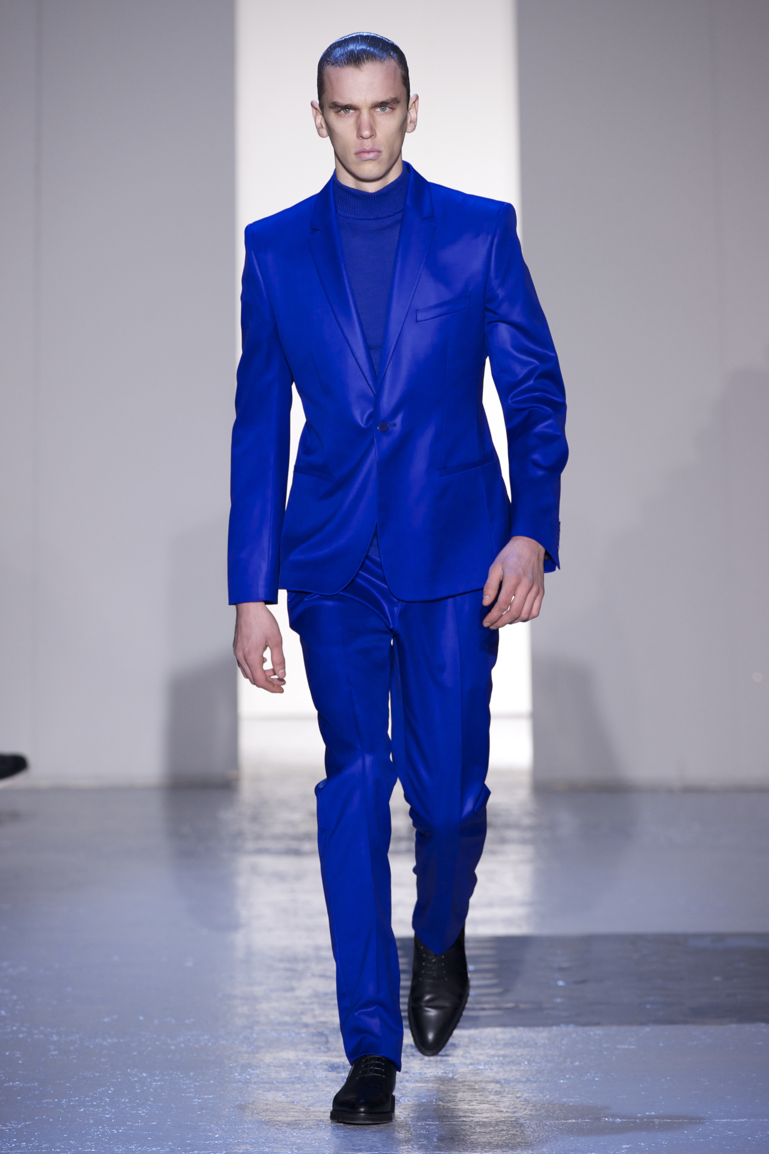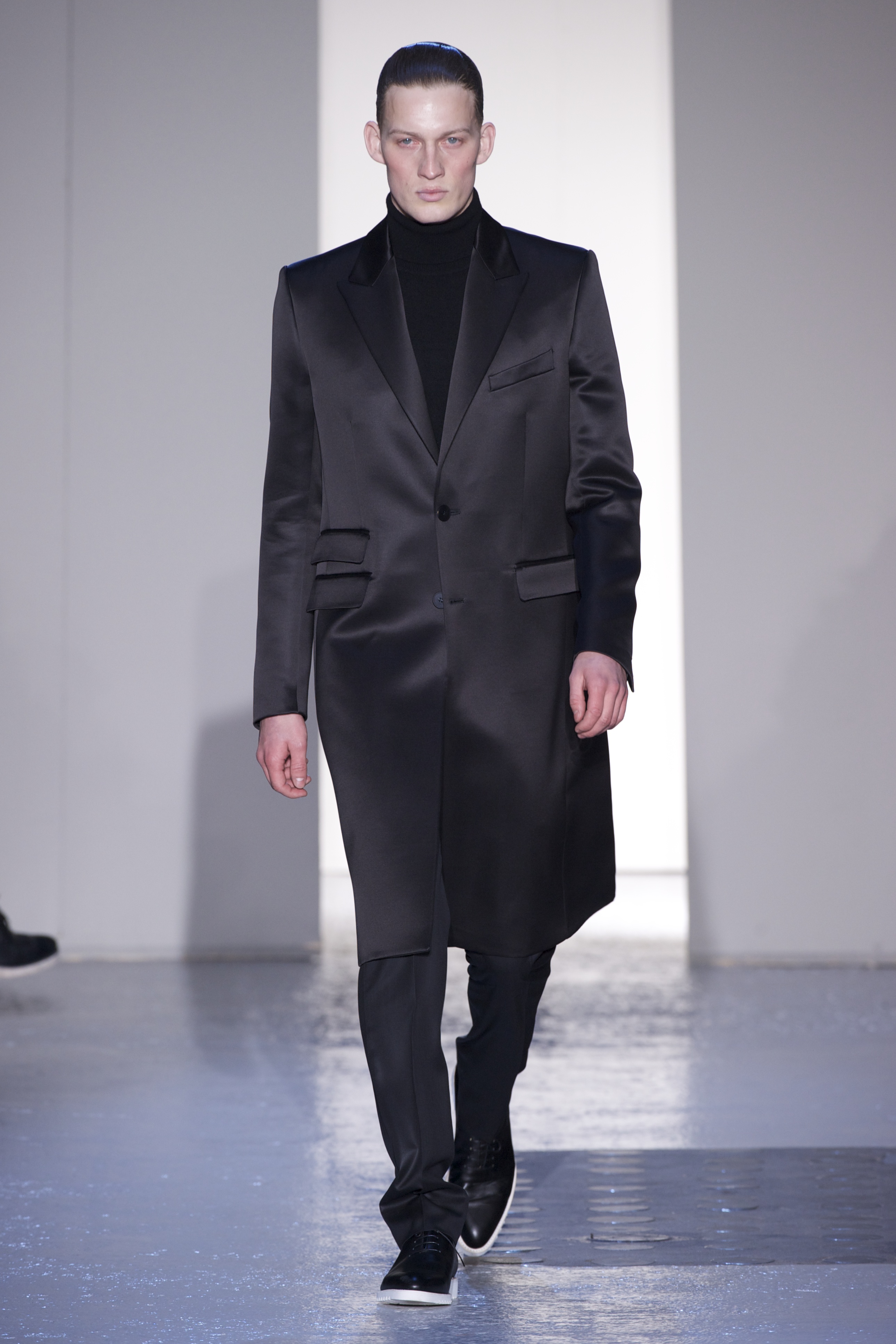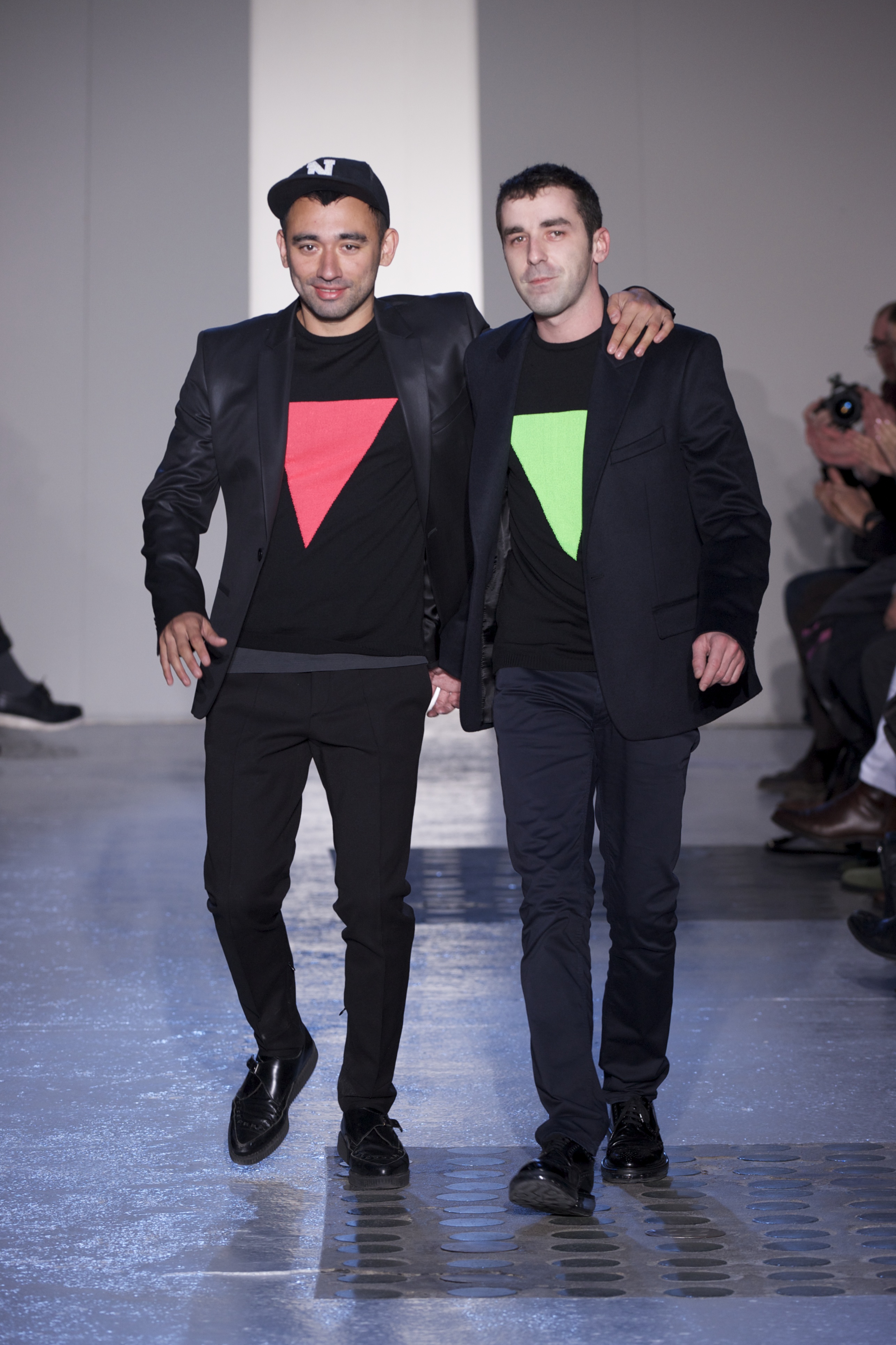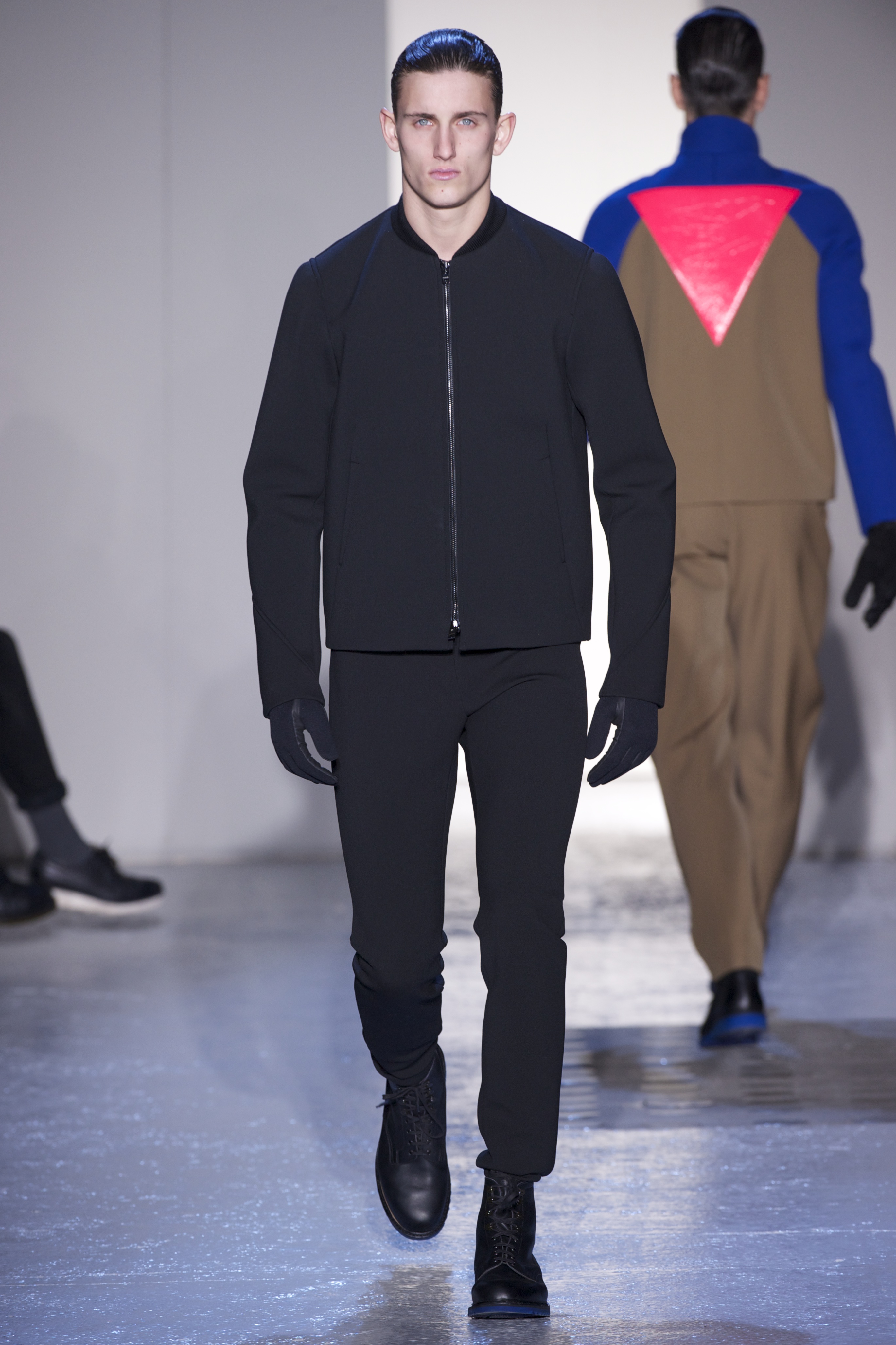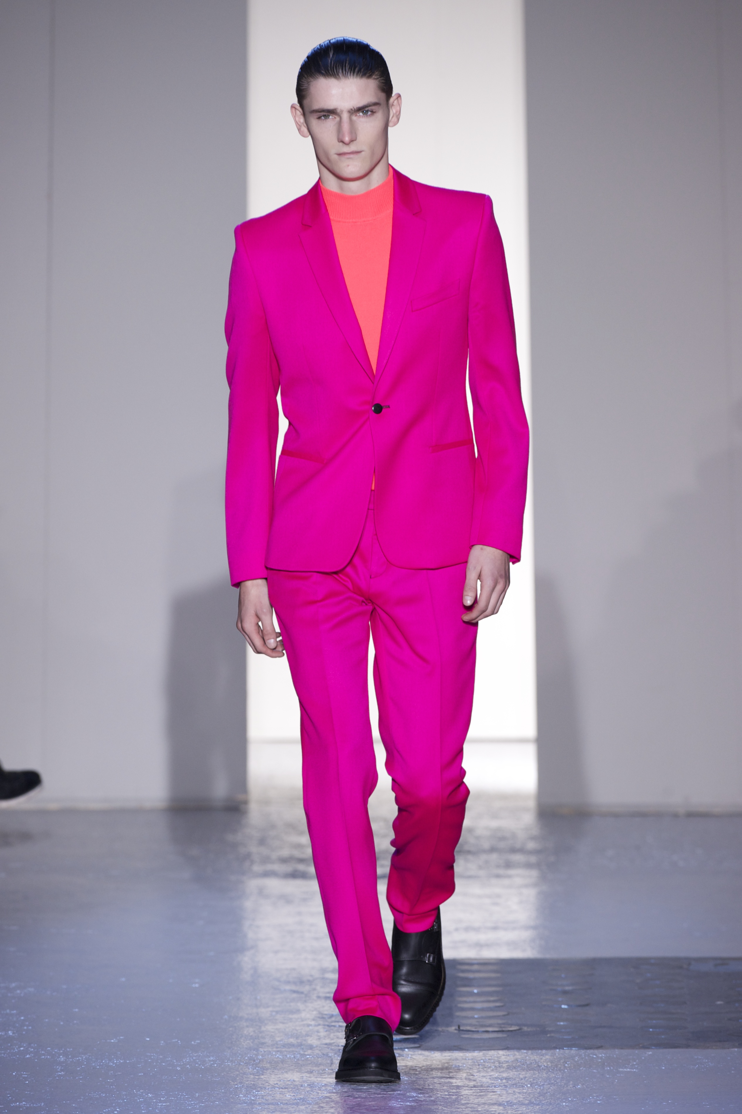 Gris et noir sont bien sur présents mais le créateur n’hésite pas a se diriger vers des teintes flashys, réminiscences de la période des fluo kids. Géométrie impeccable et looks pointus, ce sont des vêtements futuristes ou rétro-futuristes évoquant les tenues des militaires ou des astronautes. Les matières sont néanmoins douces et on n’assiste pas à une trop grande excentricité quand à leur choix. Les volumes, conséquents, mais toujours maîtrisés, confèrent un effet dramatique aux tenues.