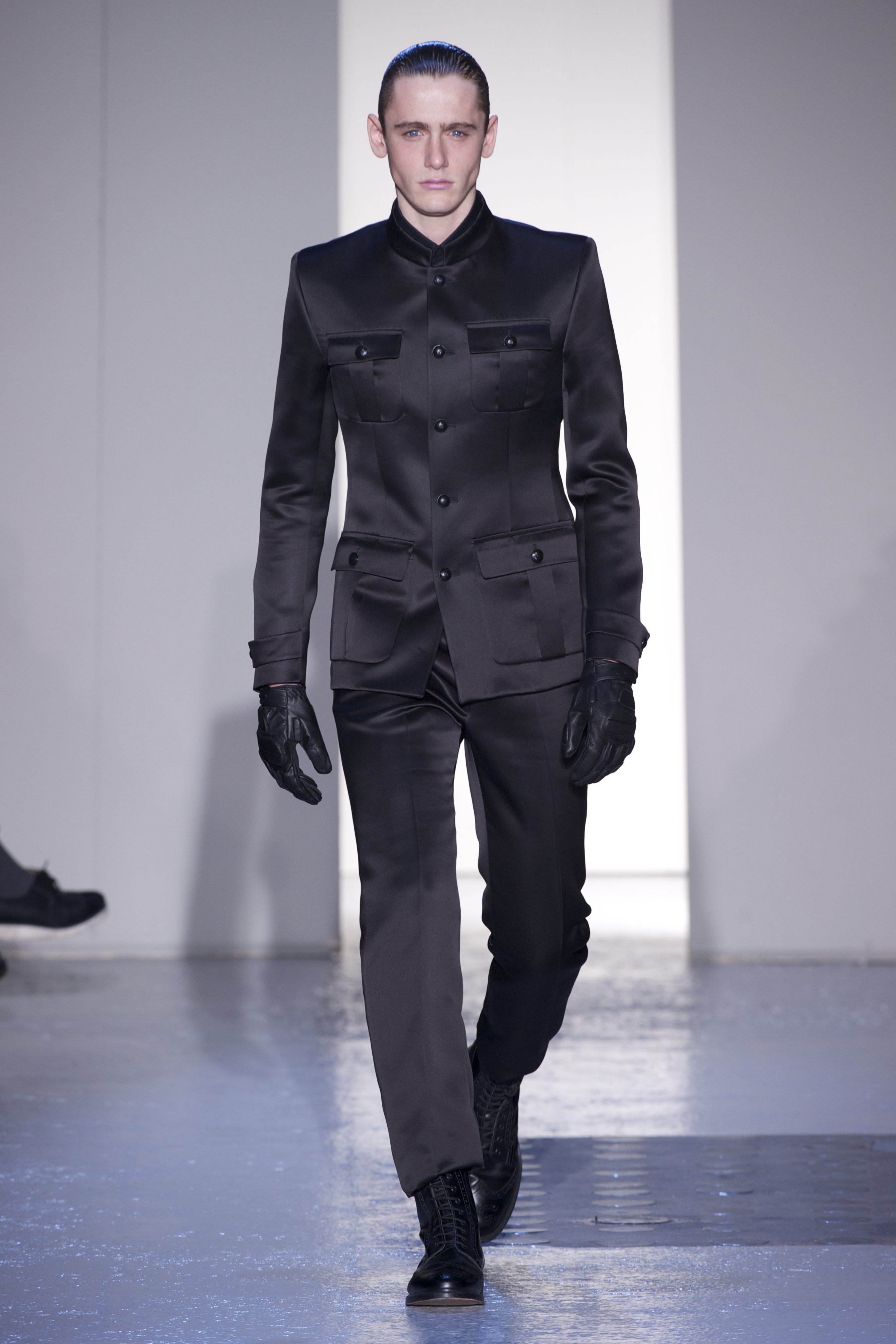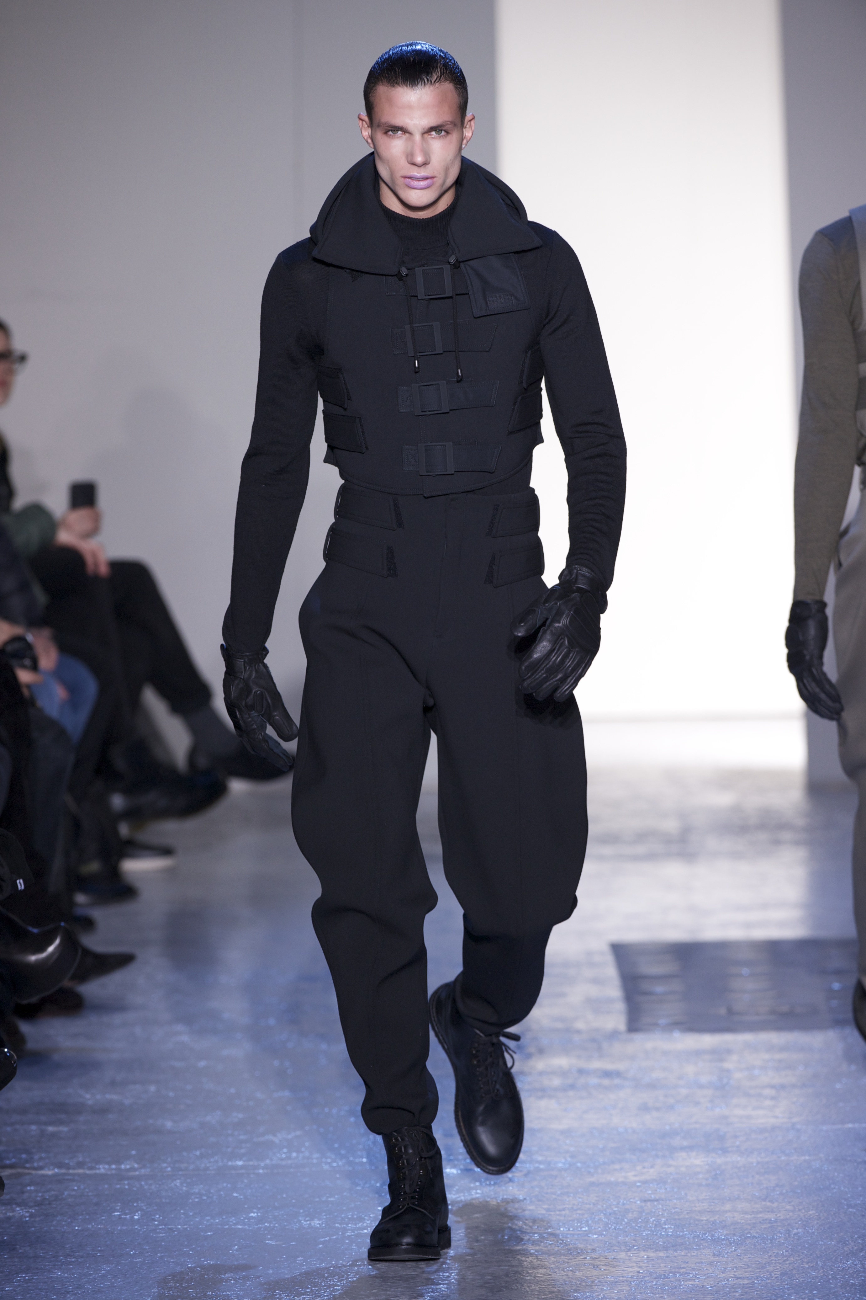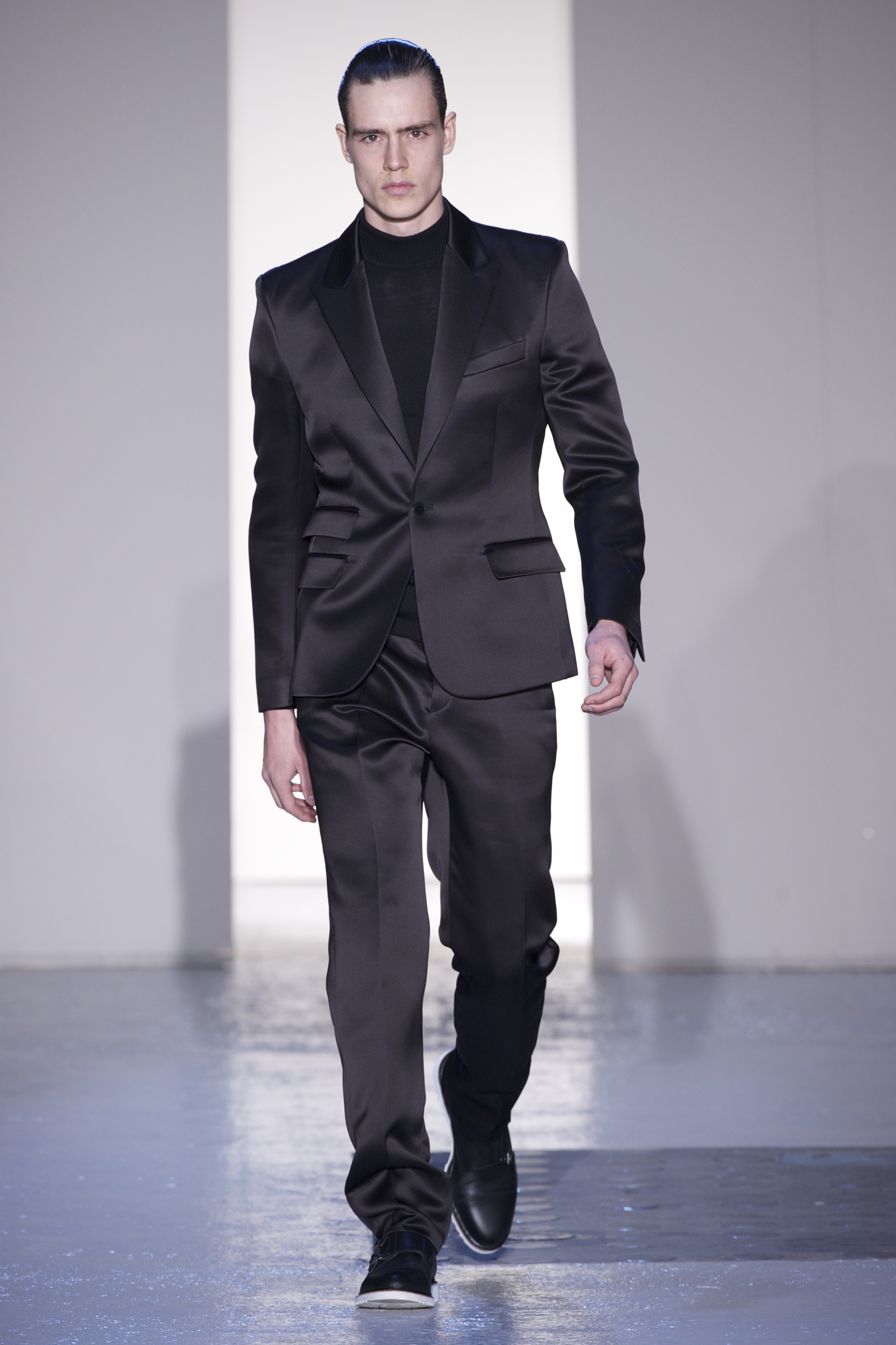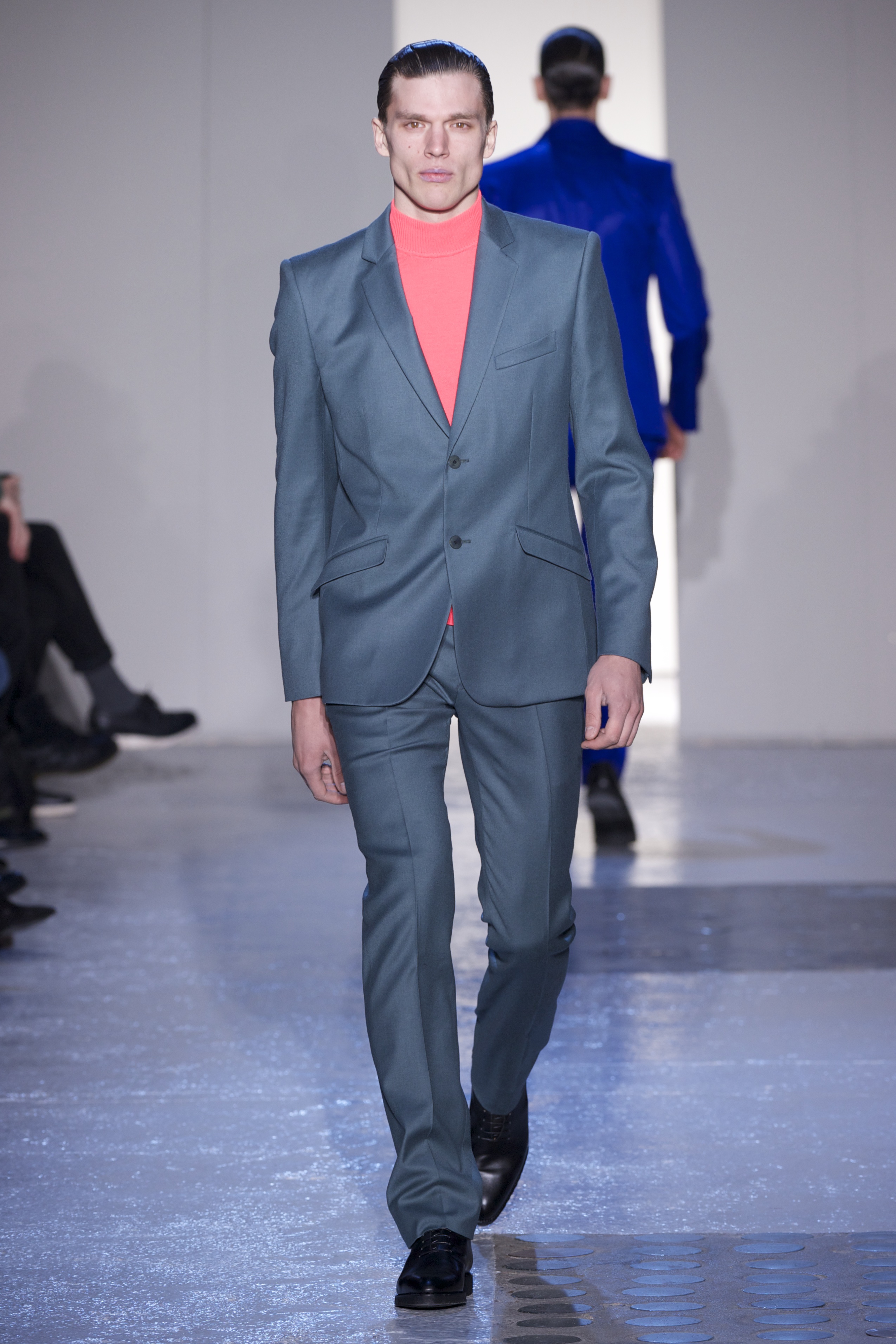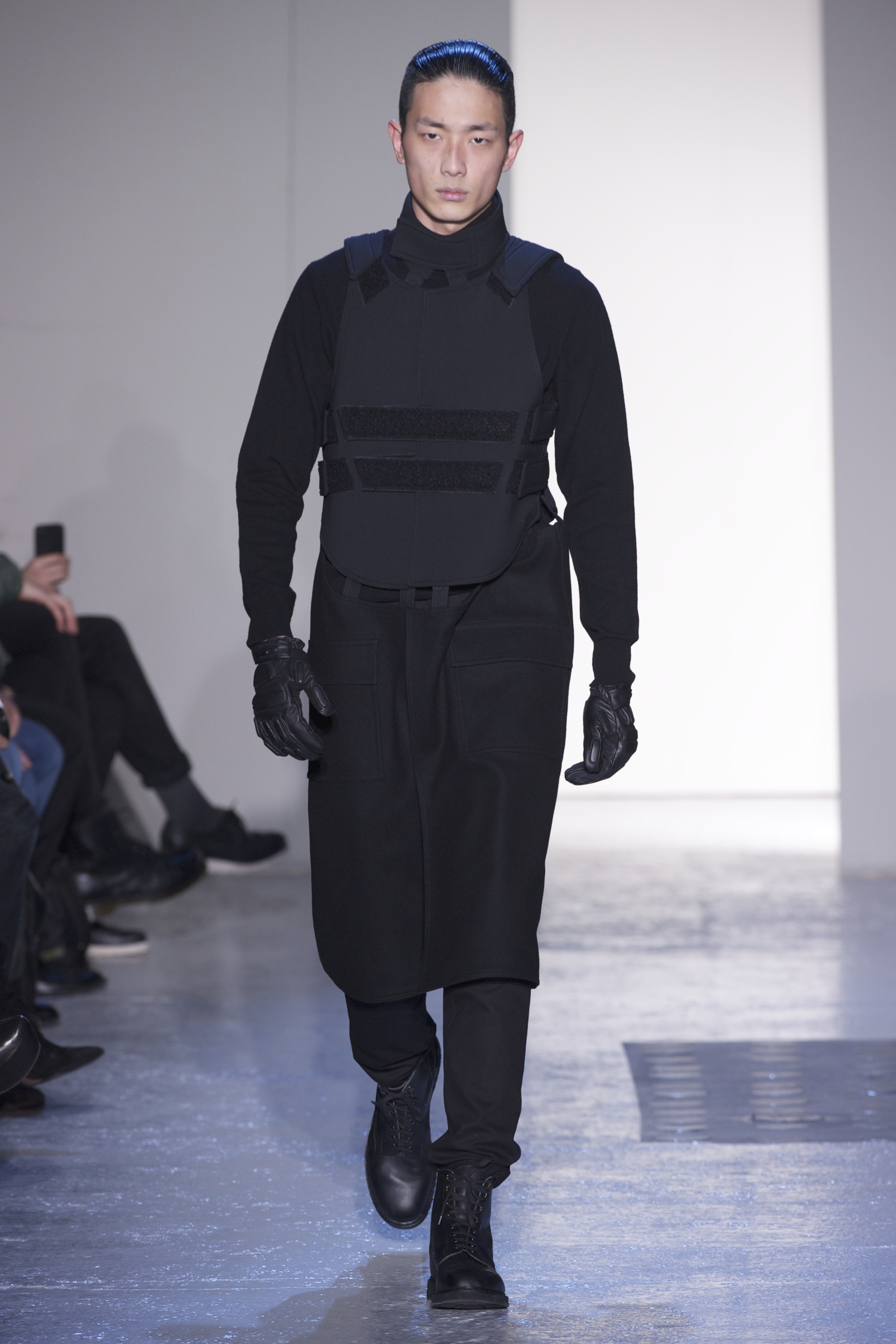 Gris et noir sont bien sur présents mais le créateur n’hésite pas a se diriger vers des teintes flashys, réminiscences de la période des fluo kids. Géométrie impeccable et looks pointus, ce sont des vêtements futuristes ou rétro-futuristes évoquant les tenues des militaires ou des astronautes. Les matières sont néanmoins douces et on n’assiste pas à une trop grande excentricité quand à leur choix. Les volumes, conséquents, mais toujours maîtrisés, confèrent un effet dramatique aux tenues.