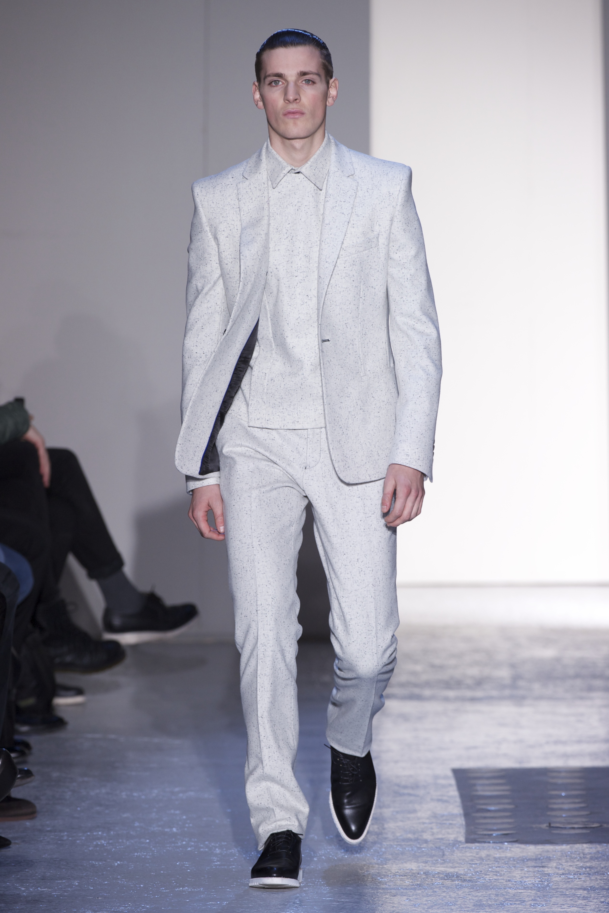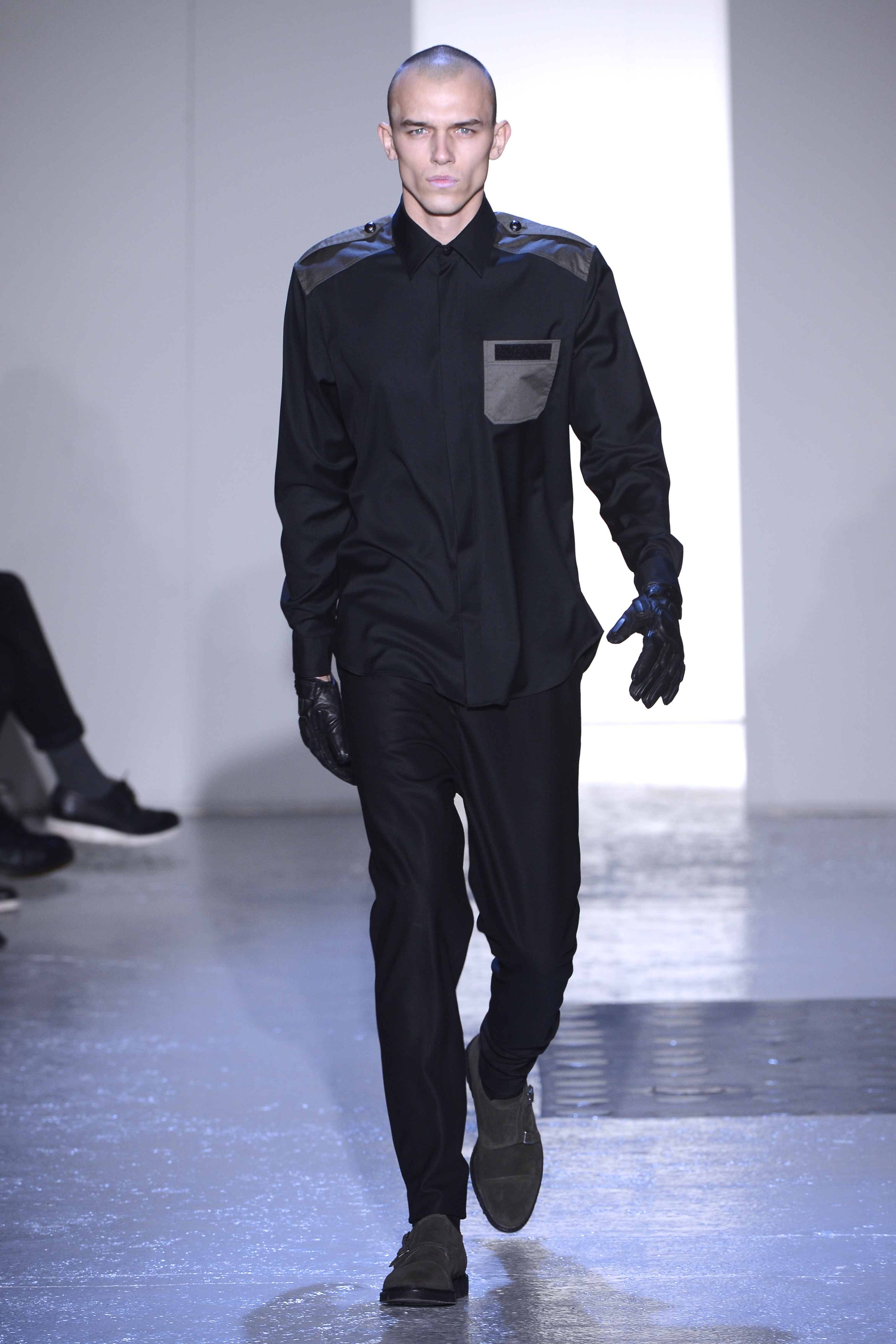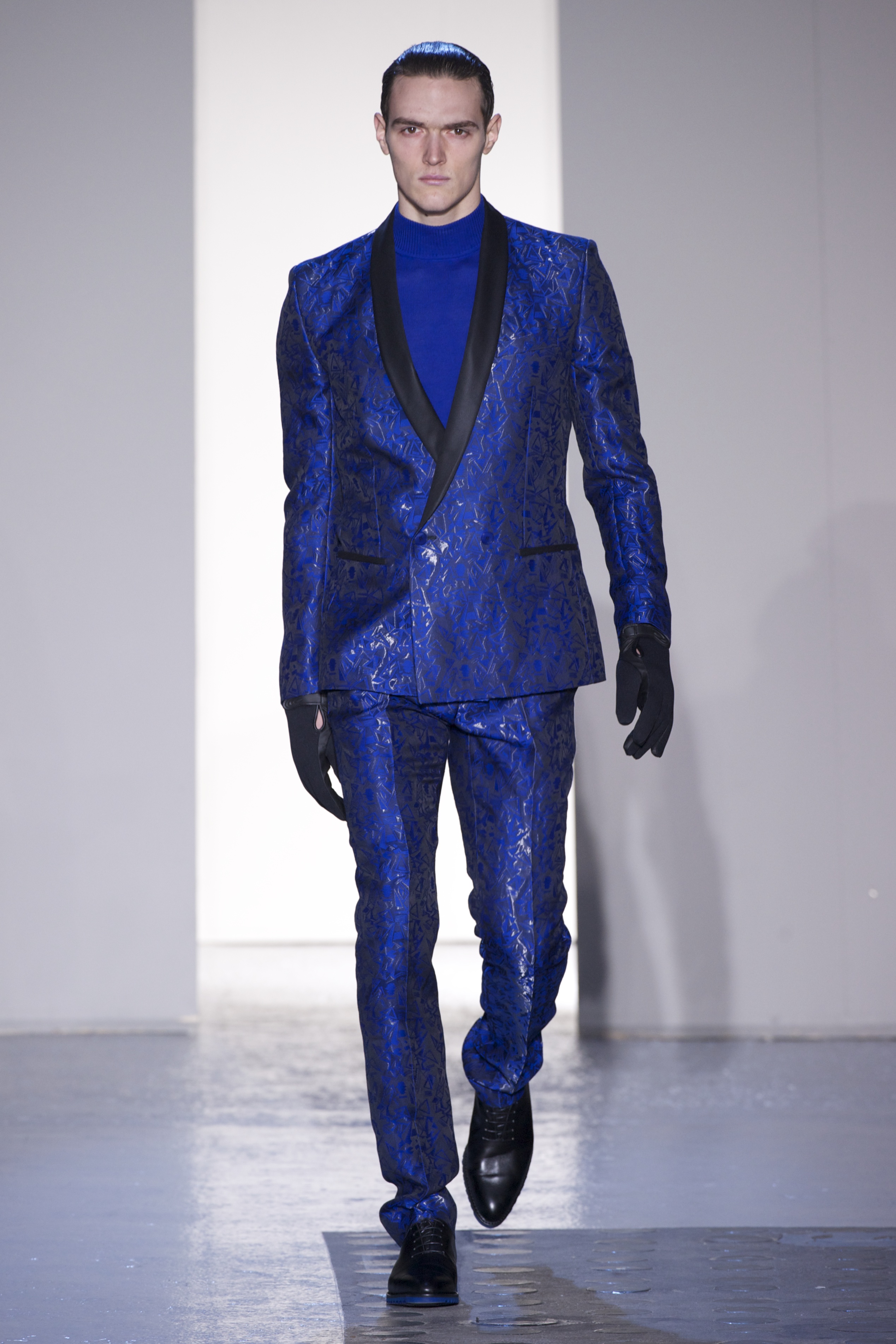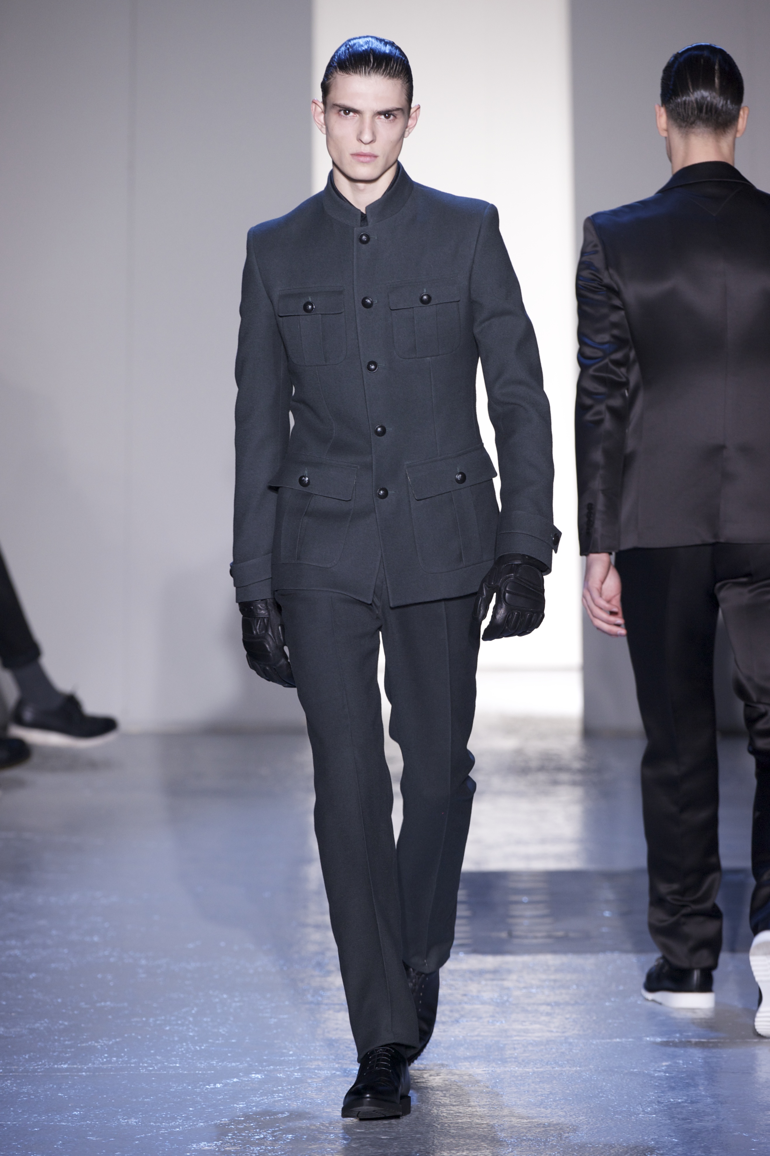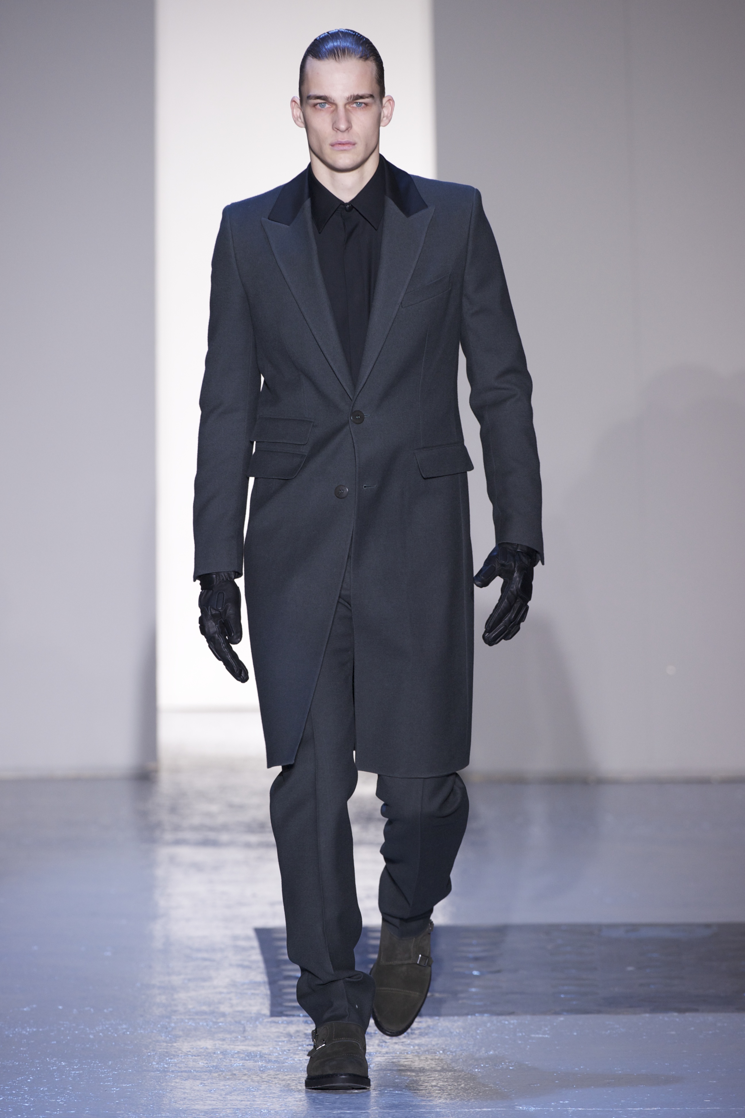 Gris et noir sont bien sur présents mais le créateur n’hésite pas a se diriger vers des teintes flashys, réminiscences de la période des fluo kids. Géométrie impeccable et looks pointus, ce sont des vêtements futuristes ou rétro-futuristes évoquant les tenues des militaires ou des astronautes. Les matières sont néanmoins douces et on n’assiste pas à une trop grande excentricité quand à leur choix. Les volumes, conséquents, mais toujours maîtrisés, confèrent un effet dramatique aux tenues.