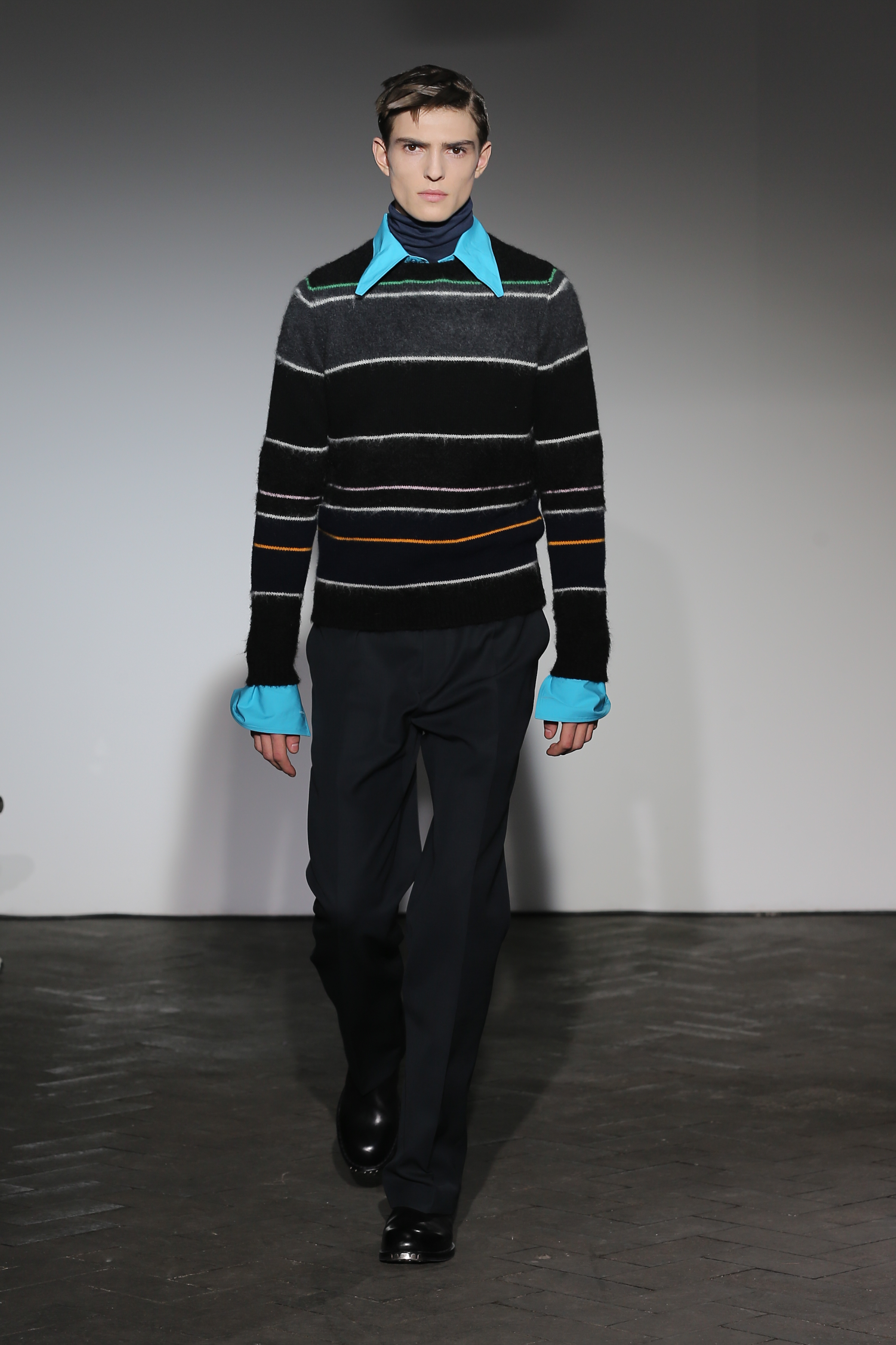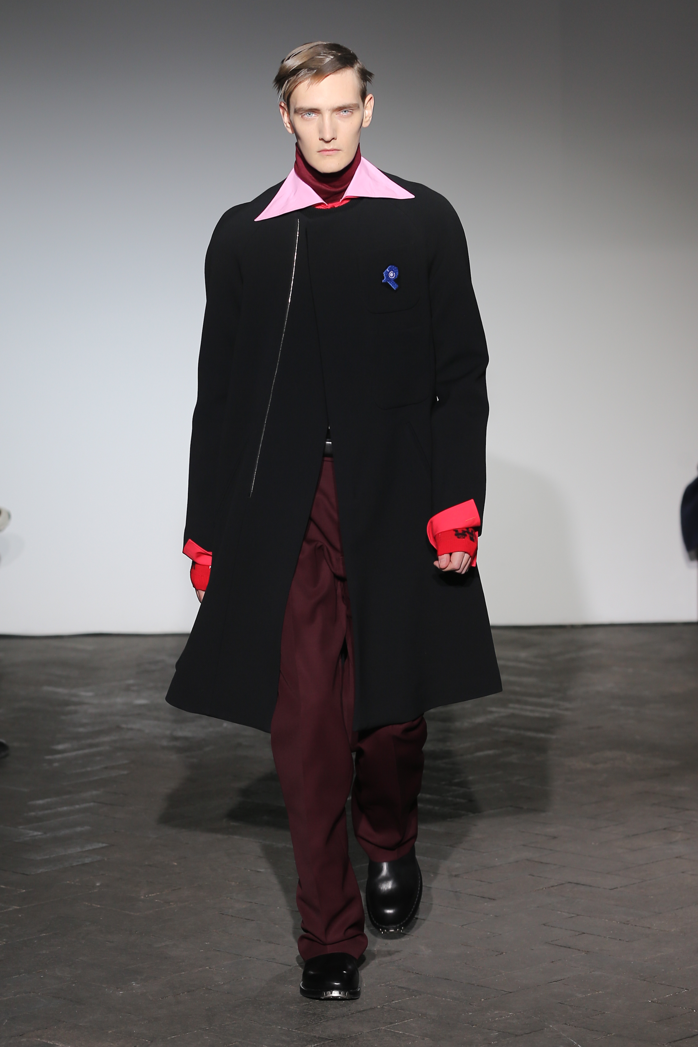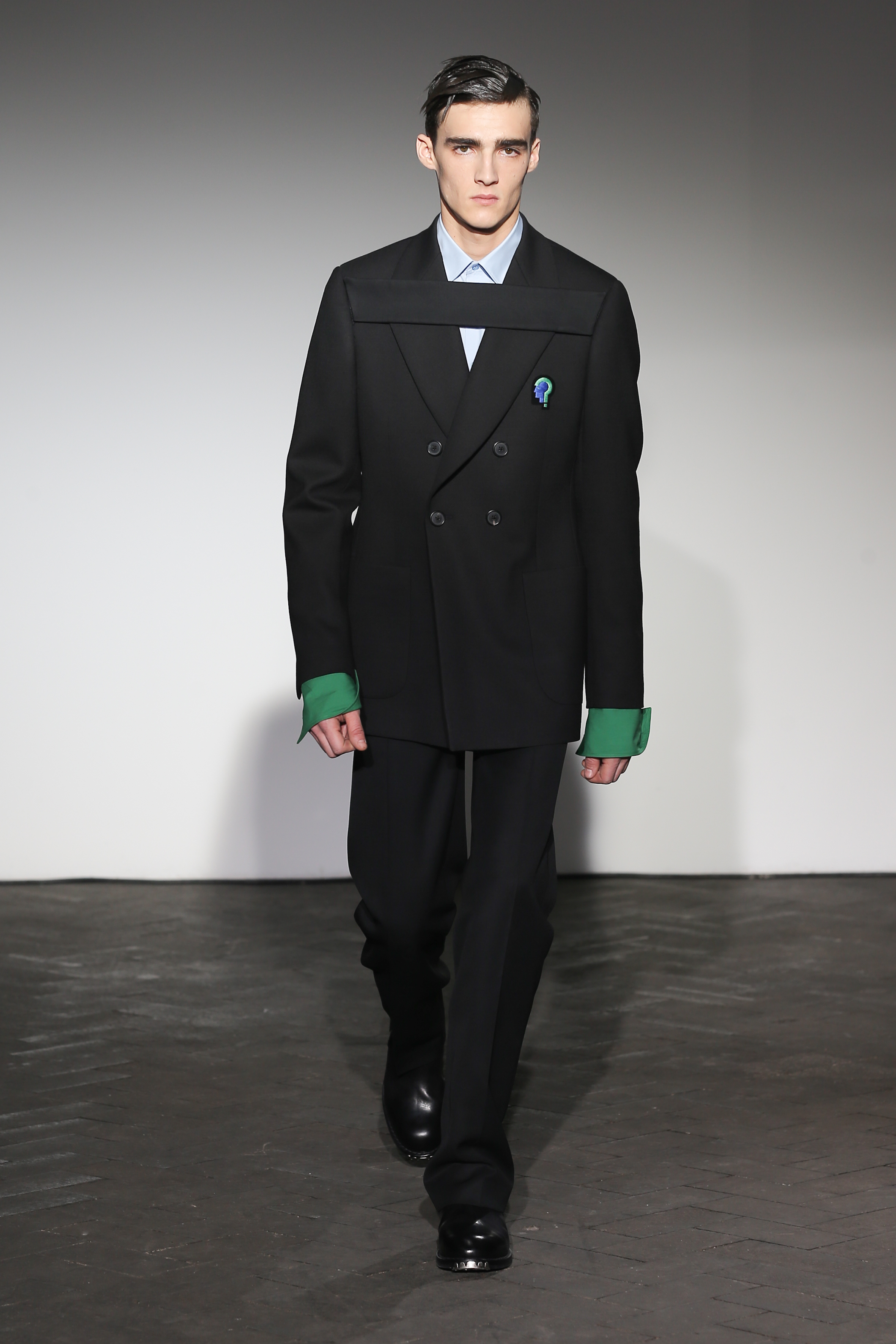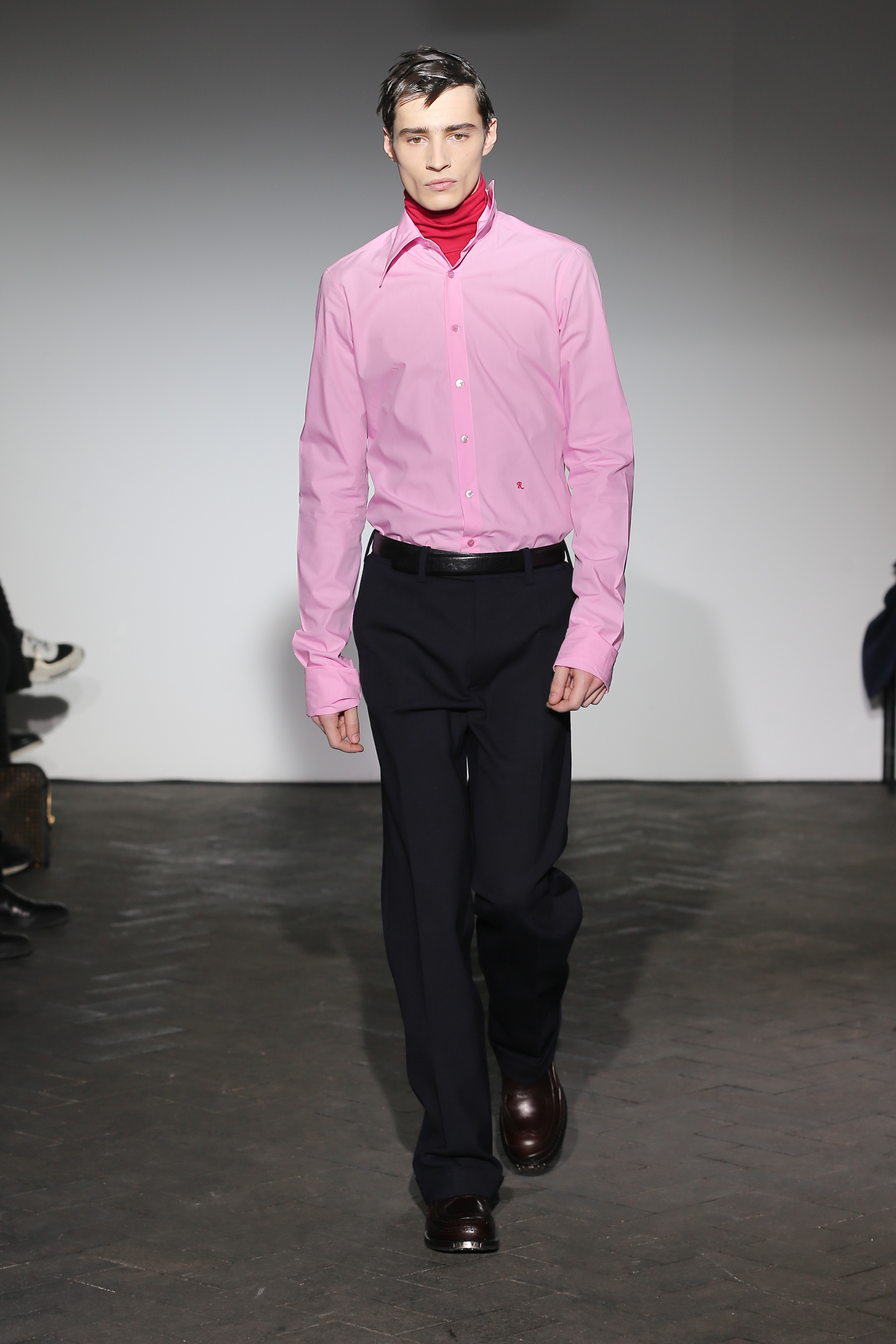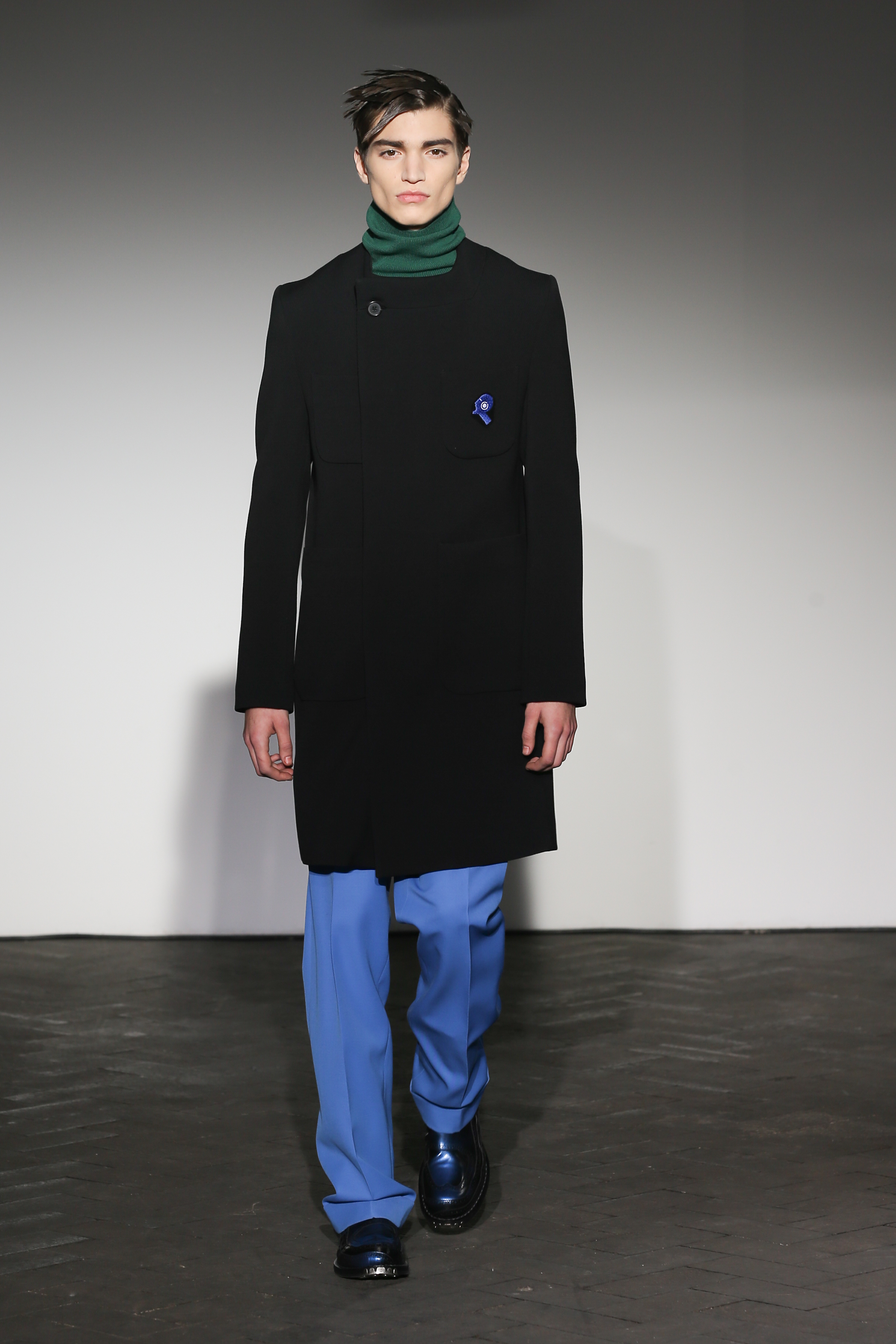 Moderne et élégant, ce sont dans les détails que Raf Simons illustre sa créativité : manches oversizes et manchettes non boutonnées, l’homme Raf Simons est volontairement bohème mais pointu. Vert bouteille bleu céruléen, rose bonbon, jaune sont les couleurs que l’on a pu retrouver dans ce défilé au côté de l’éternel mais néanmoins, chic, noir.
