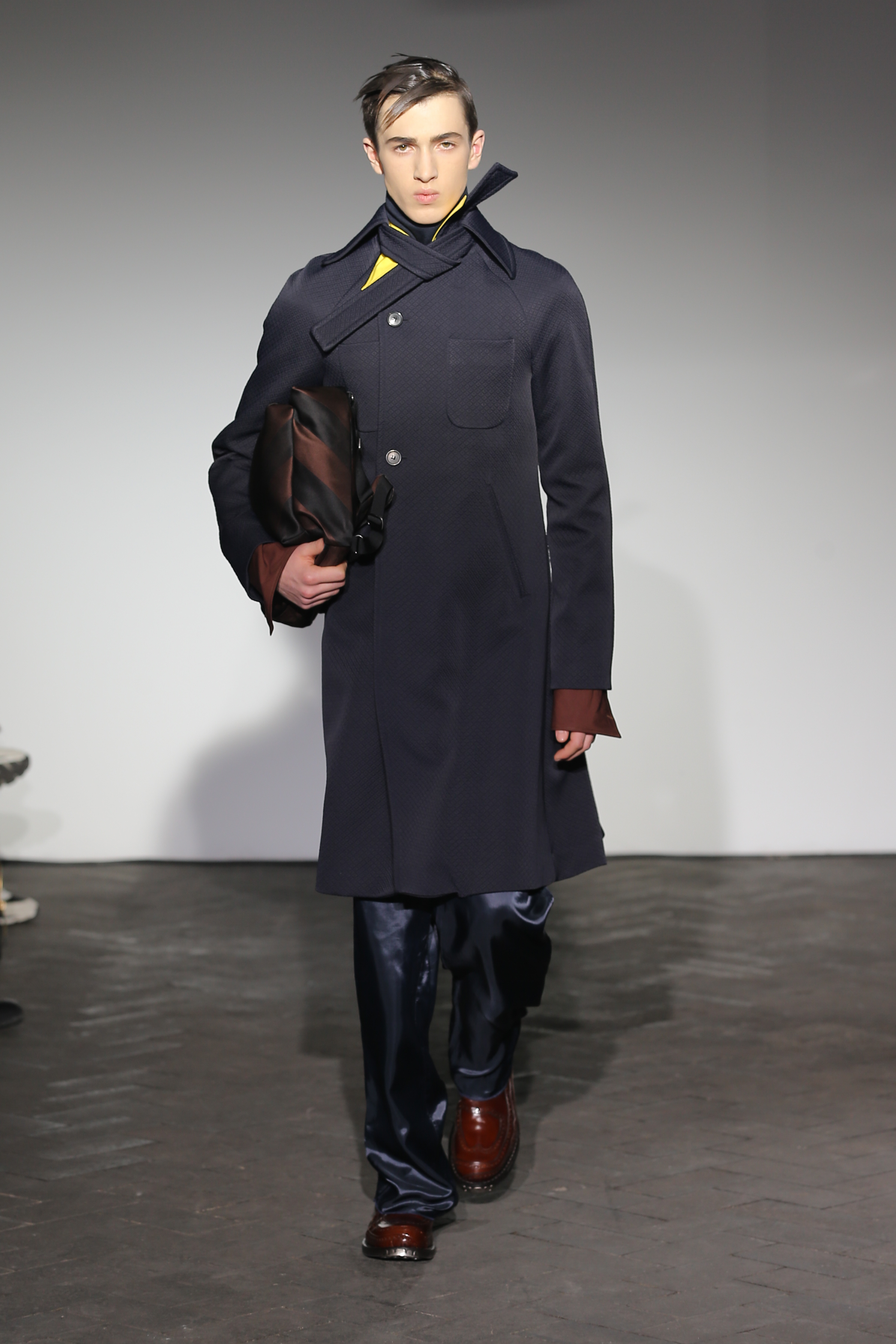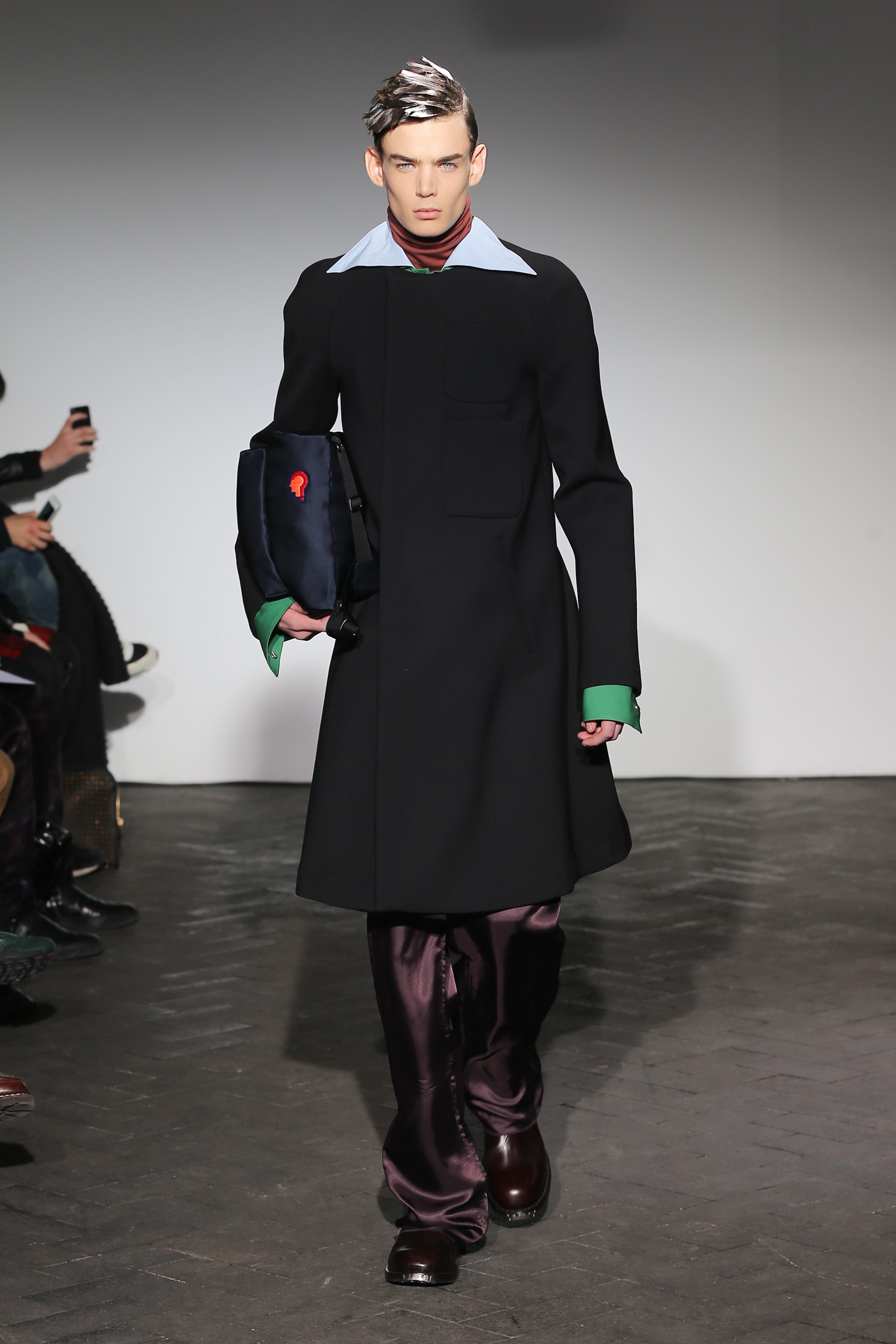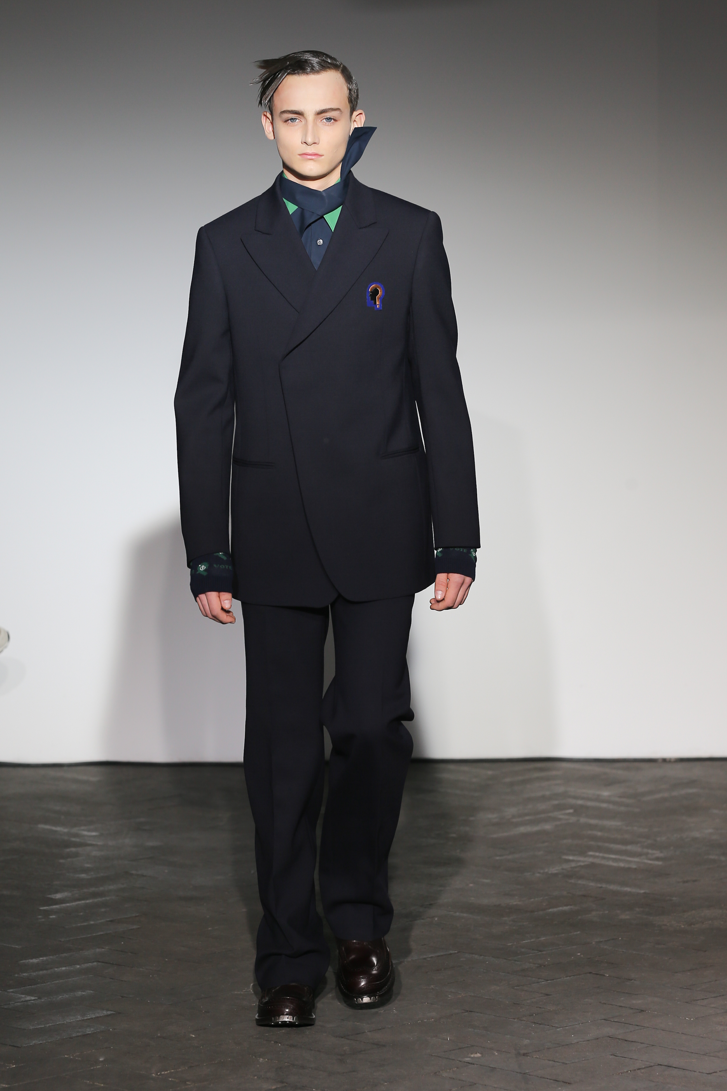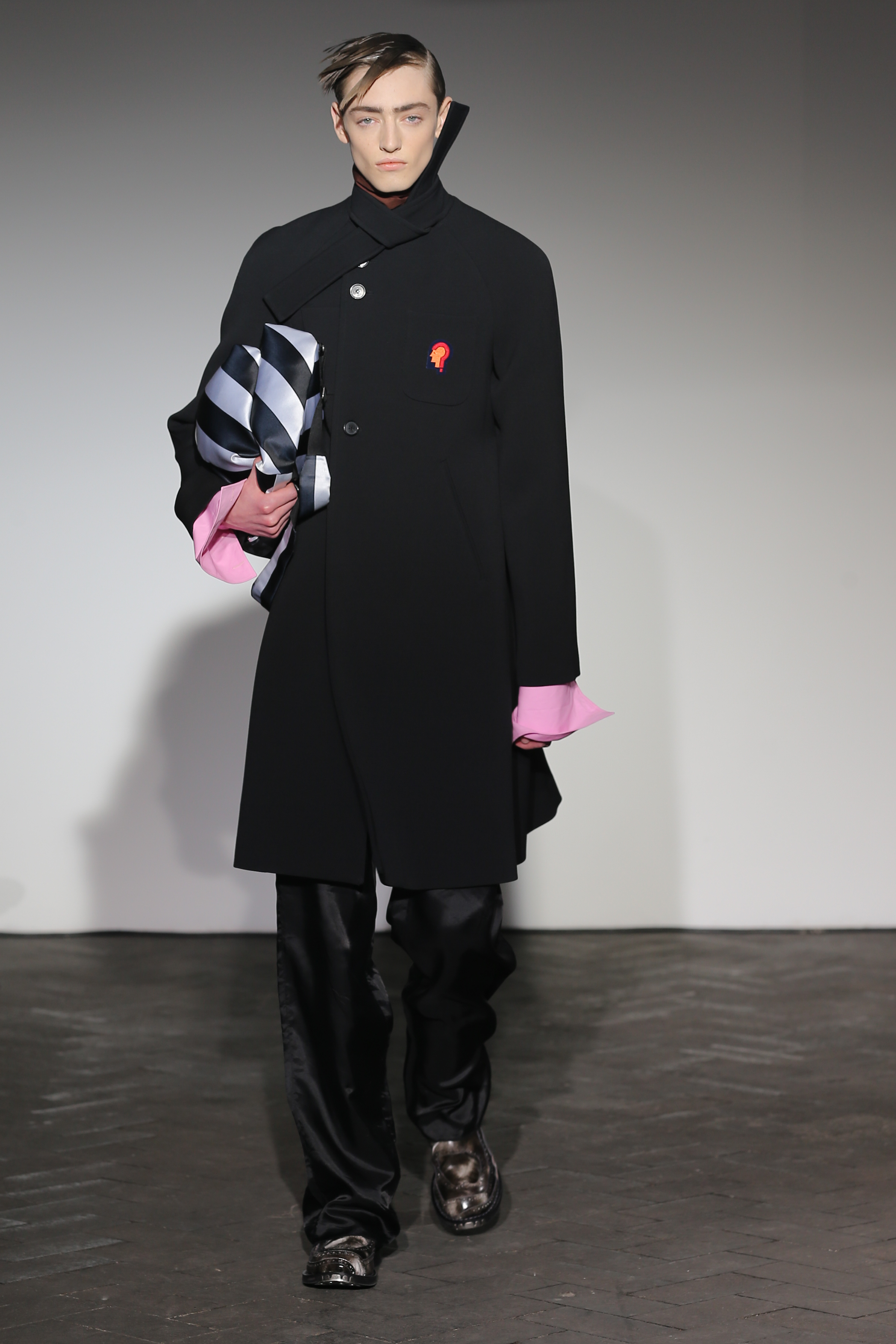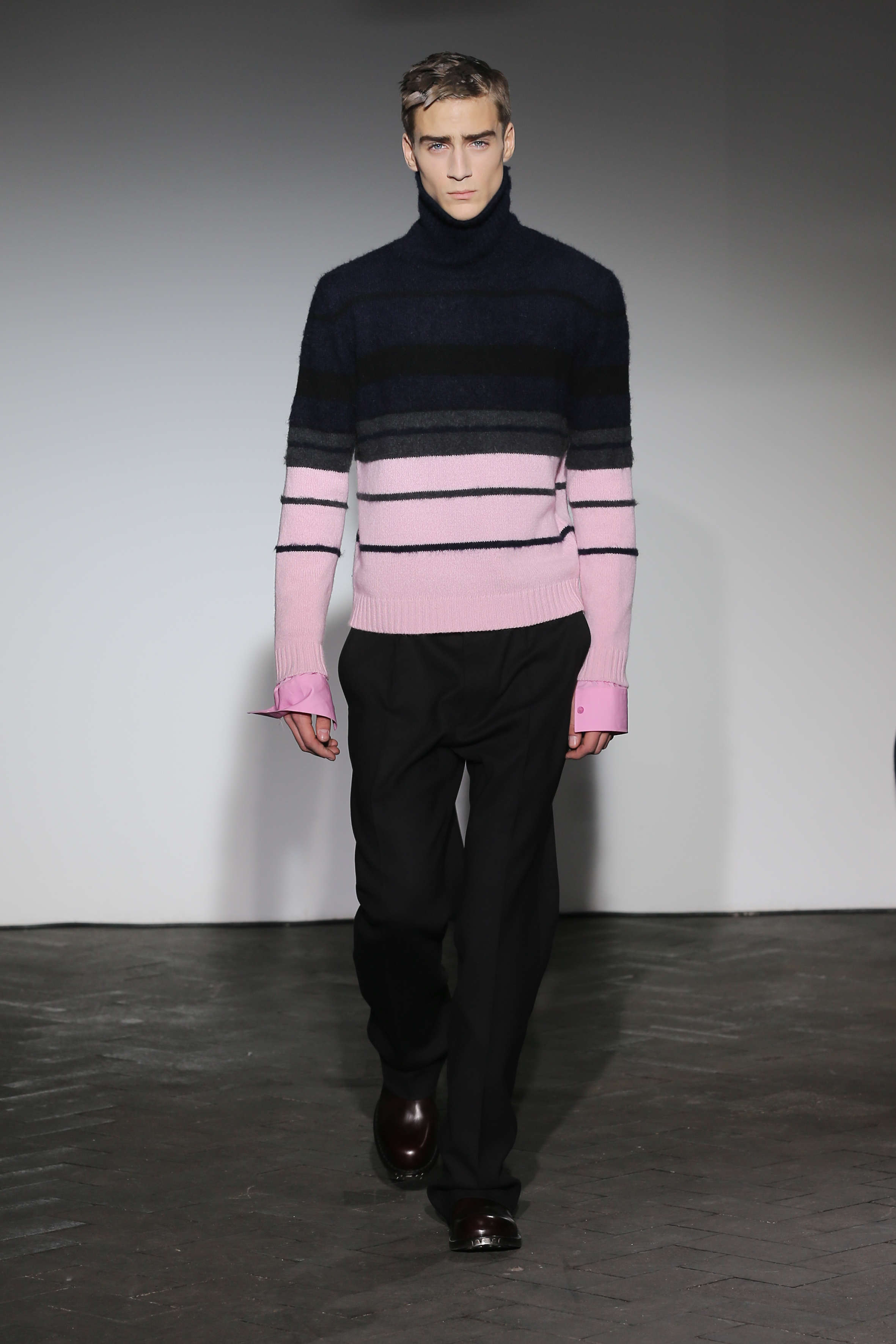 Moderne et élégant, ce sont dans les détails que Raf Simons illustre sa créativité : manches oversizes et manchettes non boutonnées, l’homme Raf Simons est volontairement bohème mais pointu. Vert bouteille bleu céruléen, rose bonbon, jaune sont les couleurs que l’on a pu retrouver dans ce défilé au côté de l’éternel mais néanmoins, chic, noir.