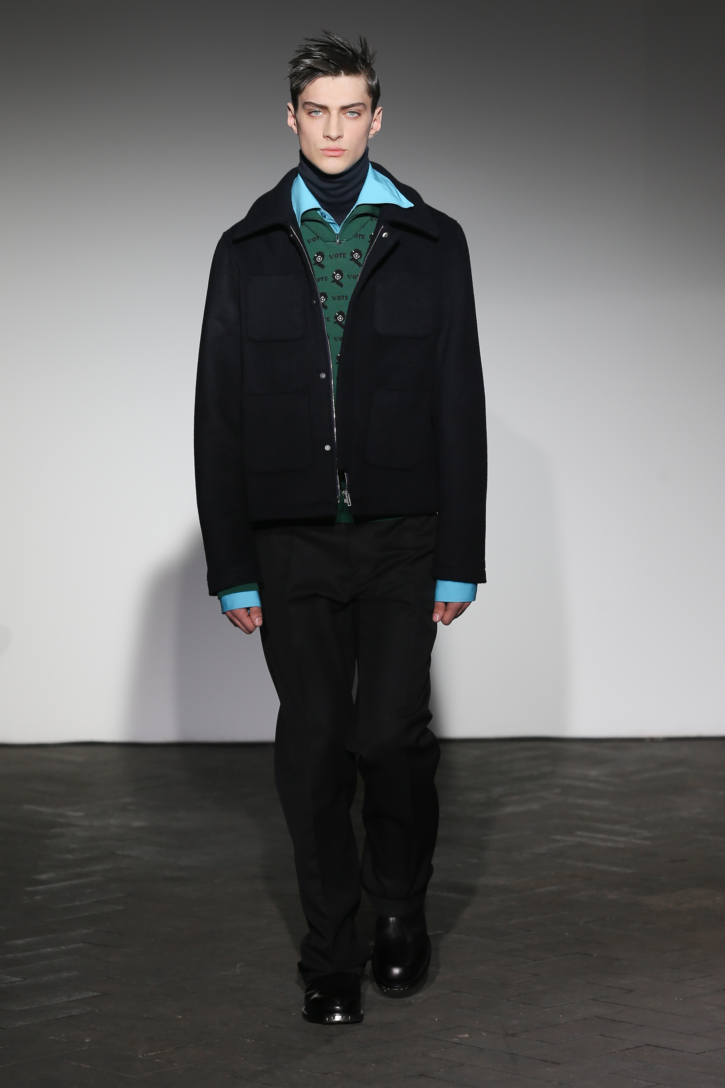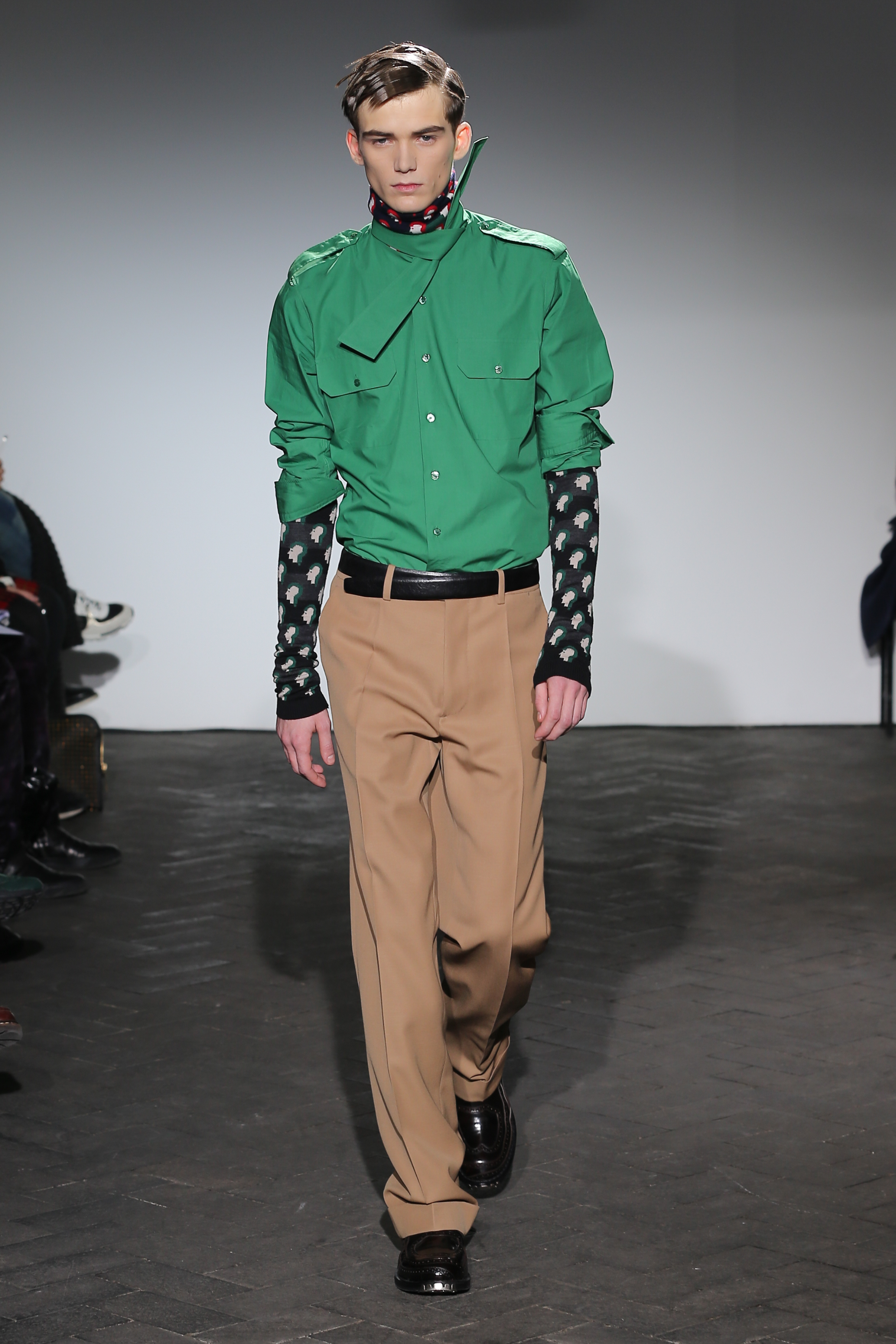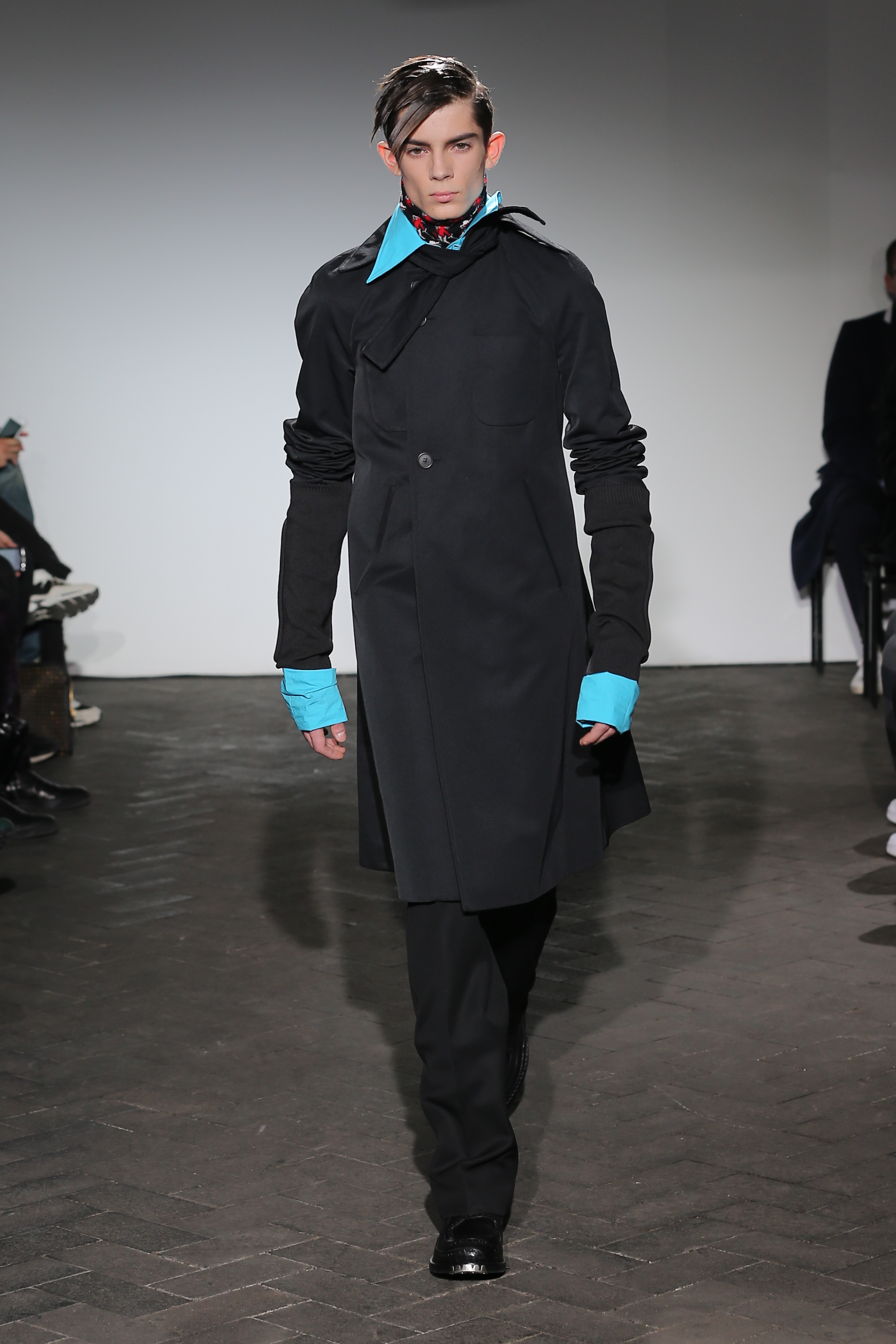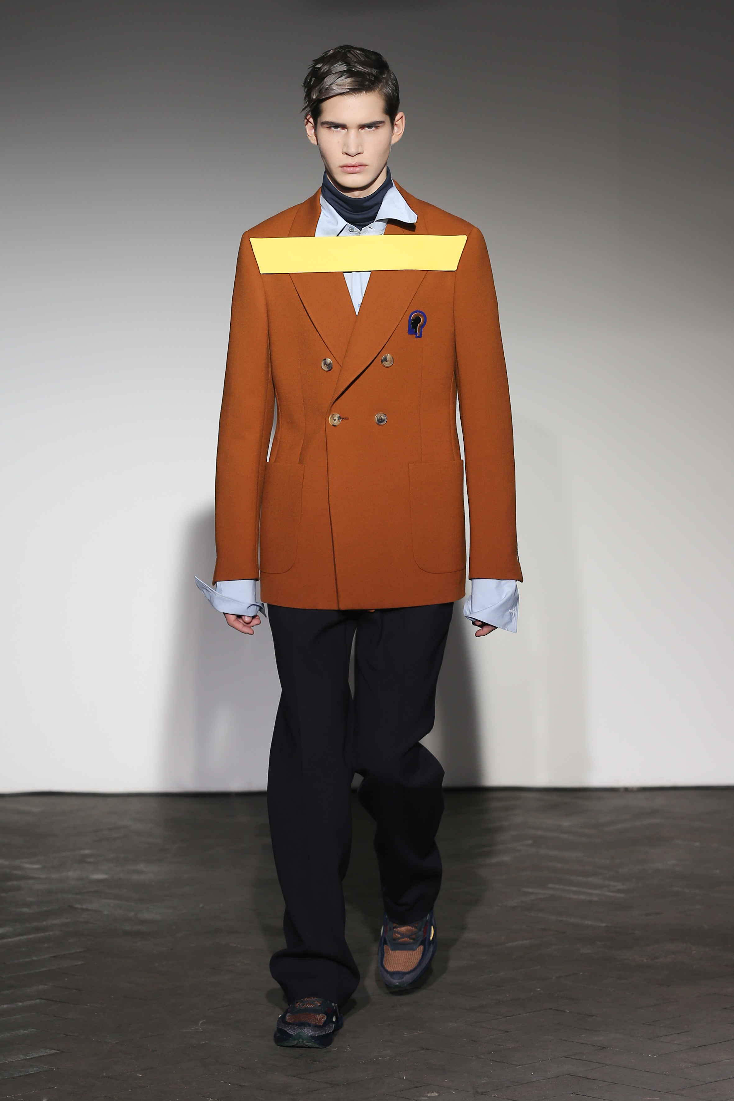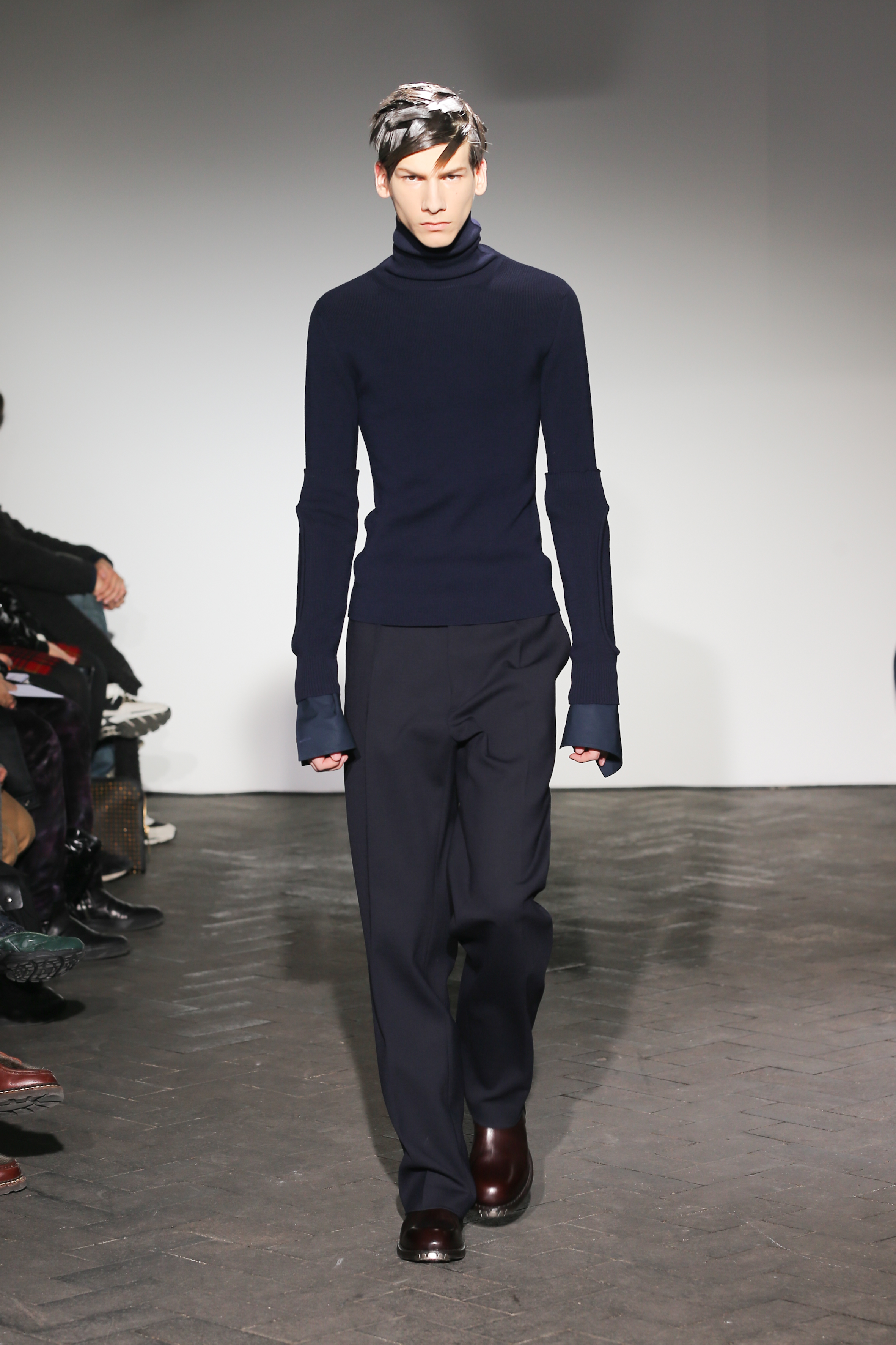 Moderne et élégant, ce sont dans les détails que Raf Simons illustre sa créativité : manches oversizes et manchettes non boutonnées, l’homme Raf Simons est volontairement bohème mais pointu. Vert bouteille bleu céruléen, rose bonbon, jaune sont les couleurs que l’on a pu retrouver dans ce défilé au côté de l’éternel mais néanmoins, chic, noir.