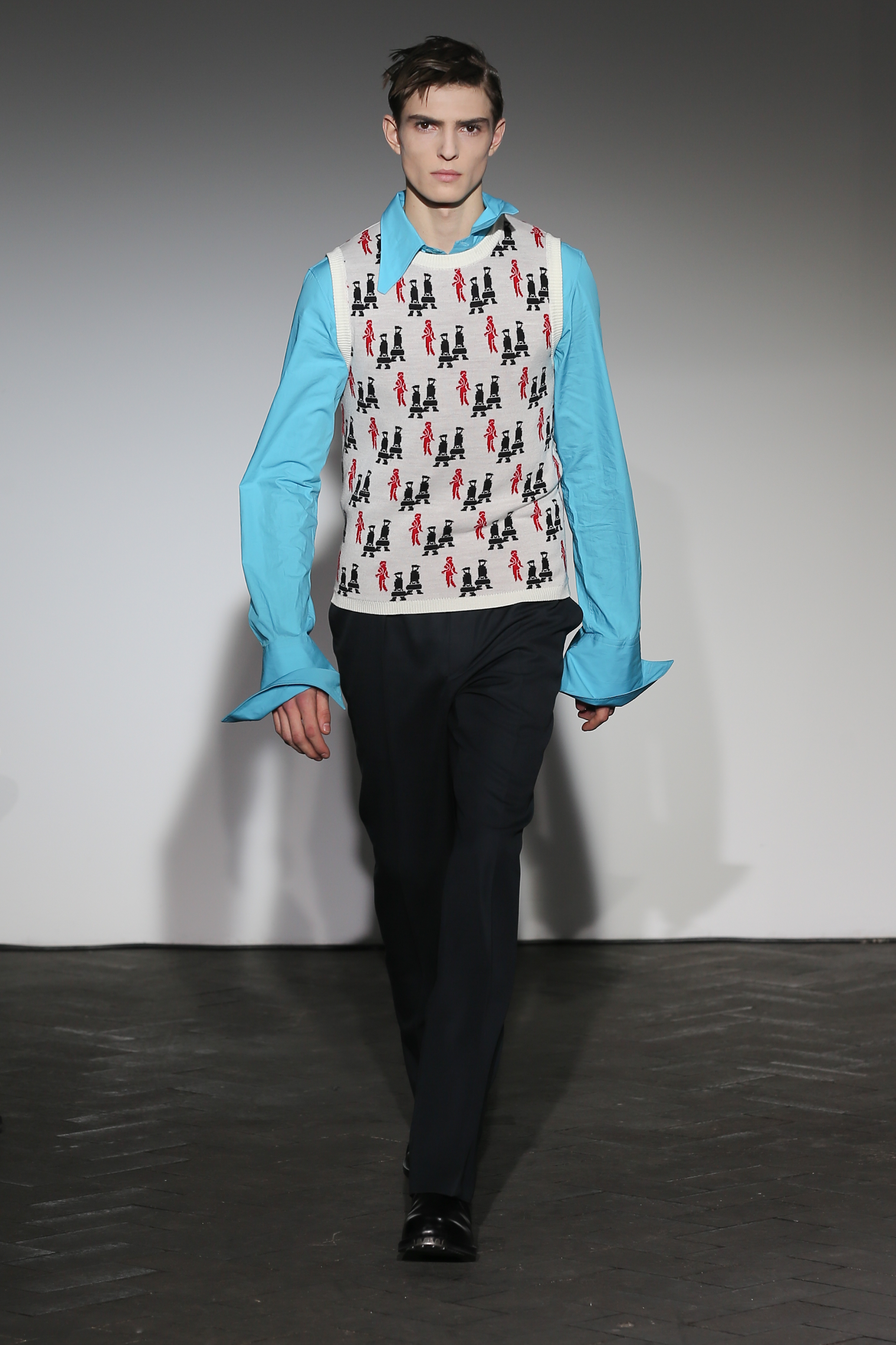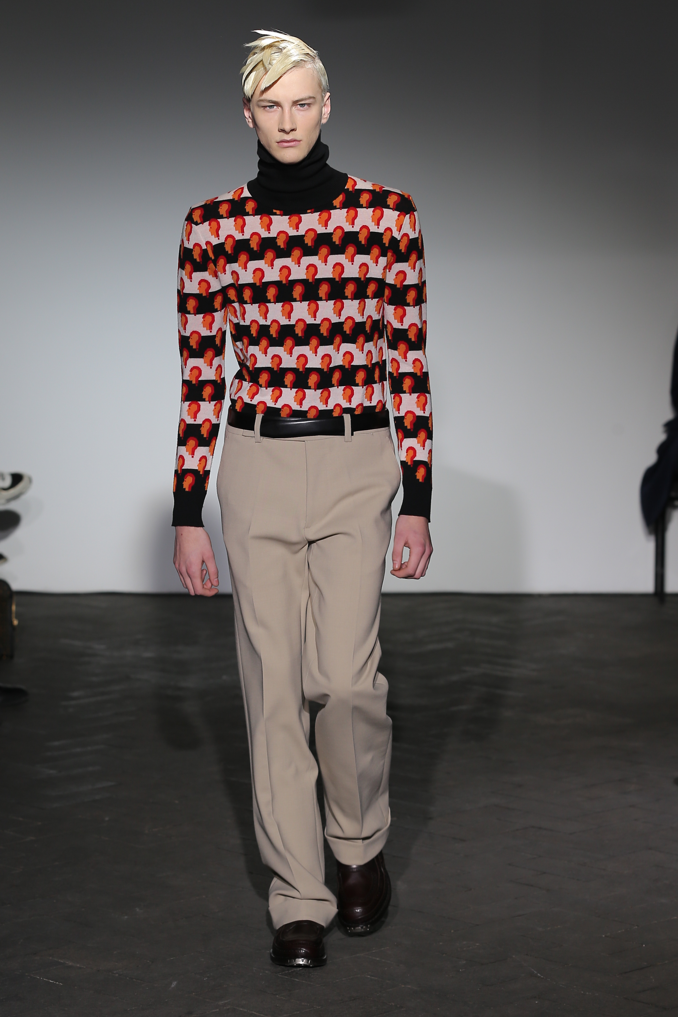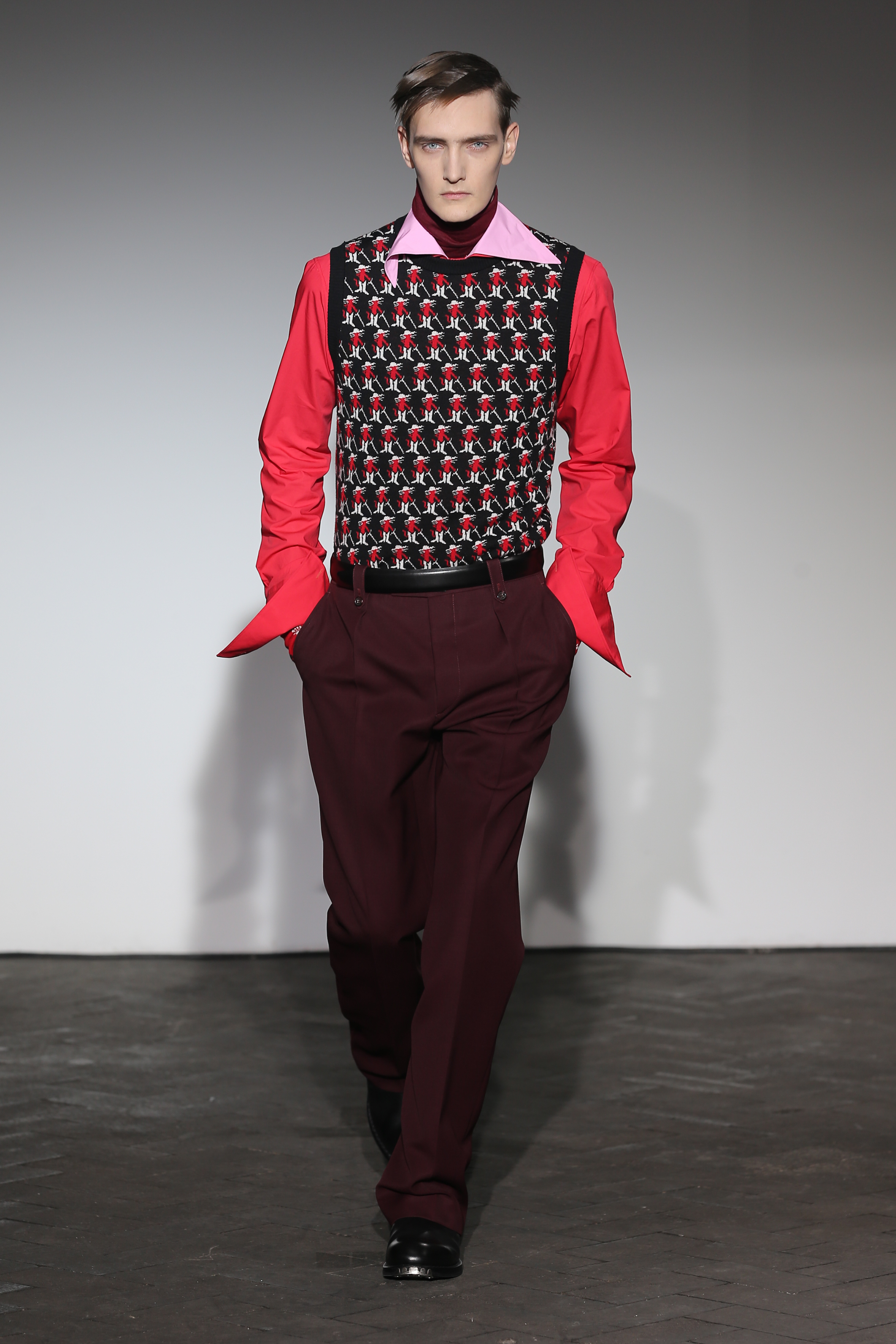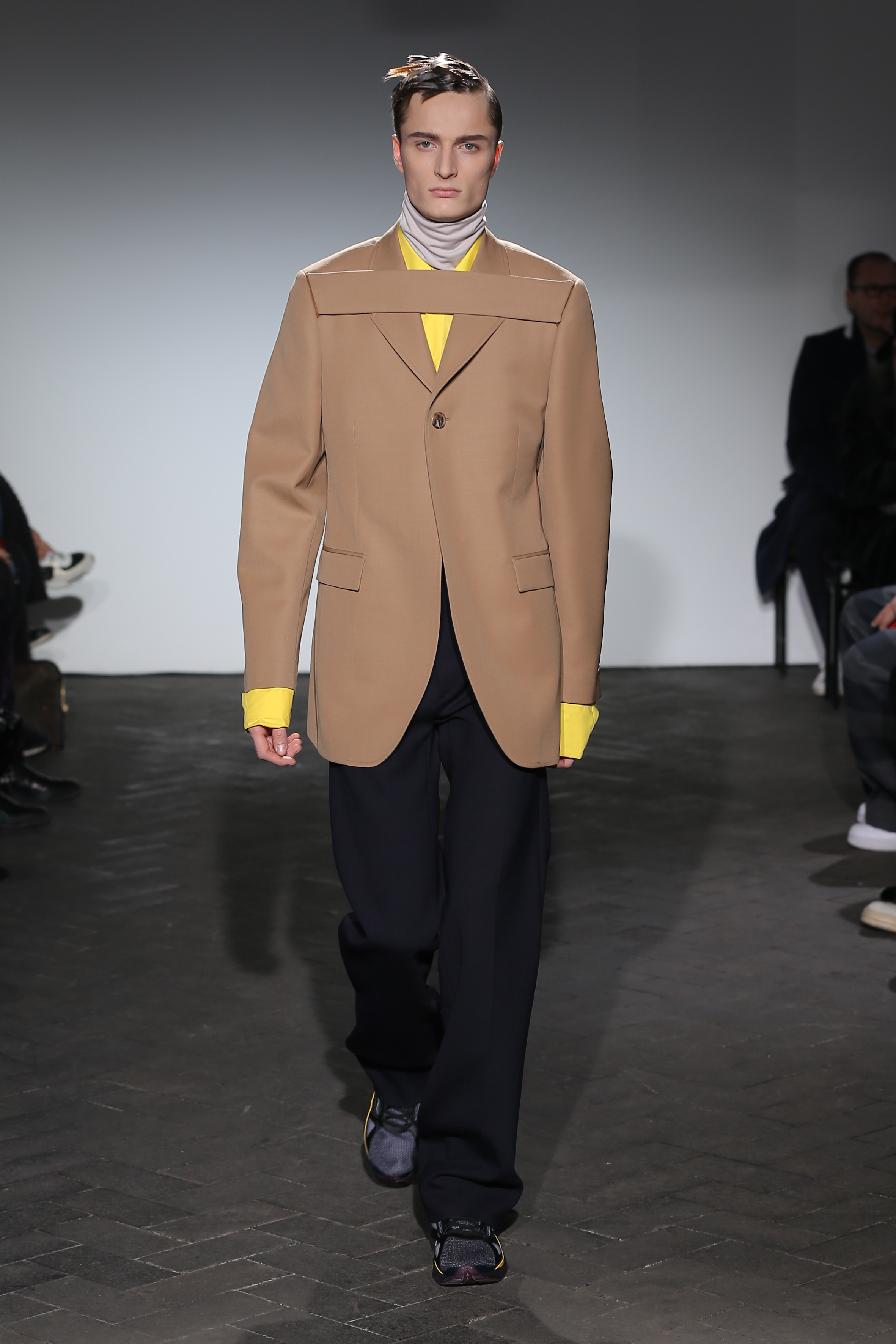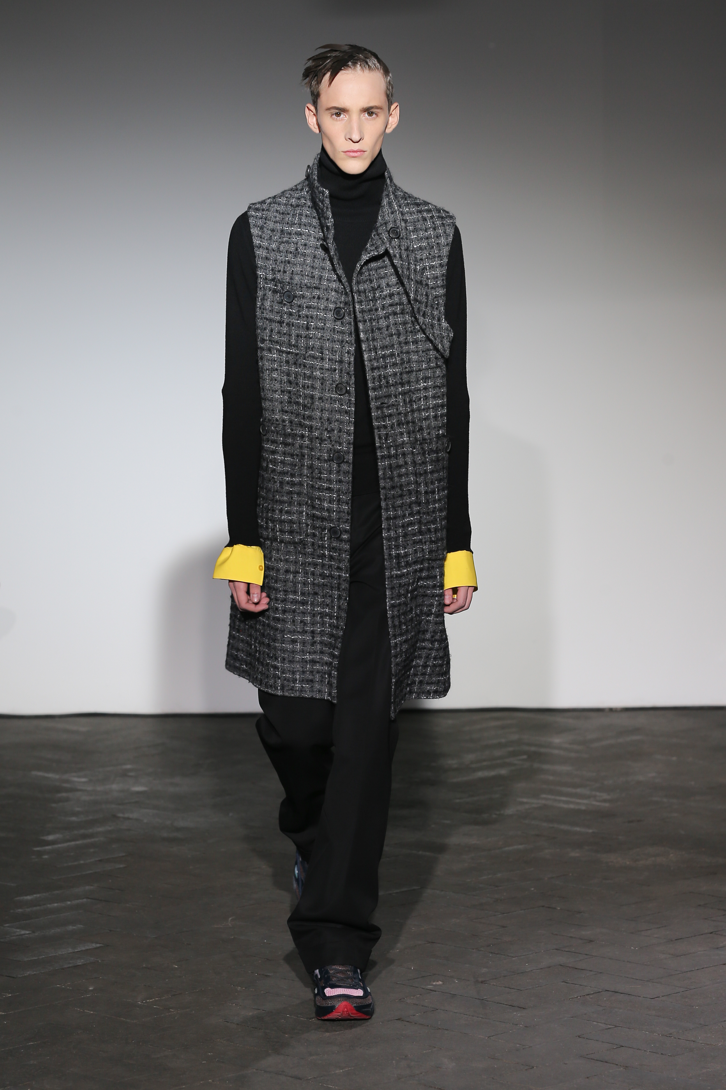 Moderne et élégant, ce sont dans les détails que Raf Simons illustre sa créativité : manches oversizes et manchettes non boutonnées, l’homme Raf Simons est volontairement bohème mais pointu. Vert bouteille bleu céruléen, rose bonbon, jaune sont les couleurs que l’on a pu retrouver dans ce défilé au côté de l’éternel mais néanmoins, chic, noir.