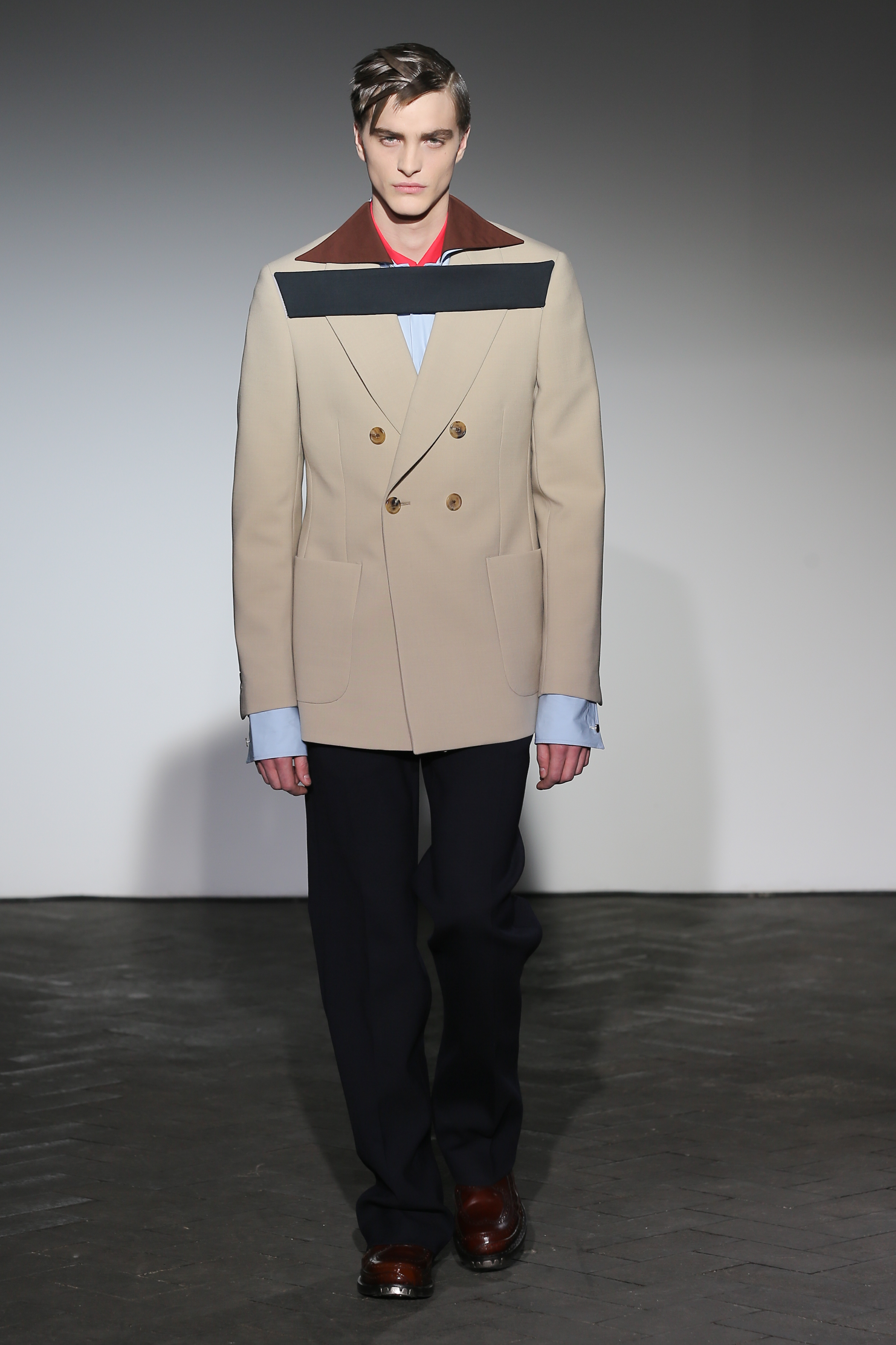Pour l’automne hiver 2013/2014, Raf Simons a choisi de s’aventurer du côté du color blocking et de motifs géométriques s’intégrant a la structure de ses vêtements. Les basiques de la mode masculines sont réinterprétés avec ce que l’on pourrait appeler « la touche Simons », a savoir des couleurs affirmées, des coupes étonnantes et un stylisme volontairement laissé brouillon, comme effectué a la va-vite.