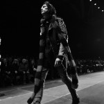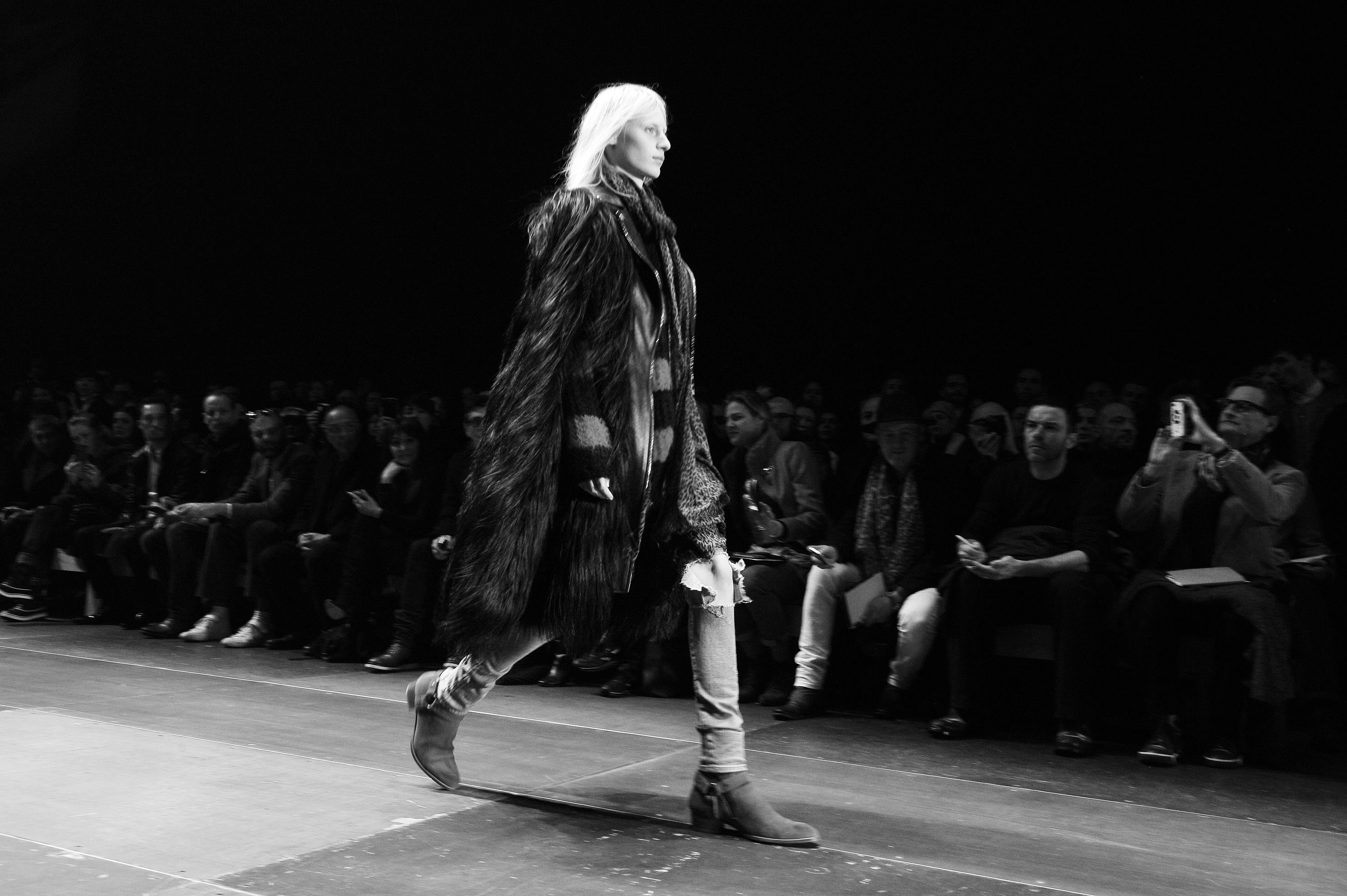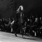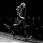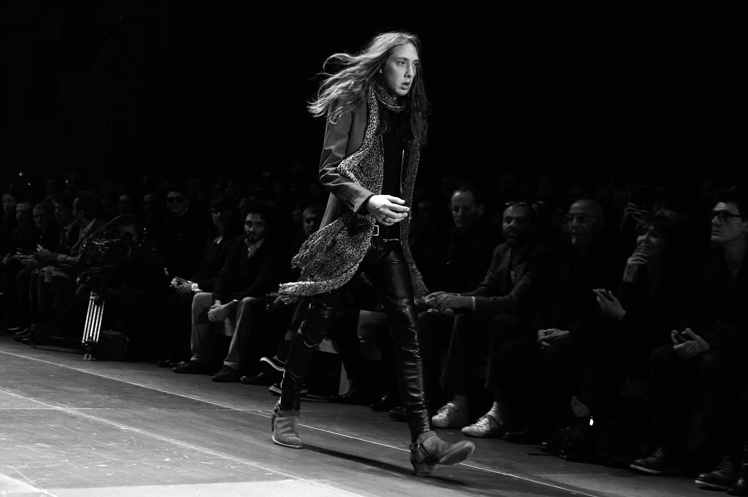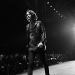 Le cuir est de rigueur chez Saint Laurent Paris, il se décline sur les pantalons slims et les boots bouclées, la silhouette est d’ailleurs généralement près du corps.